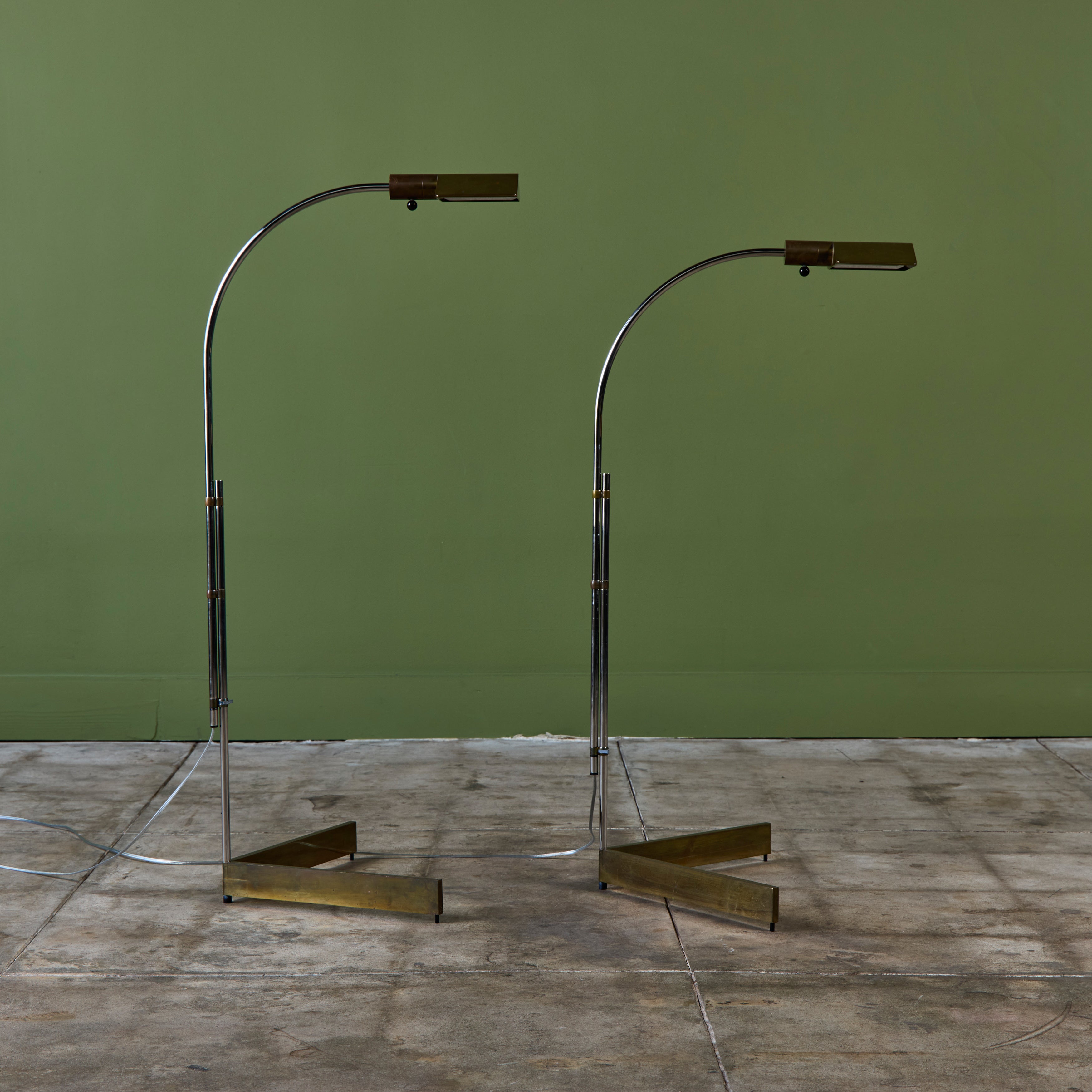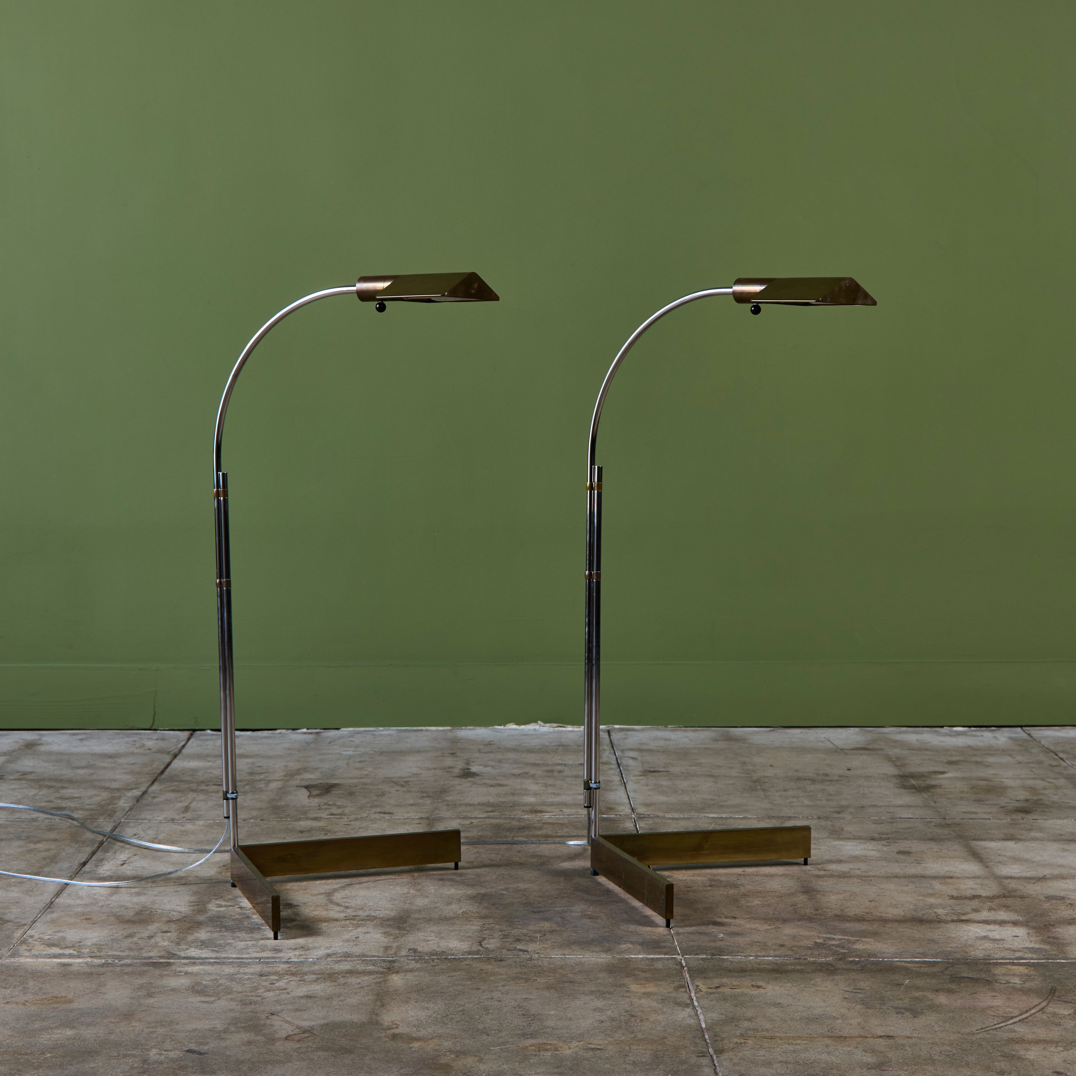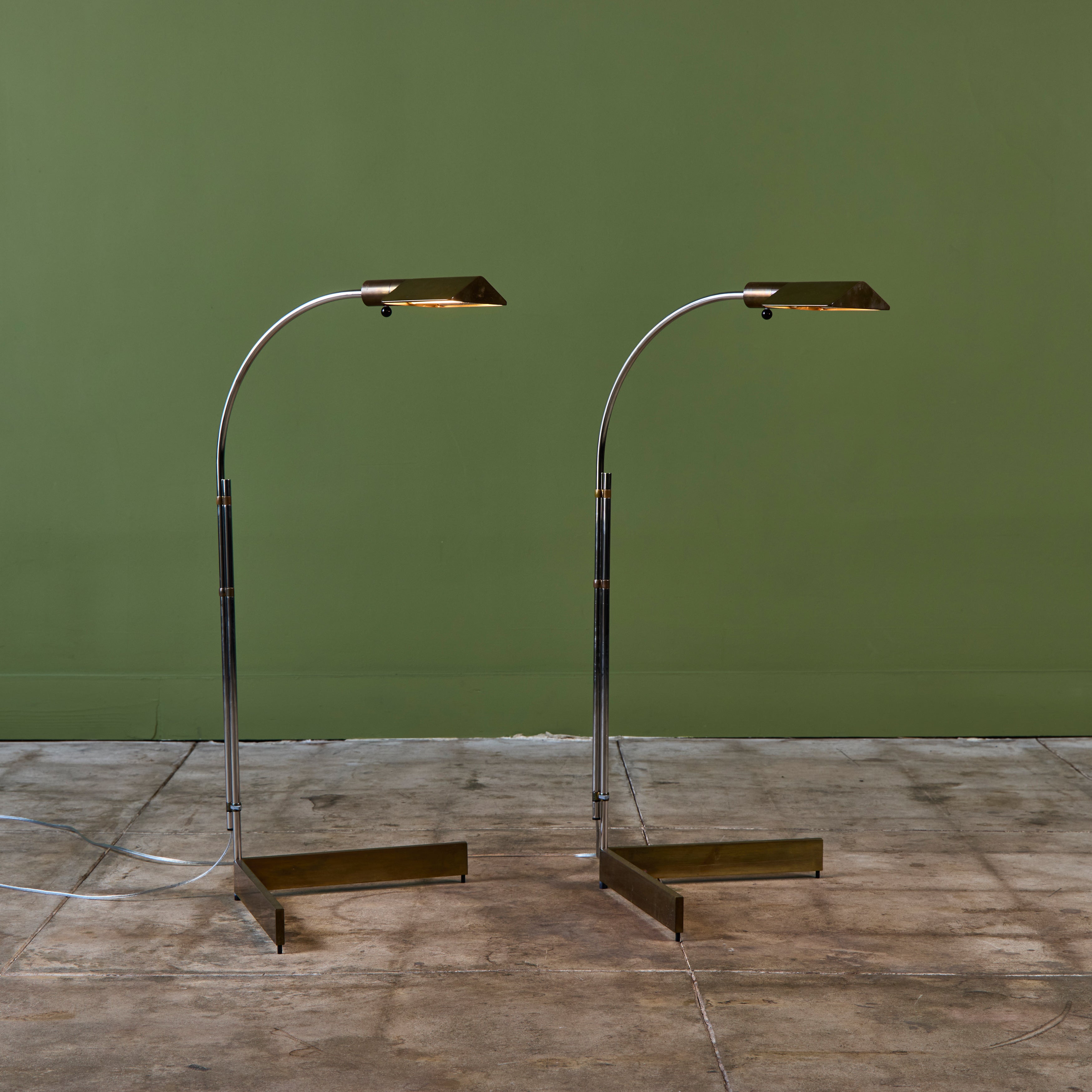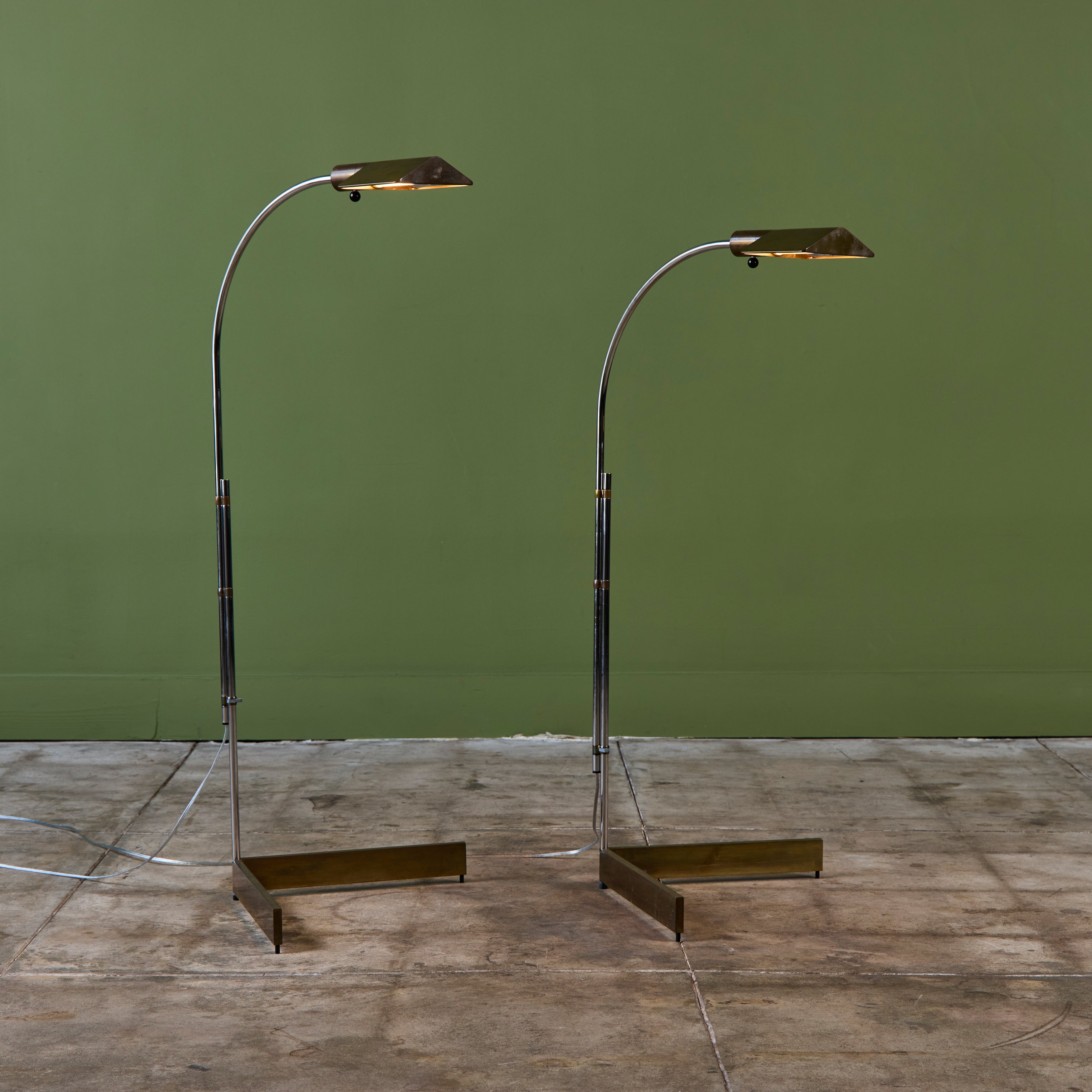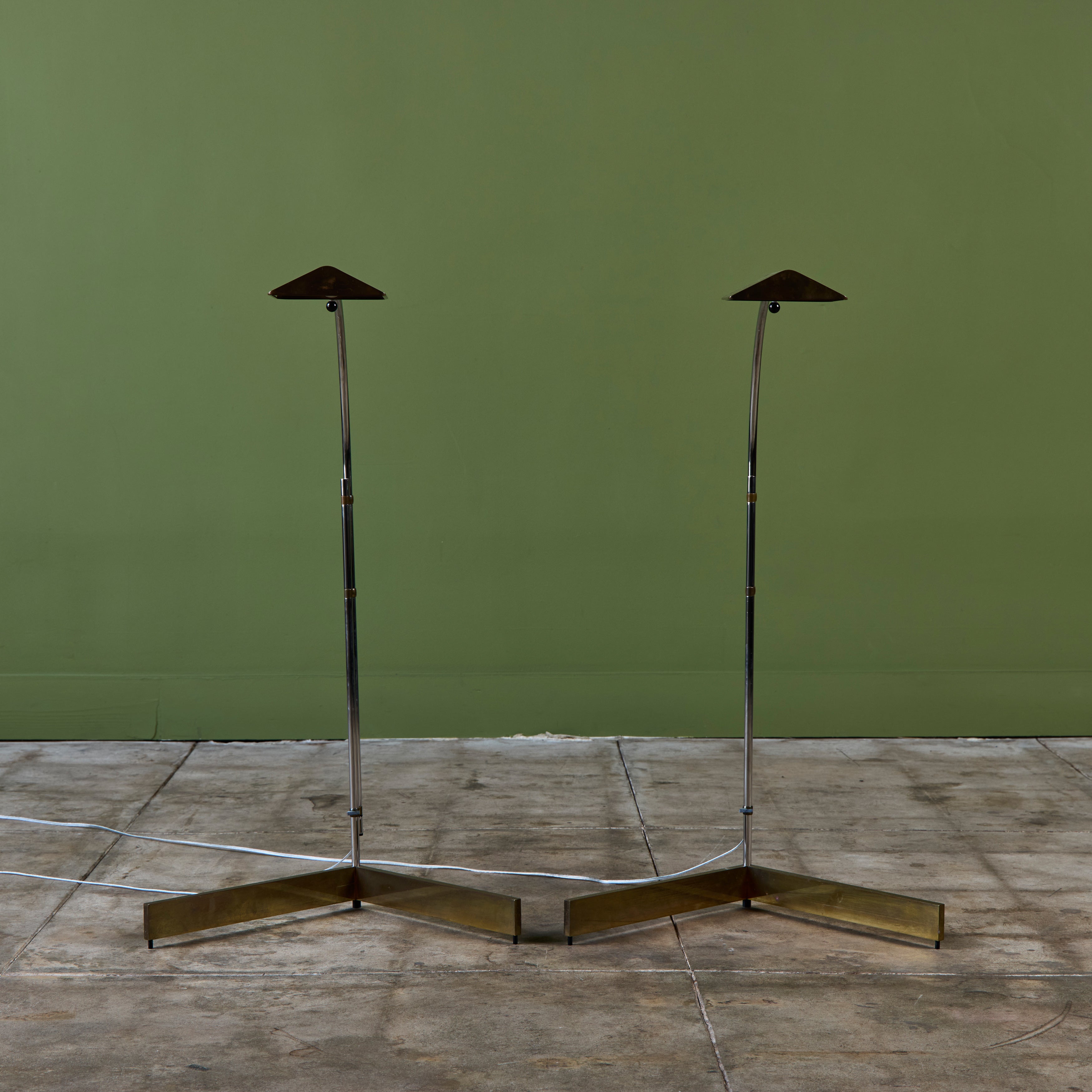 Designed in the 1970s, these brass and stainless steel floor lamps by Cedric Hartman are an enduring design classic. The modernist floor lamps feature triangular brass shades attached to two curved parallel stainless steel stems that offer focused task lighting. The arched stainless steel pole terminates into a heavy brass v-base. The poles are fastened with brass detailing that allows you to adjust the height. Discreet legs allow the lamps to “hover” just above the floor, exaggerating the counterweighted arc of the central support. Bottom of bases are engraved with designer signature and serial number.