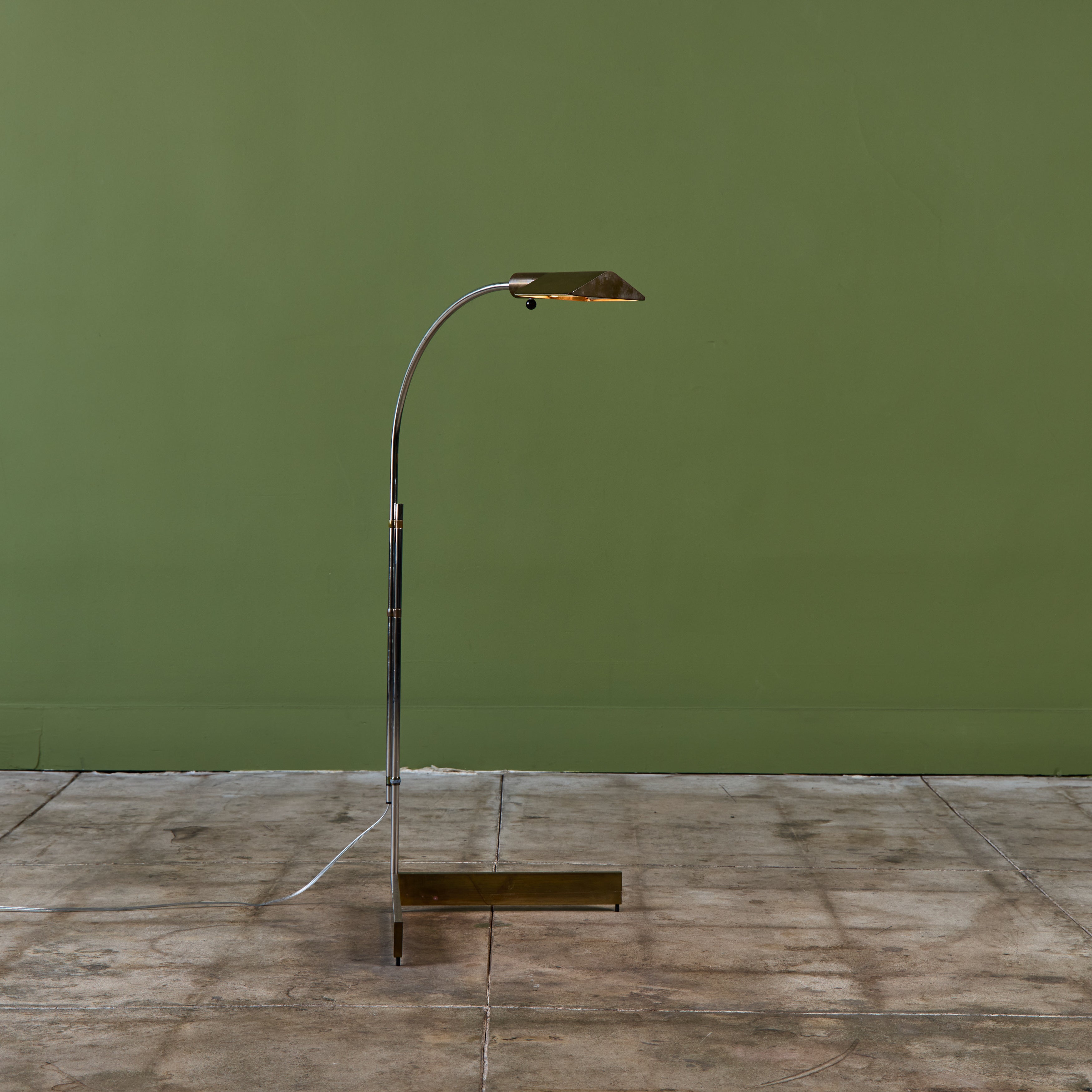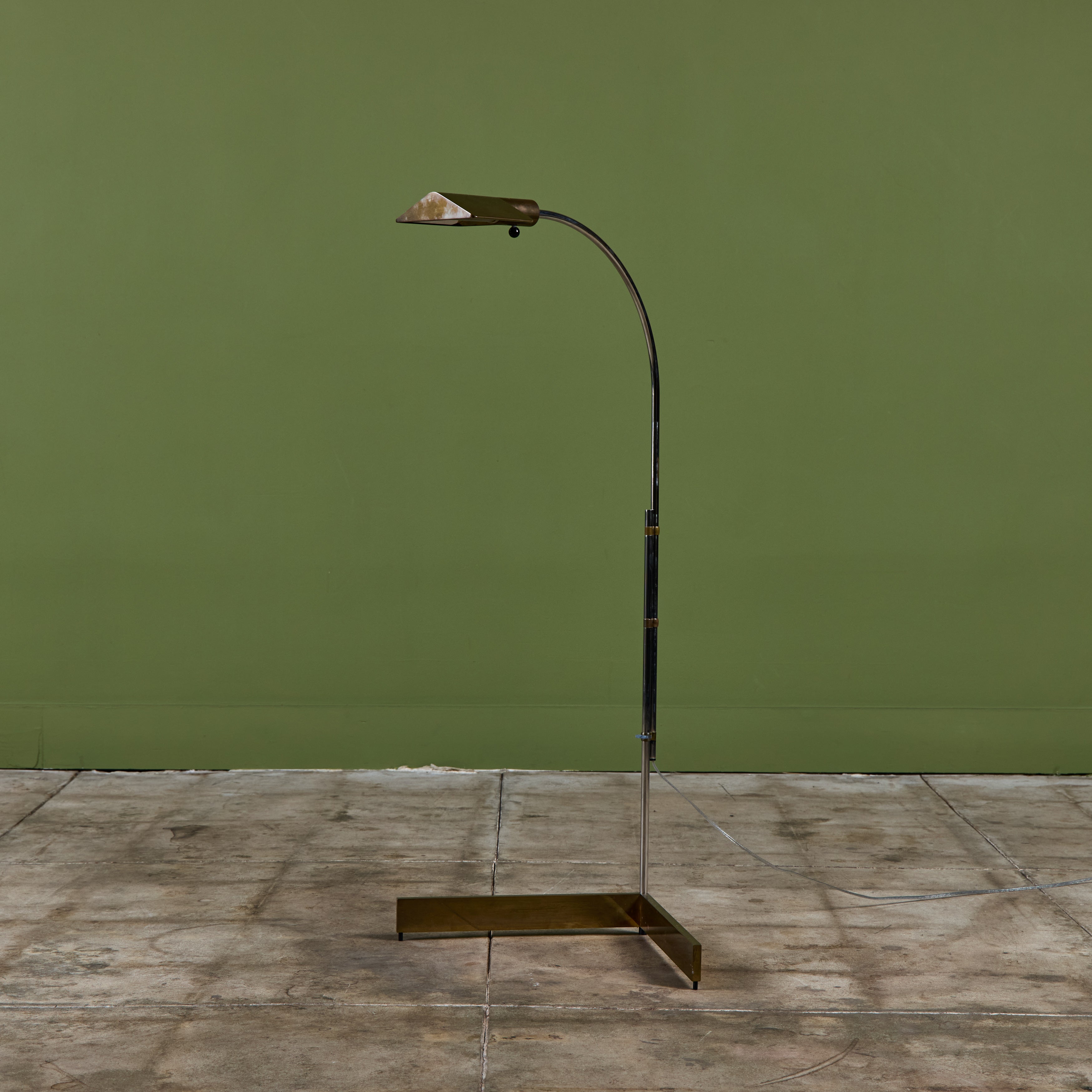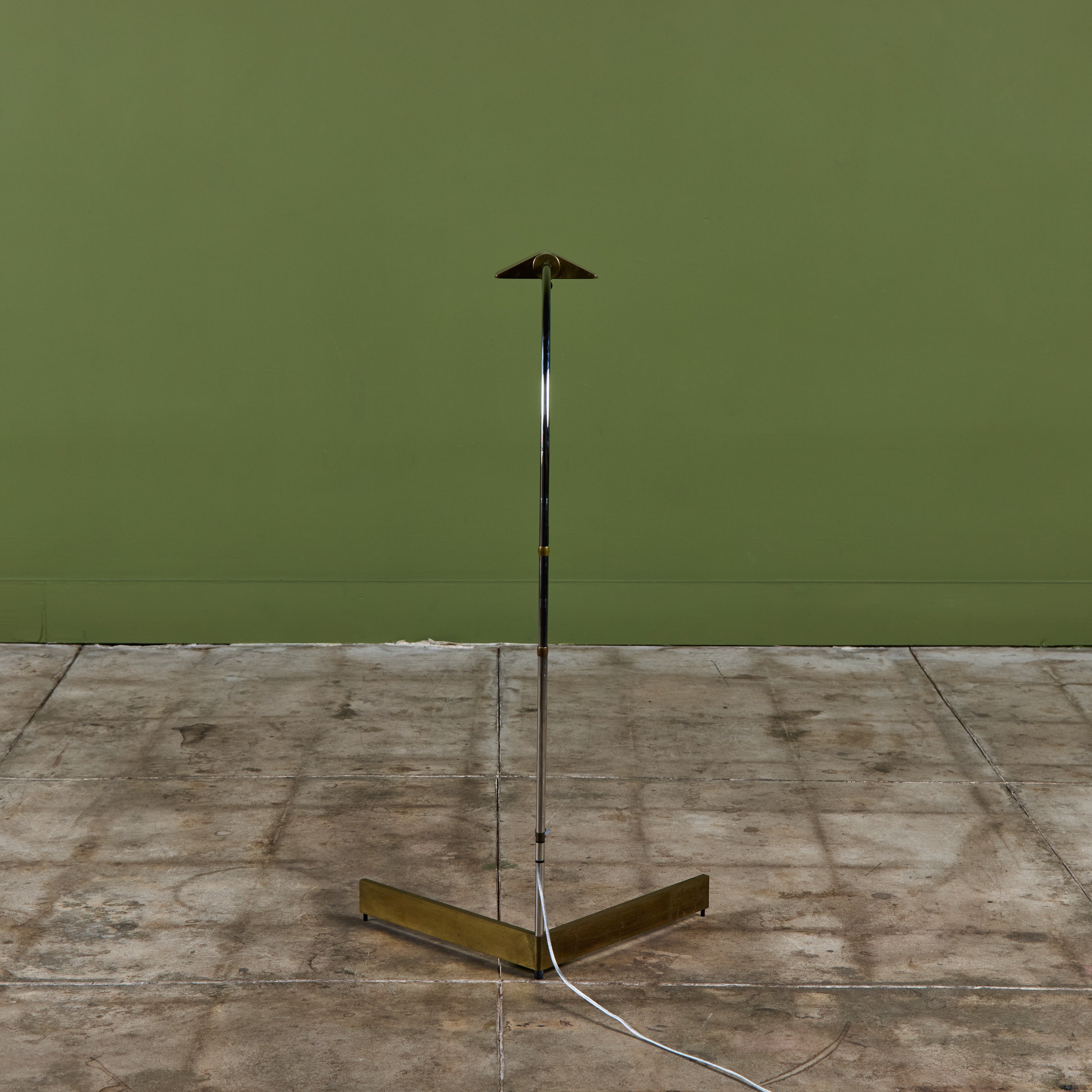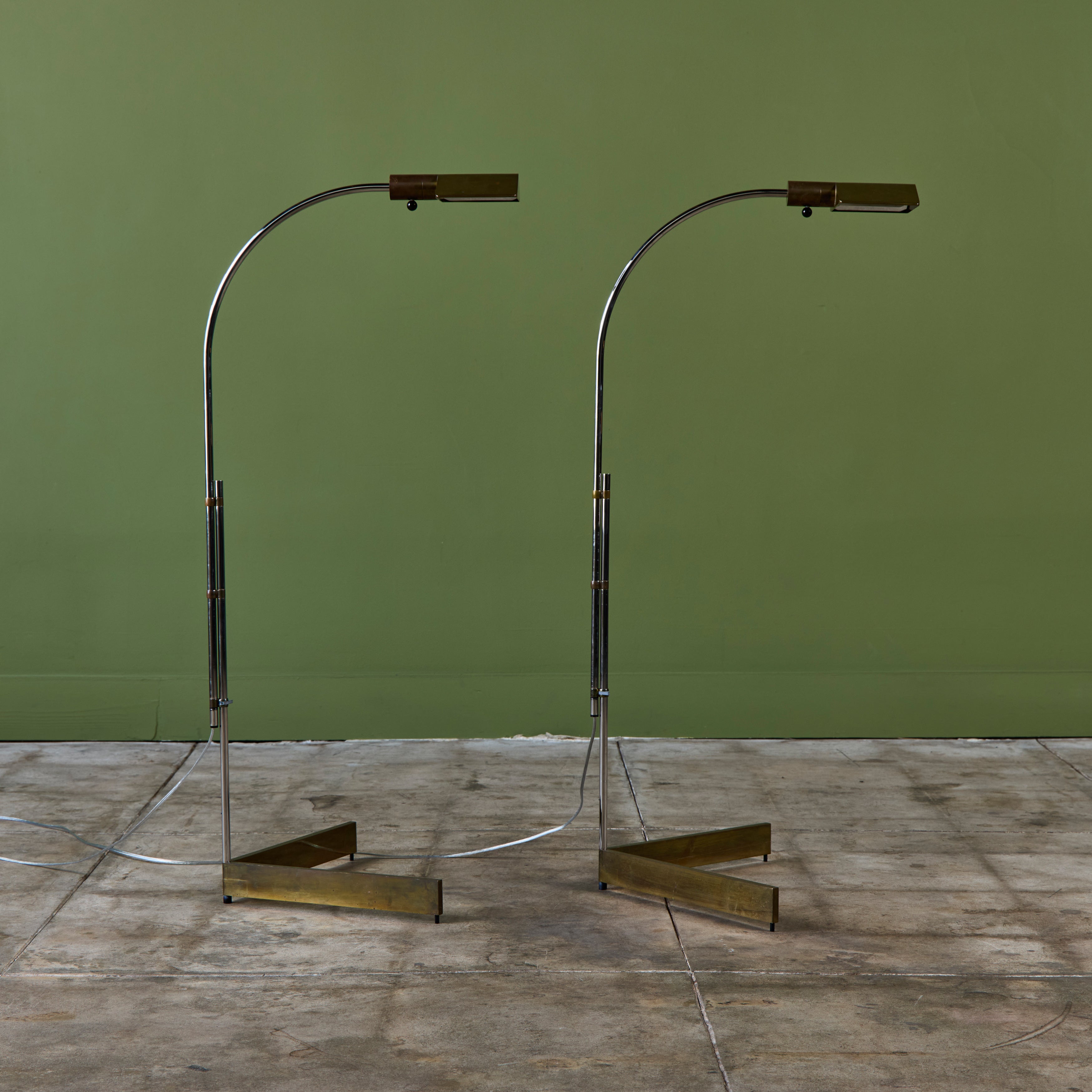 Designed in the 1970s, these brass and stainless steel floor lamps by Cedric Hartman are an enduring design classic. The modernist floor lamps feature triangular brass shades attached to two curved parallel stainless steel stems that offer focused task lighting. The arched stainless steel pole terminates into a heavy brass v-base. The poles are fastened with brass detailing that allows you to adjust the height. Discreet legs allow the lamps to “hover” just above the floor, exaggerating the counterweighted arc of the central support. Bottom of bases are engraved with designer signature and serial number.