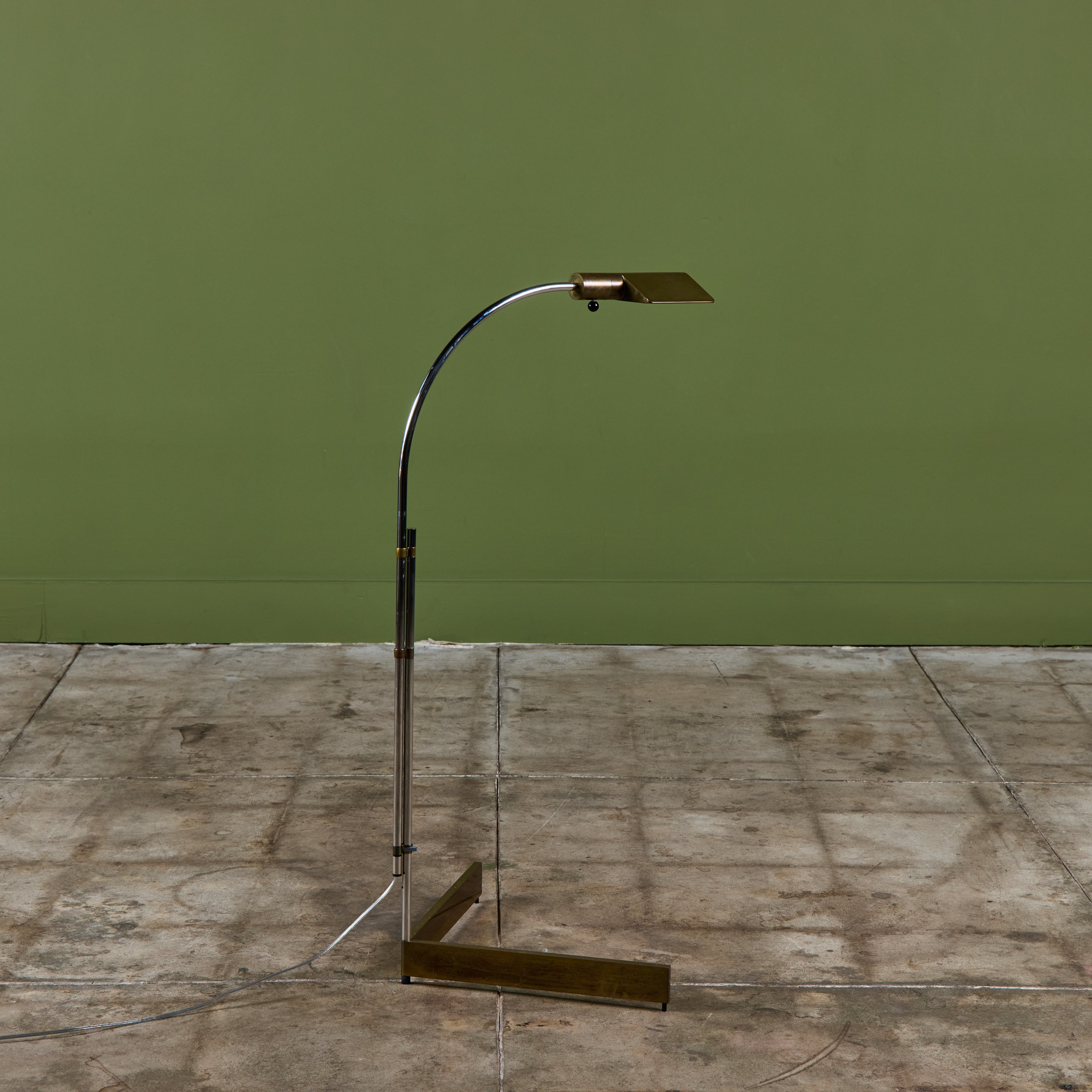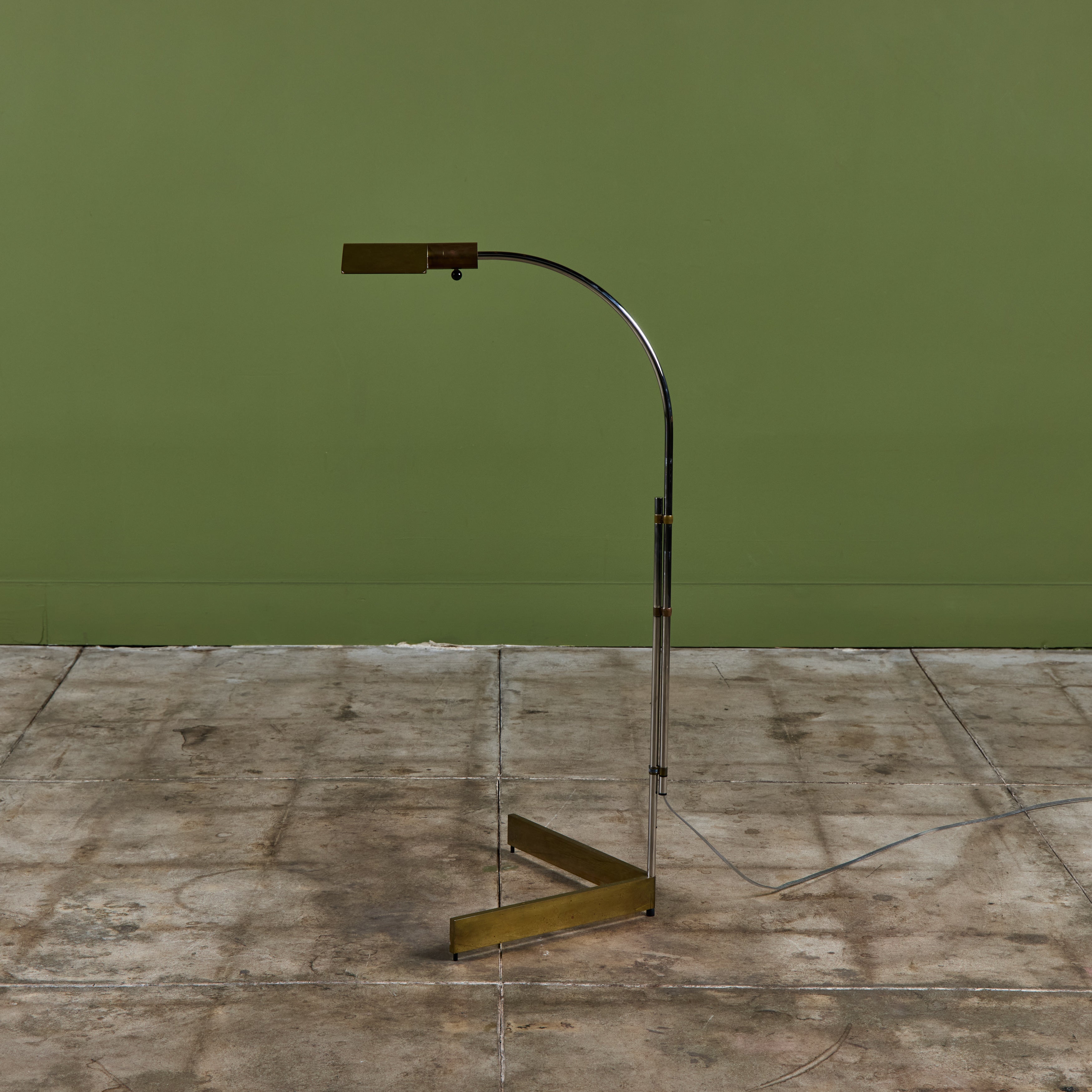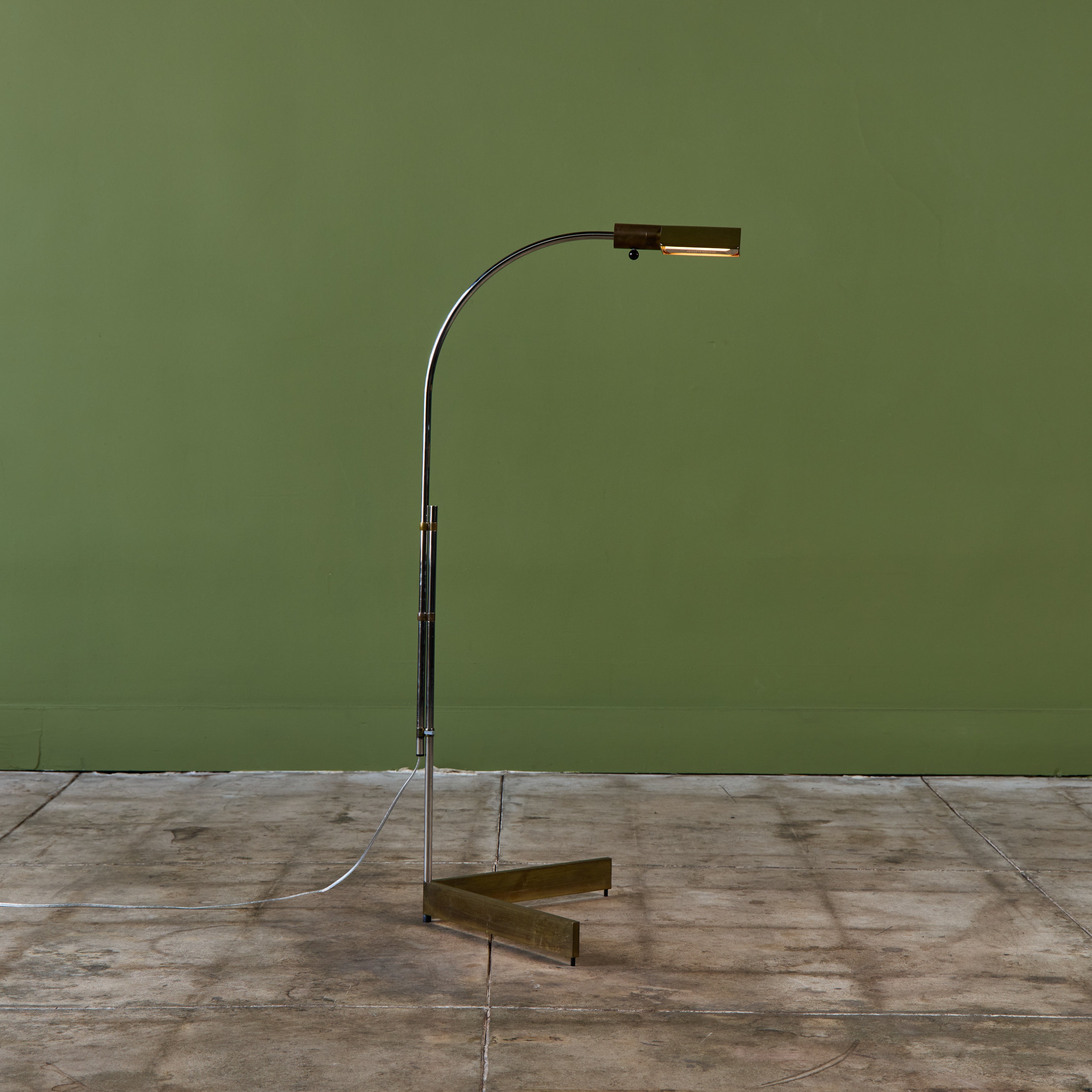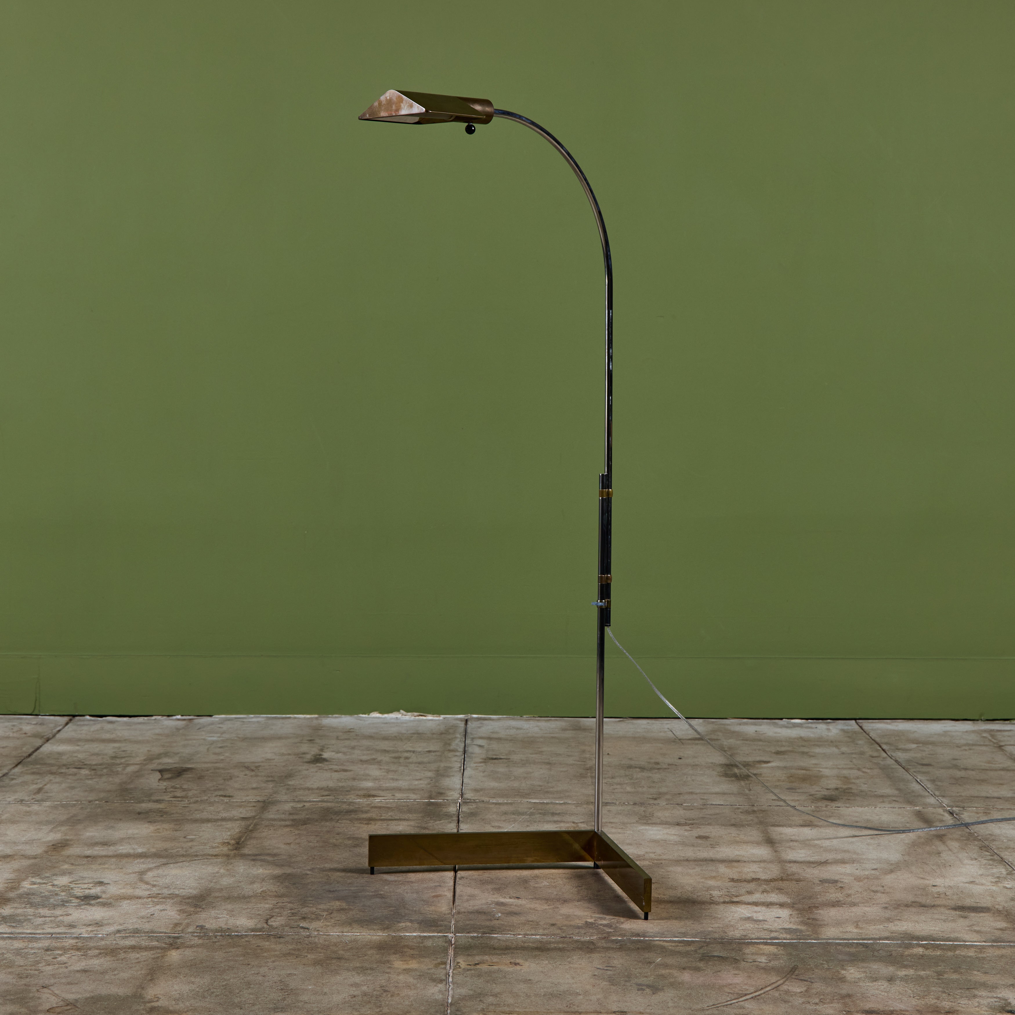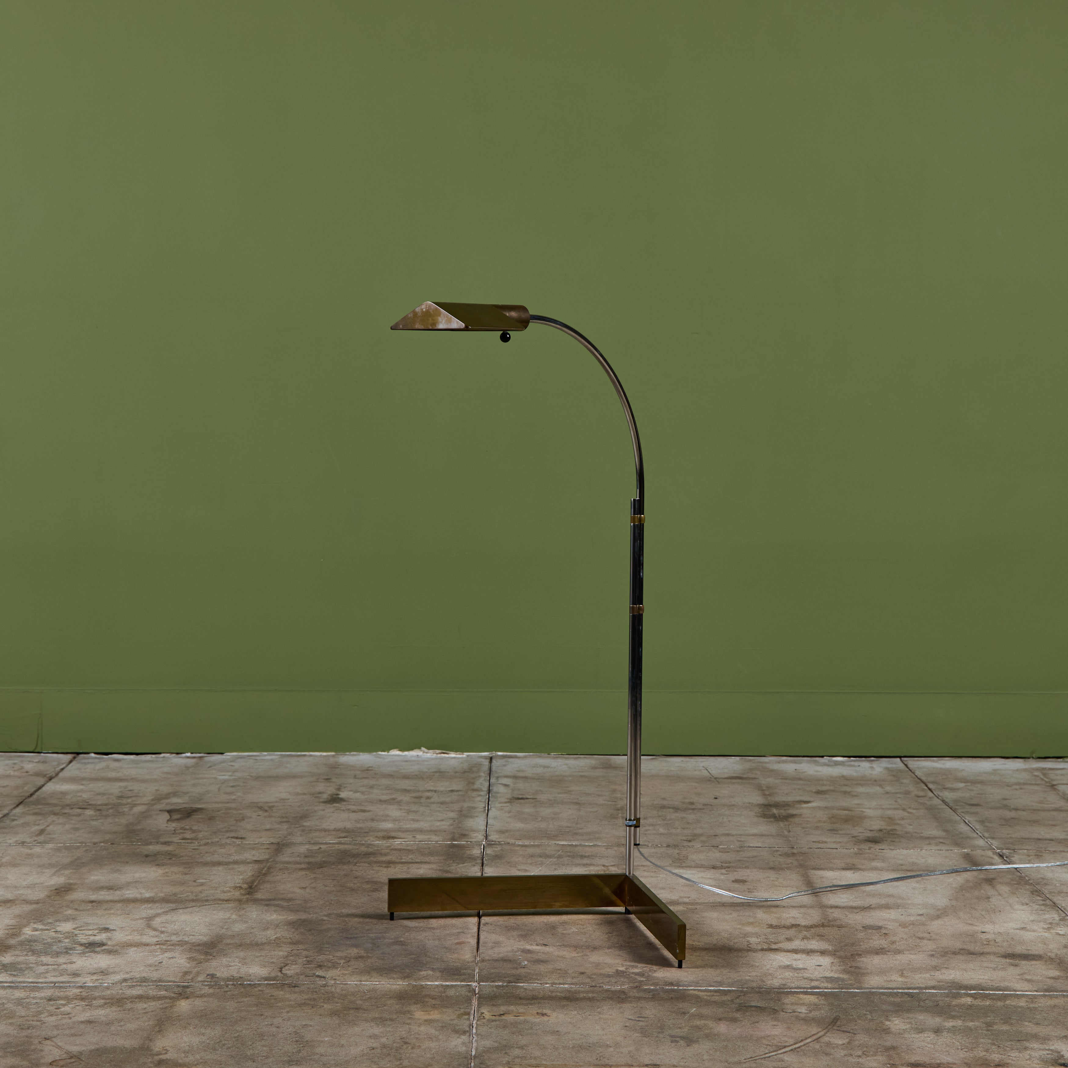Designed in the 1970s, these brass and stainless steel floor lamps by Cedric Hartman are an enduring design classic. The modernist floor lamps feature triangular brass shades attached to two curved parallel stainless steel stems that offer focused task lighting. The arched stainless steel pole terminates into a heavy brass v-base. The poles are fastened with brass detailing that allows you to adjust the height. Discreet legs allow the lamps to “hover” just above the floor, exaggerating the counterweighted arc of the central support. Bottom of bases are engraved with designer signature and serial number.
