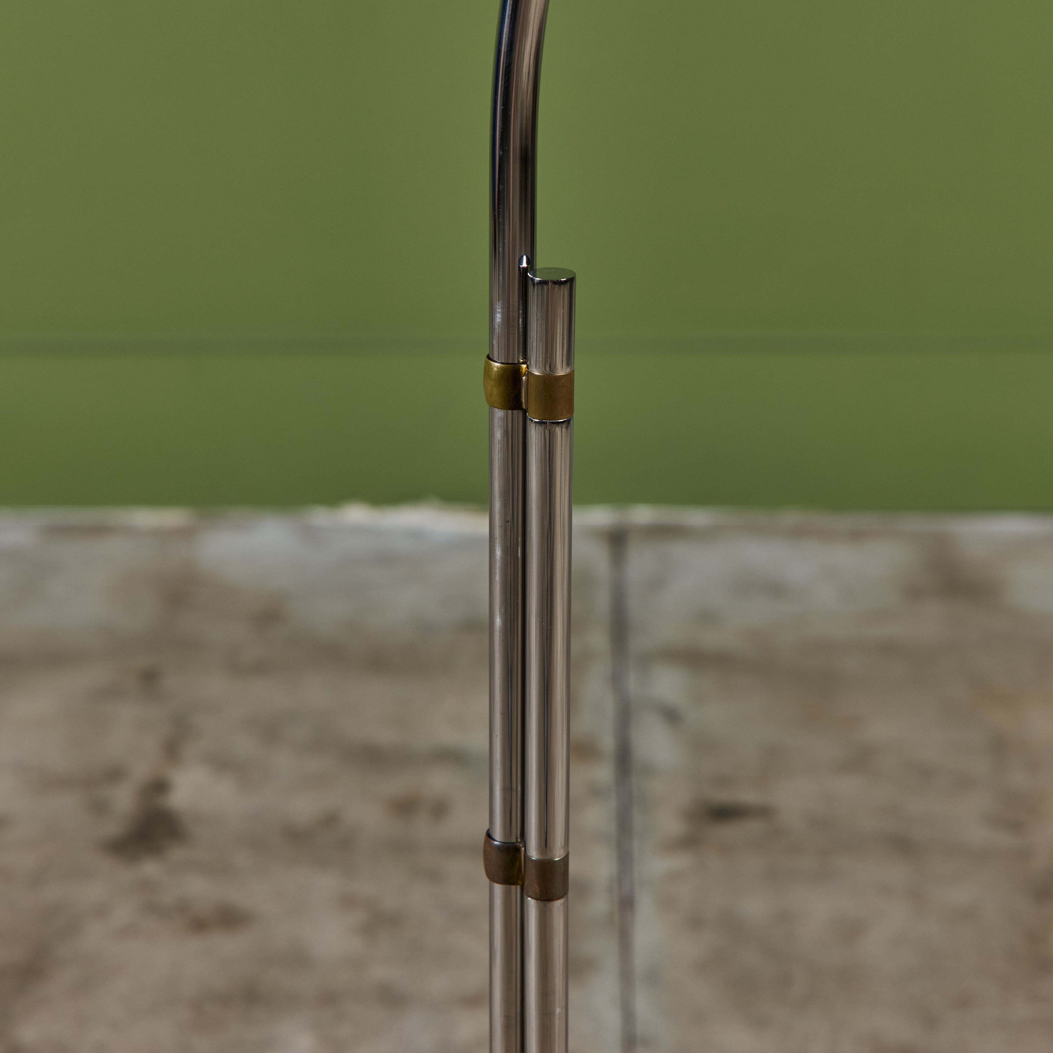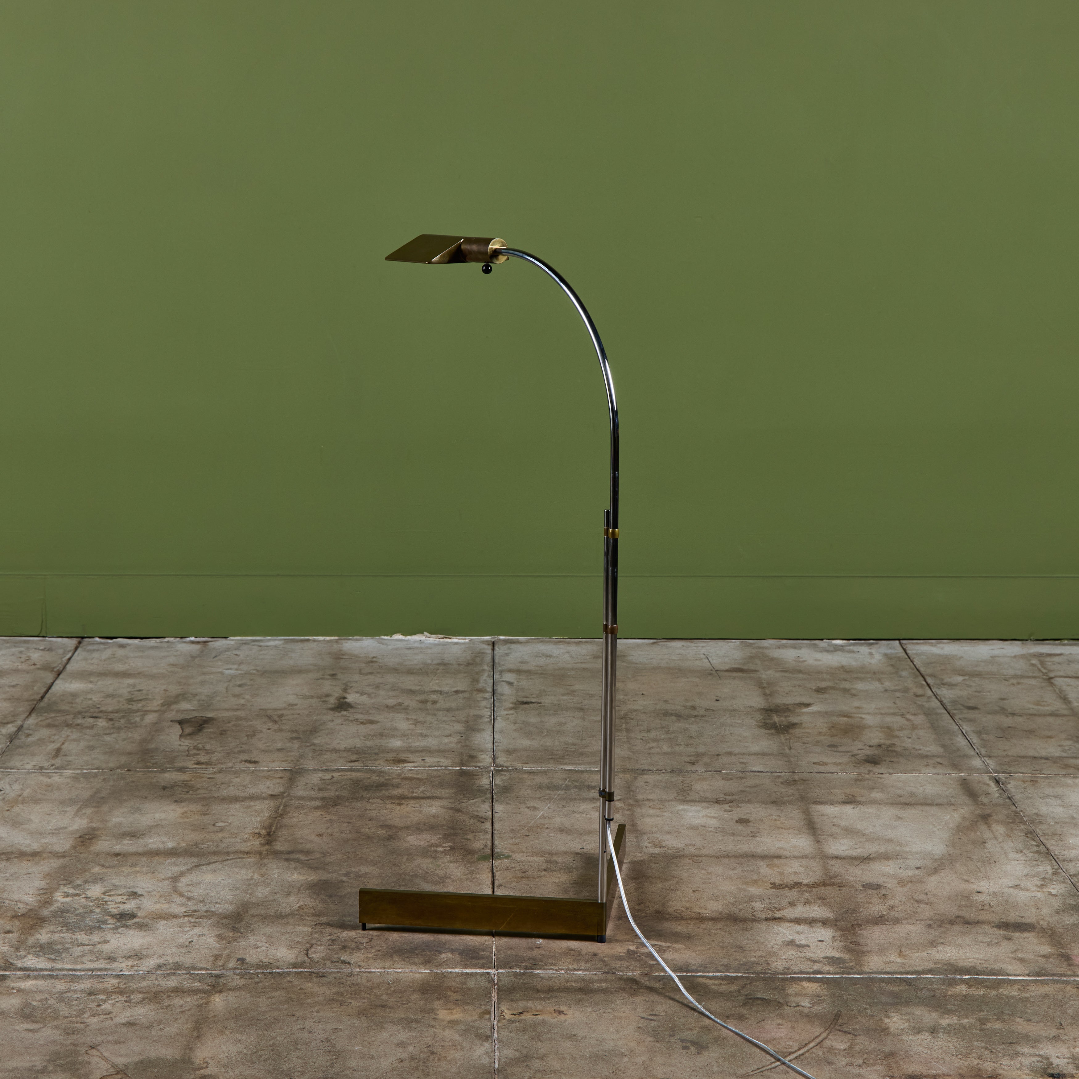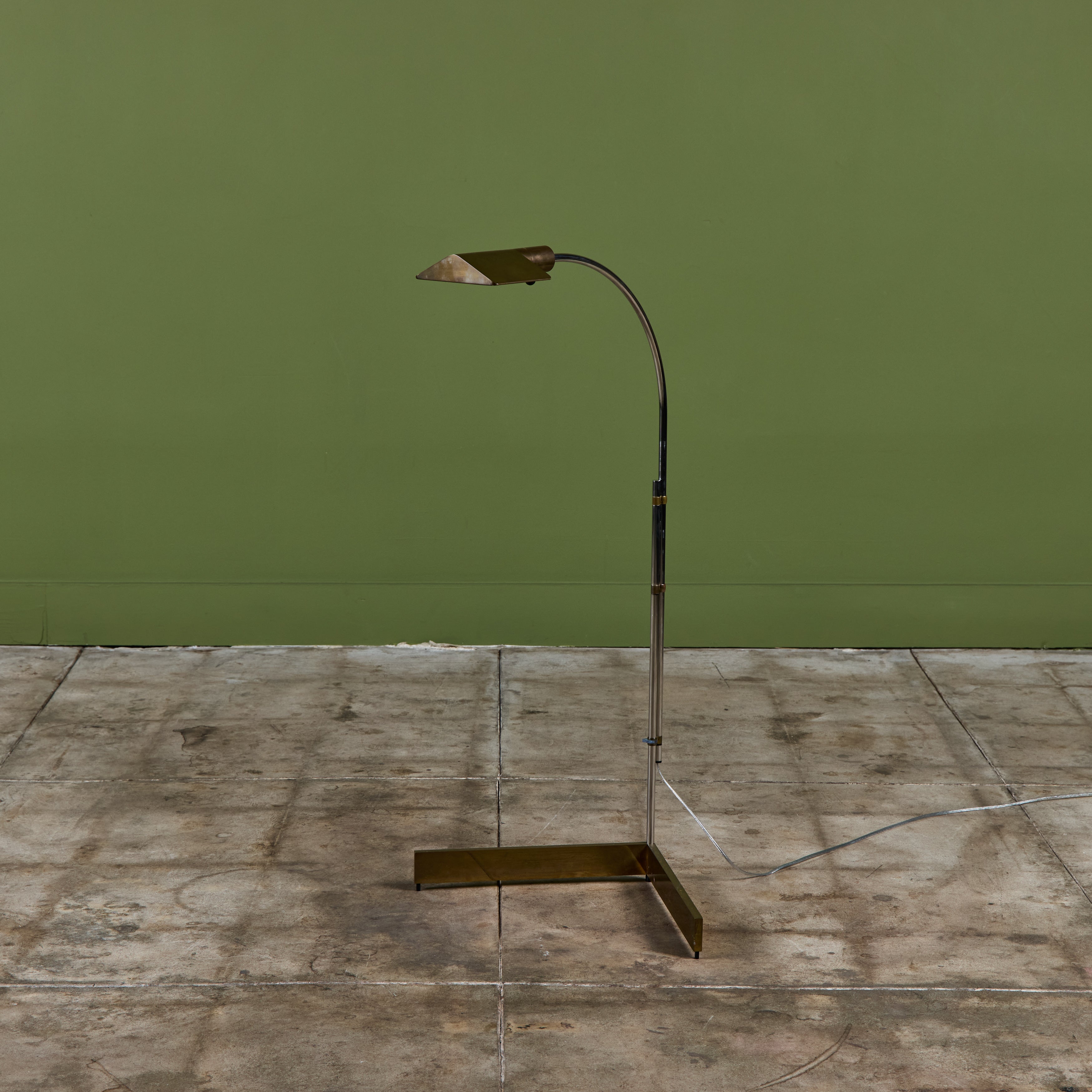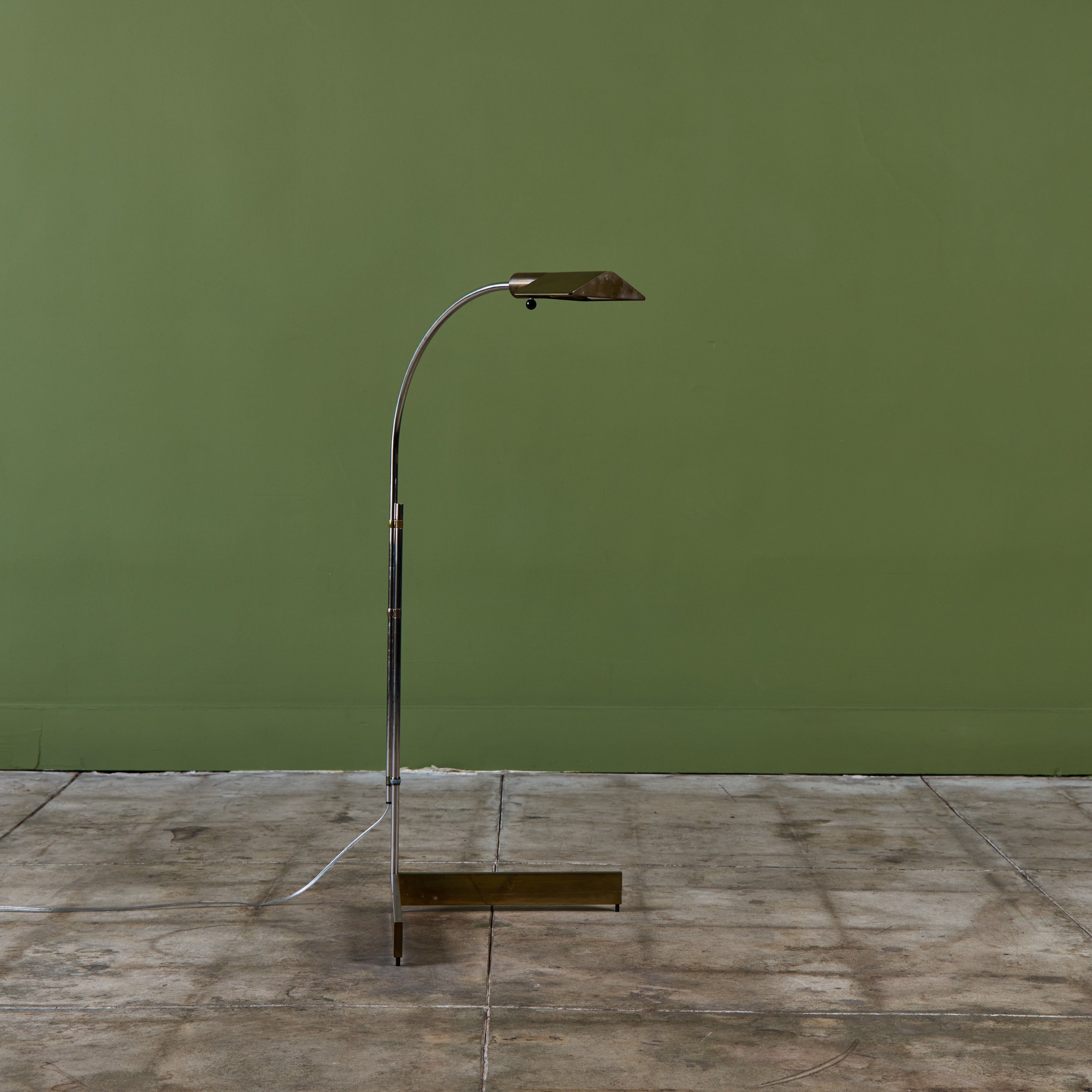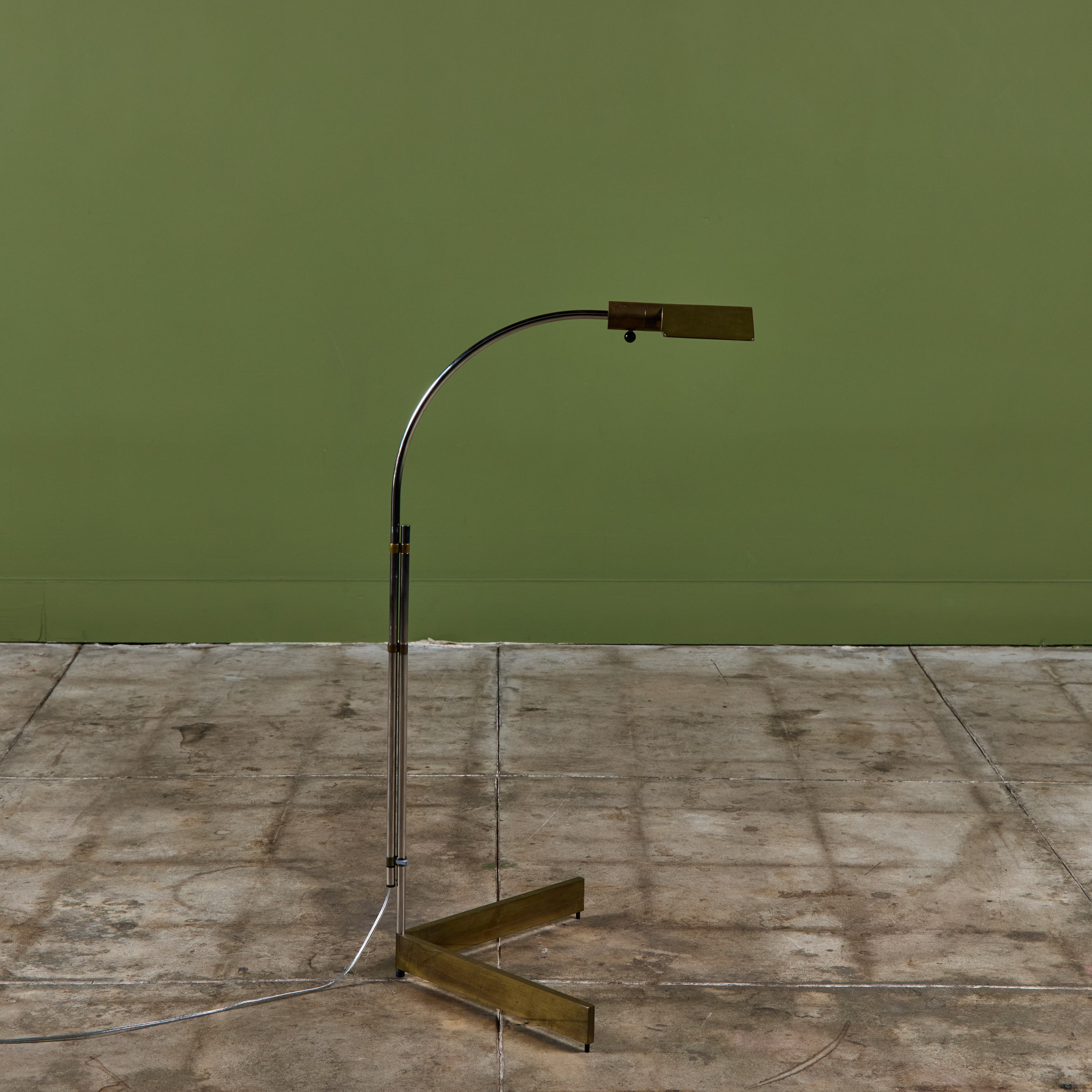 Designed in the 1970s, these brass and stainless steel floor lamps by Cedric Hartman are an enduring design classic. The modernist floor lamps feature triangular brass shades attached to two curved parallel stainless steel stems that offer focused task lighting. The arched stainless steel pole terminates into a heavy brass v-base. The poles are fastened with brass detailing that allows you to adjust the height. Discreet legs allow the lamps to “hover” just above the floor, exaggerating the counterweighted arc of the central support. Bottom of bases are engraved with designer signature and serial number.