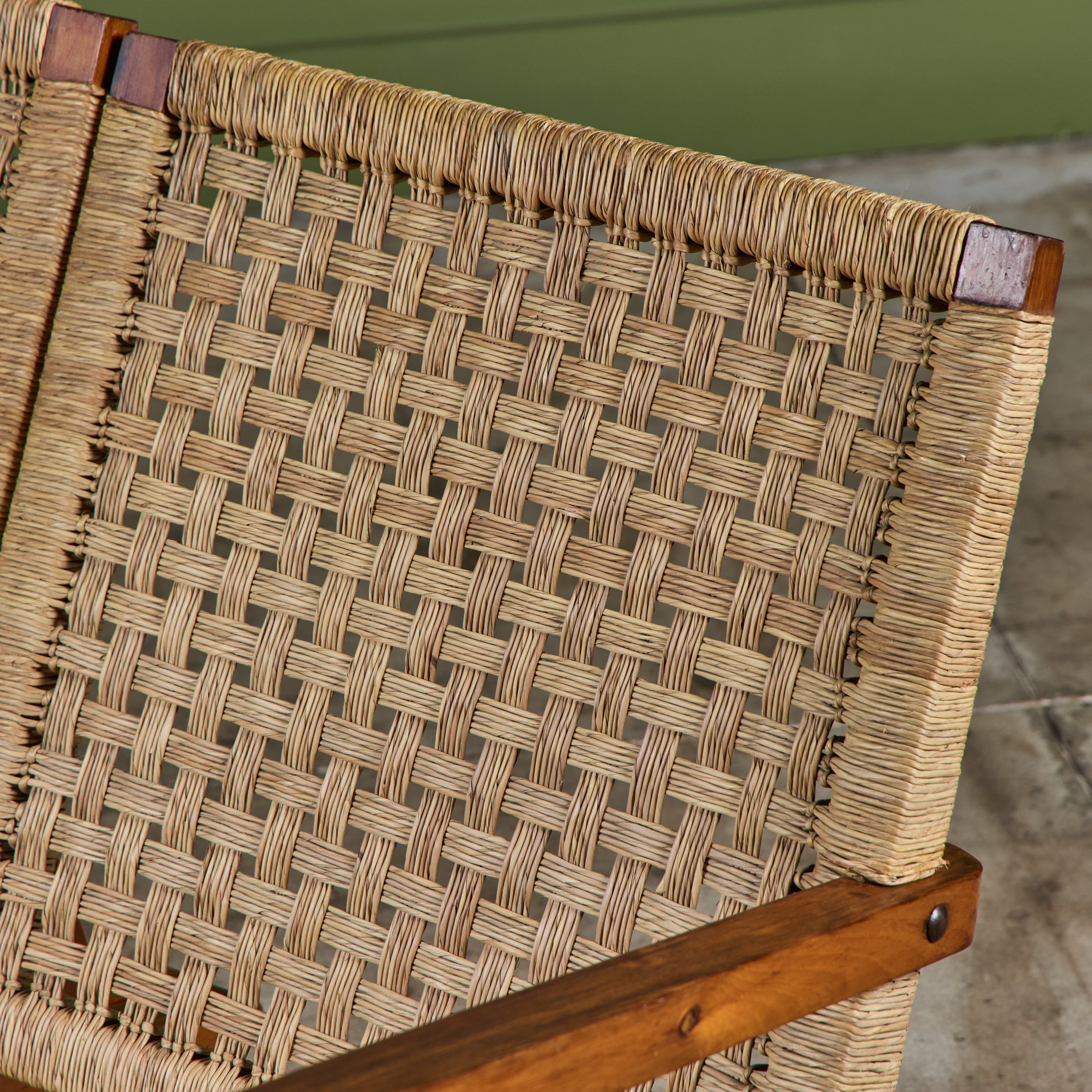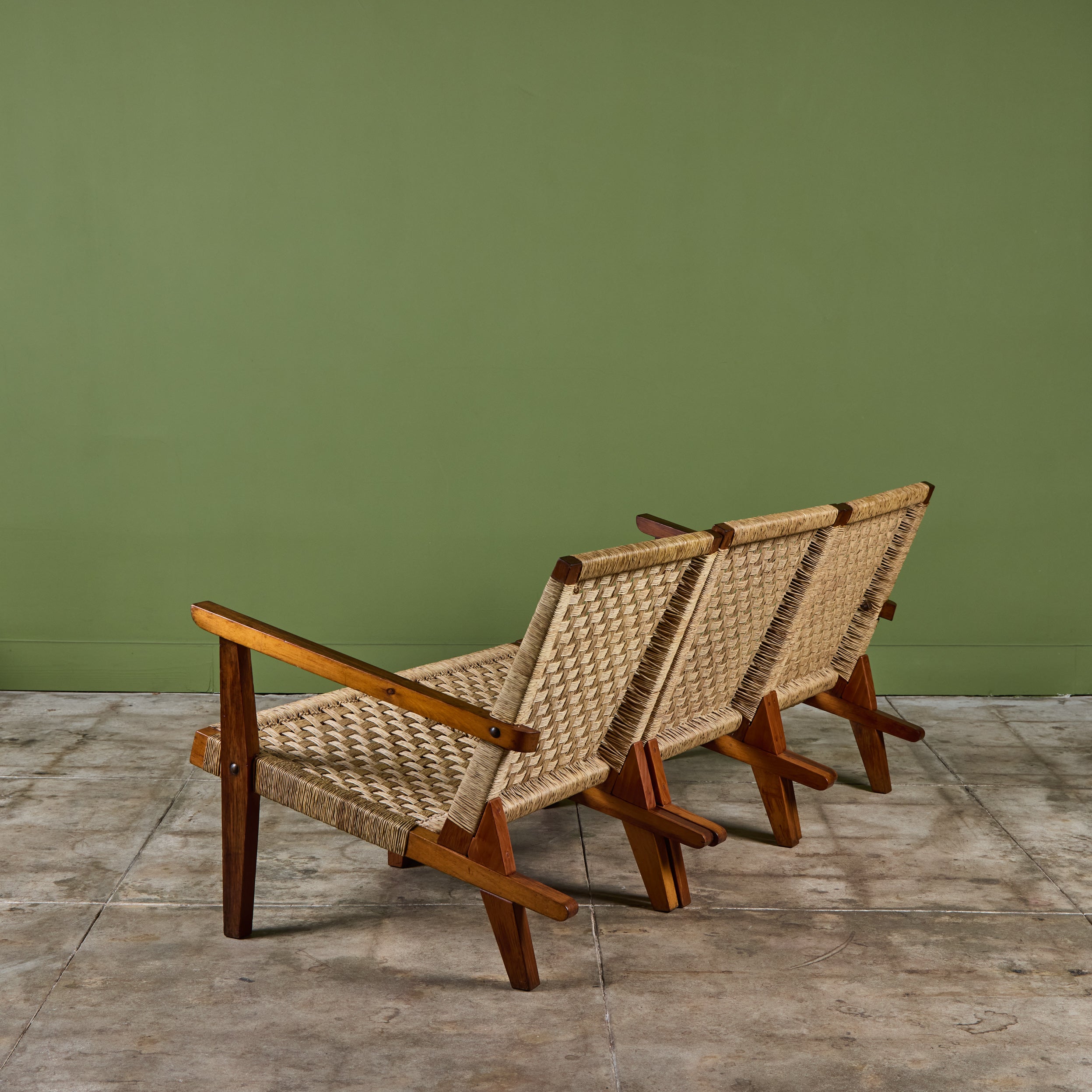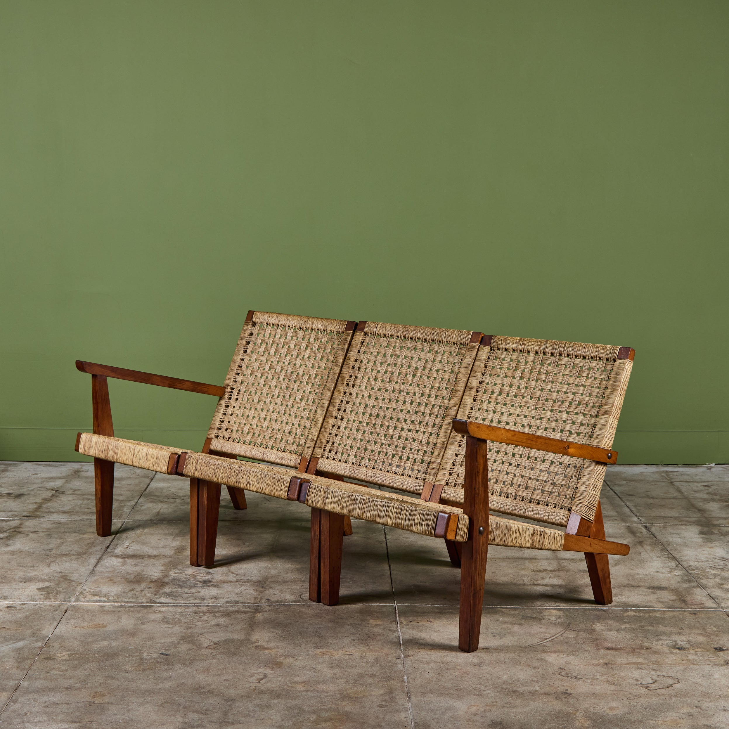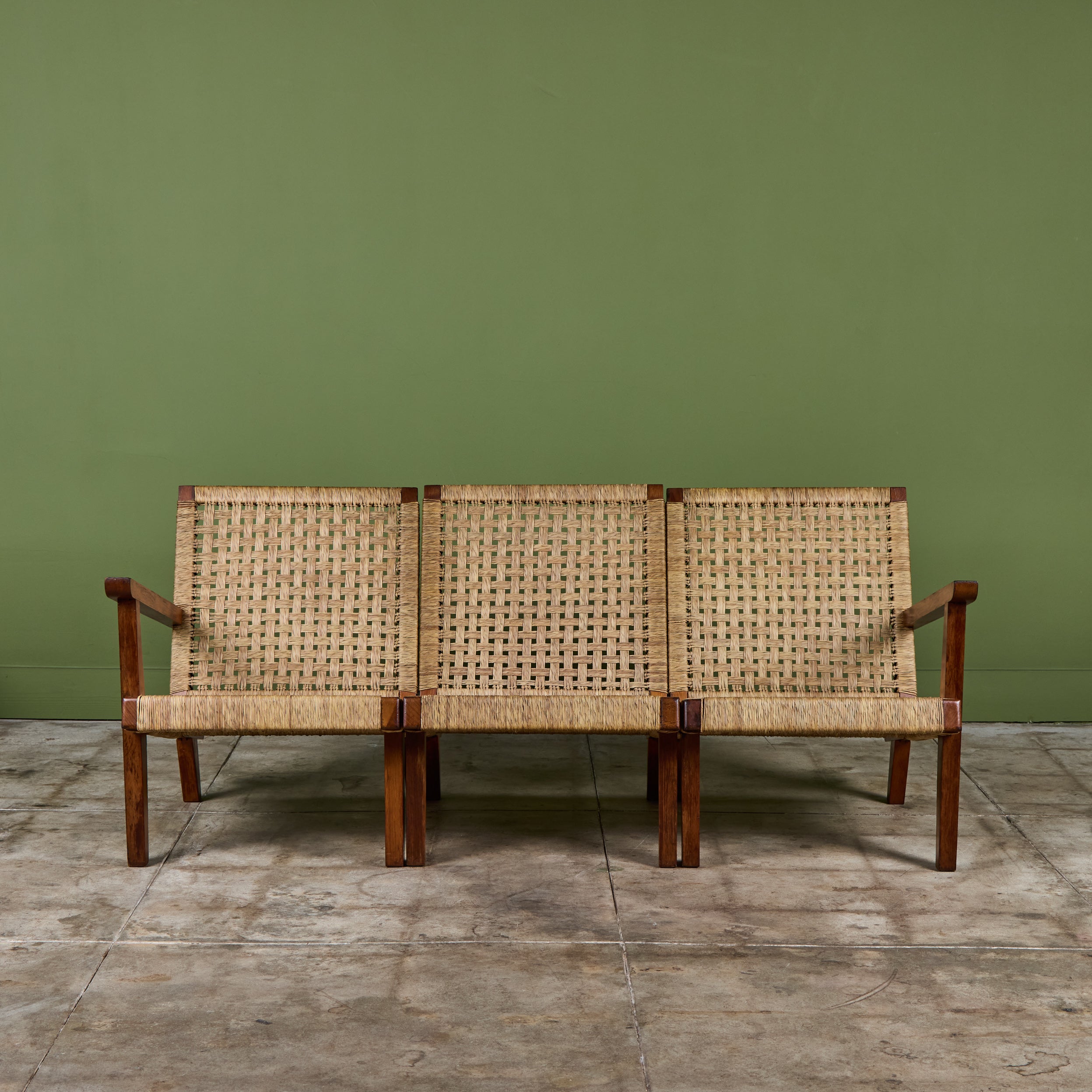 Bauhaus trained, Mexico City based designer, Michael Van Beuren created highly functional modern pieces inspired by Mexican vernacular styles and materials. This example, c.1950s Mexico has a pine frame with a woven rattan seat. The sofa is convertible as it can be used as a sofa, loveseat or separate chairs.