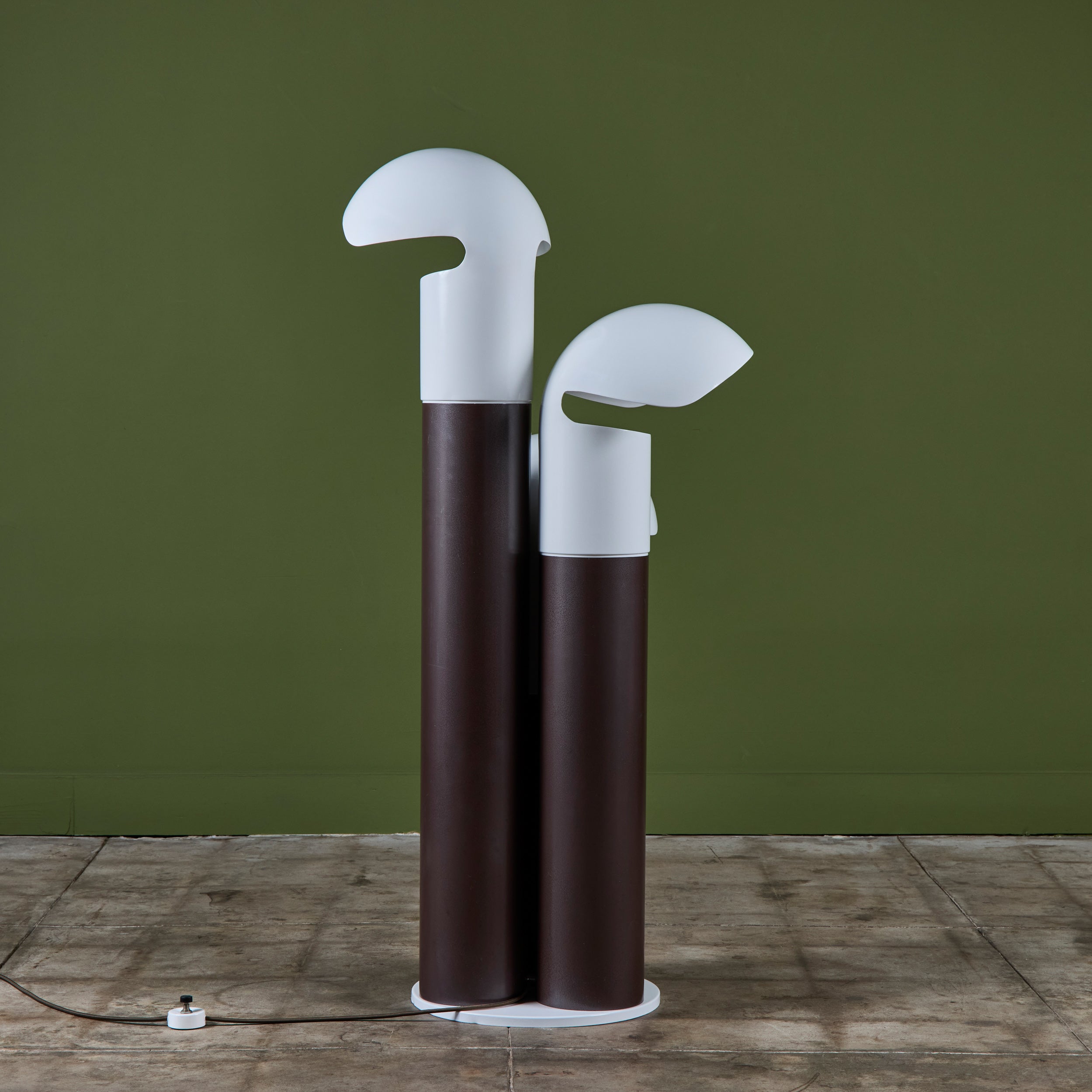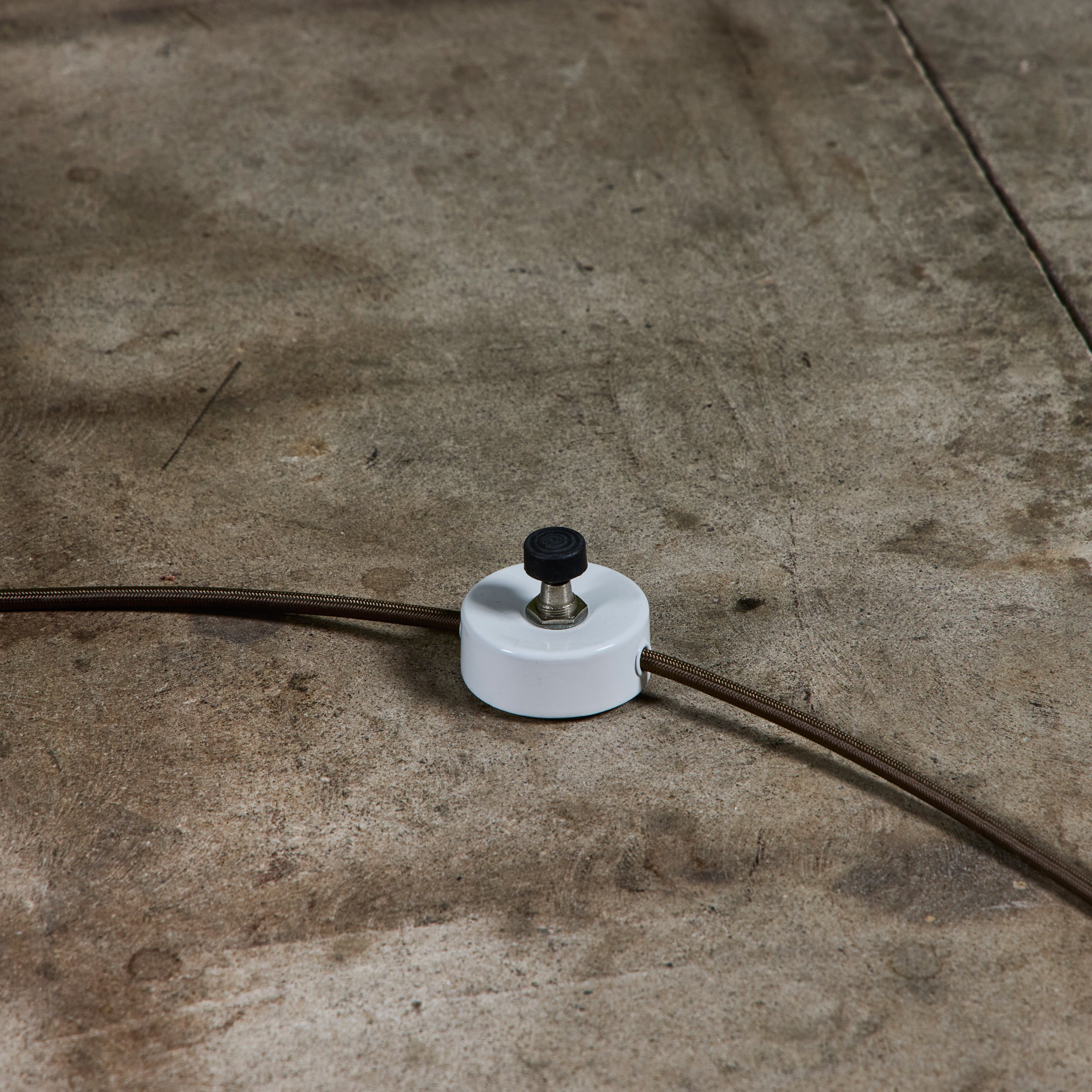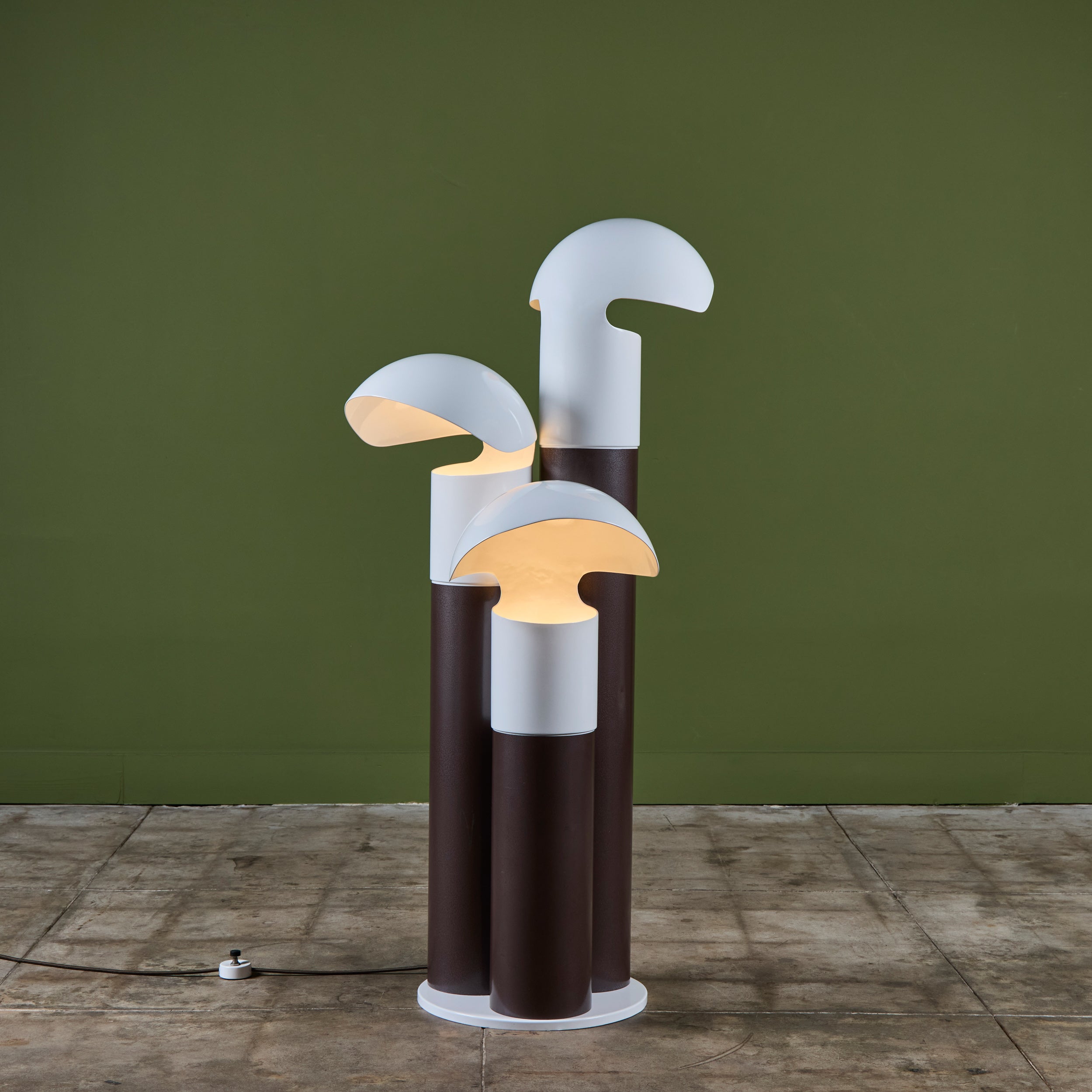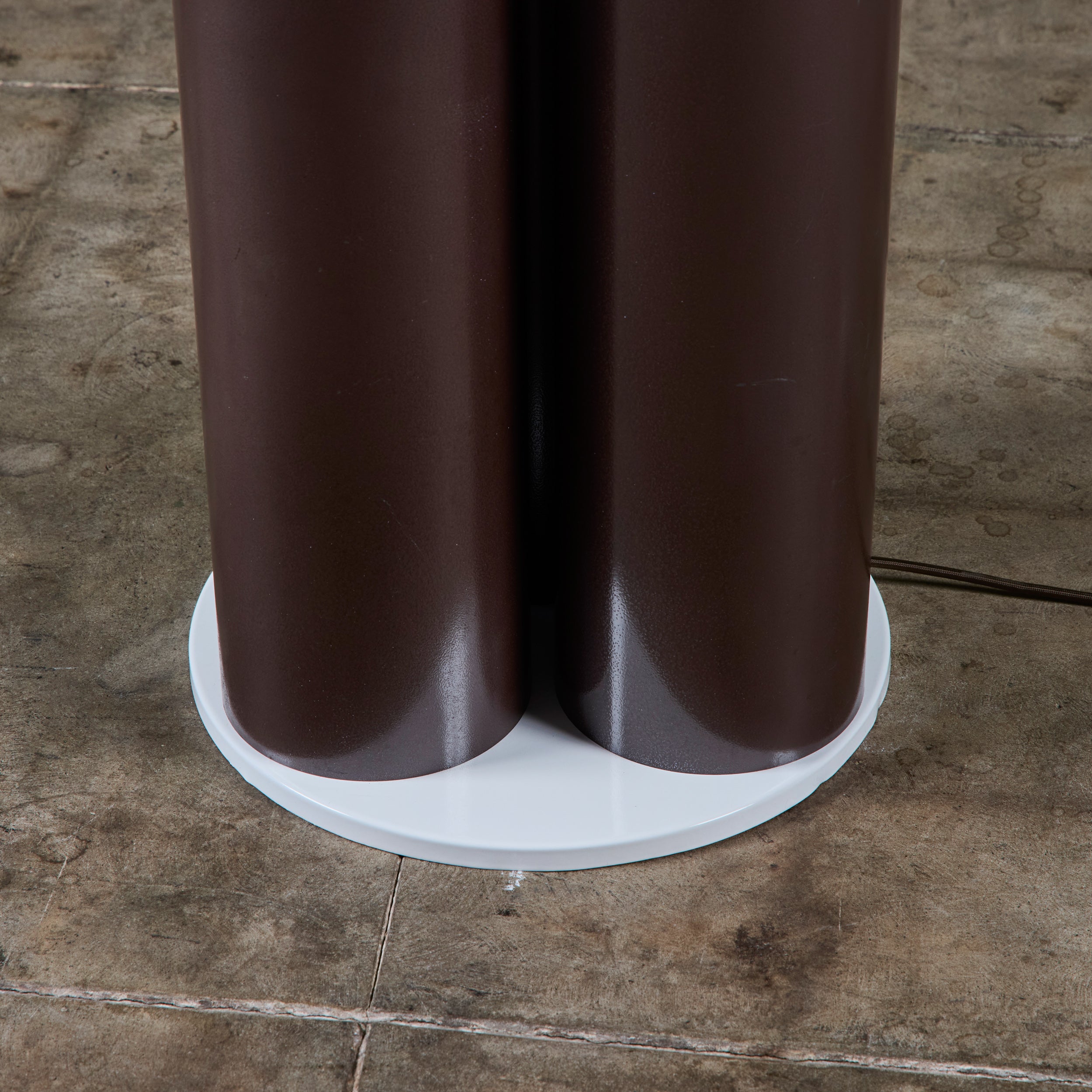 Very rare Franco Buzzi Ceriani three shade floor lamp, c.1970s, Italy. The floor lamp is constructed of three brown steel tubular stems and three white powdered coated shades all on a circular round base. The foot pedal switch is located on the cord and offers three lighting options, one light, two lights or all three, to set the mood.