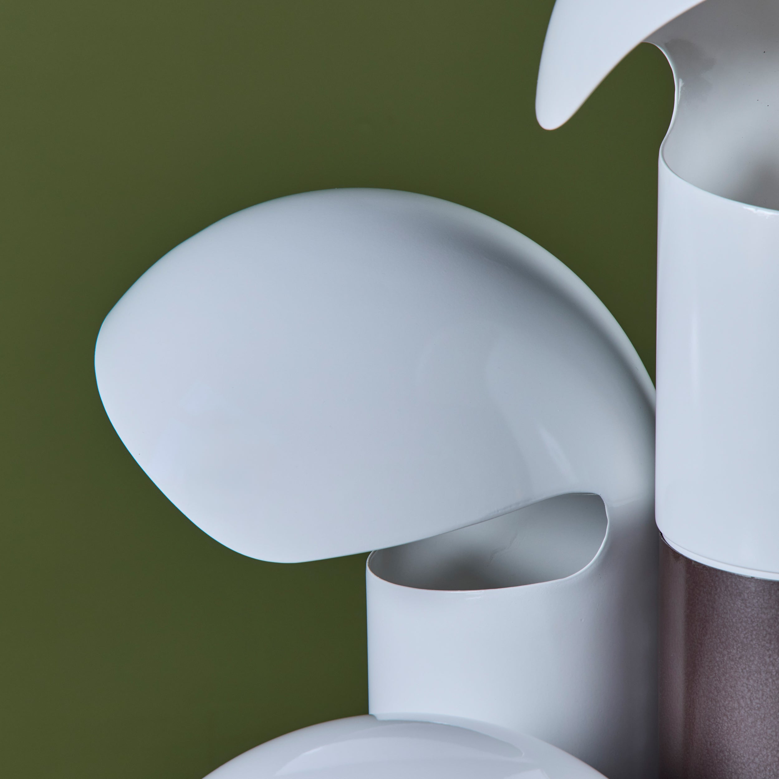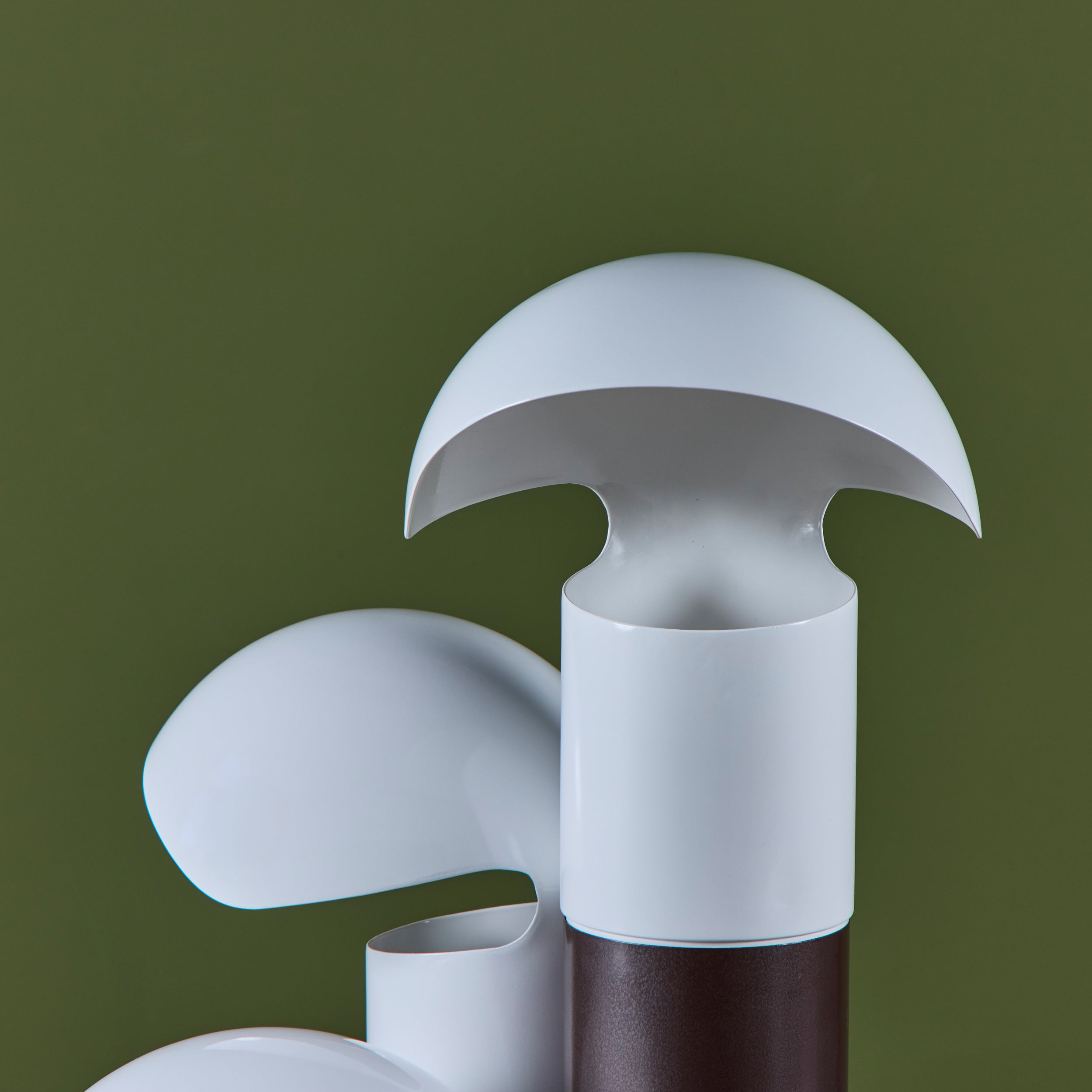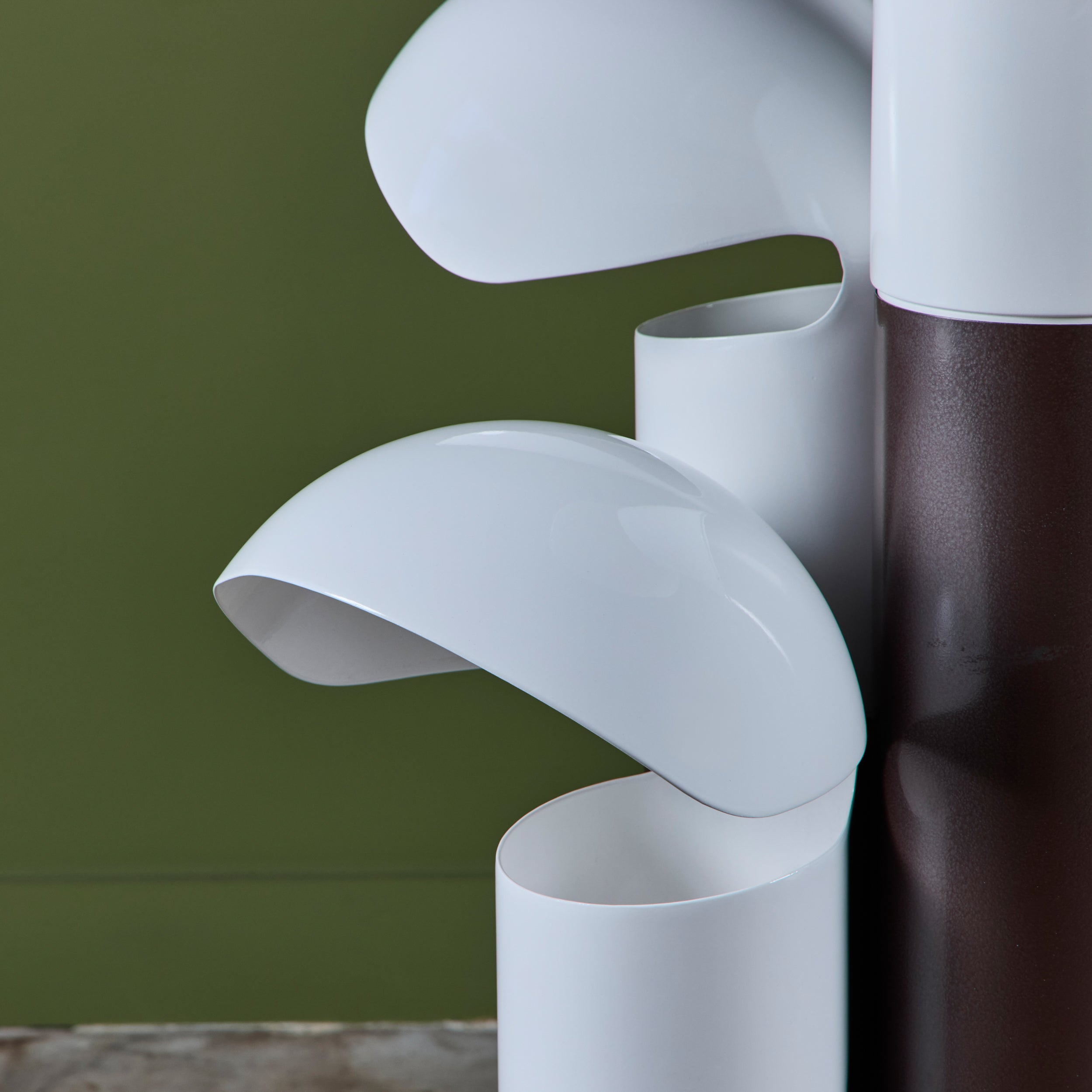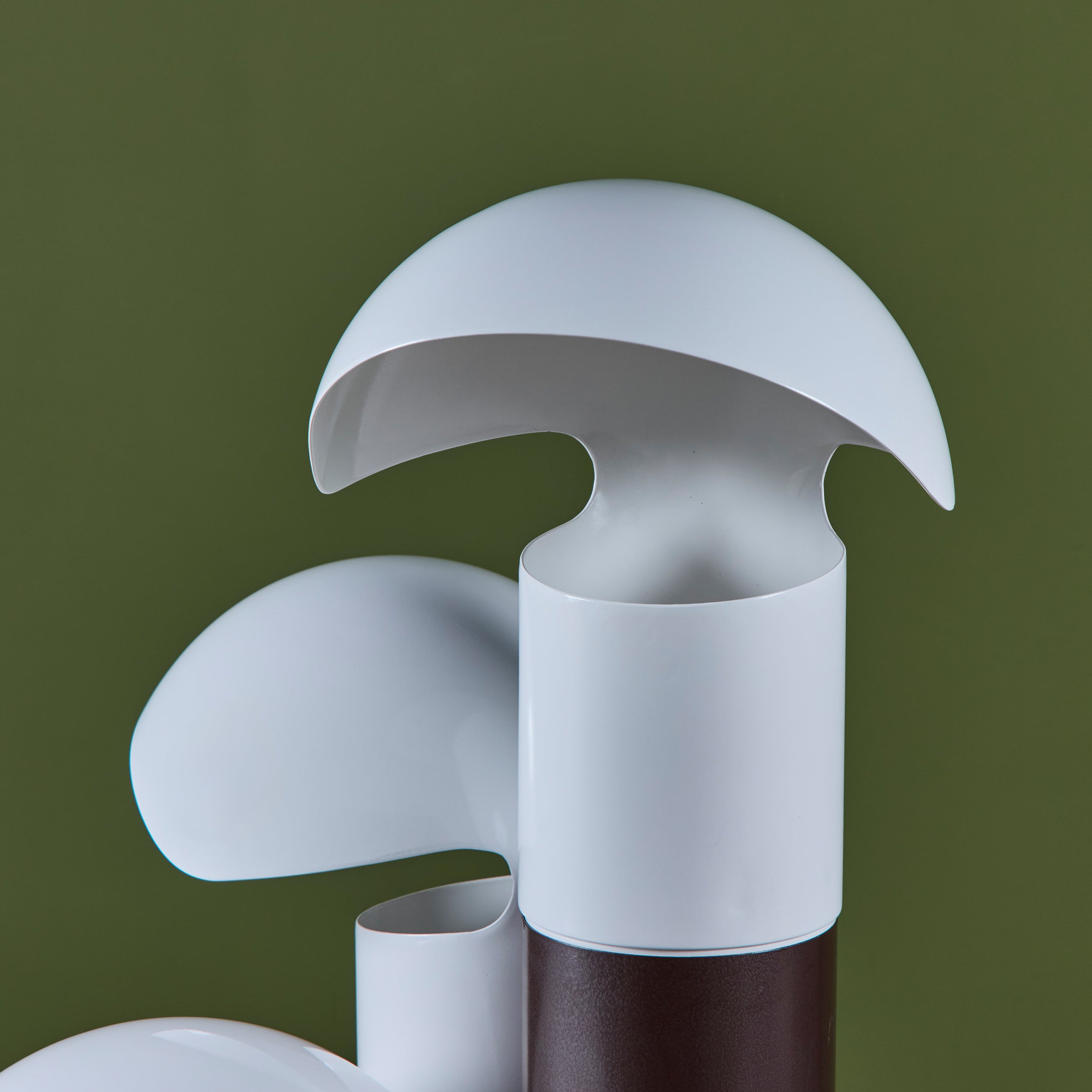 Very rare Franco Buzzi Ceriani three shade floor lamp, c.1970s, Italy. The floor lamp is constructed of three brown steel tubular stems and three white powdered coated shades all on a circular round base. The foot pedal switch is located on the cord and offers three lighting options, one light, two lights or all three, to set the mood.