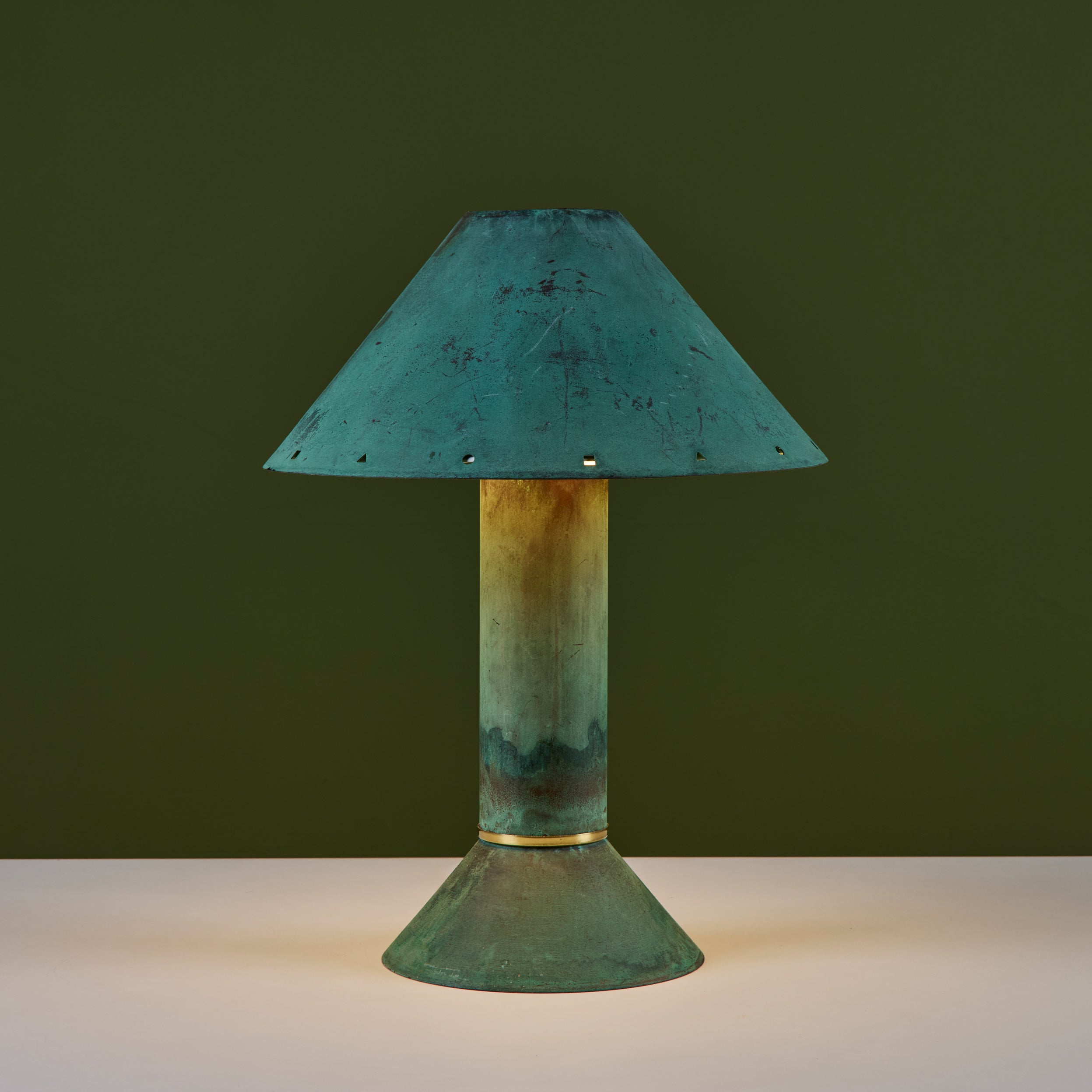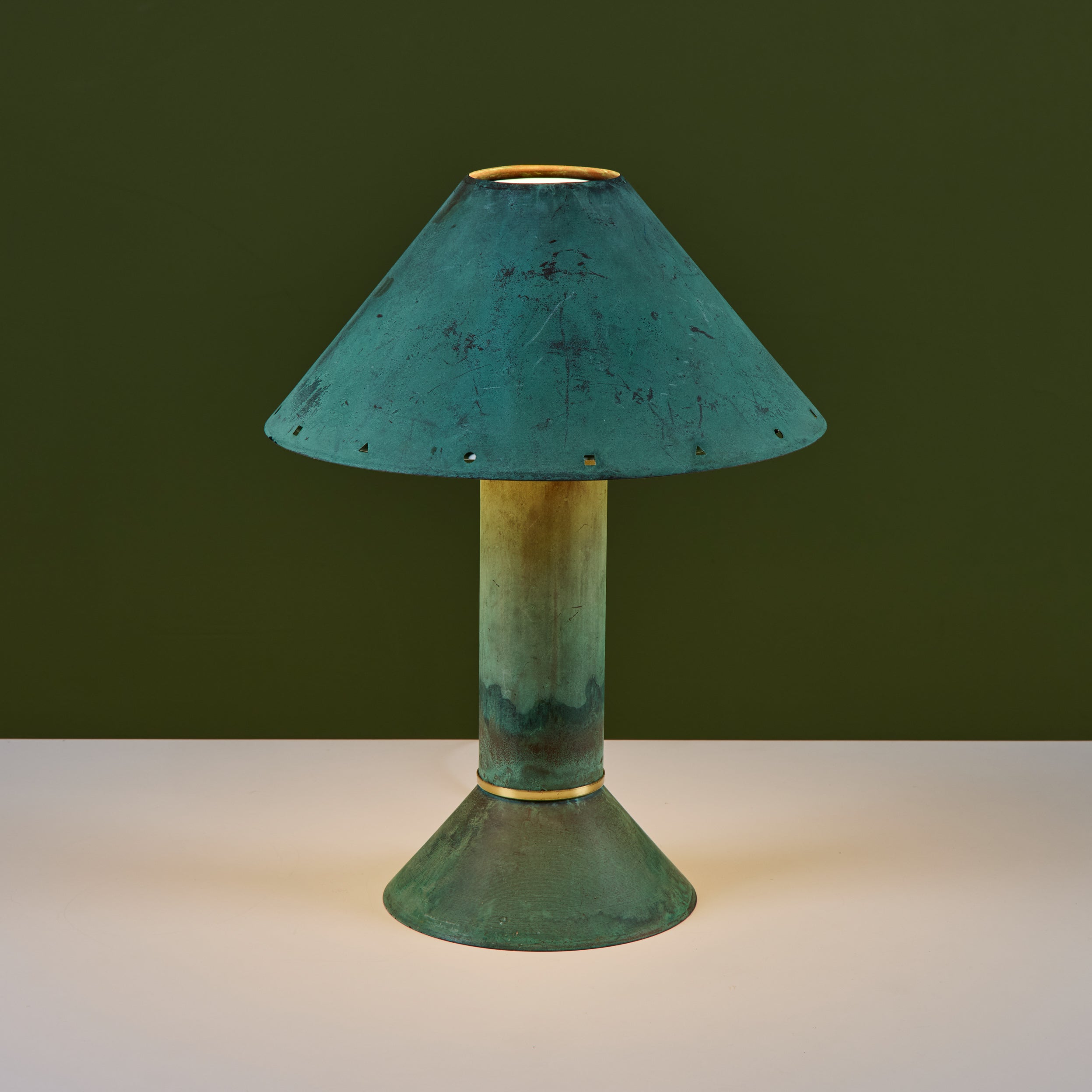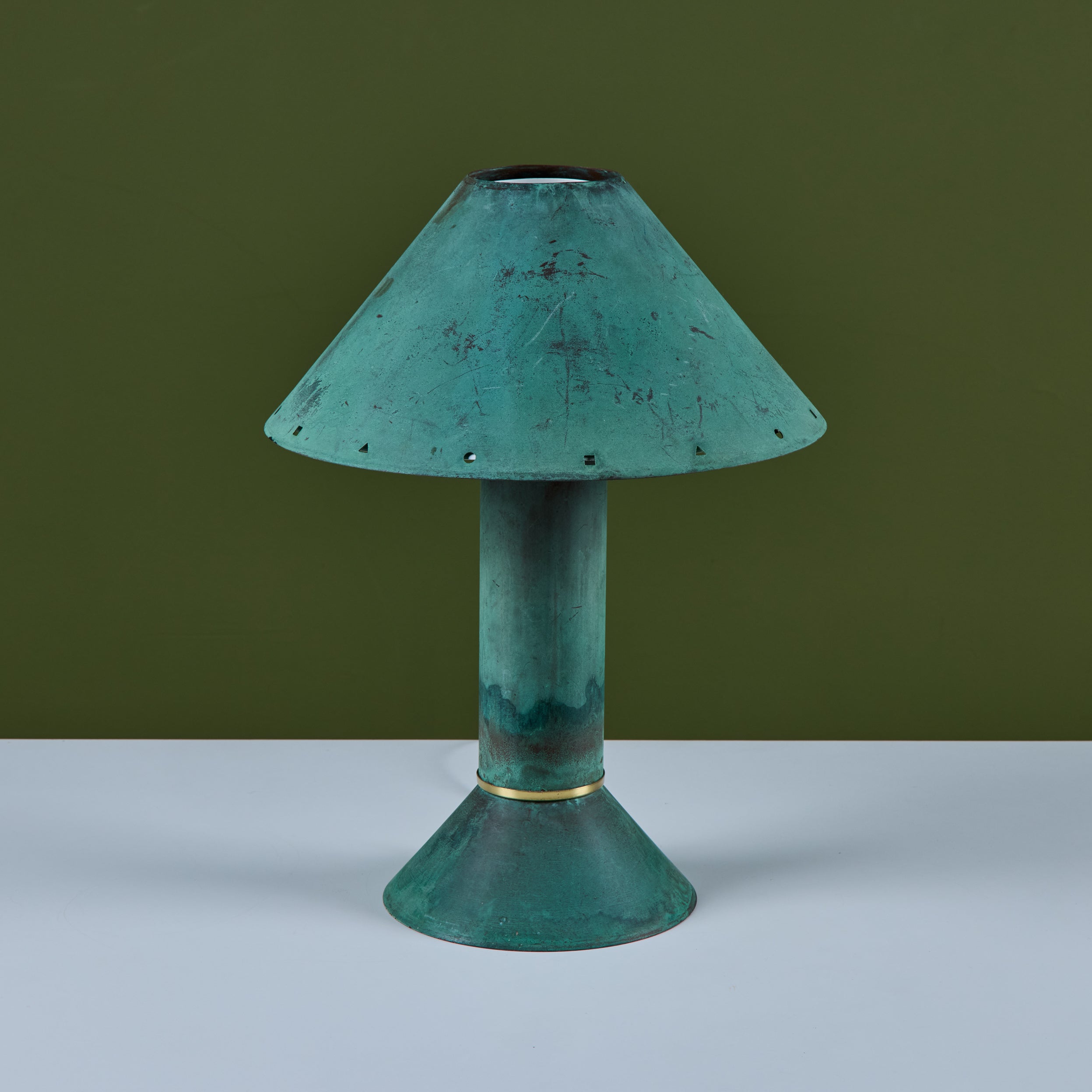 Postmodern table lamp by Los Angeles lighting designer Ron Rezek, c.1980s. The lamp features a verdigris copper frame and removable shade with polished brass ring accent that sits at the bottom of cone shaped base. The shade features different shaped cutouts along the rim, adding a nice design detail when the lamp is lit. The shade is removable and sits atop a wire frame. The on/off mechanism is a full-range dimmer switch, offering the option of the perfect amount of light.