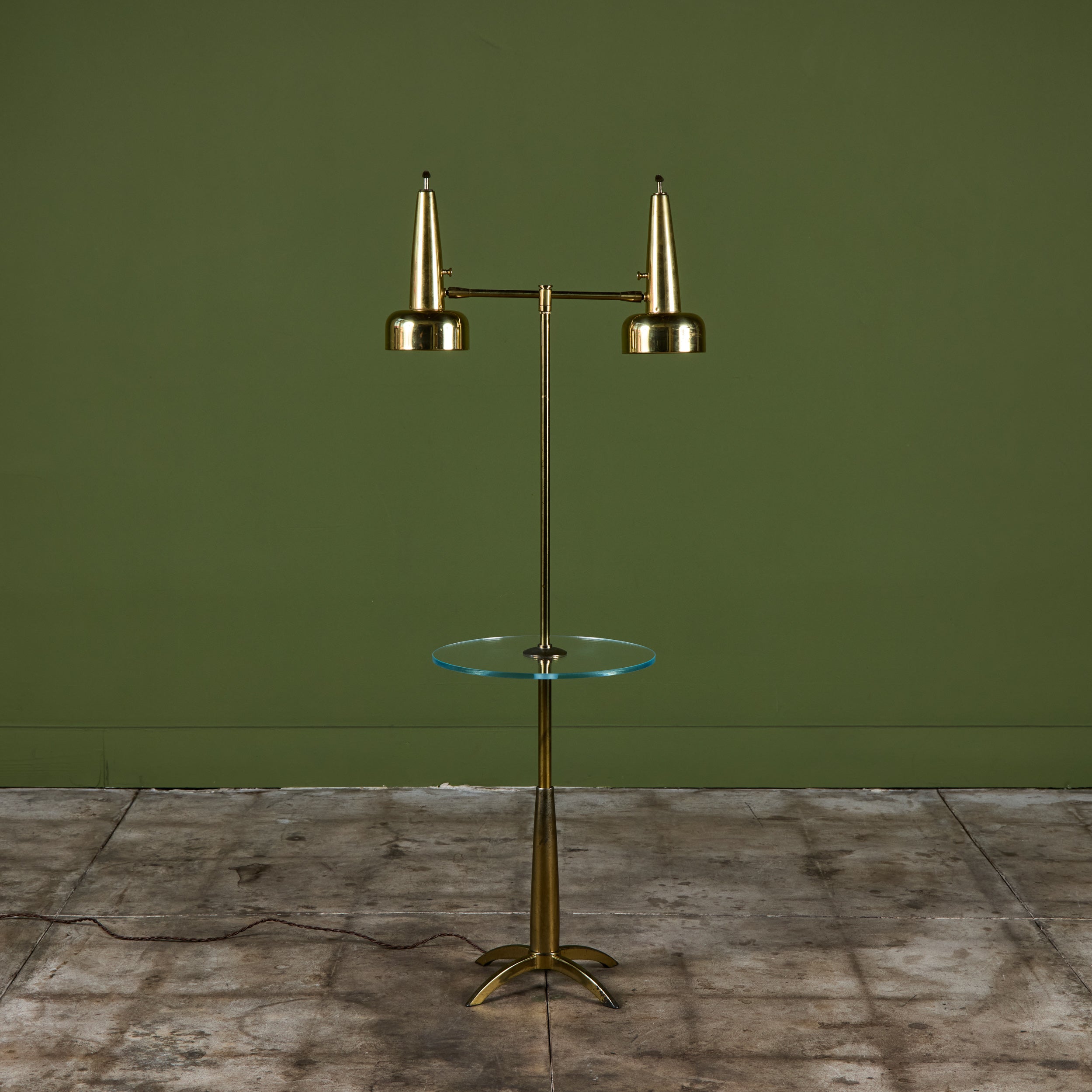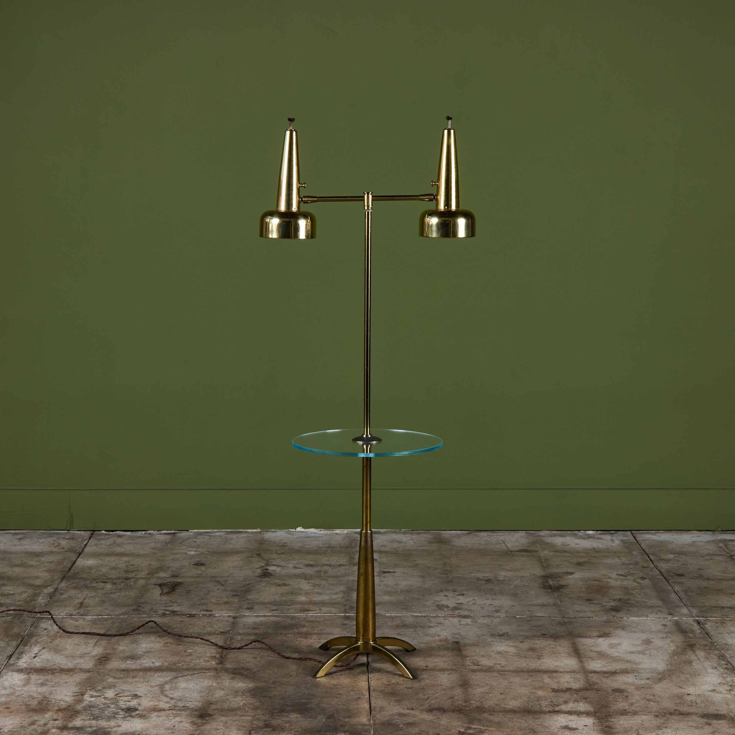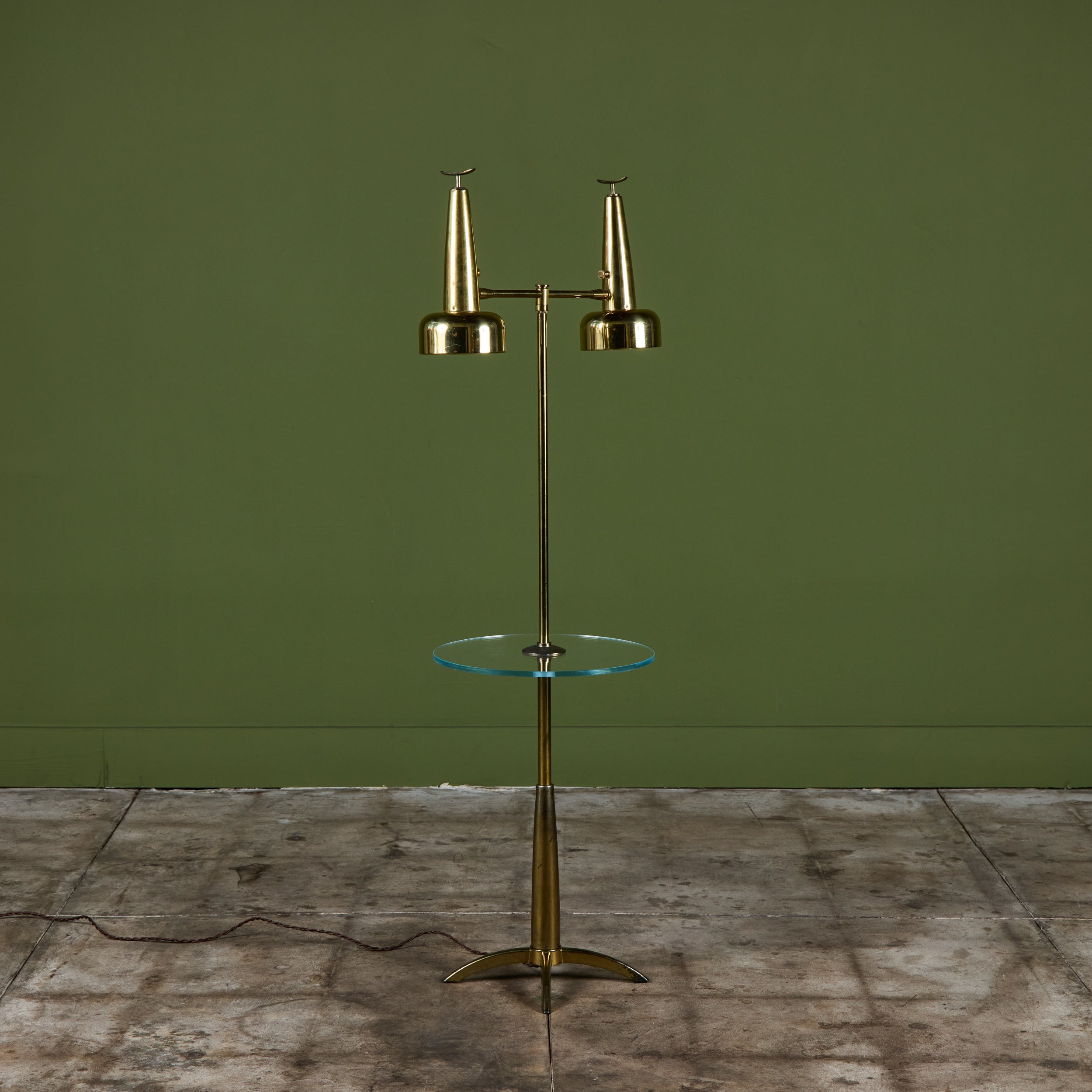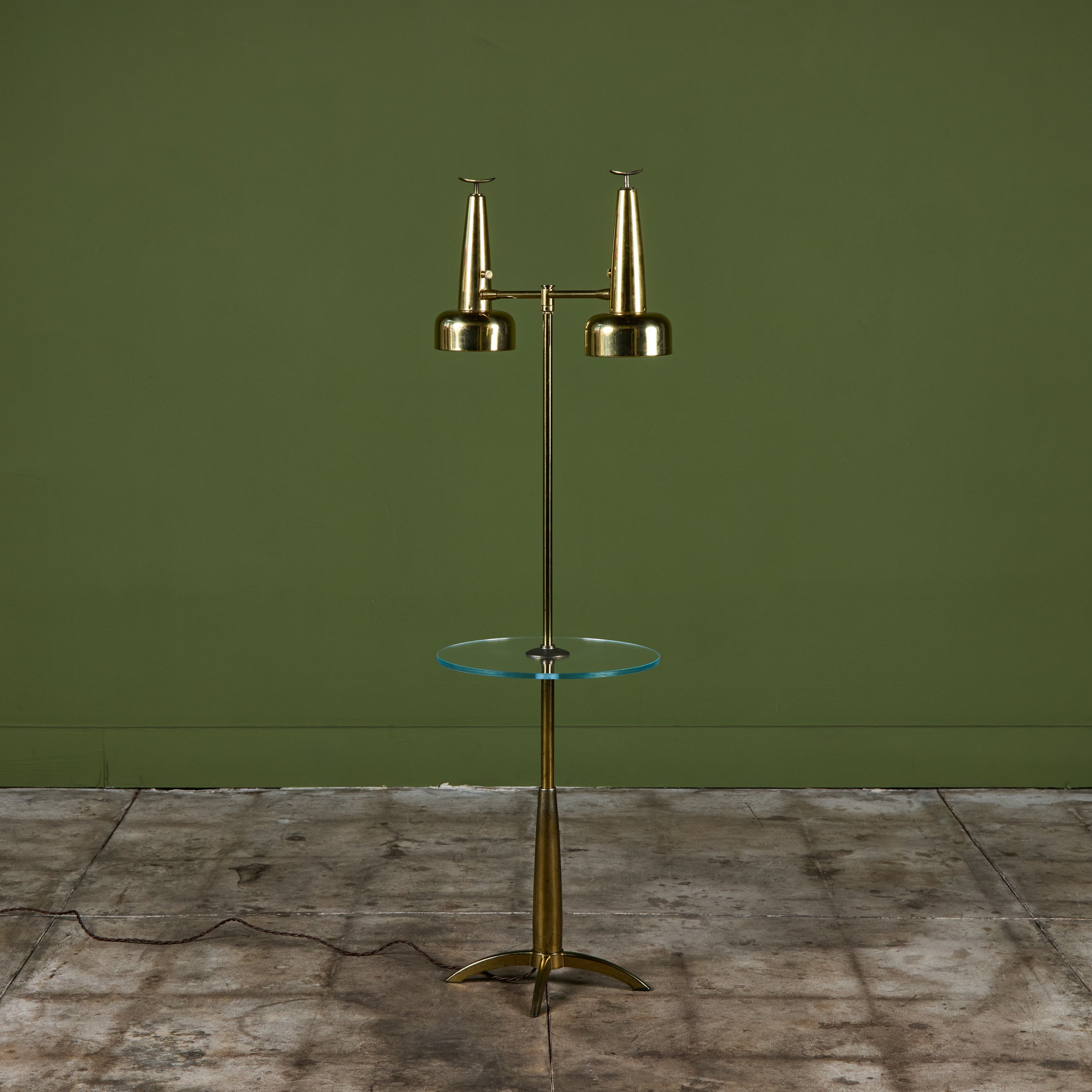 Double shade floor lamp by Stiffel, c.1970s, USA. The lamp features two brass lamp shades with directional lighting, supported by a four star brass base. The lamp showcases a round connected glass side table.