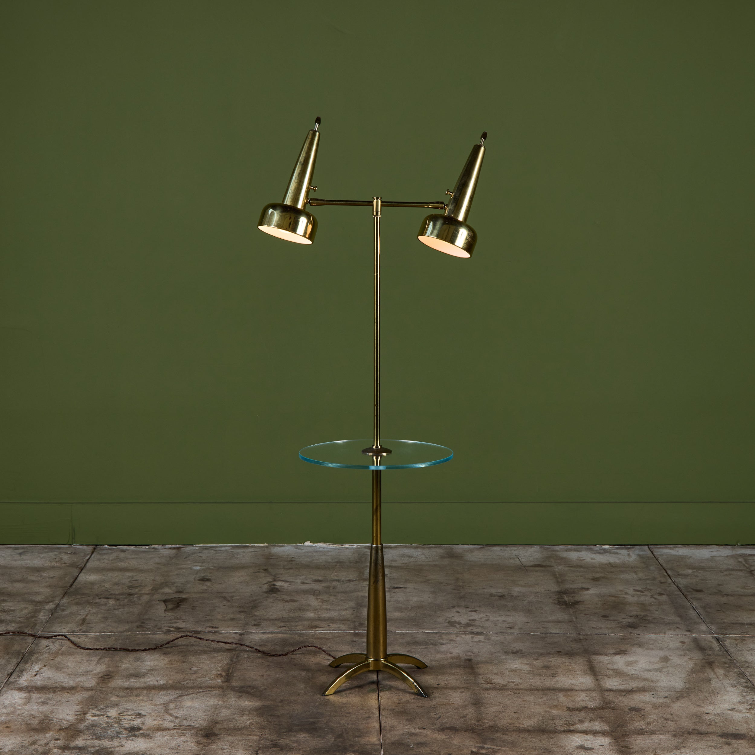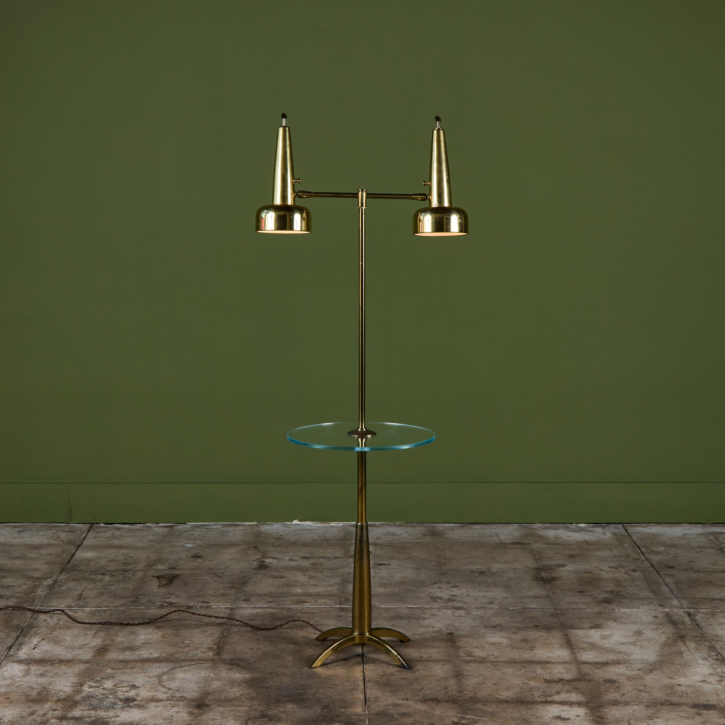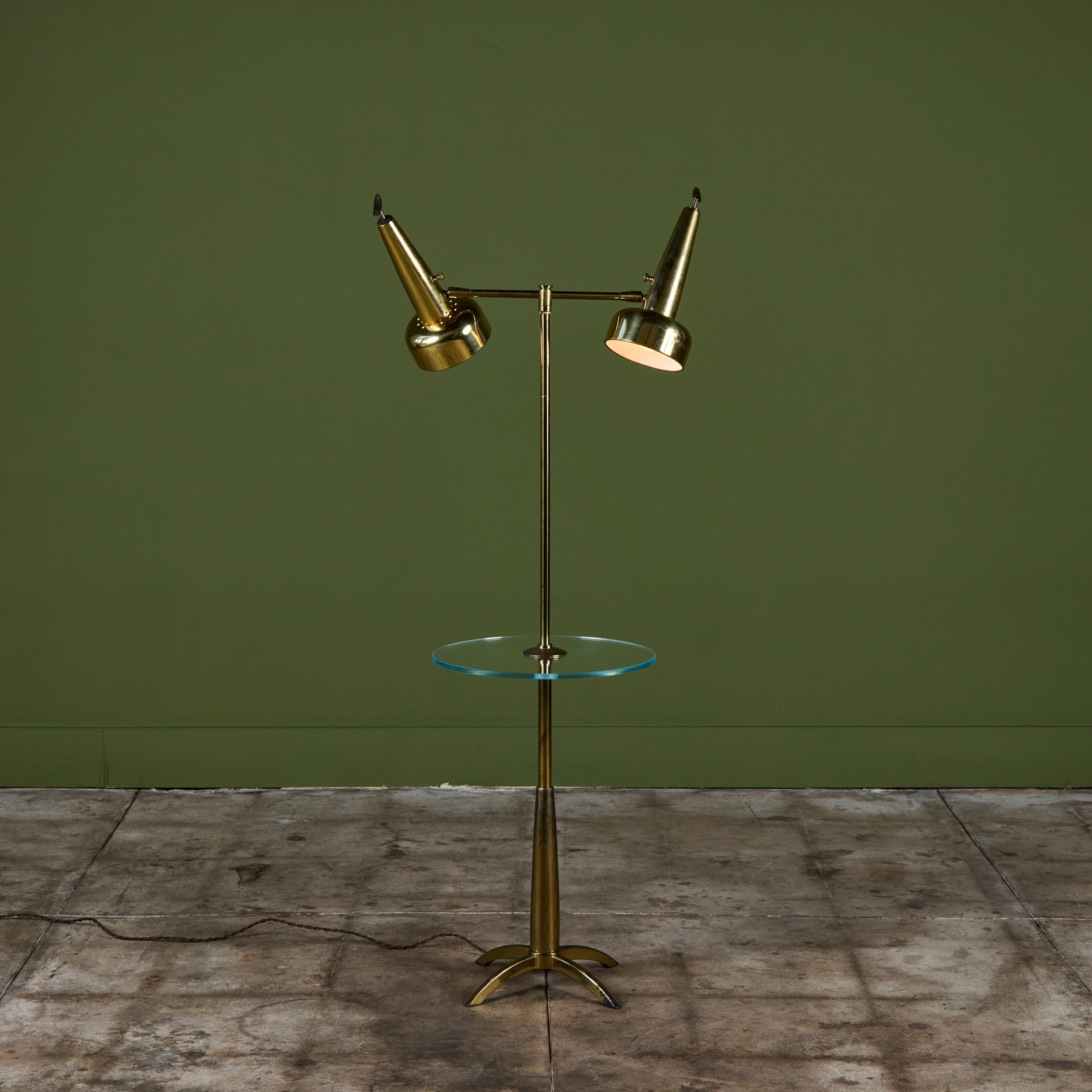 Double shade floor lamp by Stiffel, c.1970s, USA. The lamp features two brass lamp shades with directional lighting, supported by a four star brass base. The lamp showcases a round connected glass side table.
