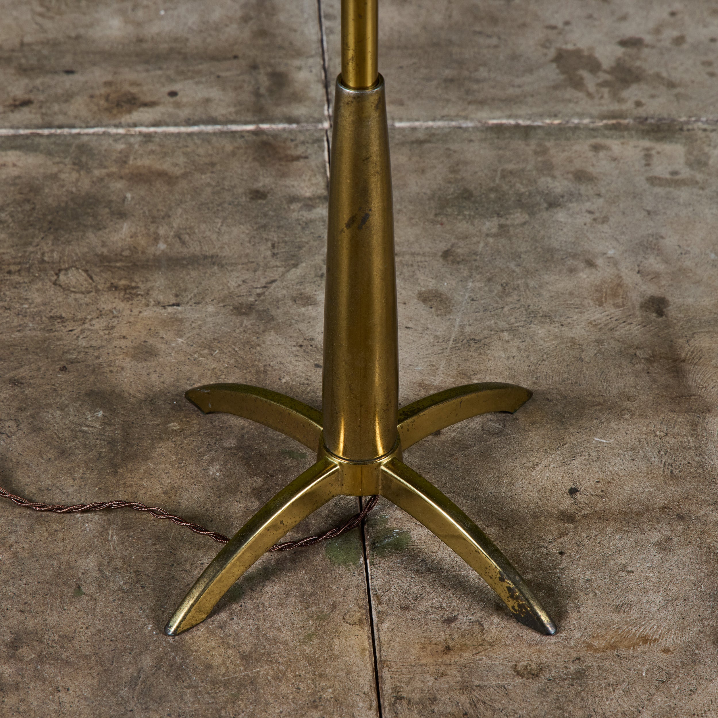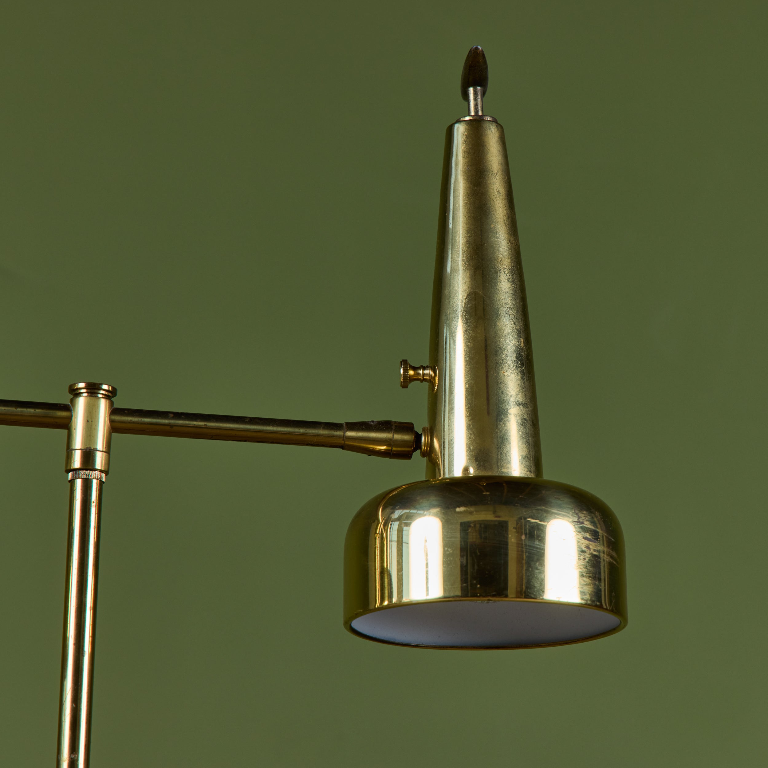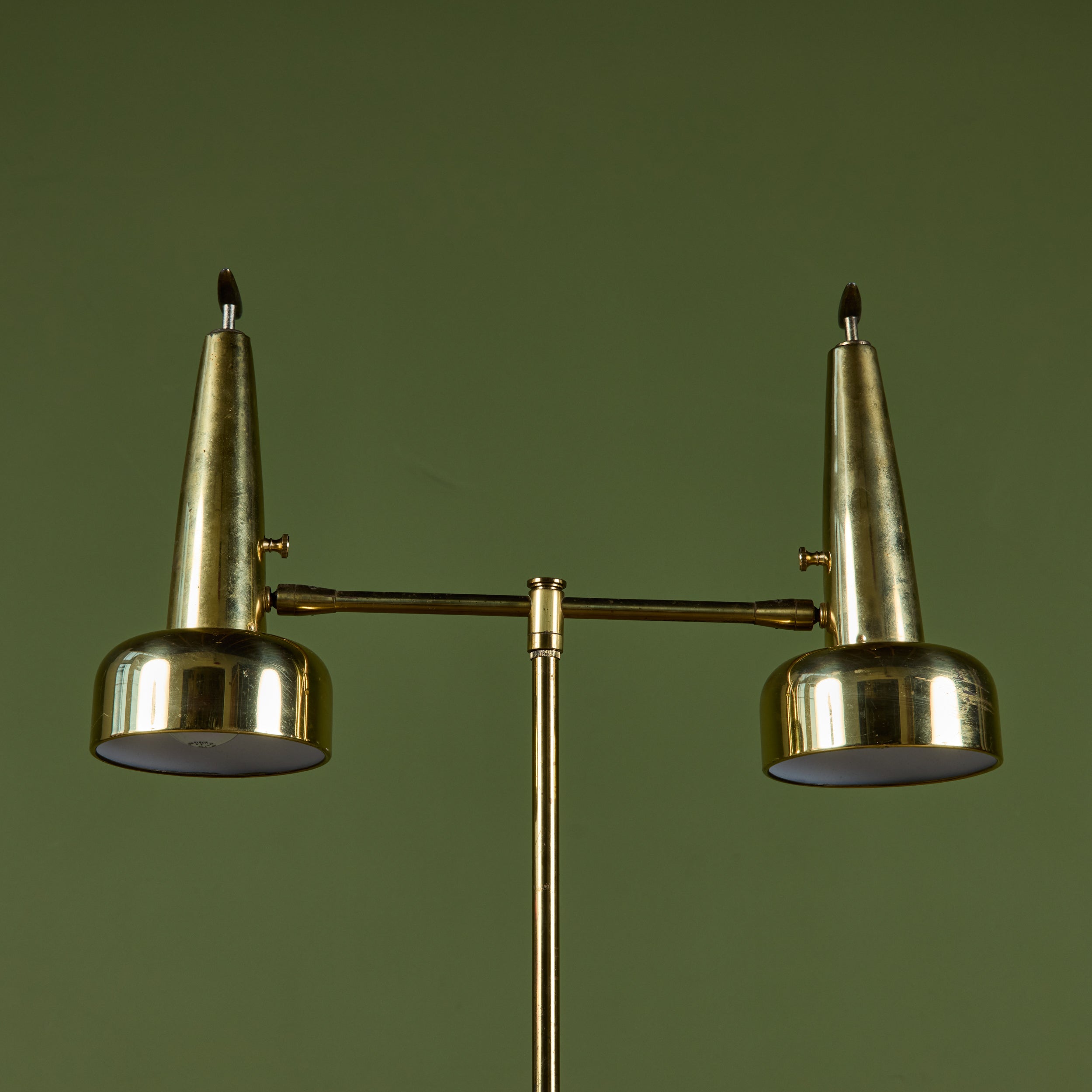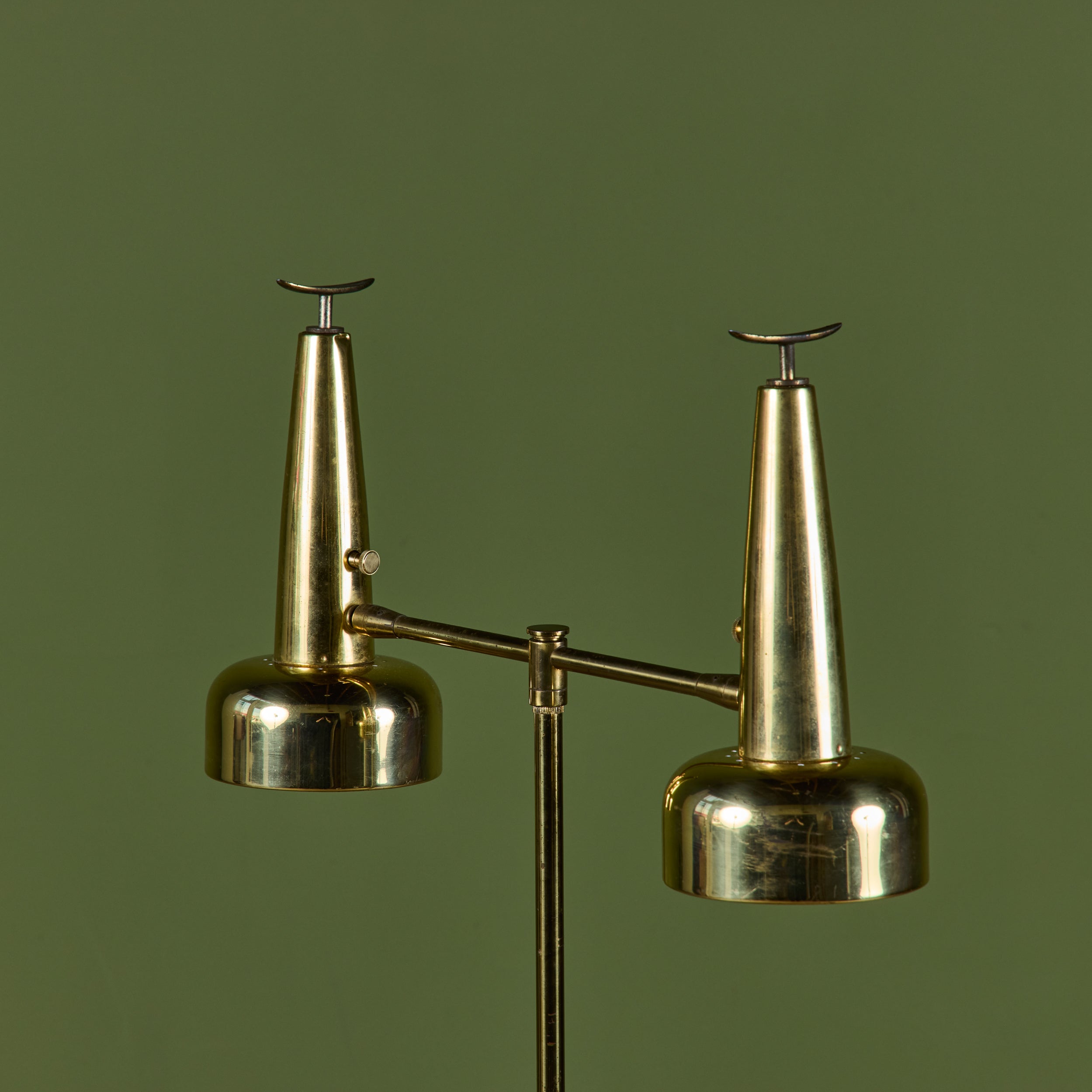 Double shade floor lamp by Stiffel, c.1970s, USA. The lamp features two brass lamp shades with directional lighting, supported by a four star brass base. The lamp showcases a round connected glass side table.