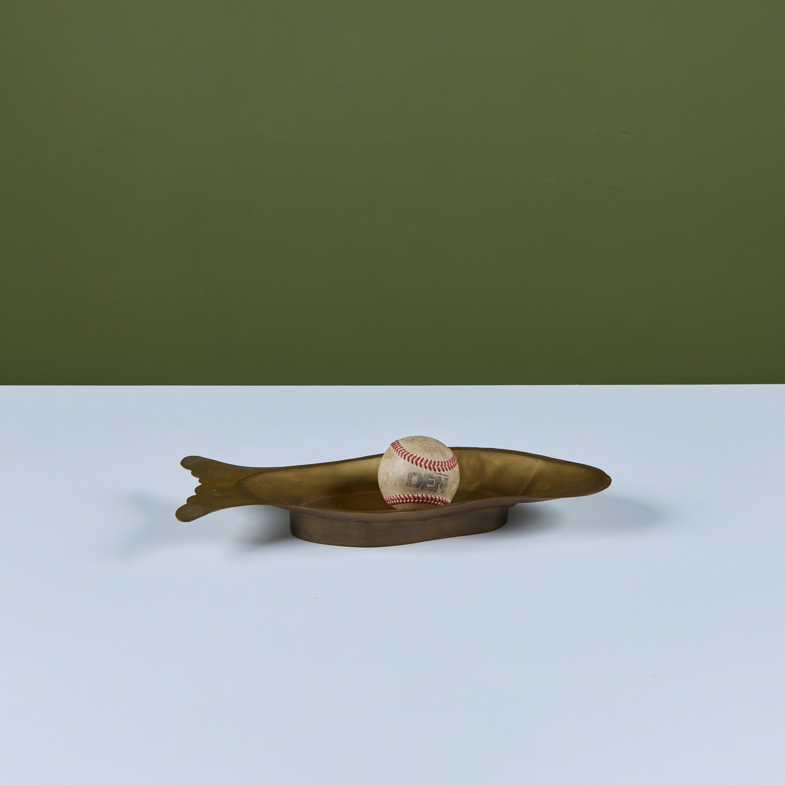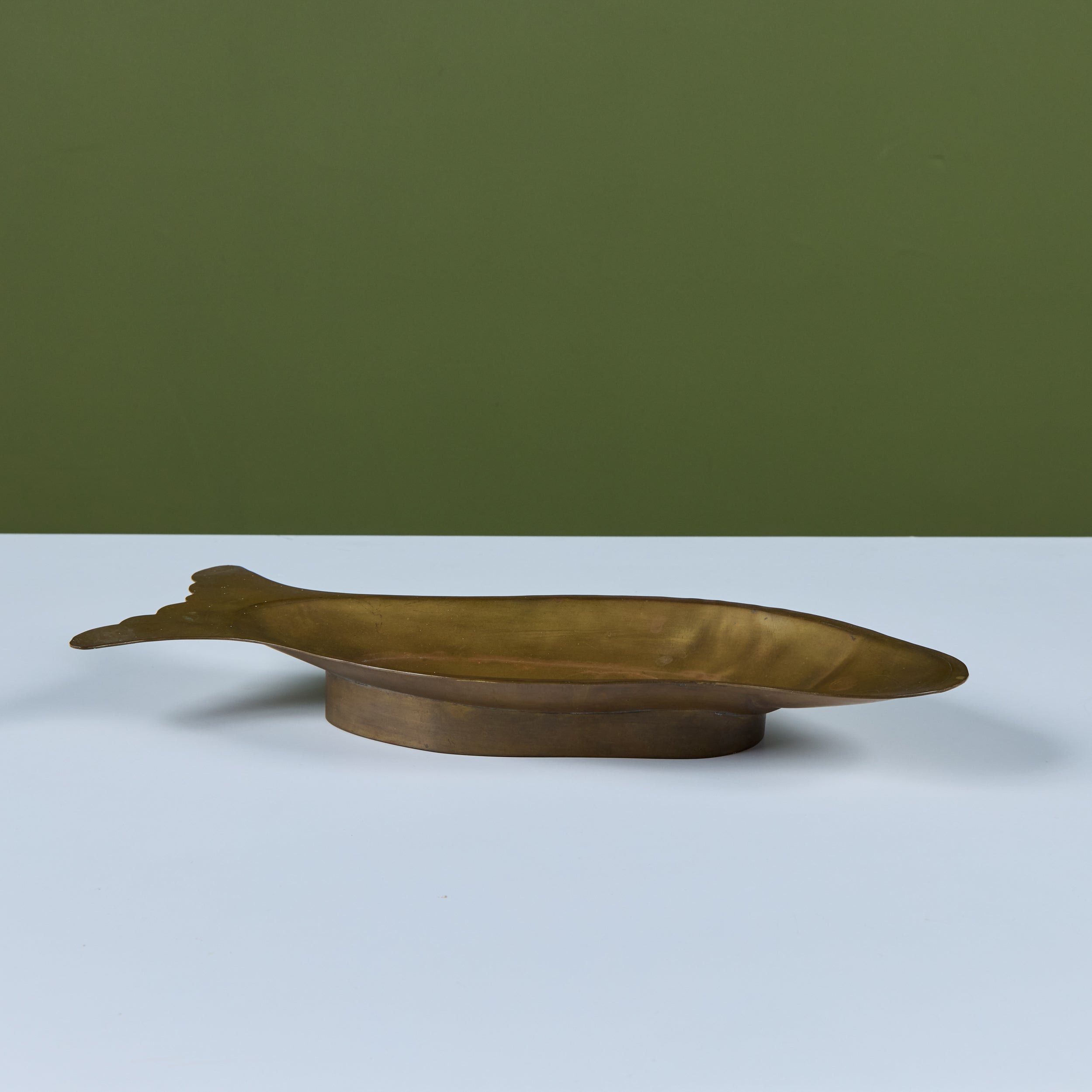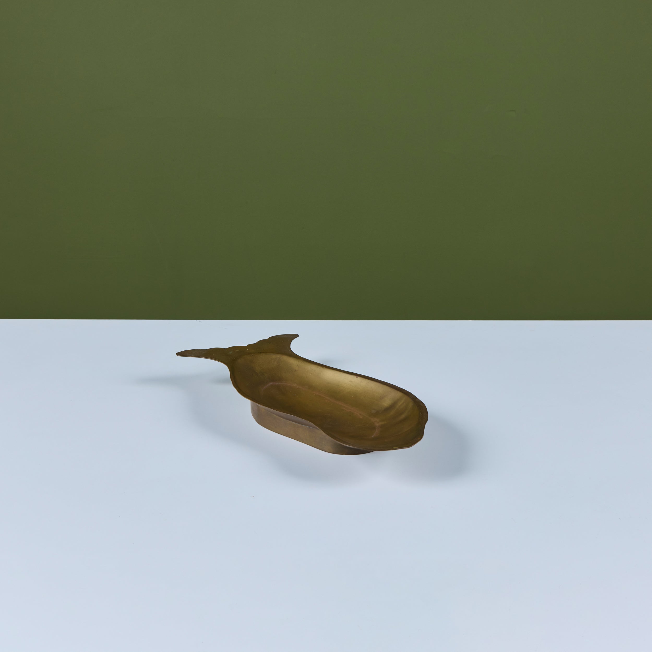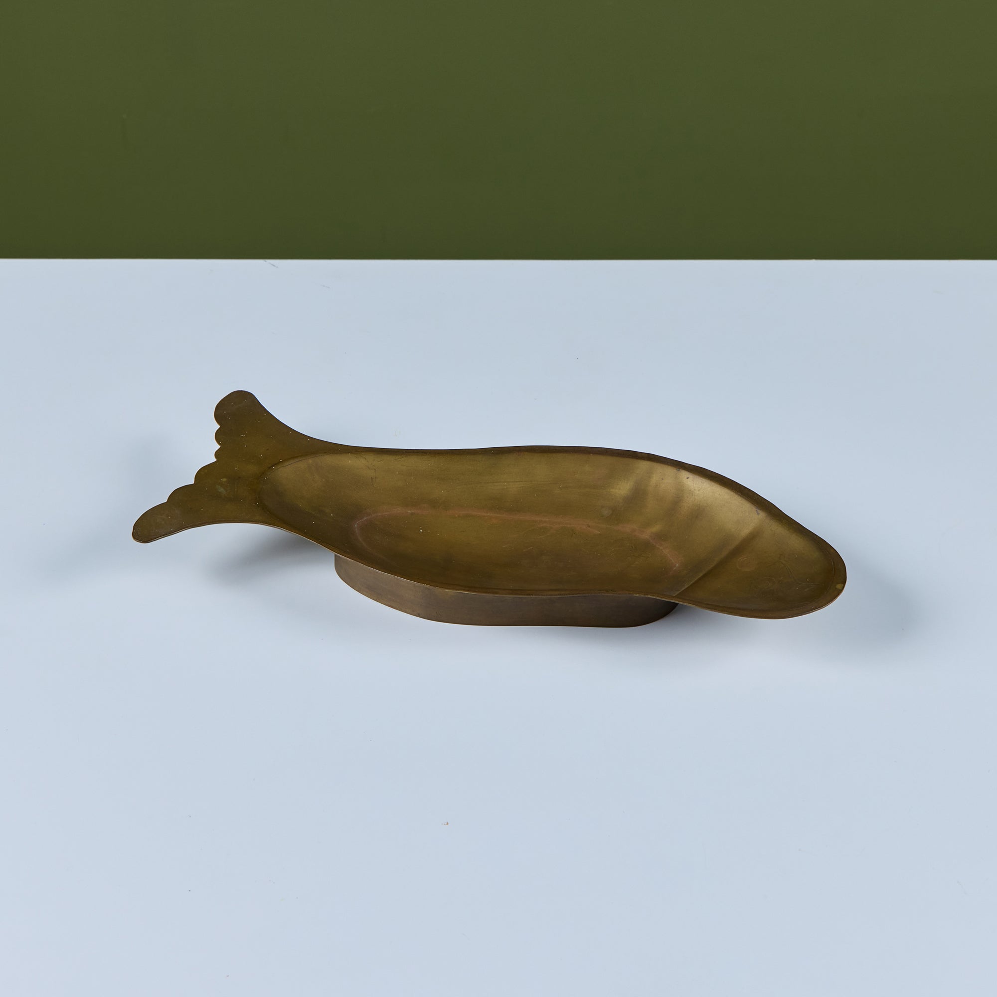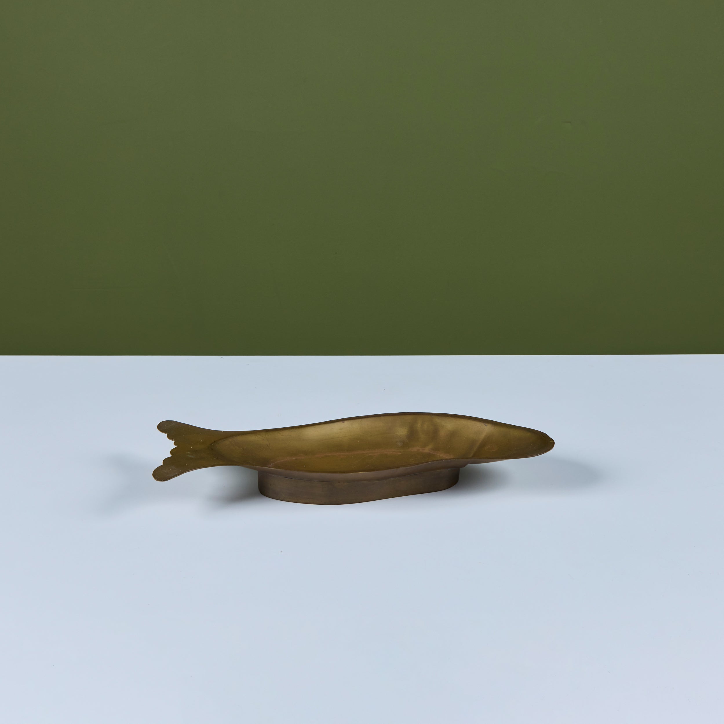 Brass dish featuring a fish form with soft rounded edges. The face of the dish showcases light etching of a fish face and scales. The dish rests on a raised brass footing.