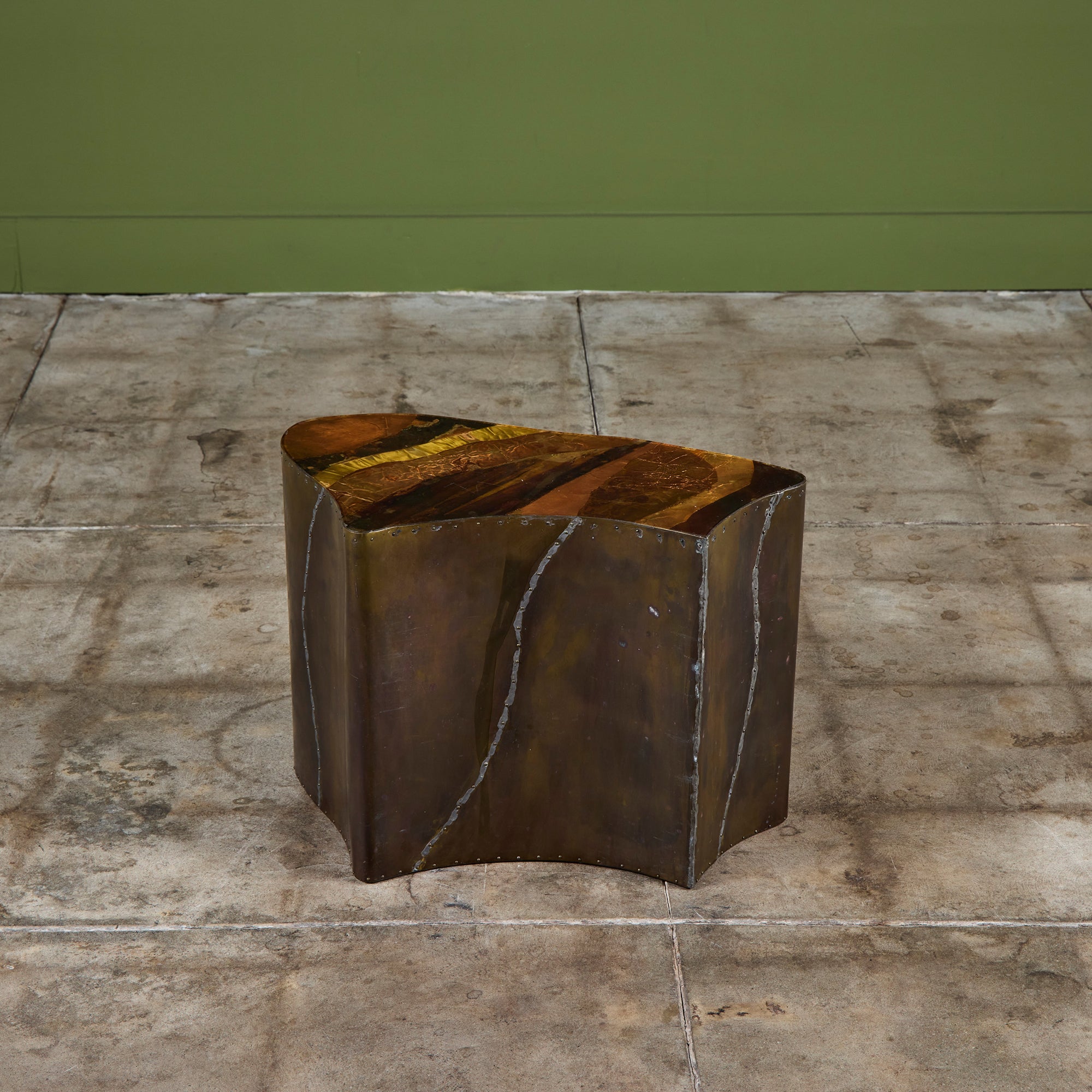 Freeform brass clad side table with mixed metal table top. The table has a brass riveted detailing along the sides. The table top features sheets of brass and copper with a resin overlay. Four available, perfect on their own or grouped together to form one larger table.