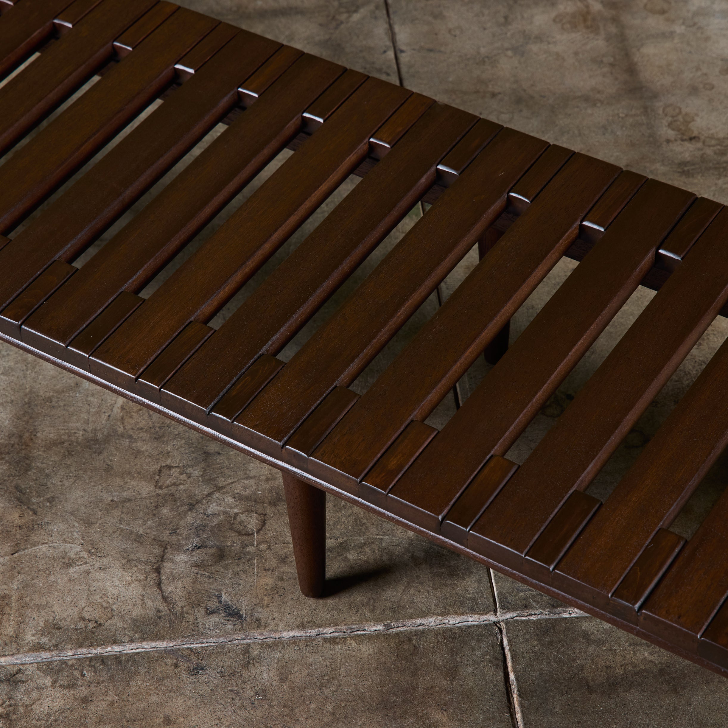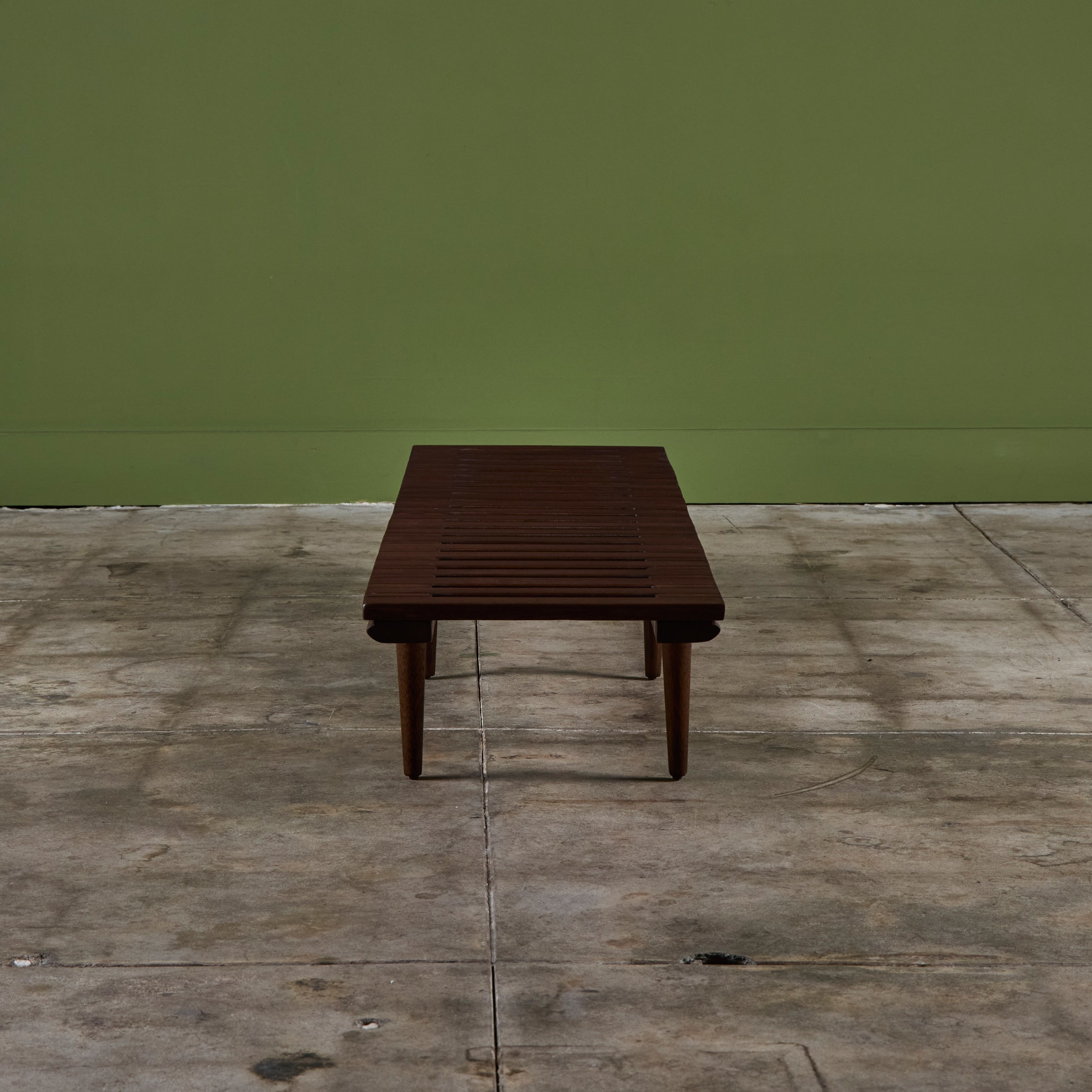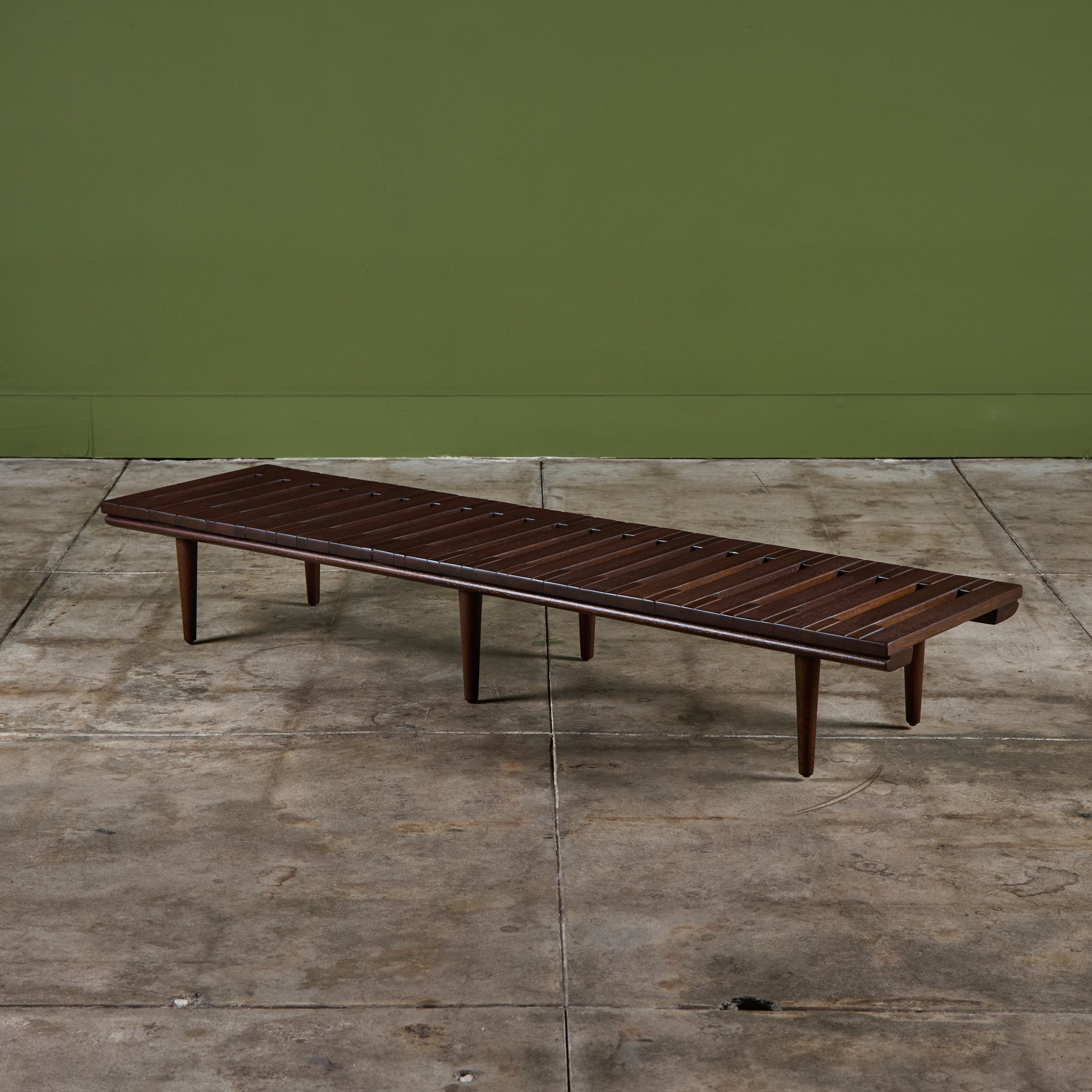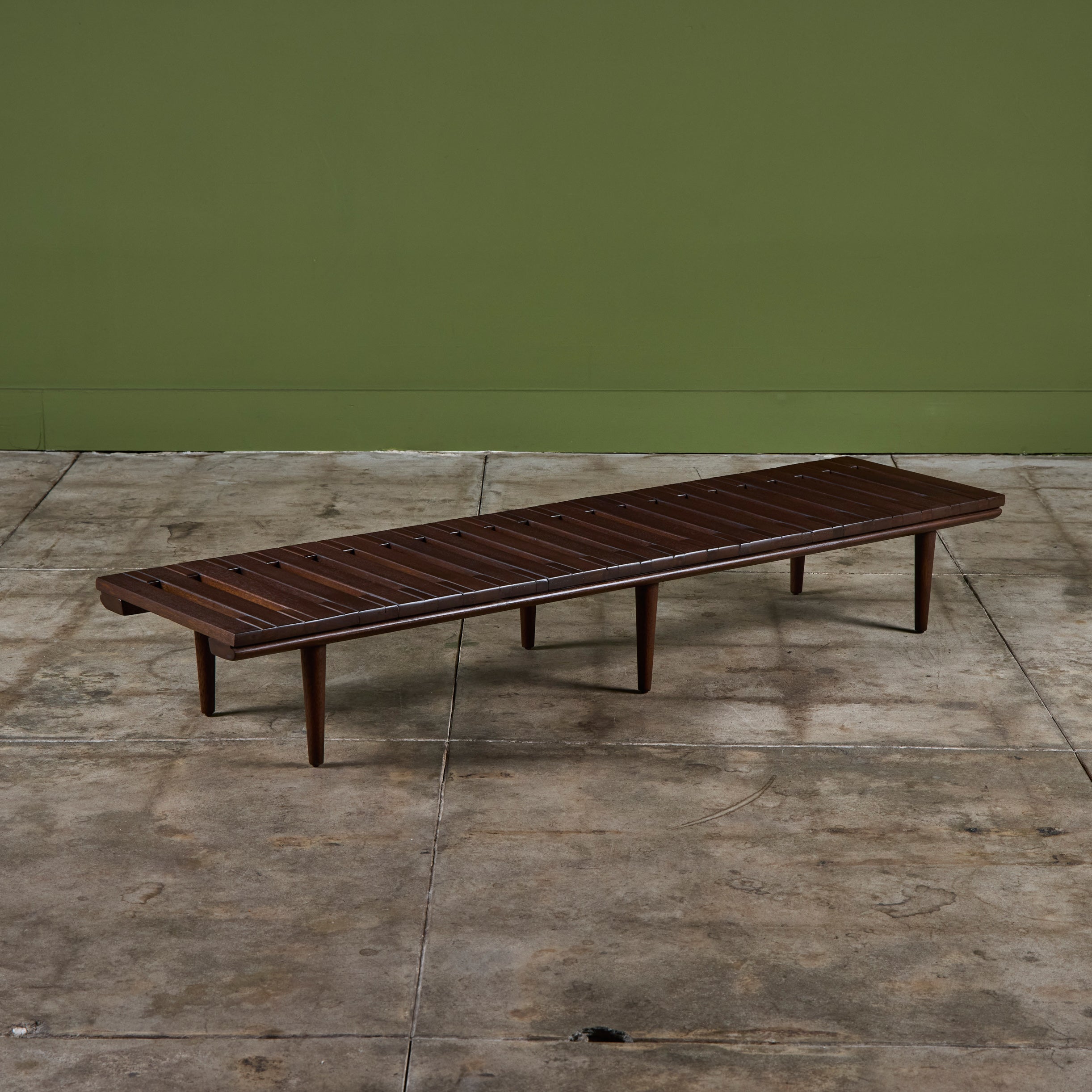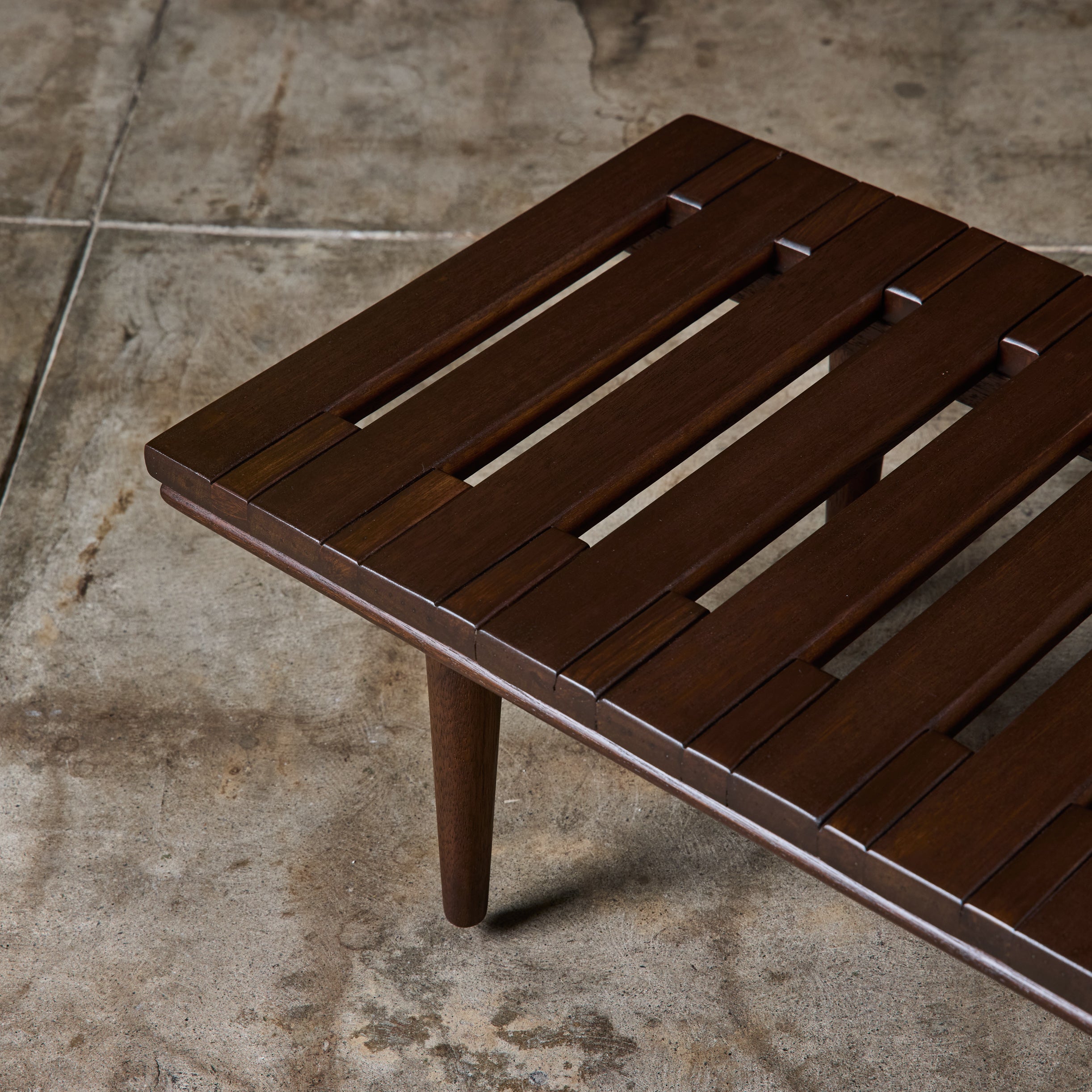 Low profile bench by John Keal for Brown Saltman, circa 1950s, USA. The bench features mahogany wood slats and tapered dowel legs. Perfect as a low profile coffee table, entryway bench or placed behind a sofa.