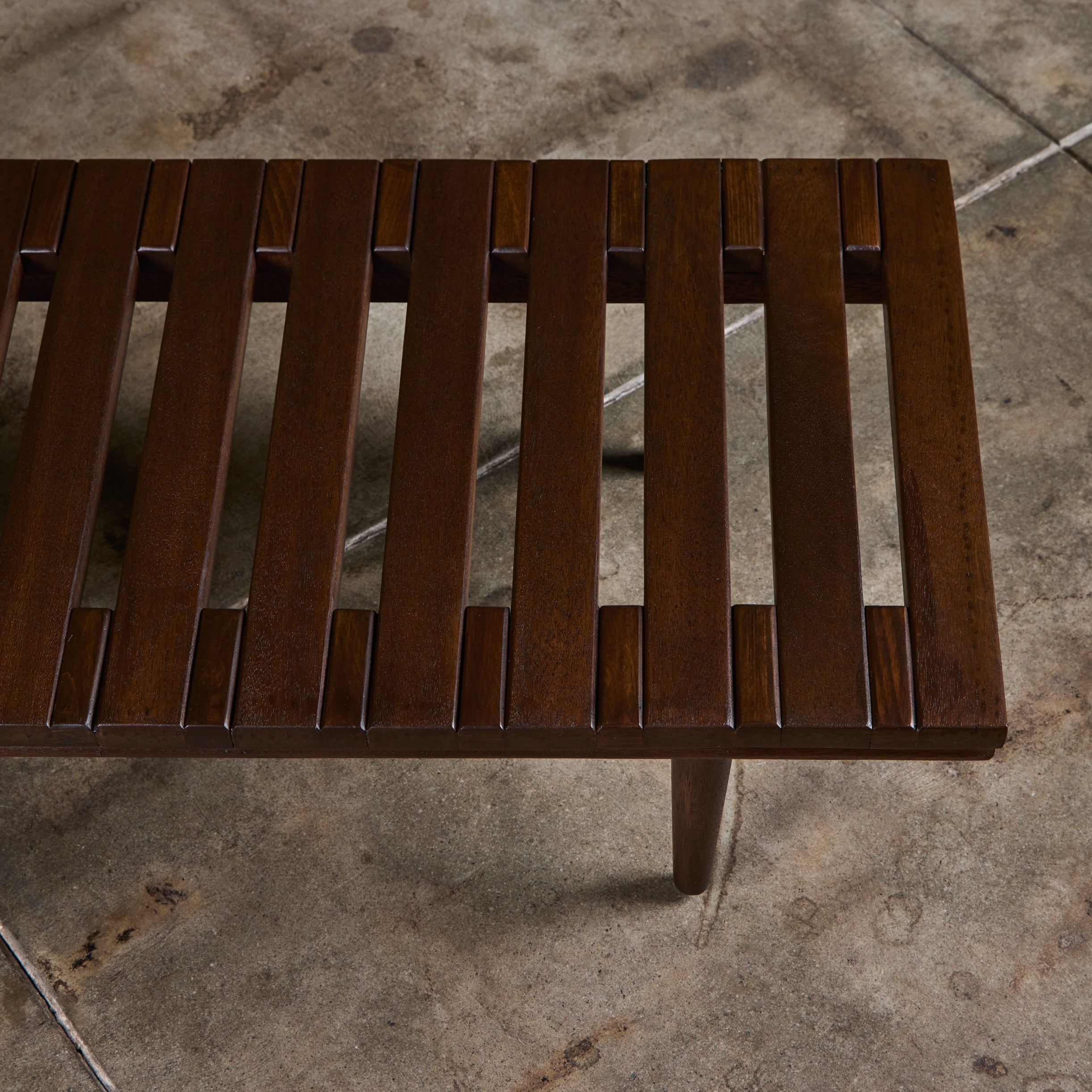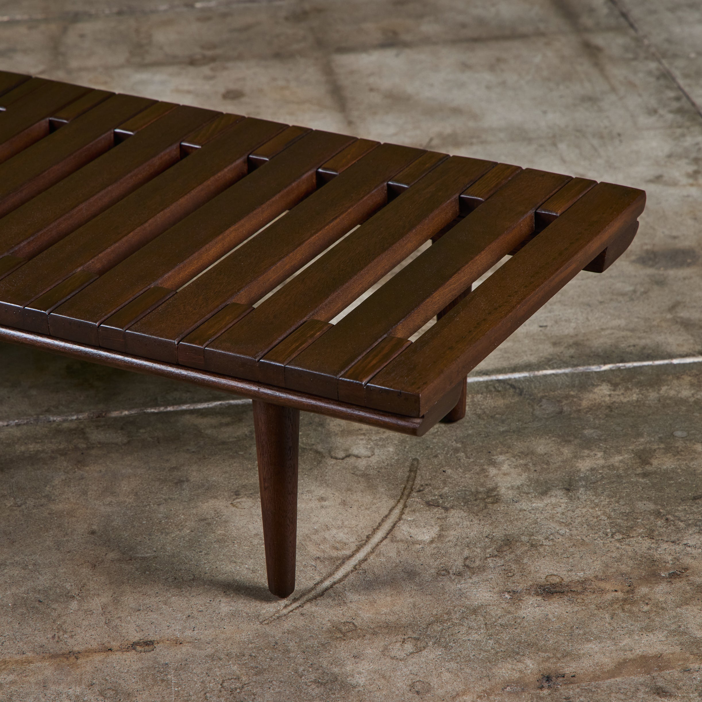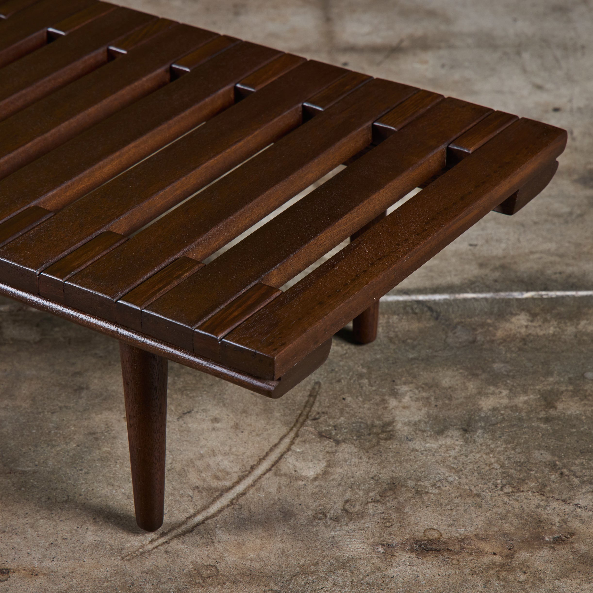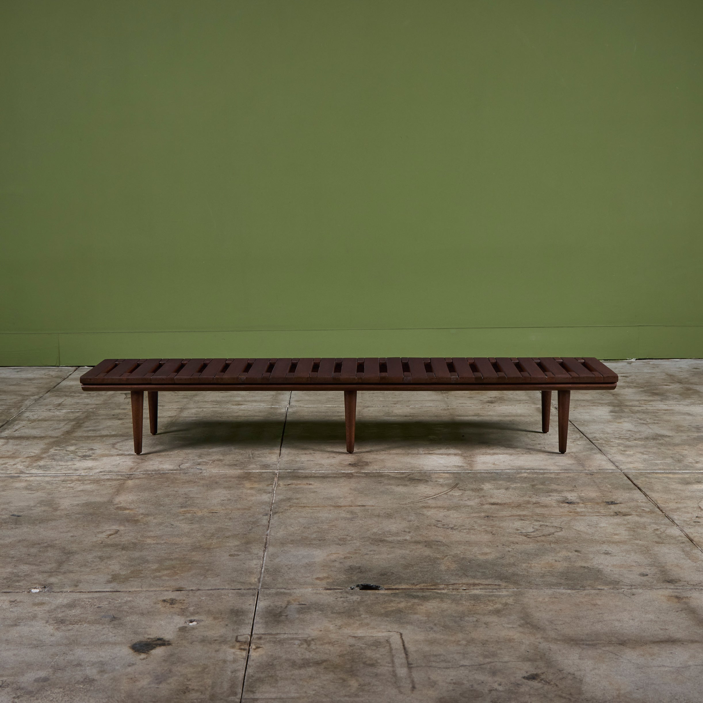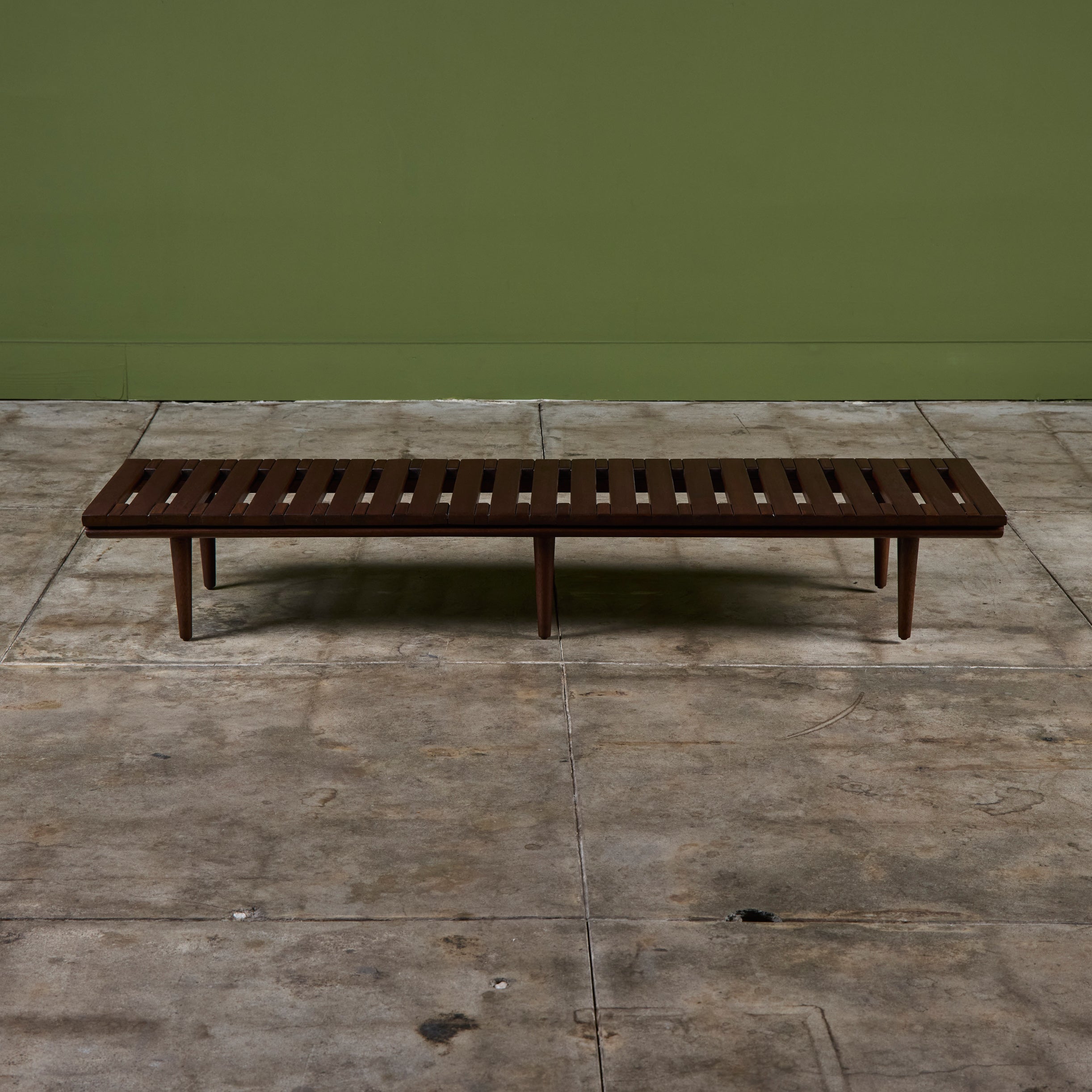 Low profile bench by John Keal for Brown Saltman, circa 1950s, USA. The bench features mahogany wood slats and tapered dowel legs. Perfect as a low profile coffee table, entryway bench or placed behind a sofa.