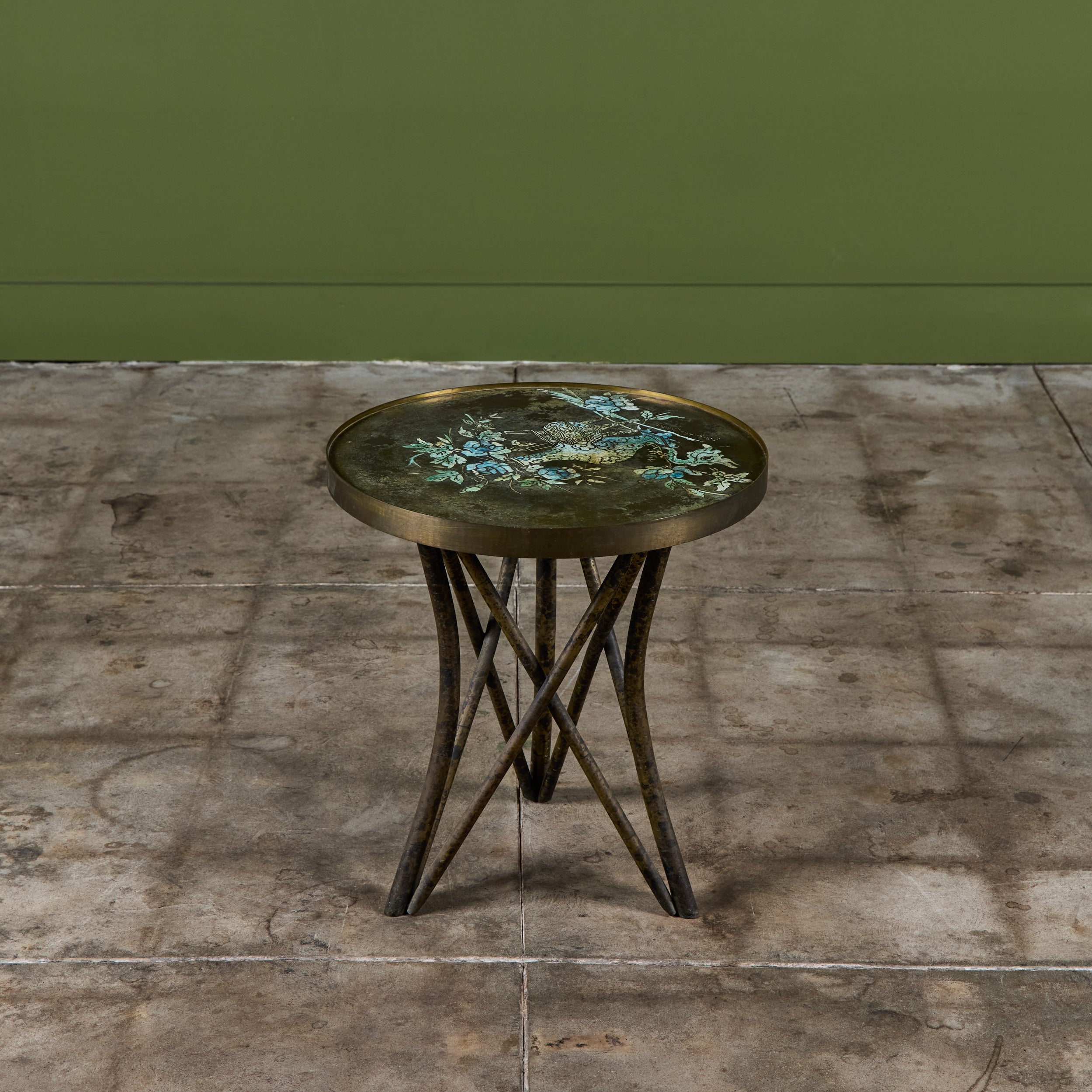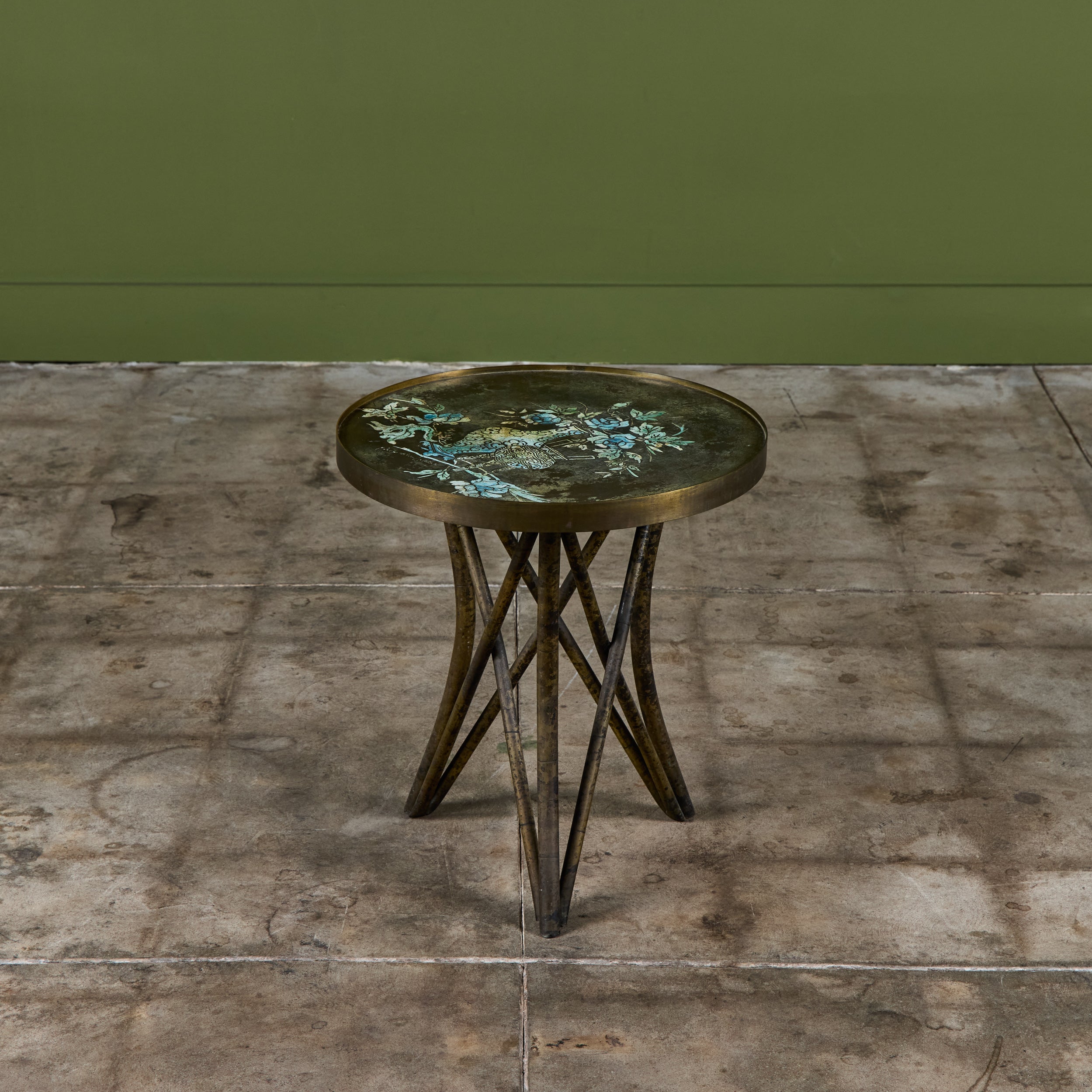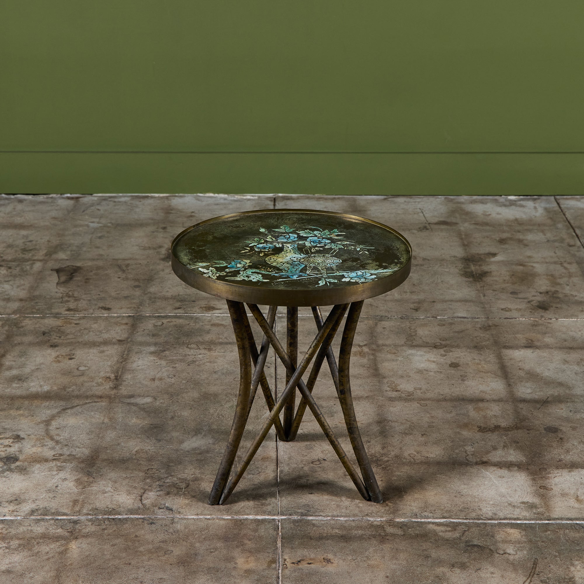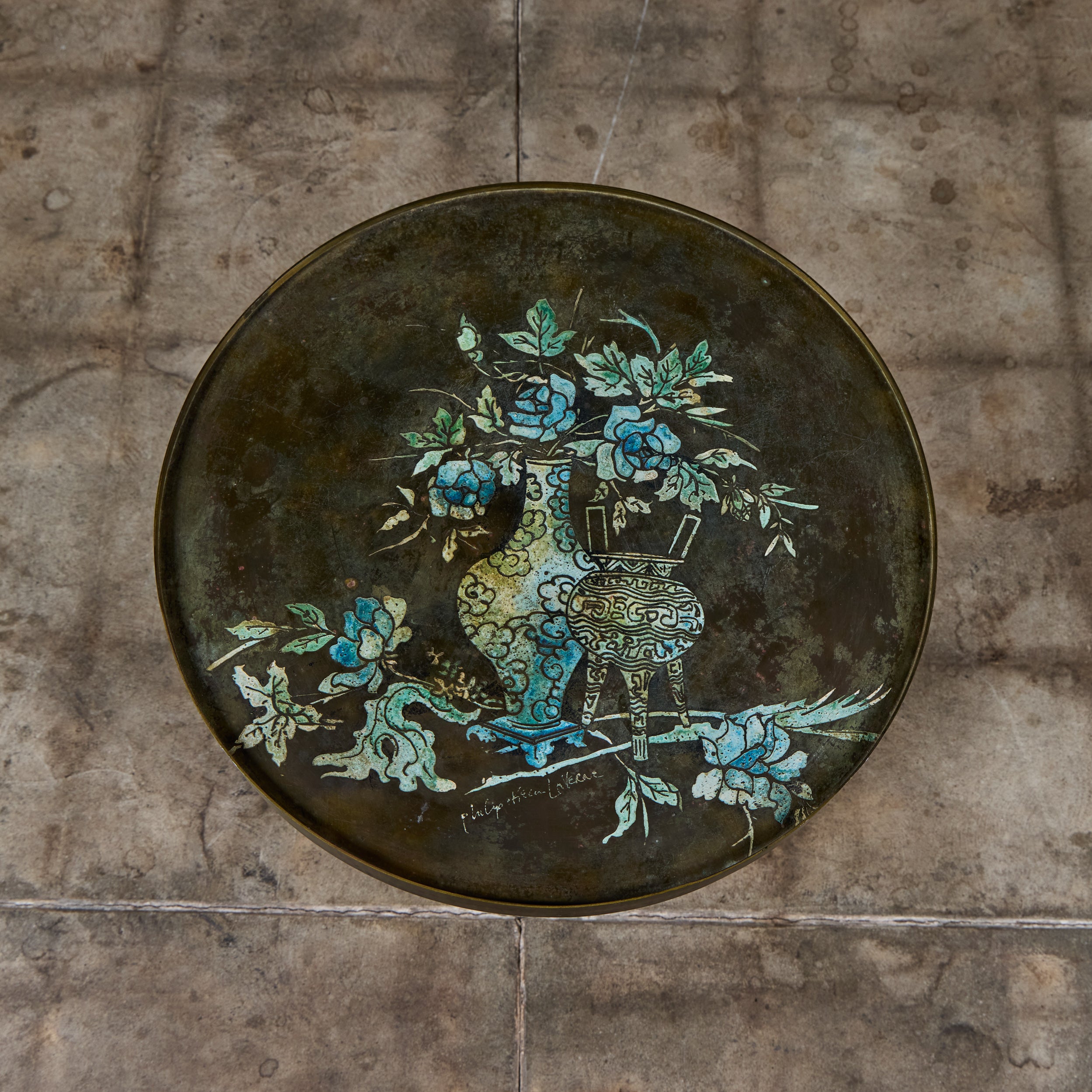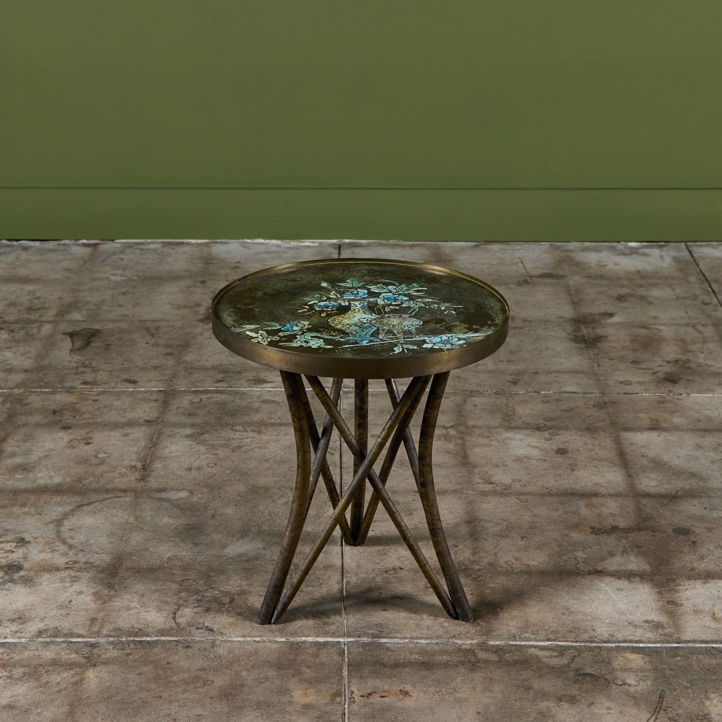 Highly collectible bronze side table by Philip and Kelvin Laverne. The round table features their signature acid etched floral motif pattern on the tabletop with enamel cloisonne. The legs were made to resemble bamboo. Signed on the table top.