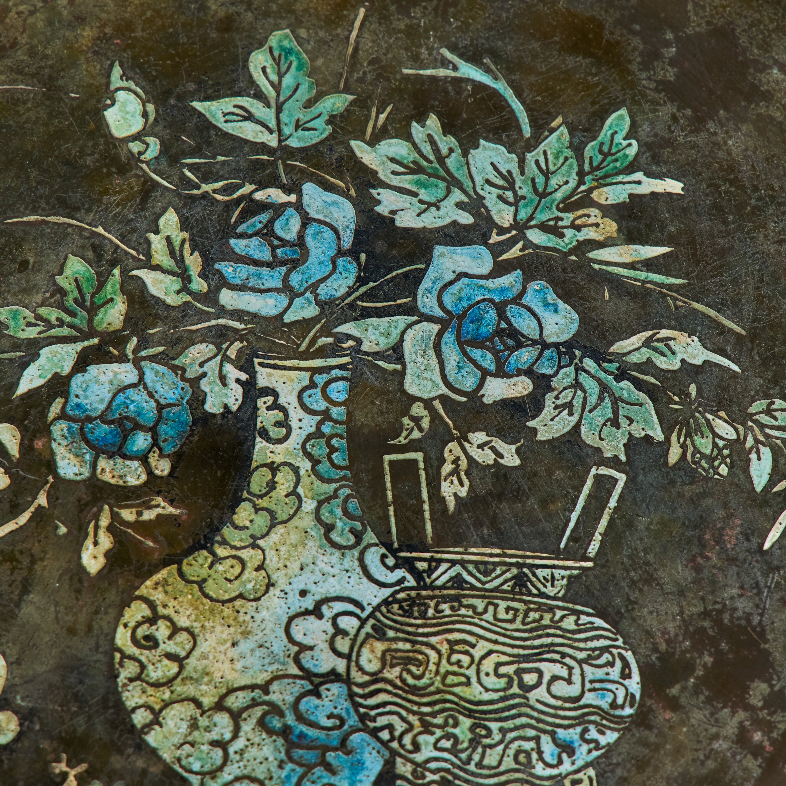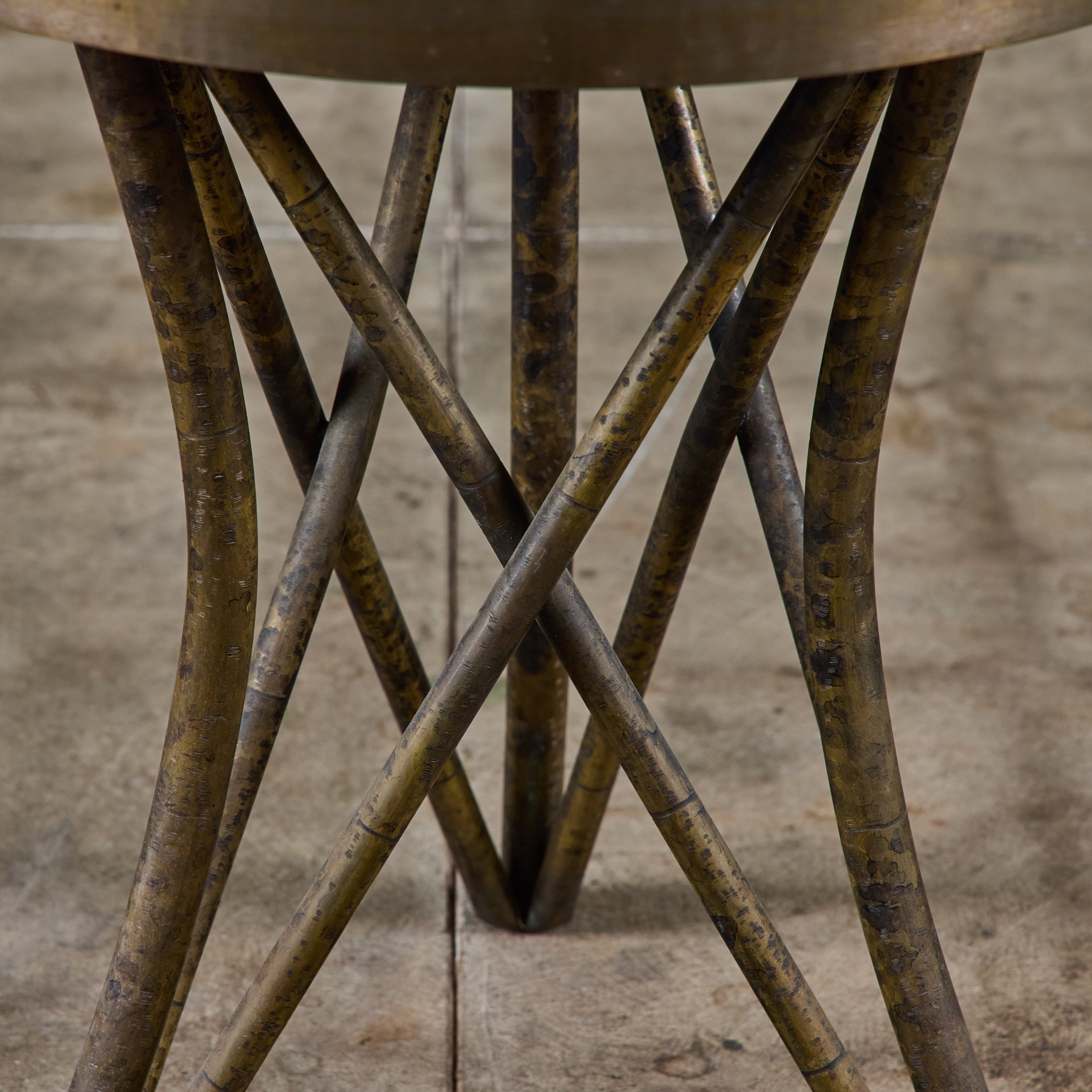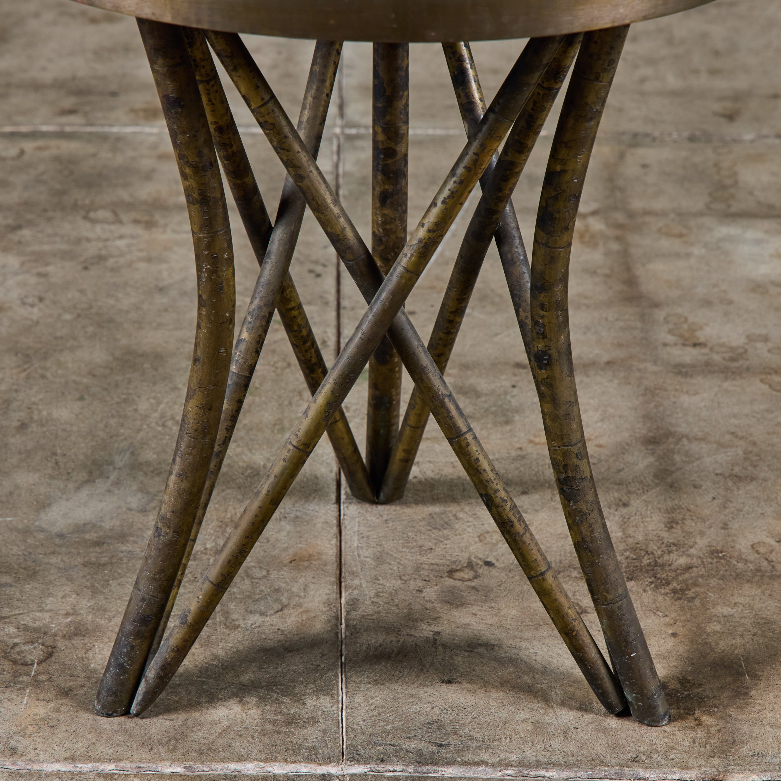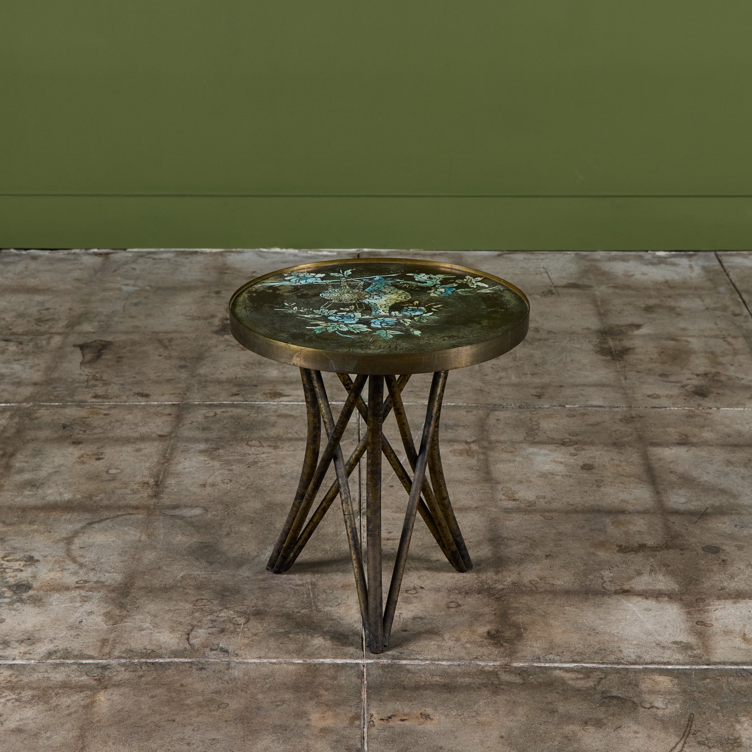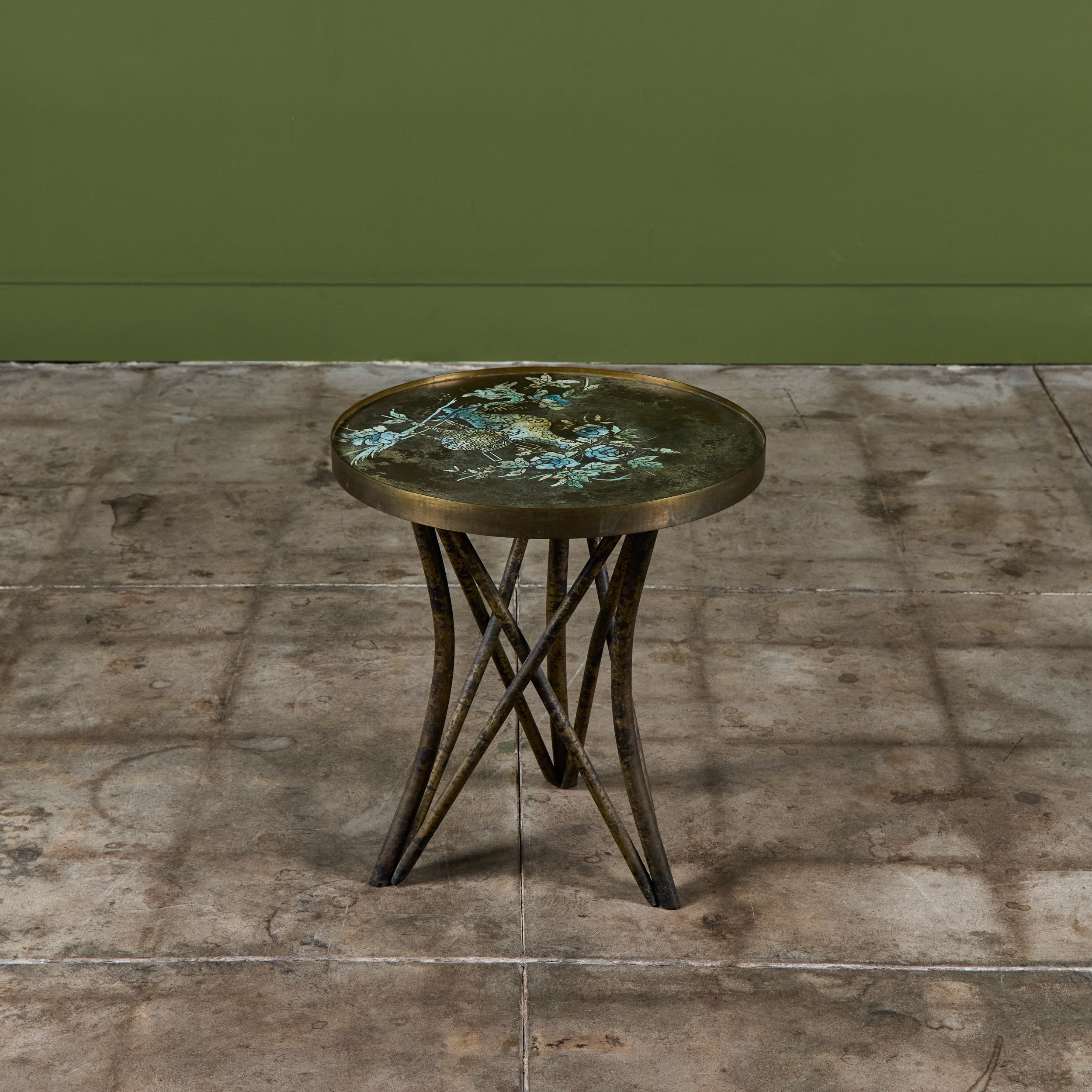 Highly collectible bronze side table by Philip and Kelvin Laverne. The round table features their signature acid etched floral motif pattern on the tabletop with enamel cloisonne. The legs were made to resemble bamboo. Signed on the table top.