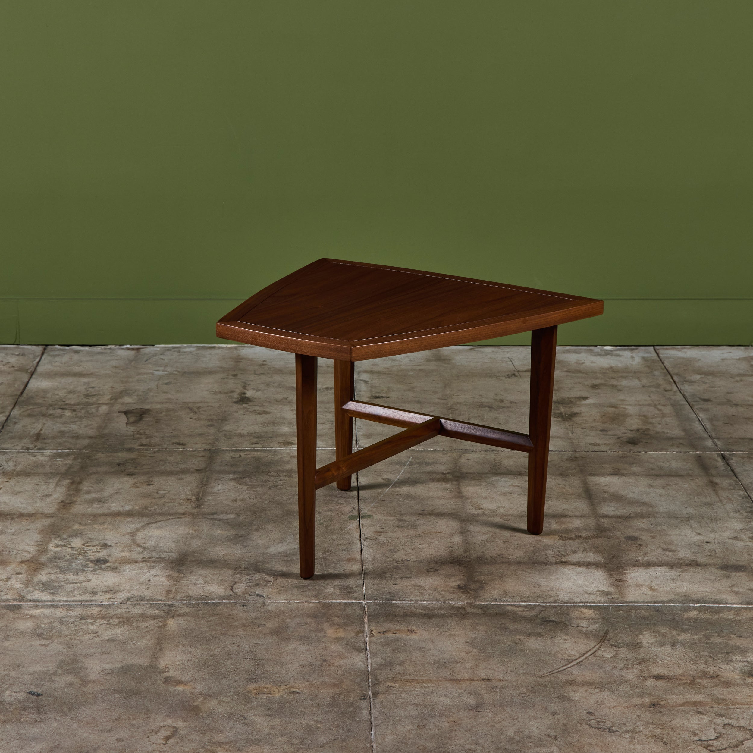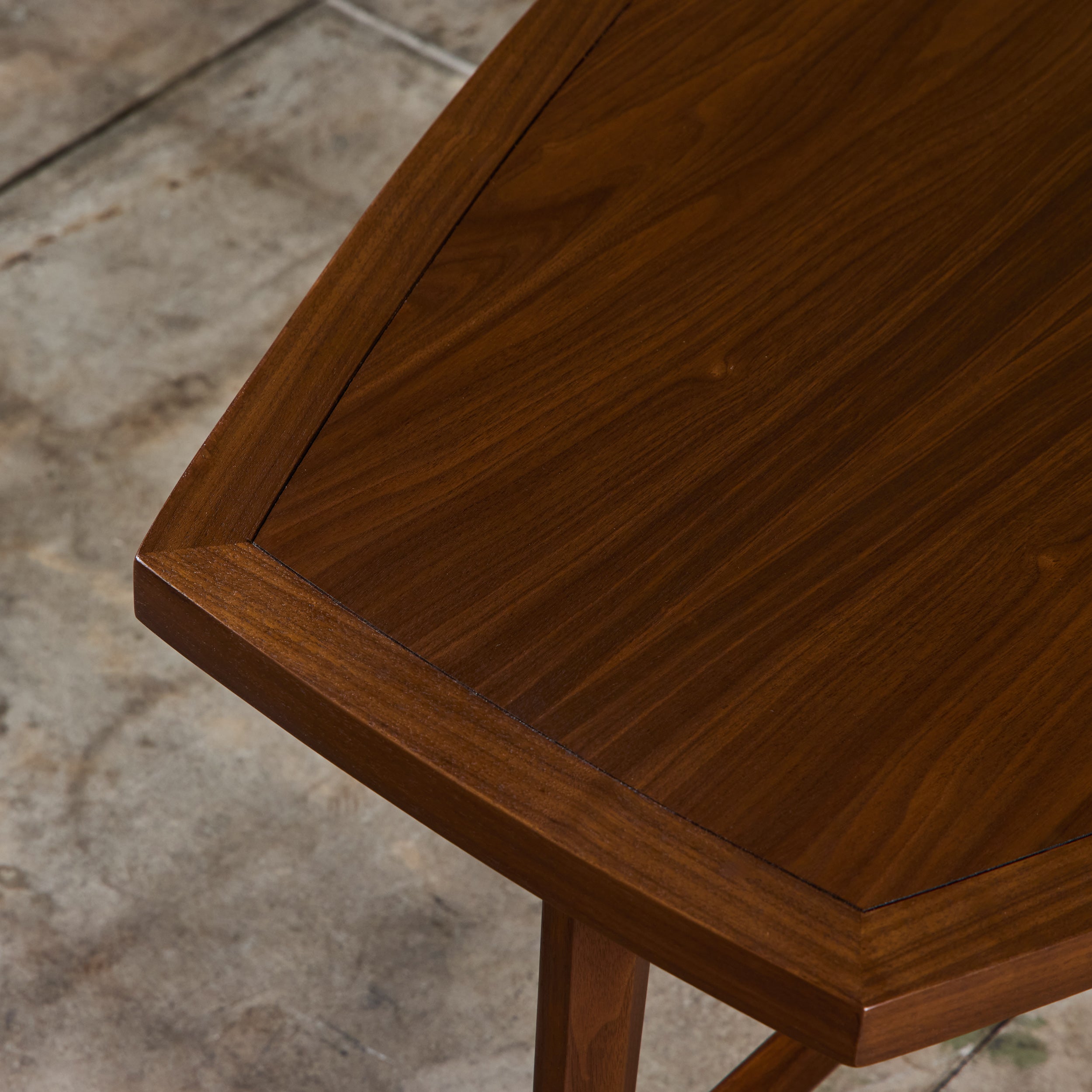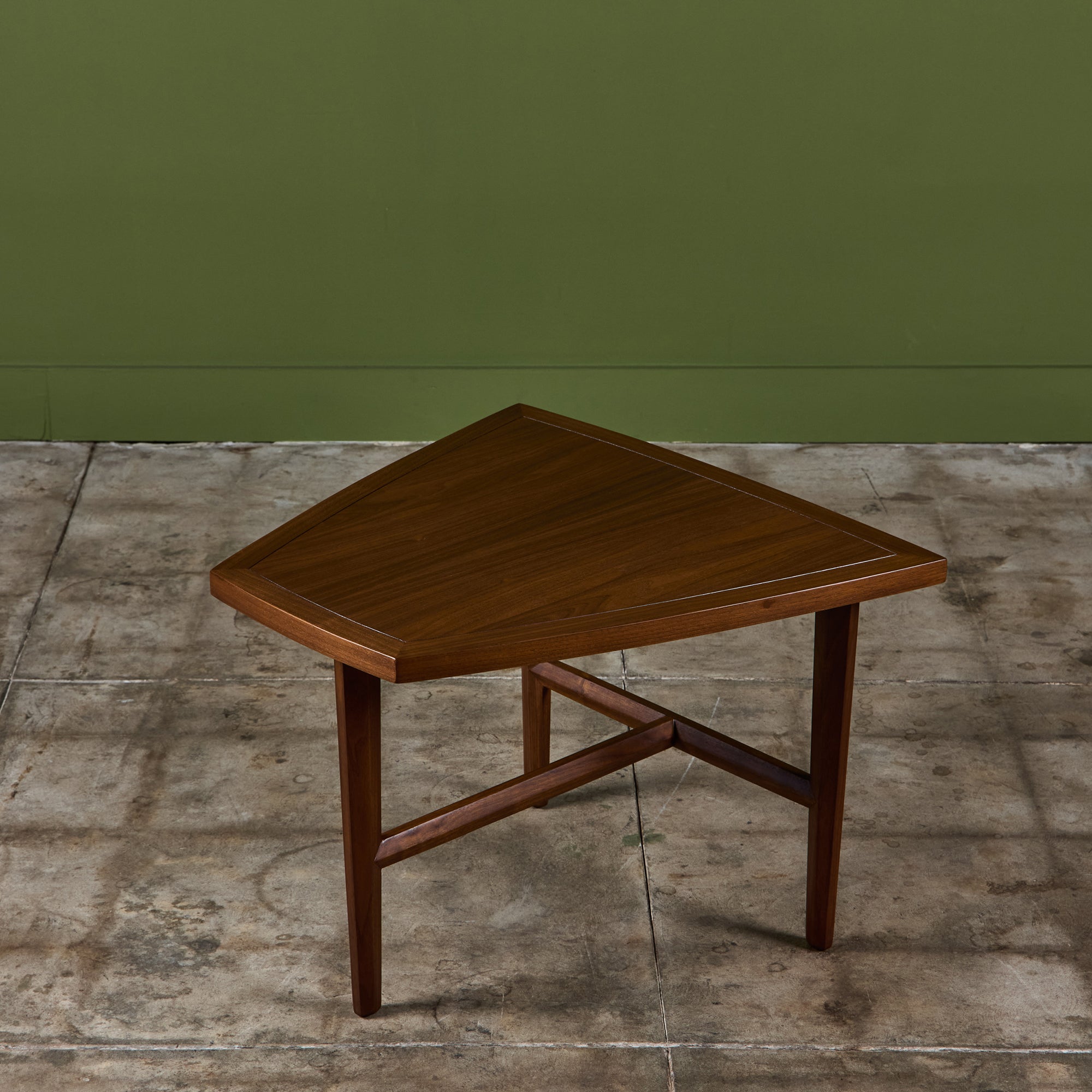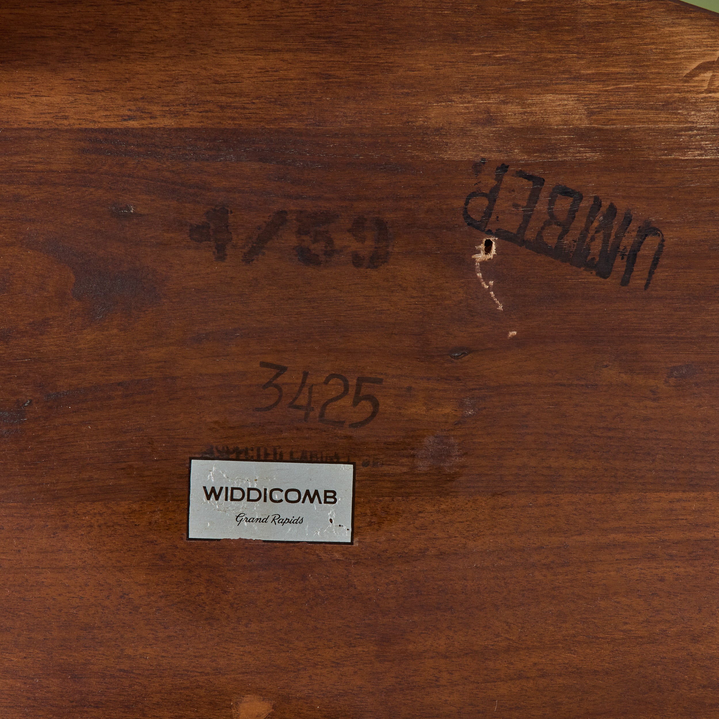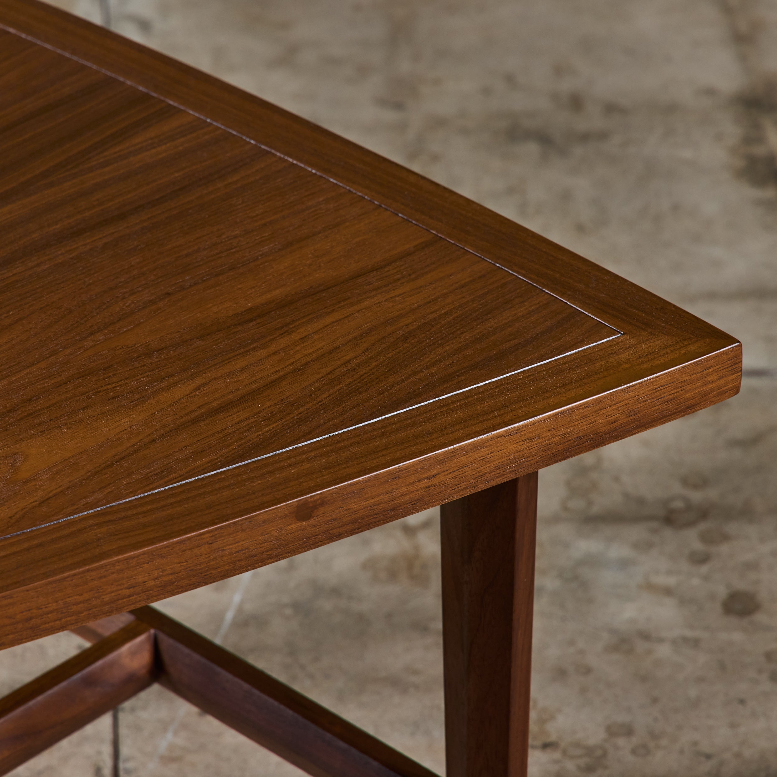 Walnut coffee table by Grand Rapids, Michigan-based Widdicomb, c.1950s. The table features a flared rectangular top on faceted tapered legs and faceted stretchers on the length and width. This design is similar to tables that George Nakashima did for his "Origins" collection for Widdicomb. Marked with [Widdicomb - Grand Rapids] label