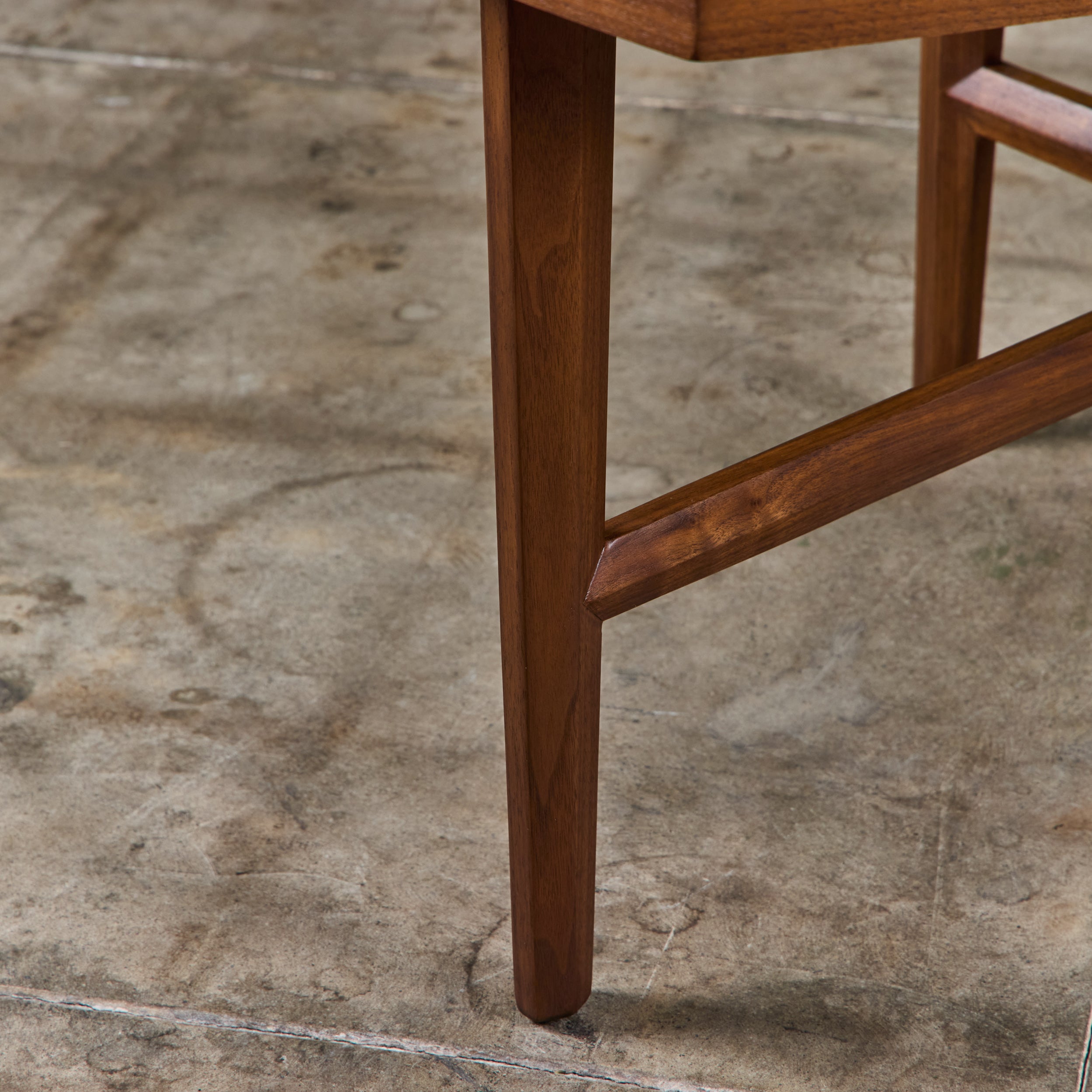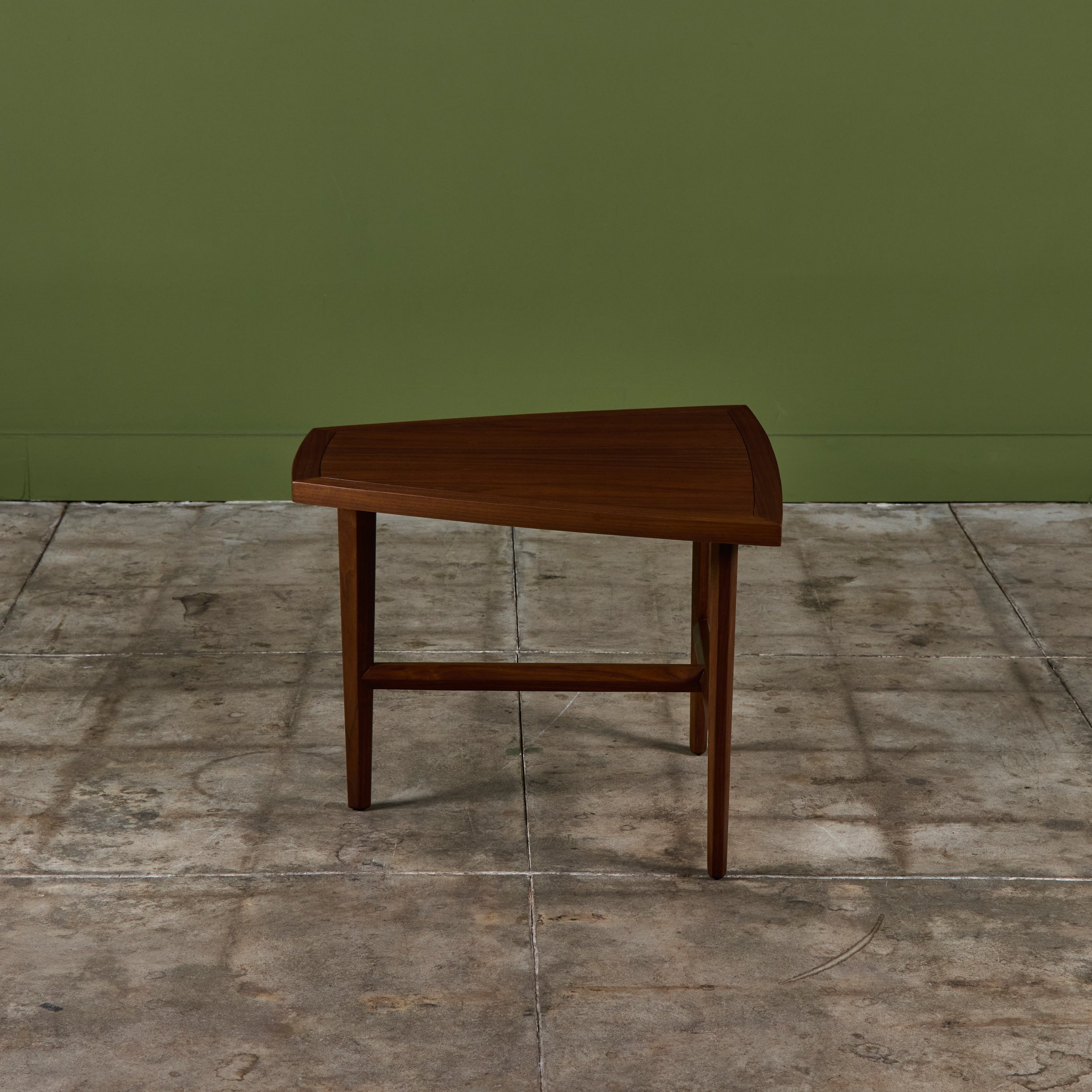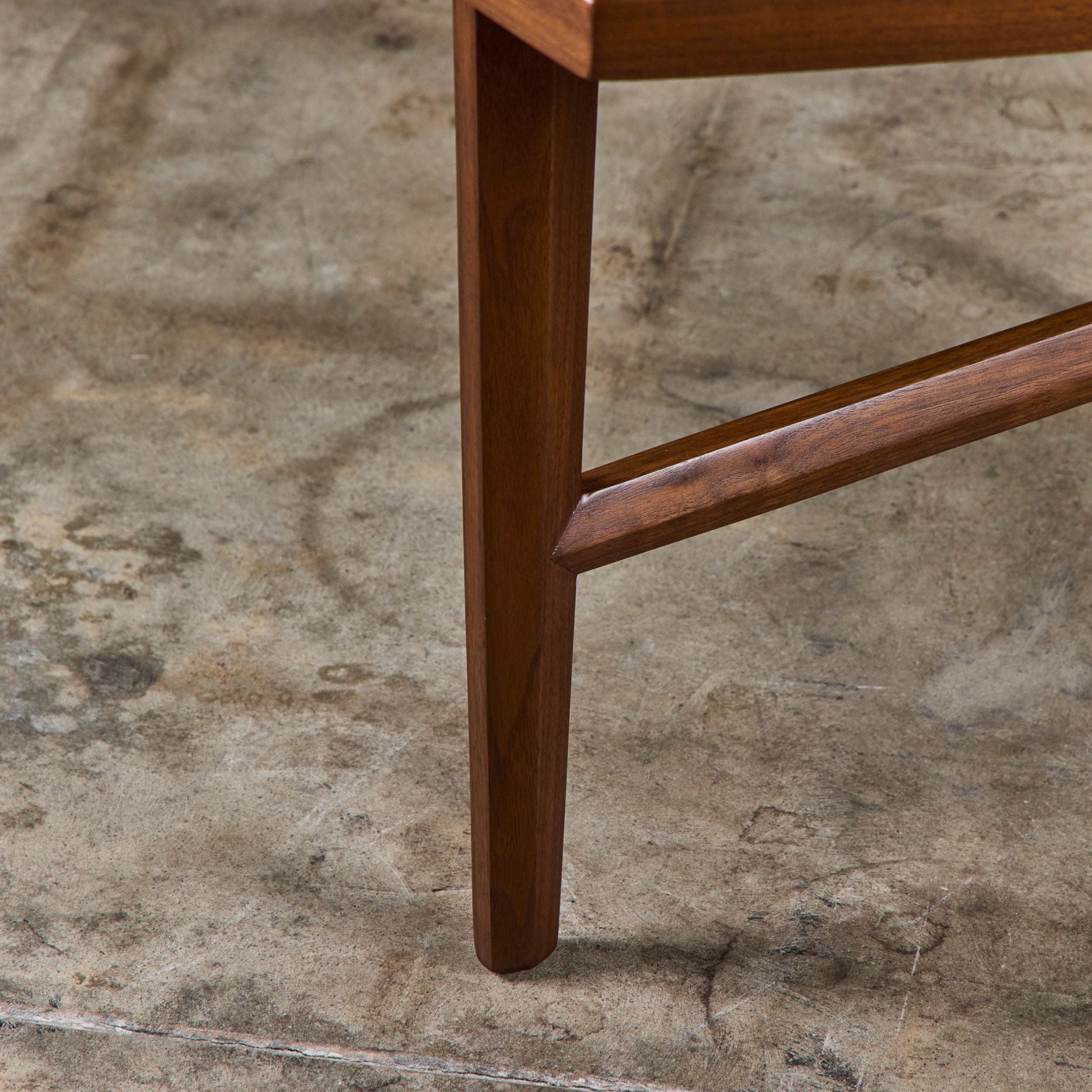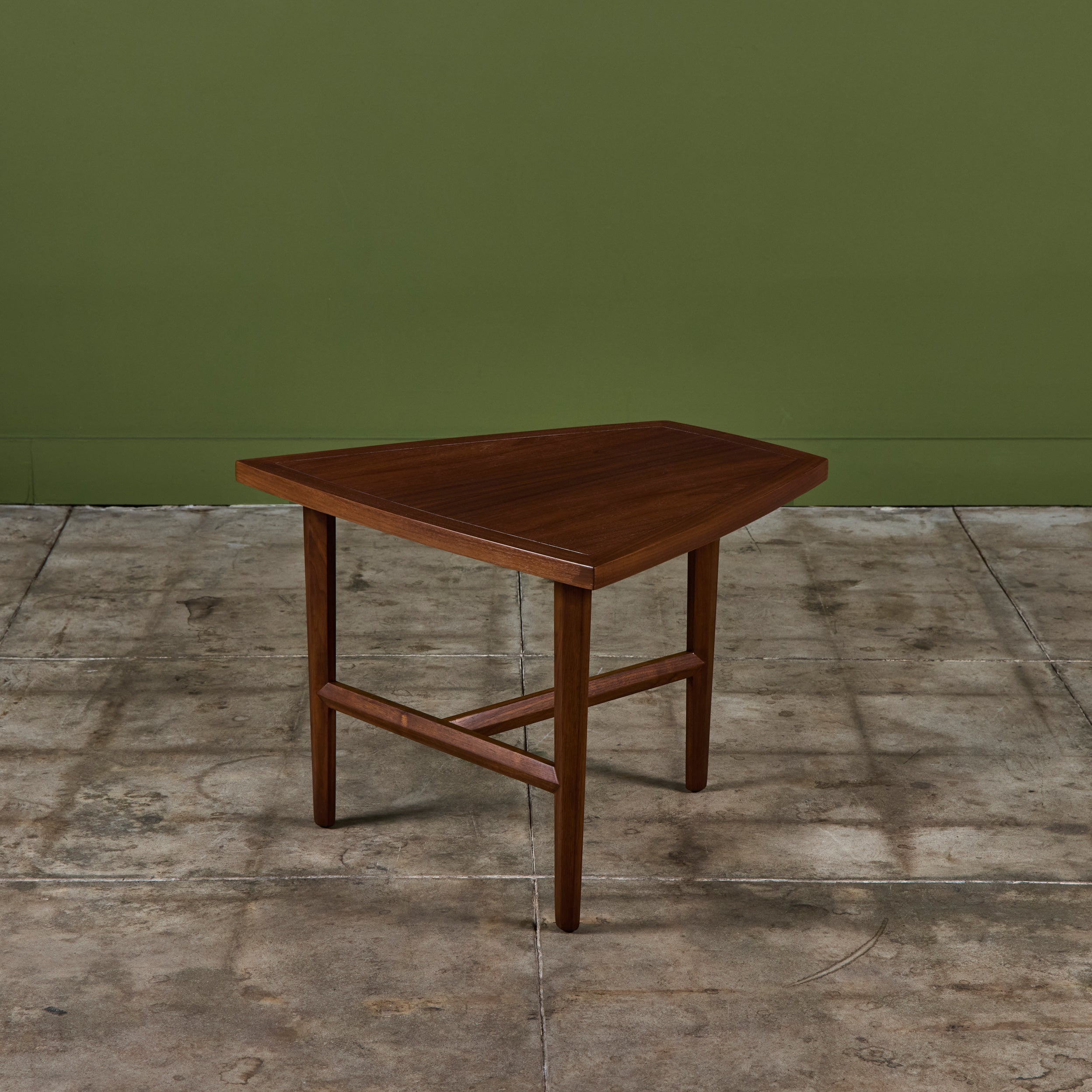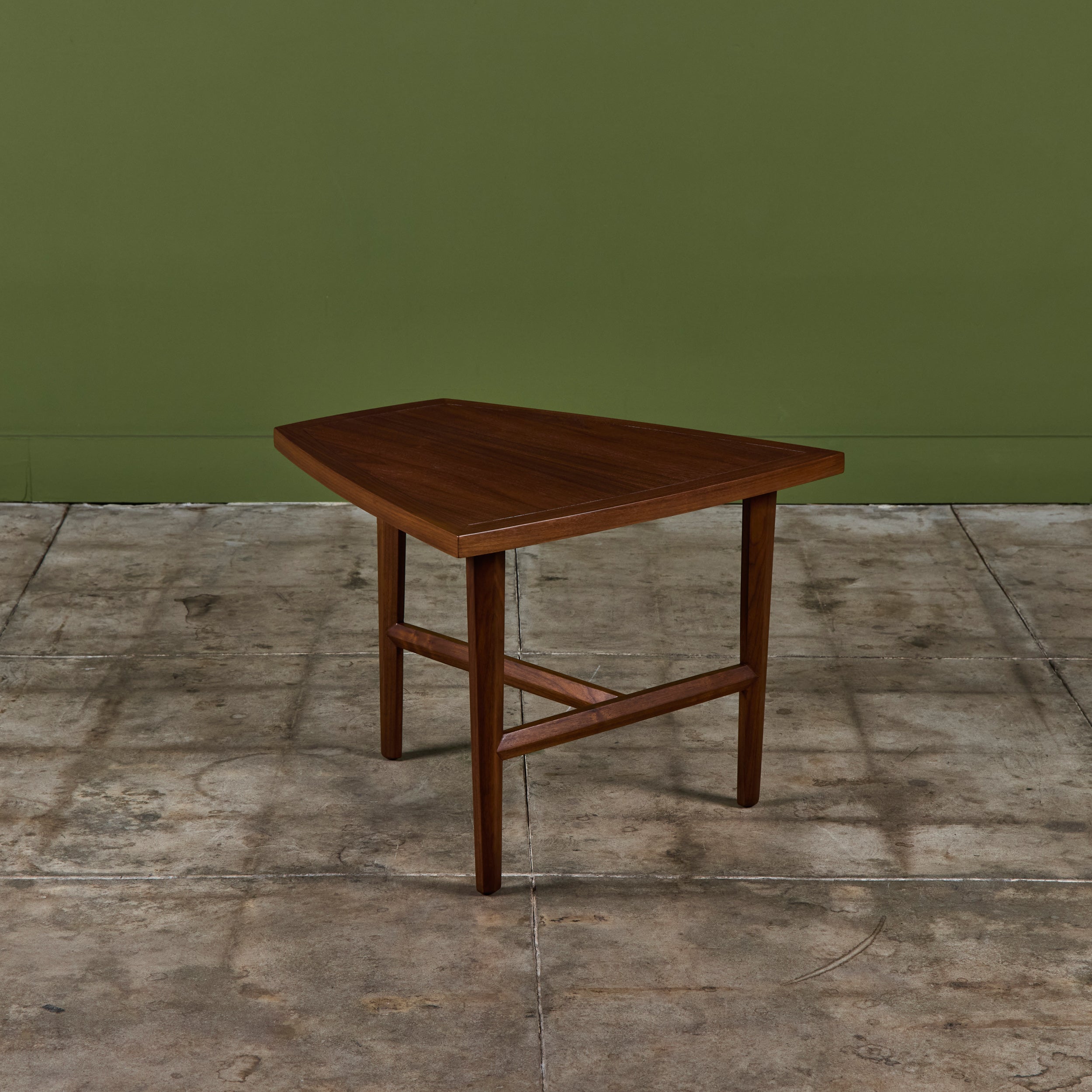 Walnut coffee table by Grand Rapids, Michigan-based Widdicomb, c.1950s. The table features a flared rectangular top on faceted tapered legs and faceted stretchers on the length and width. This design is similar to tables that George Nakashima did for his "Origins" collection for Widdicomb. Marked with [Widdicomb - Grand Rapids] label