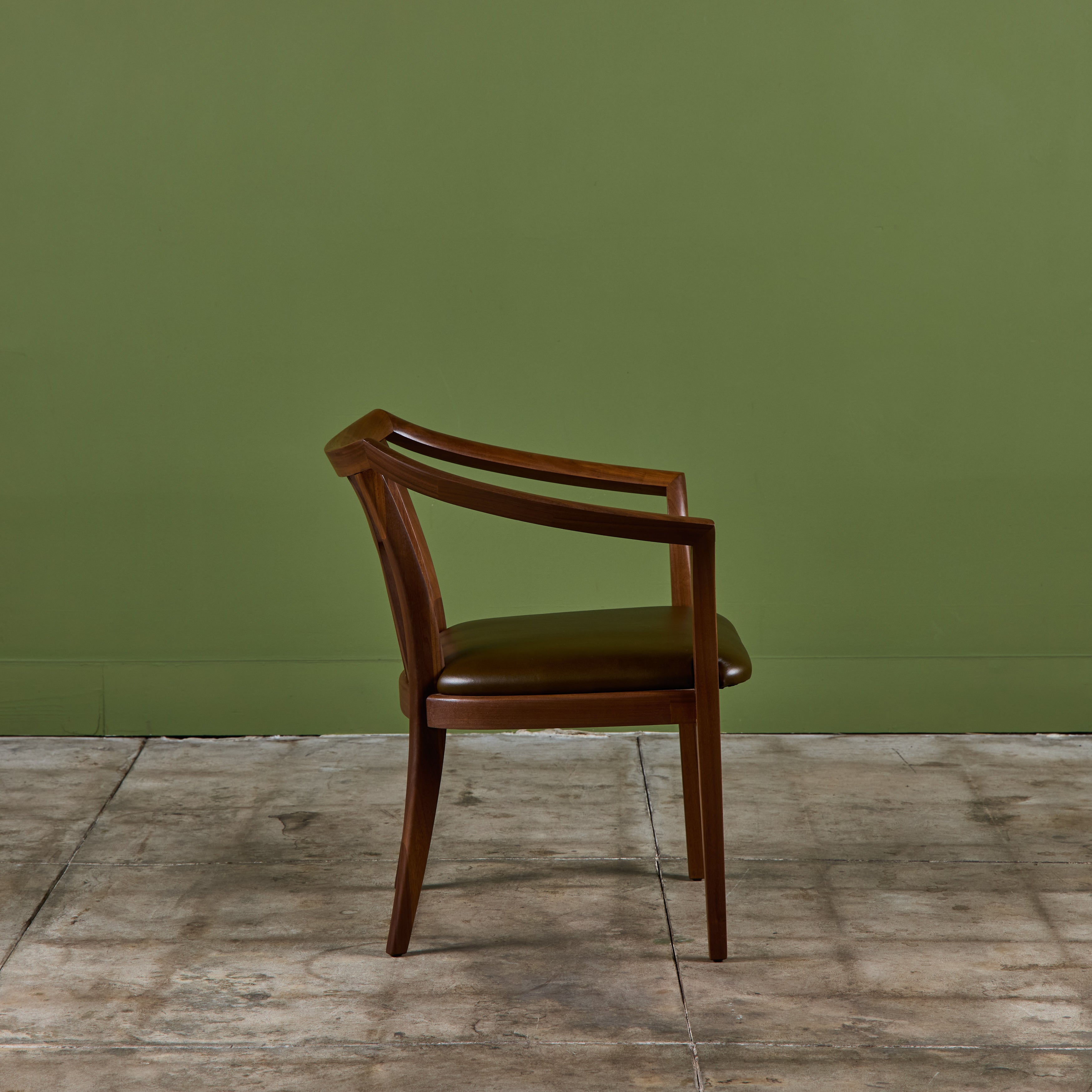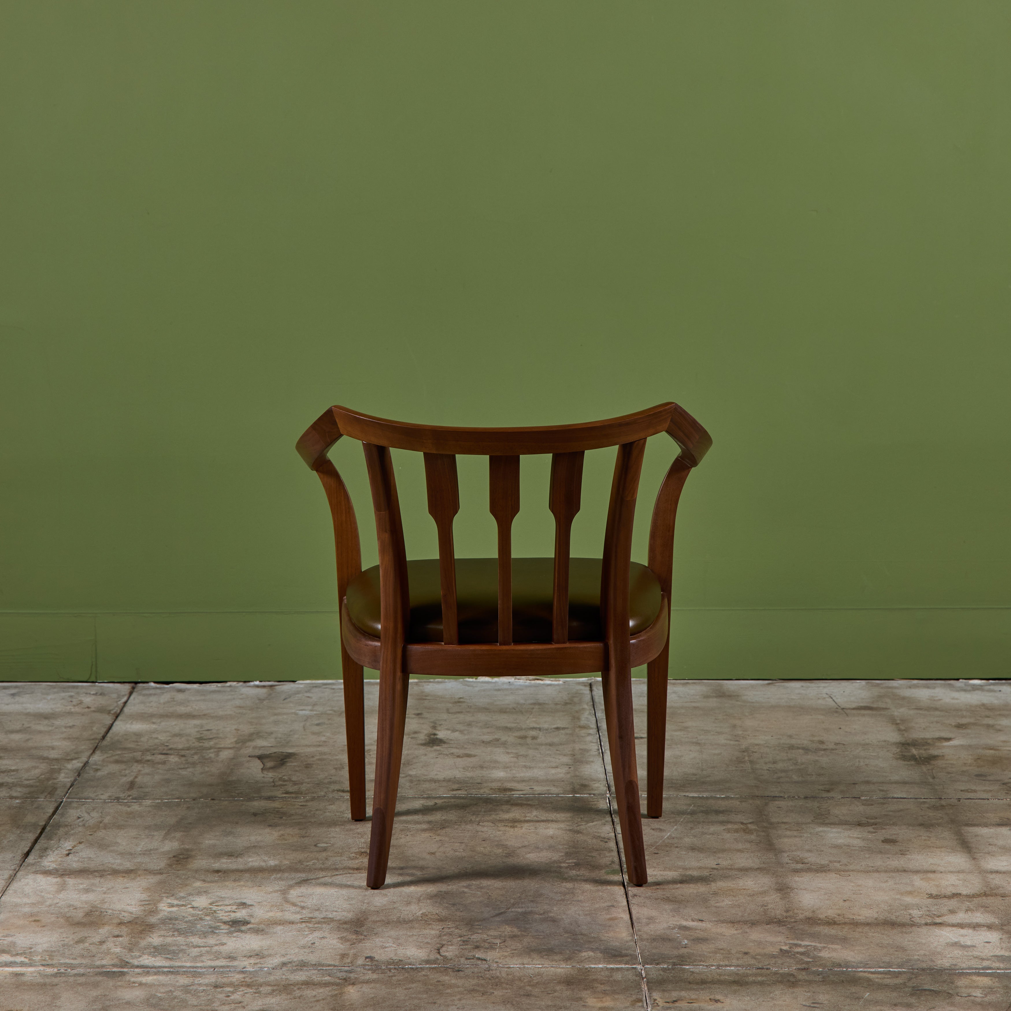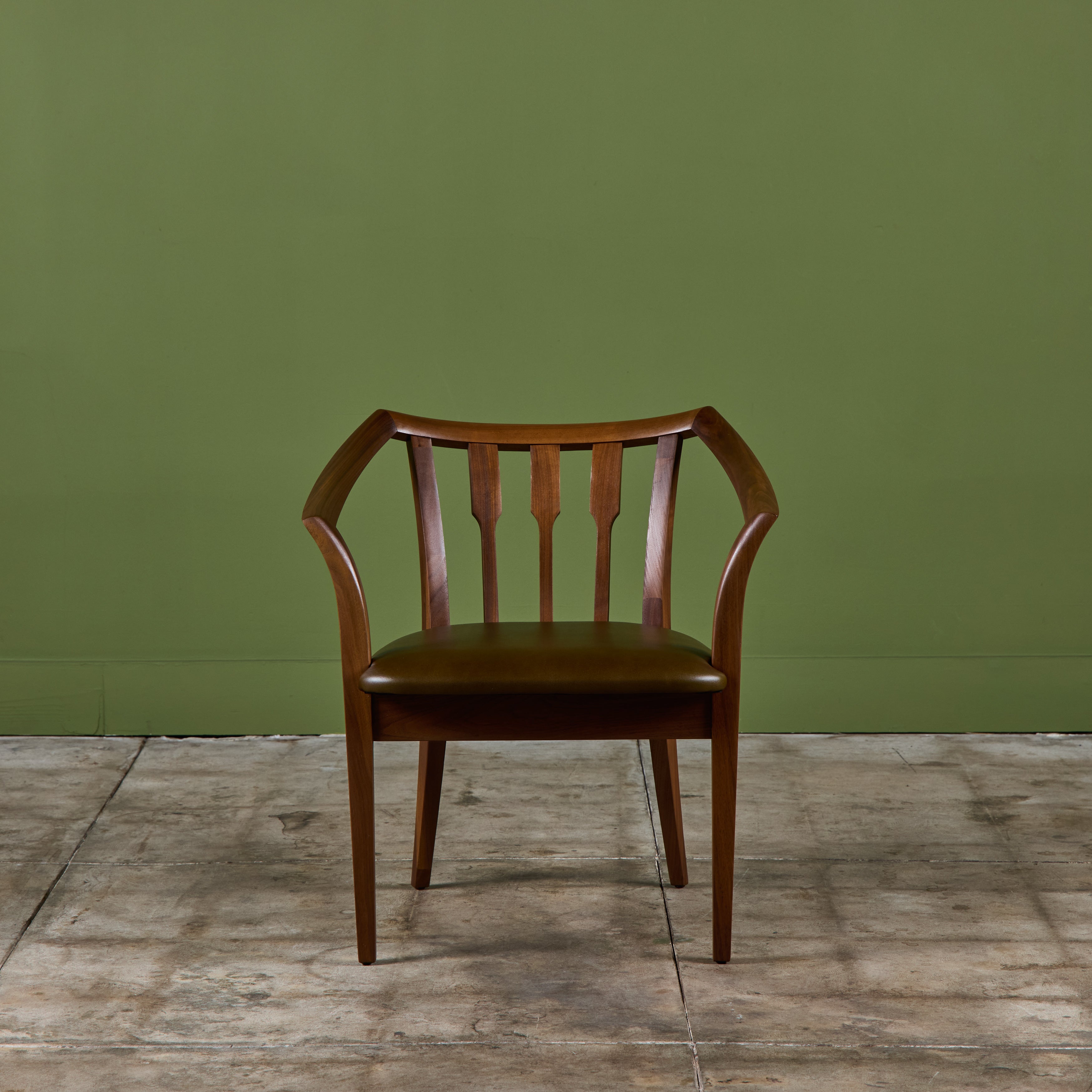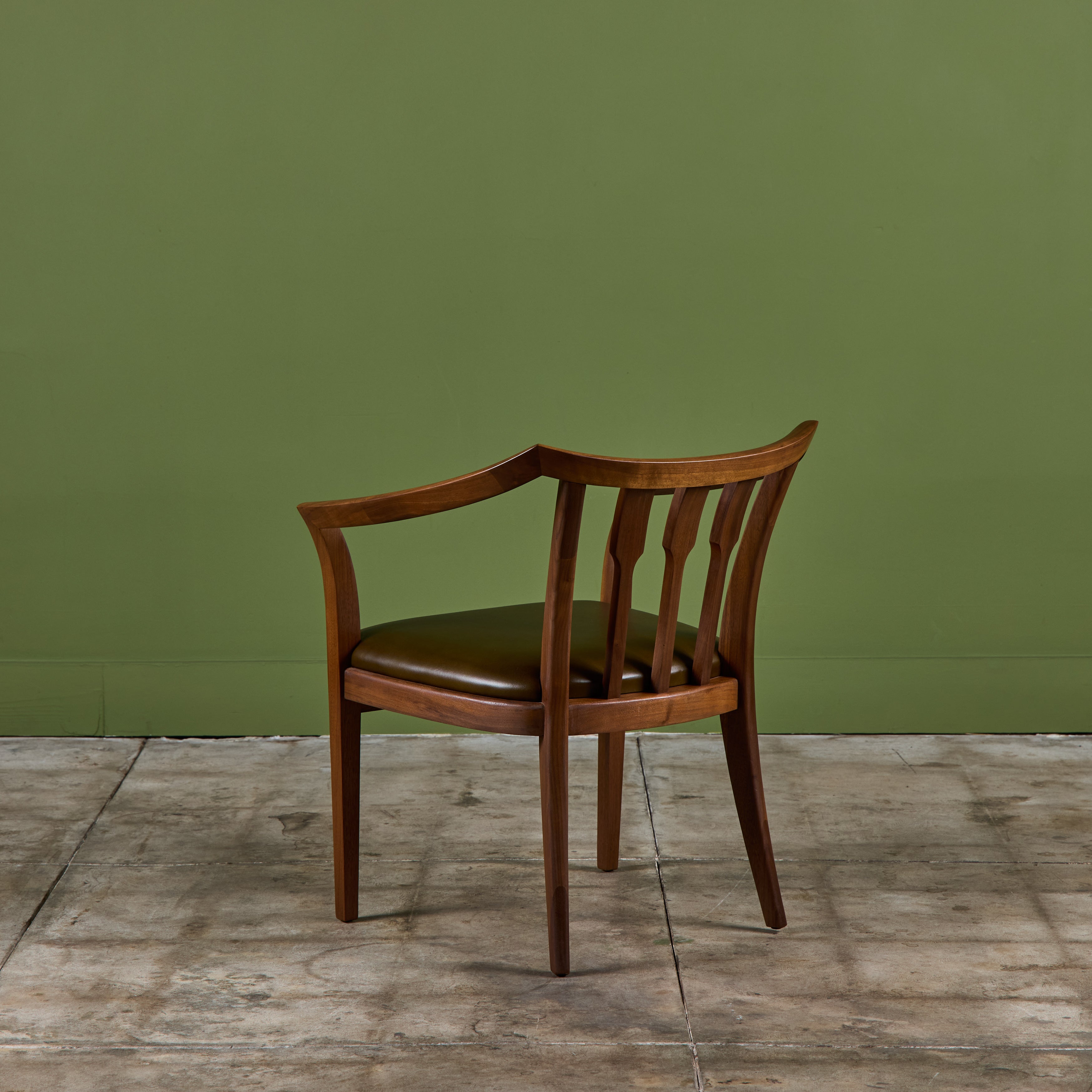 Brown Saltman walnut accent chair, c.1960s, USA. This armchair features a walnut slat back rest and newly upholstered leather cushioned seat. Perfect for a game table or lounging.