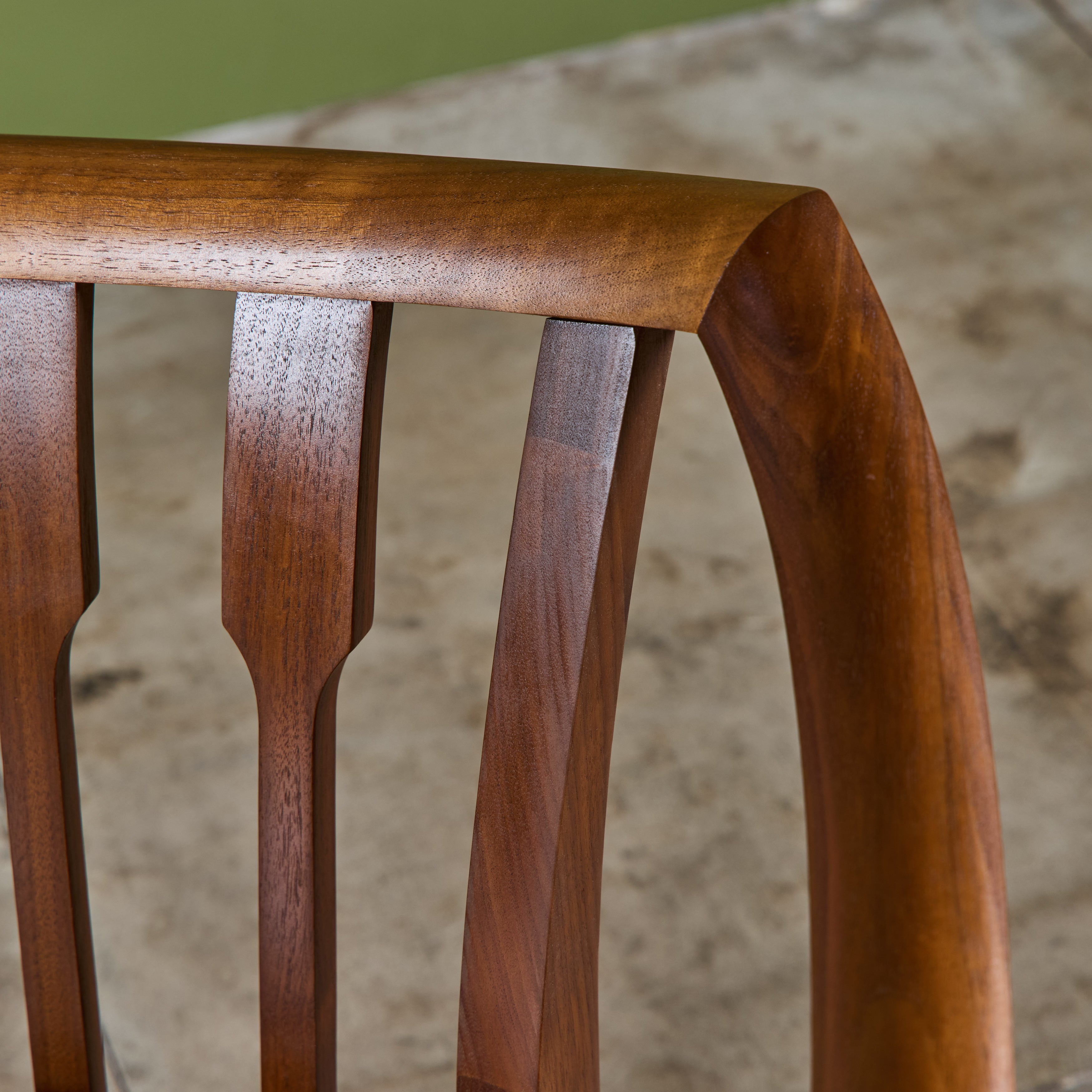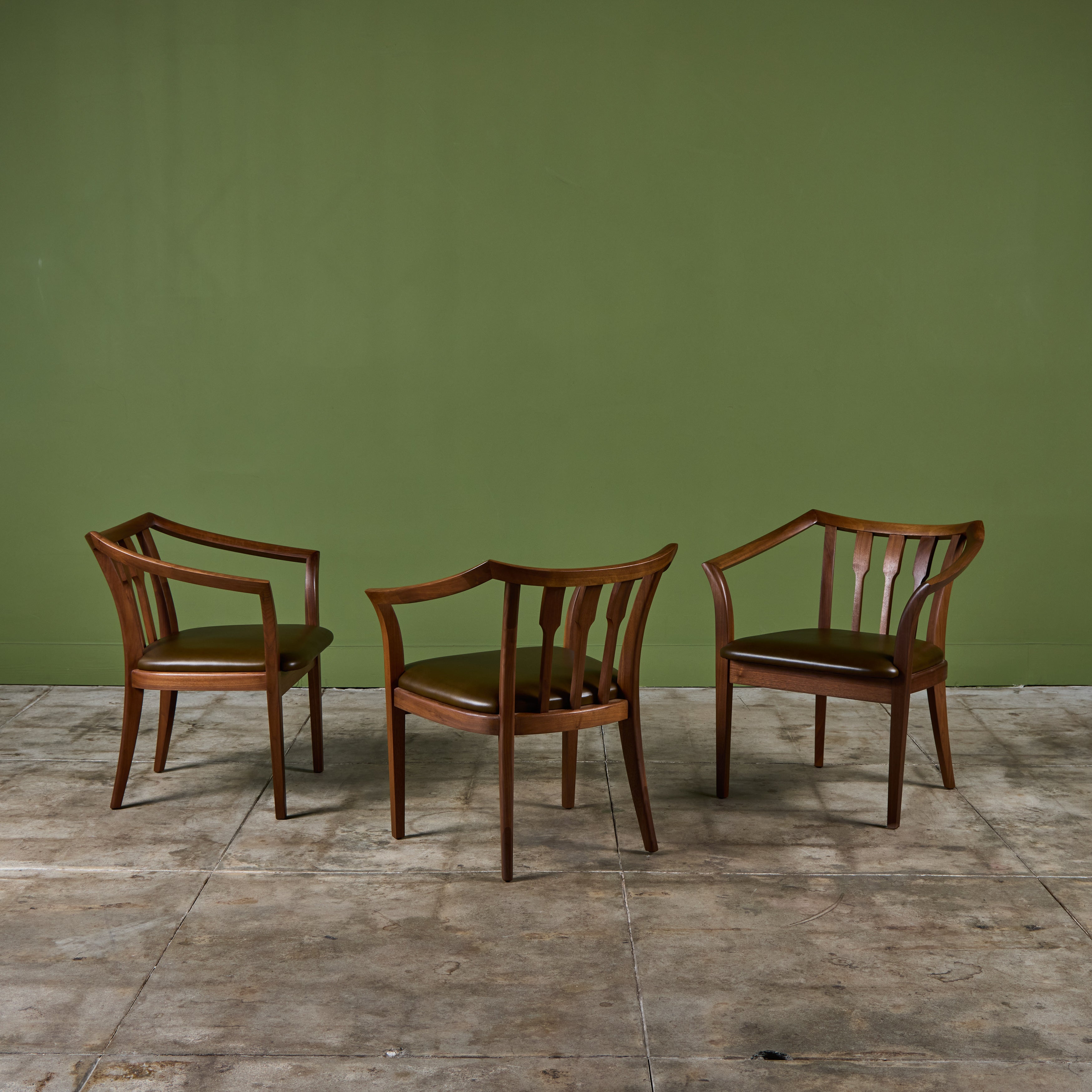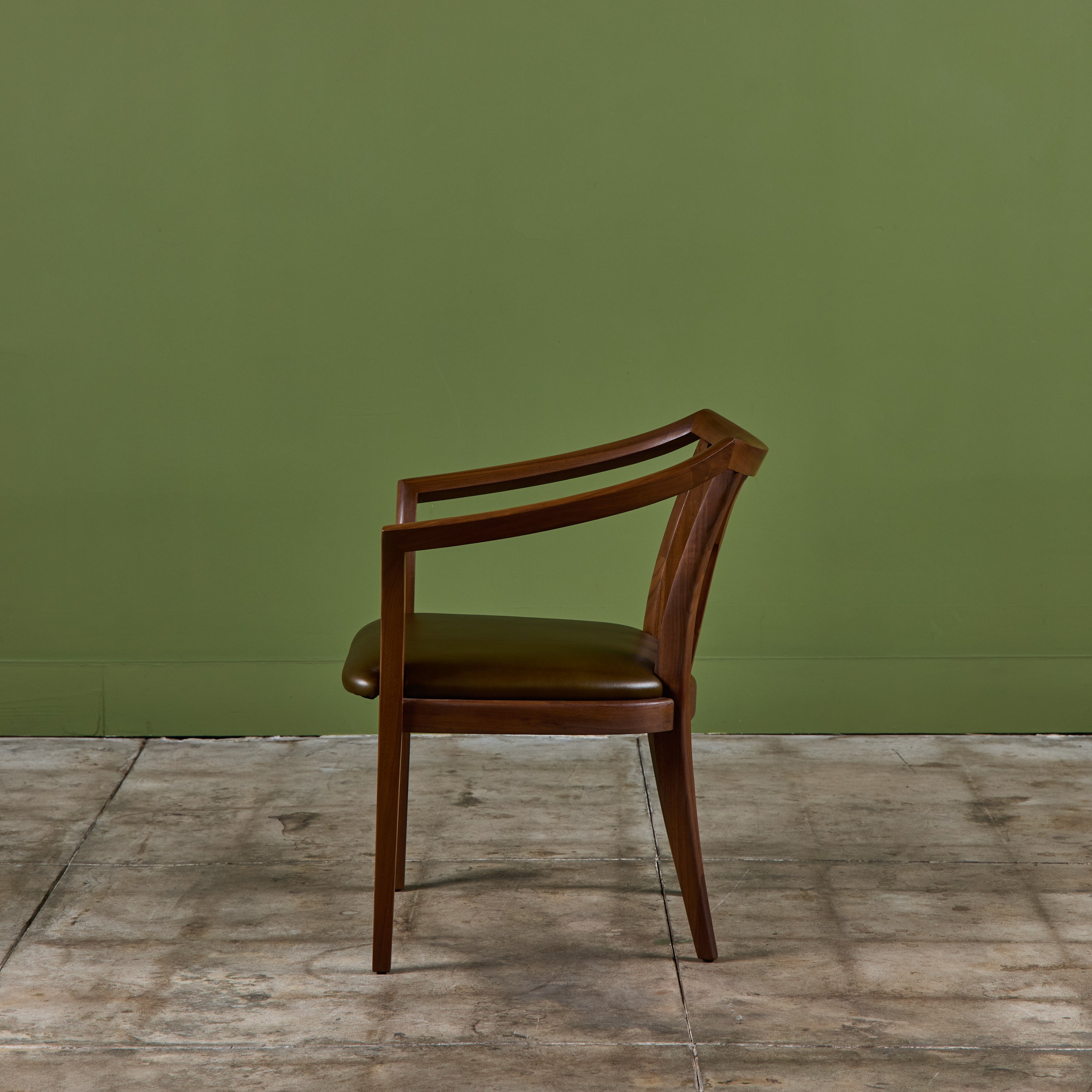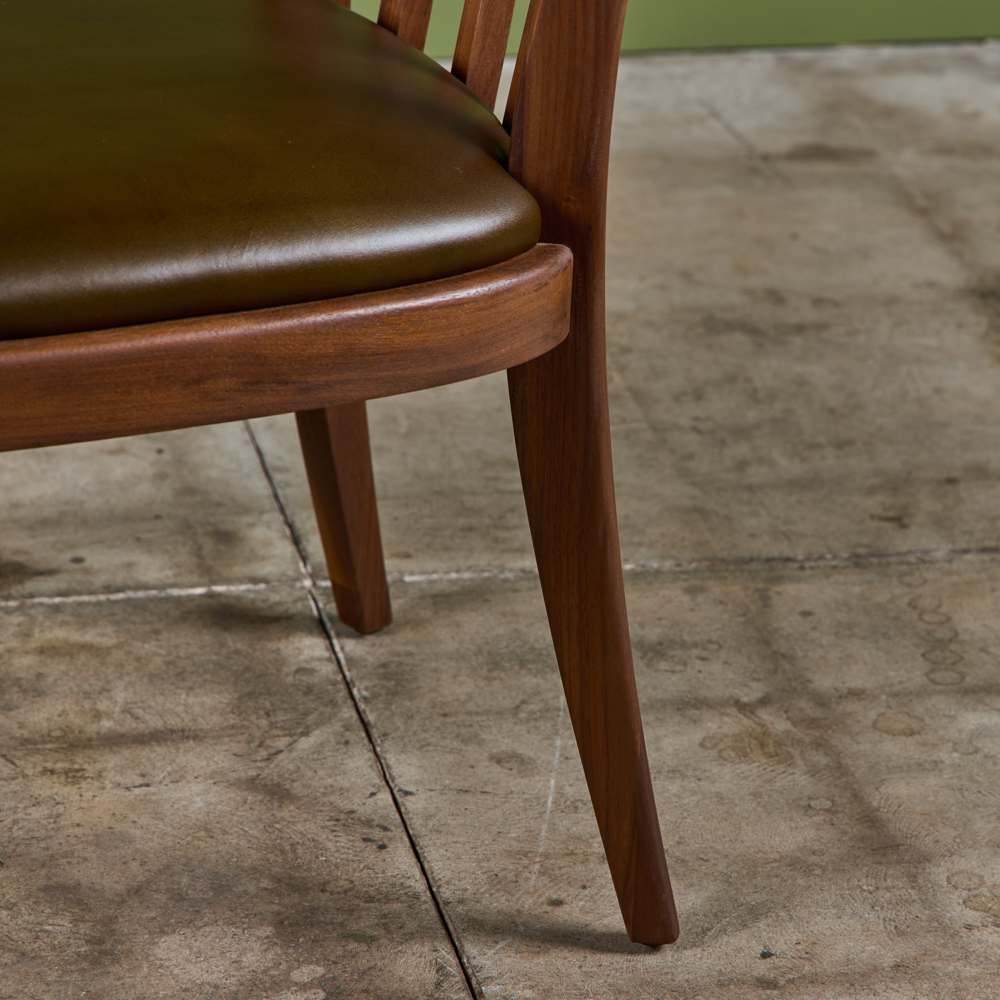 Brown Saltman walnut accent chair, c.1960s, USA. This armchair features a walnut slat back rest and newly upholstered leather cushioned seat. Perfect for a game table or lounging.