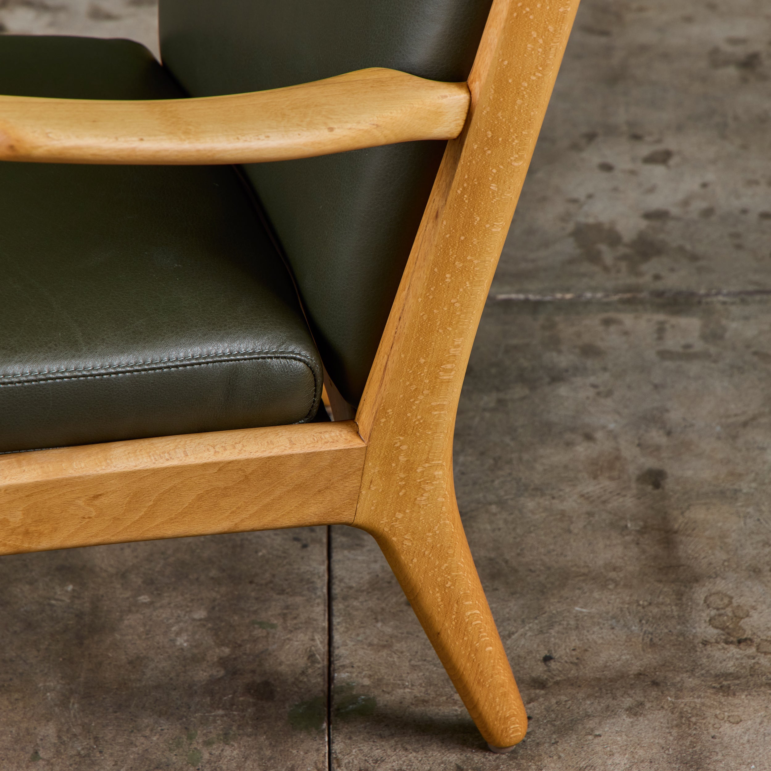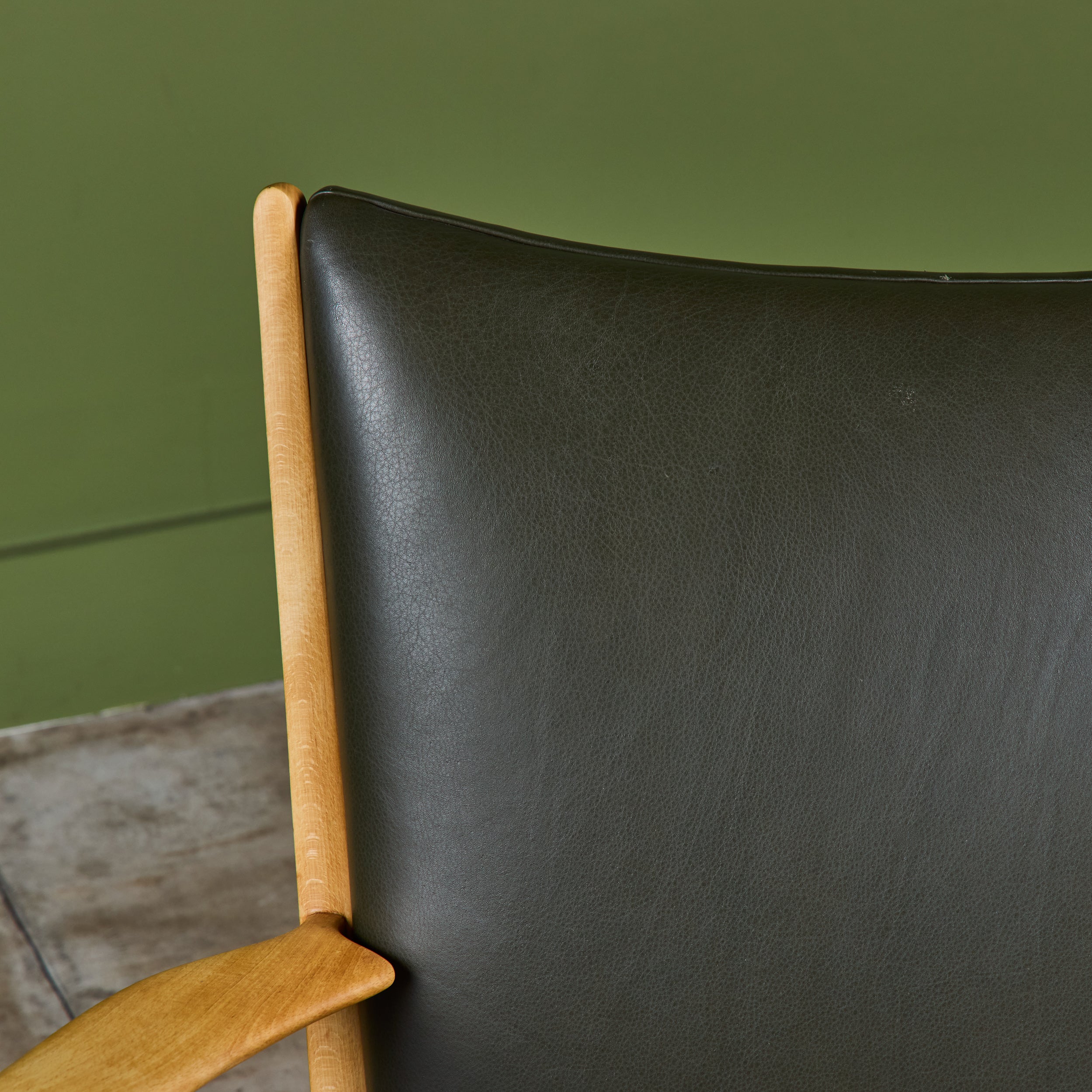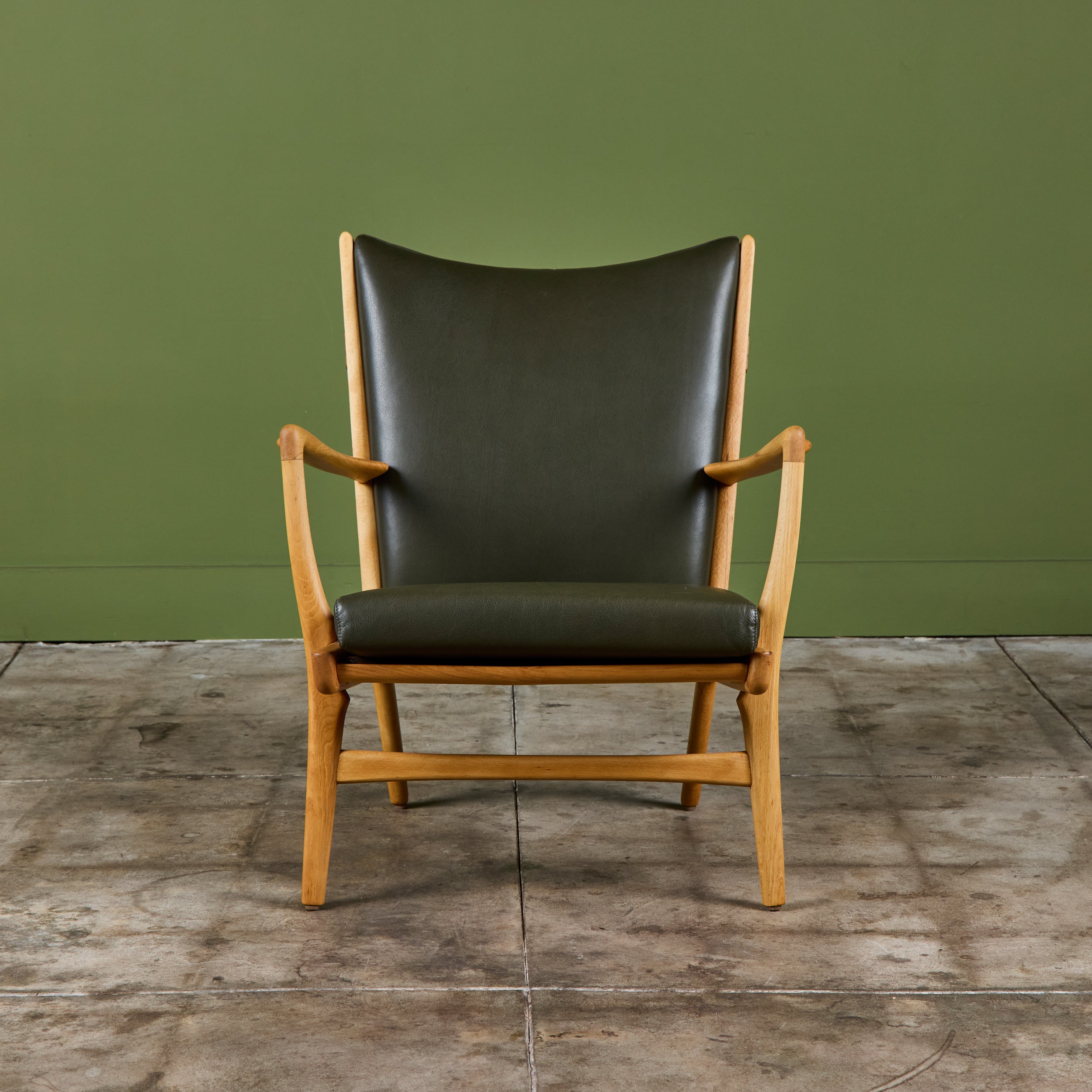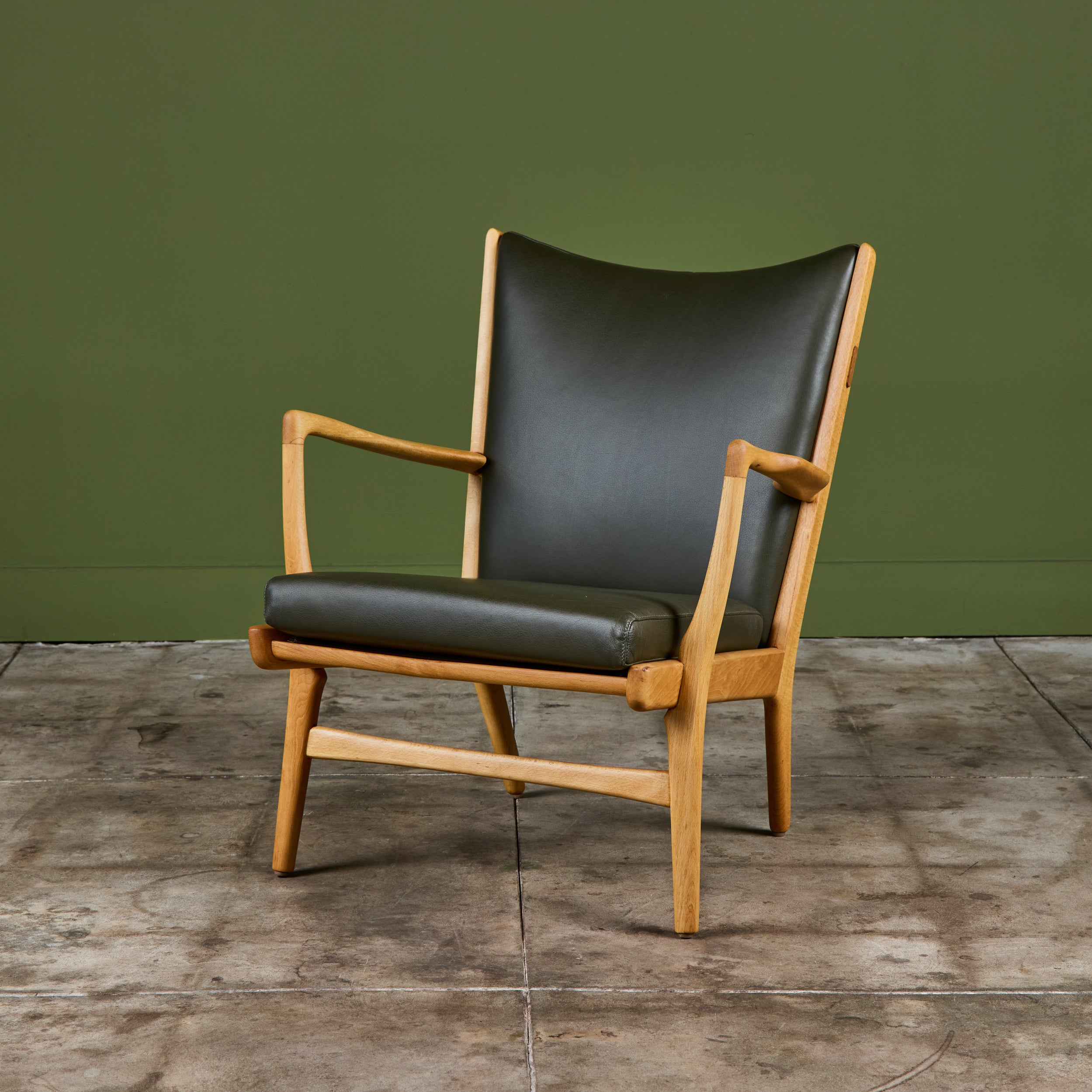 AP-16 lounge chair by Hans Wegner for AP Stolen, c.1950s, Denmark. The chair features a newly refinished oak frame and dark green leather upholstery. The backrest sits high with a slight curve while the seat sits at a light angle for comfort.