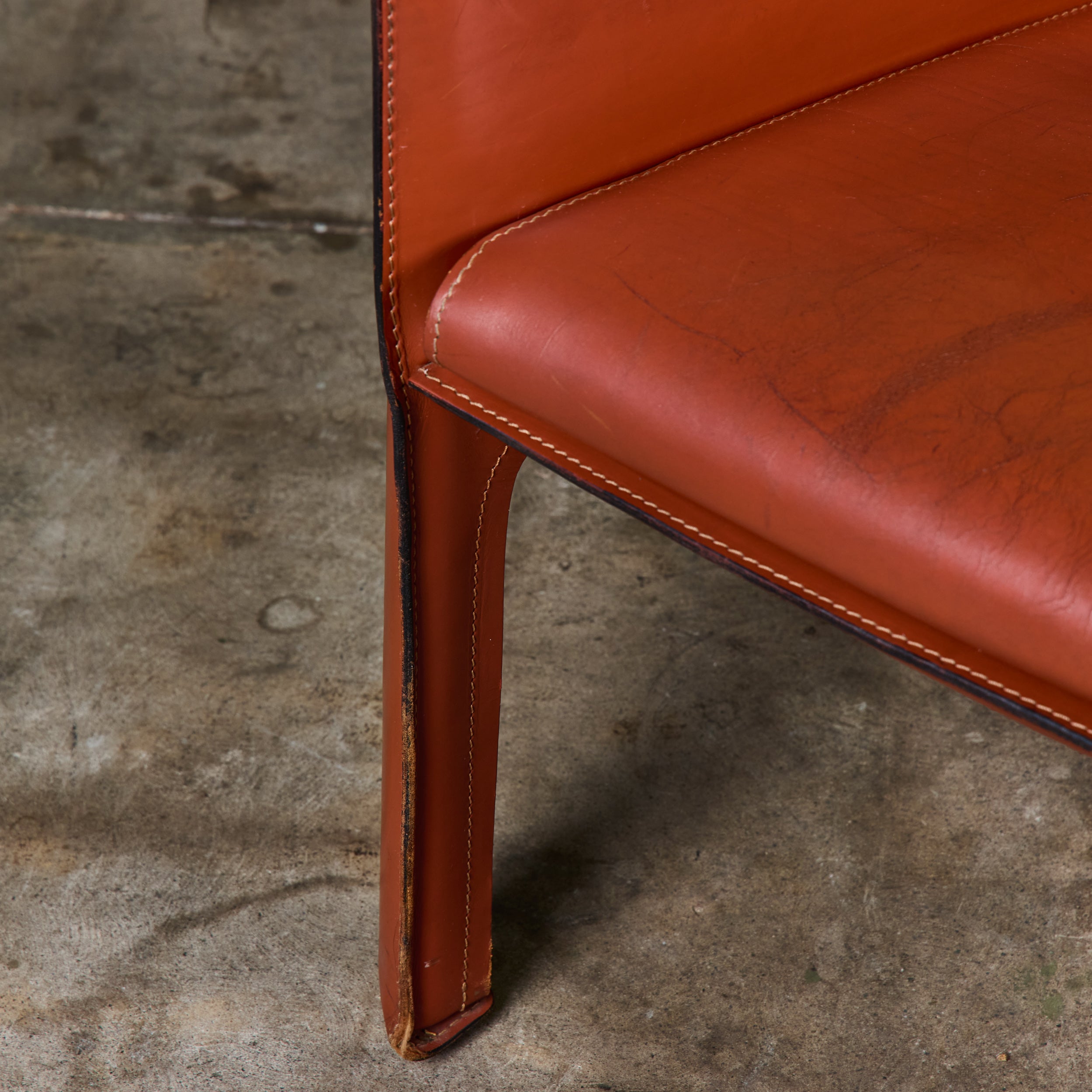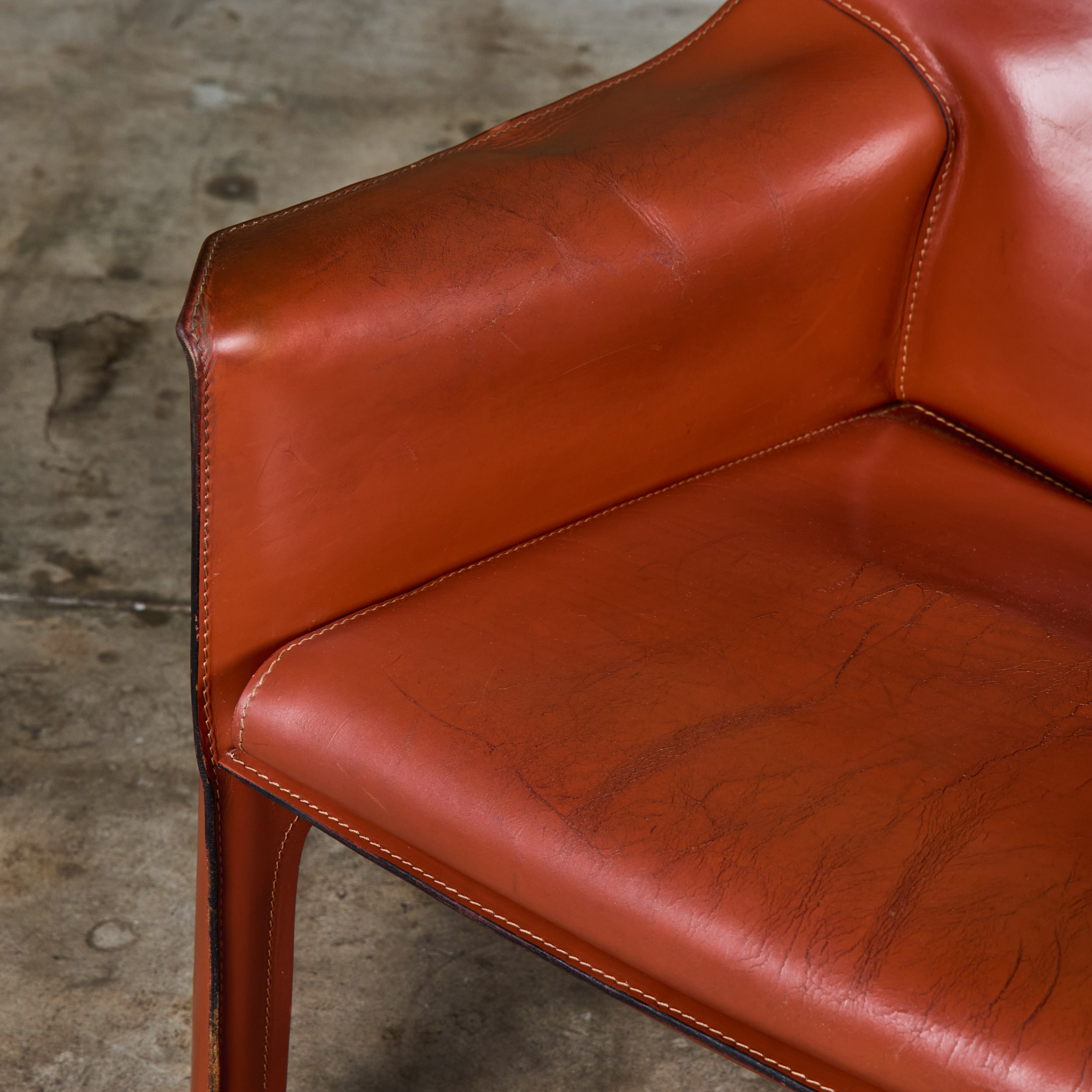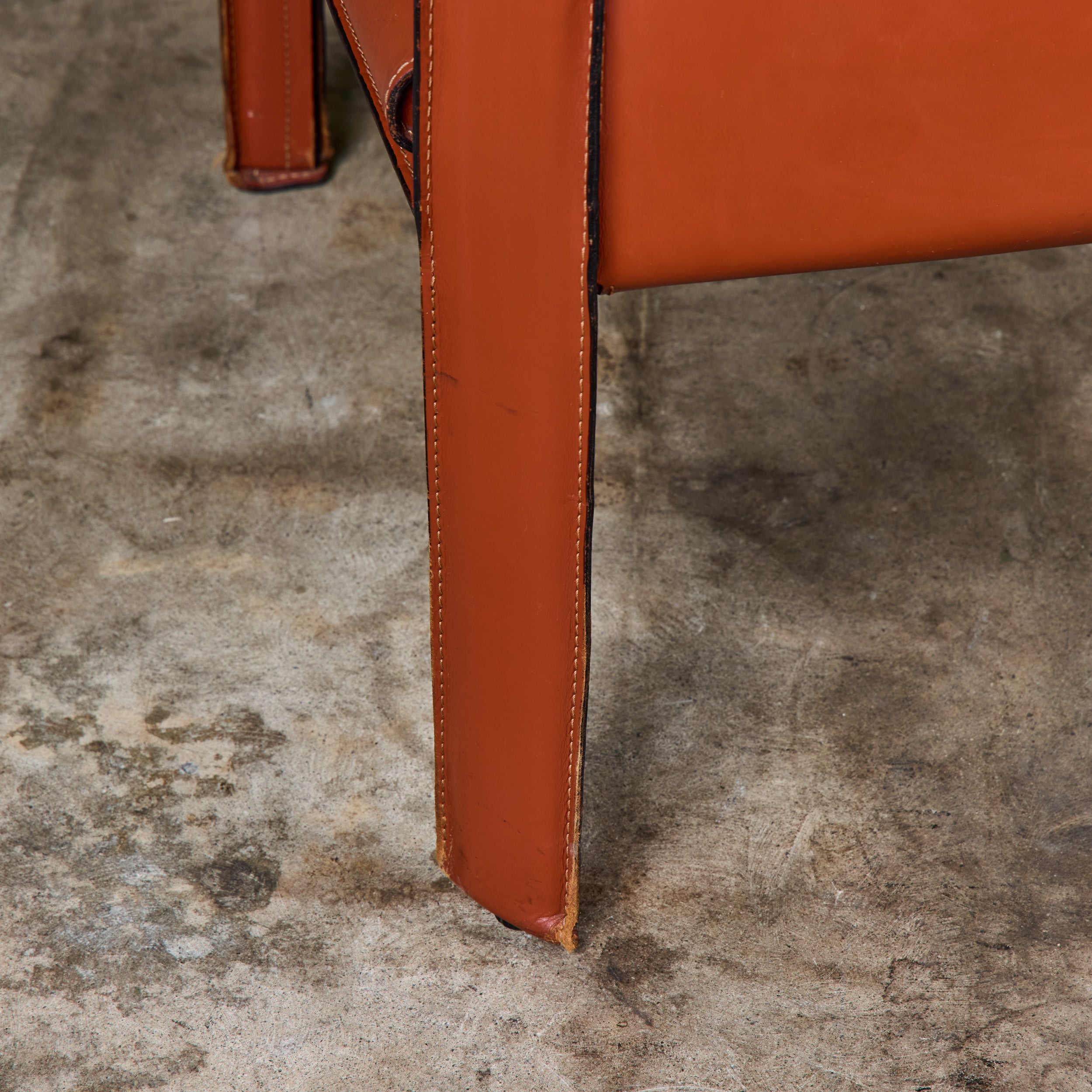 This iconic chair designed by Mario Bellini for Cassina c.1970s, Italy, features the original Red Russian saddle leather which is wrapped atop a steel frame. The seat has a rounded leather curved seat cushion with stitched detailing. The legs feature a black zippered detail. A great accent chair in any living room or study. The bottom of the chair is marked - Cassina