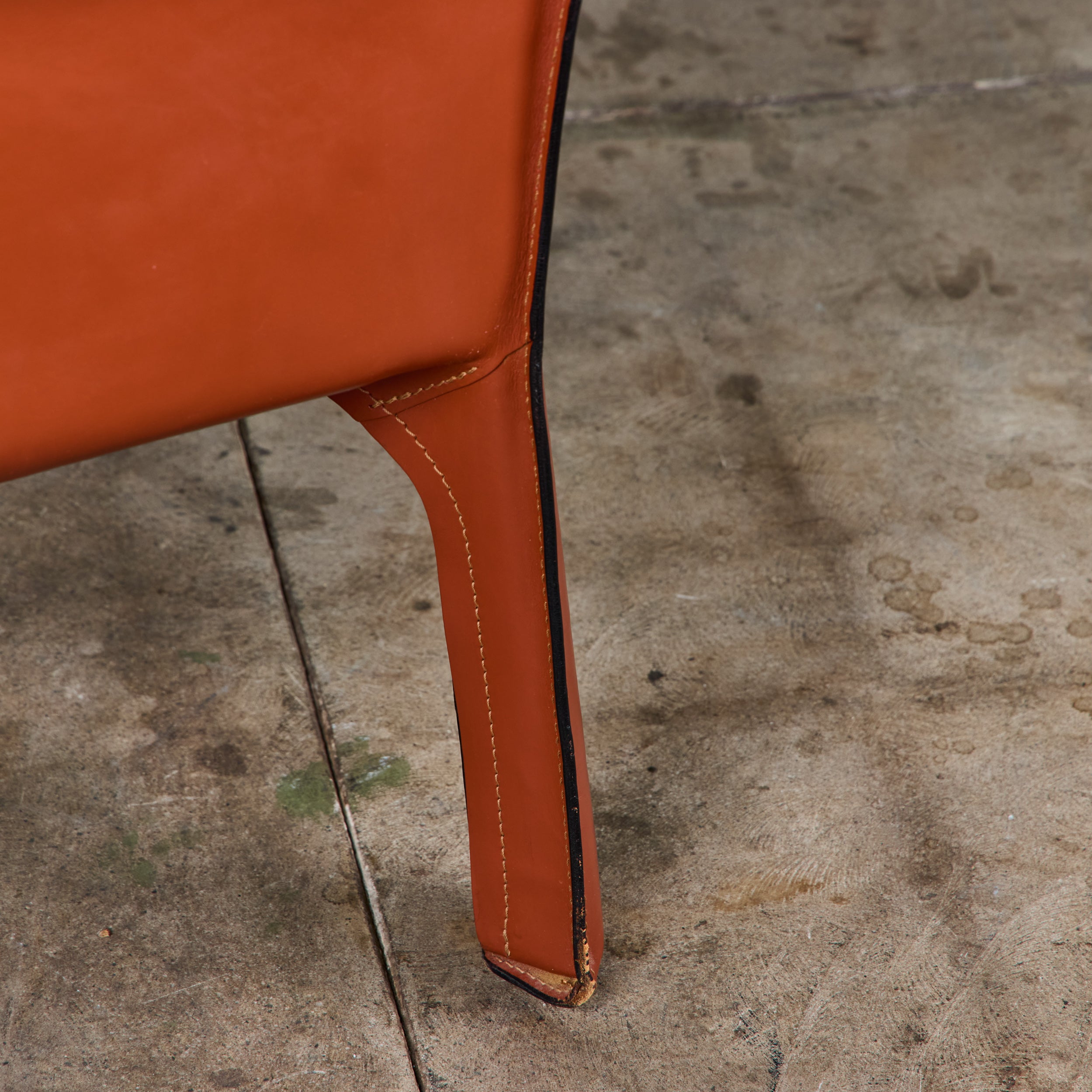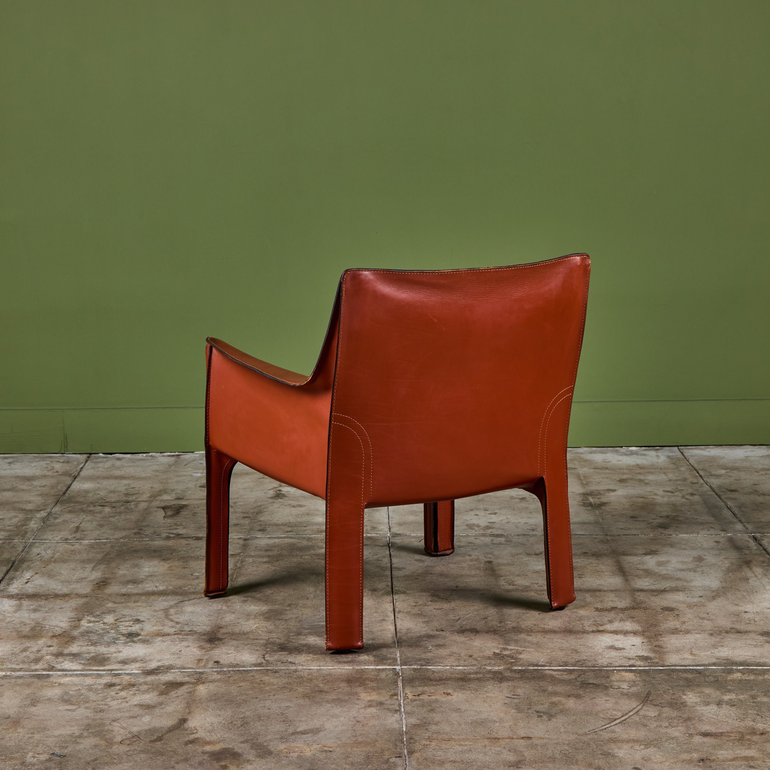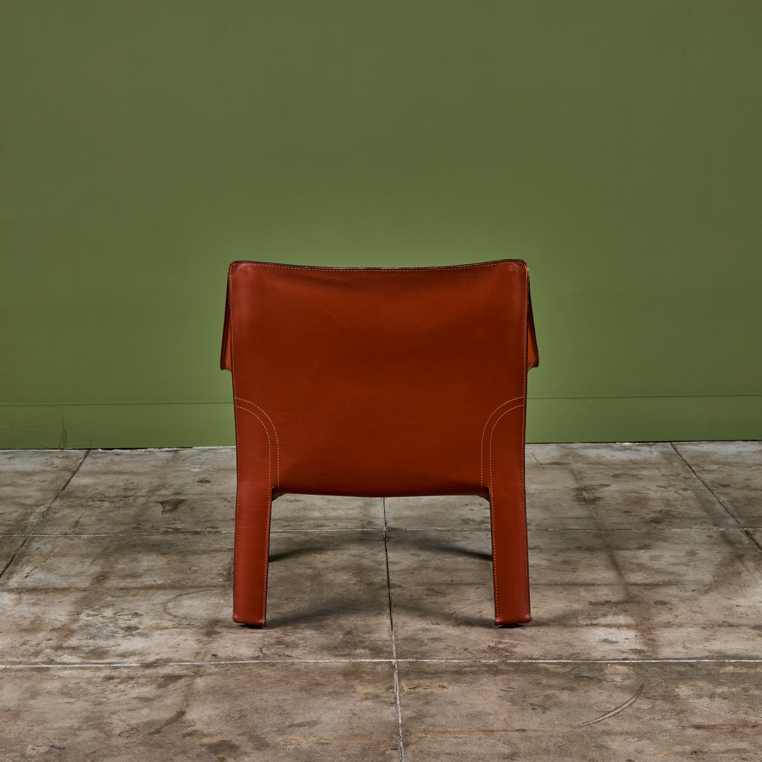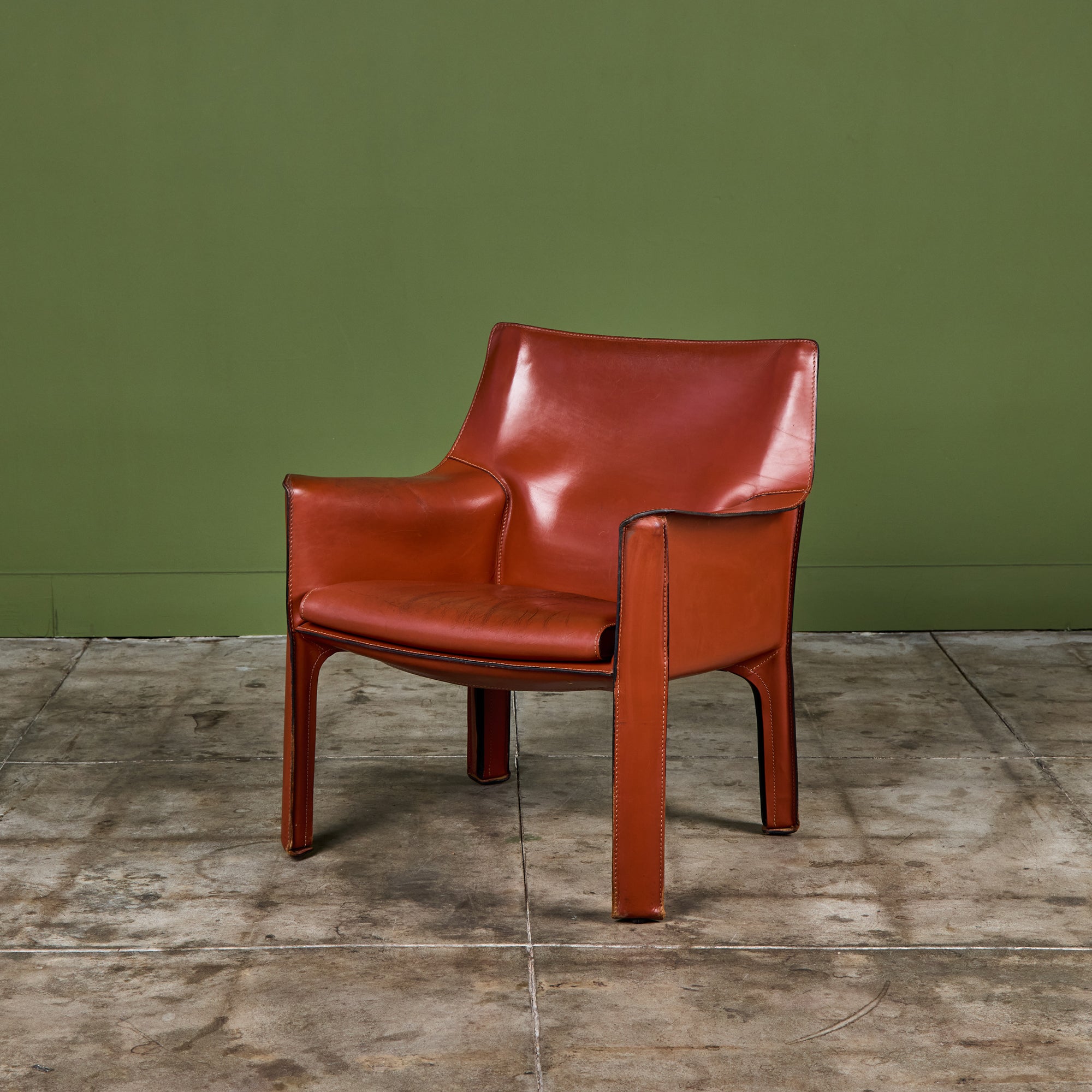 This iconic chair designed by Mario Bellini for Cassina c.1970s, Italy, features the original Red Russian saddle leather which is wrapped atop a steel frame. The seat has a rounded leather curved seat cushion with stitched detailing. The legs feature a black zippered detail. A great accent chair in any living room or study. The bottom of the chair is marked - Cassina
