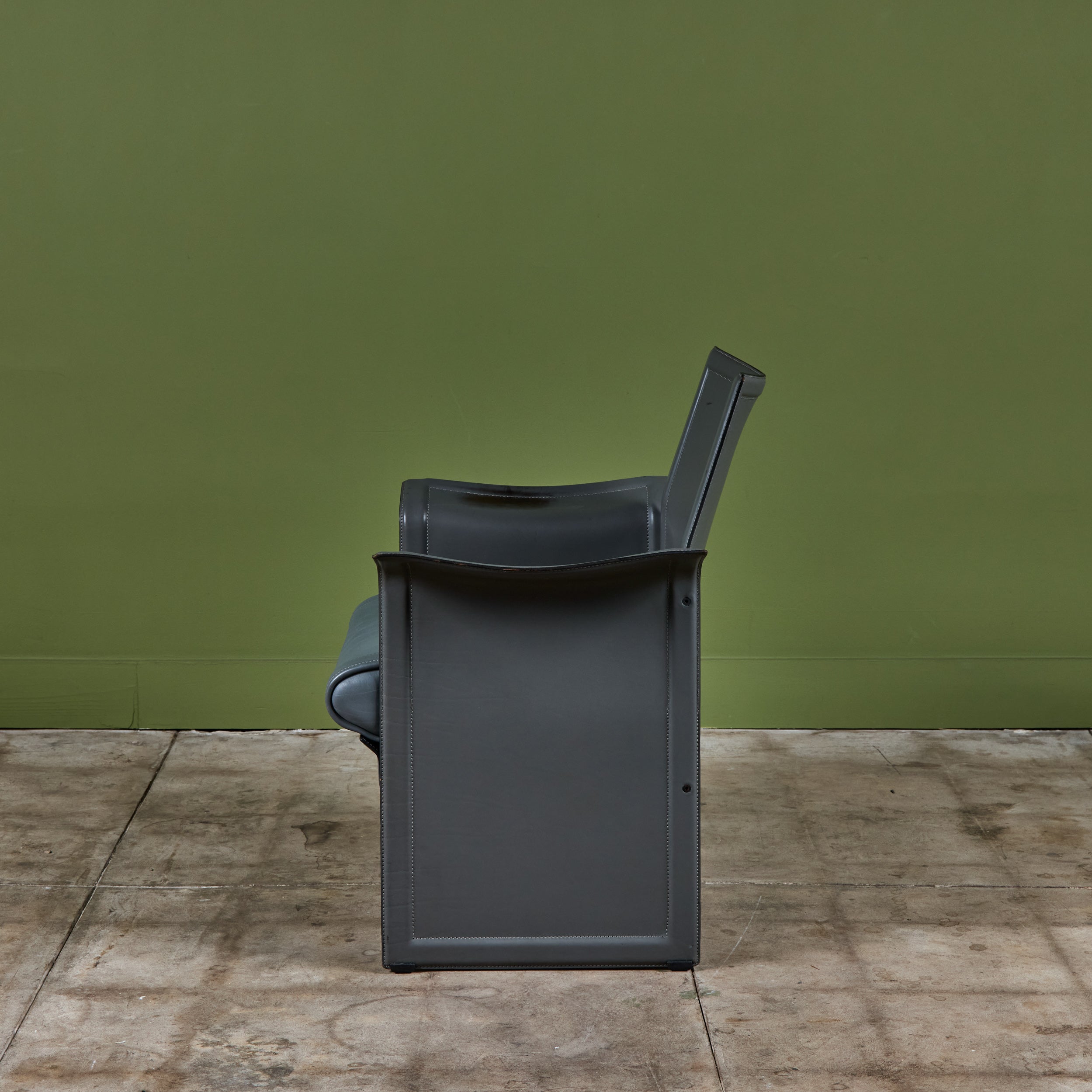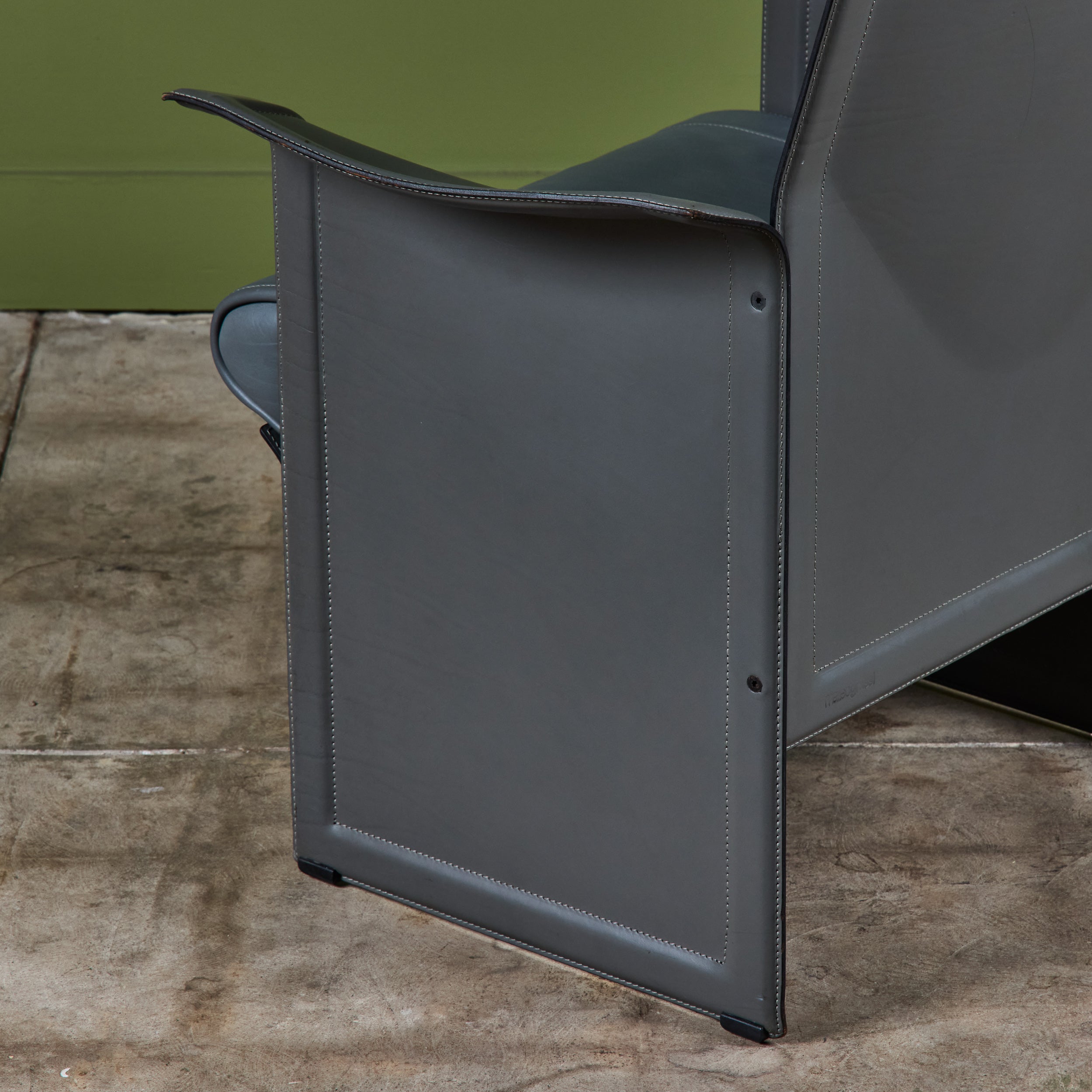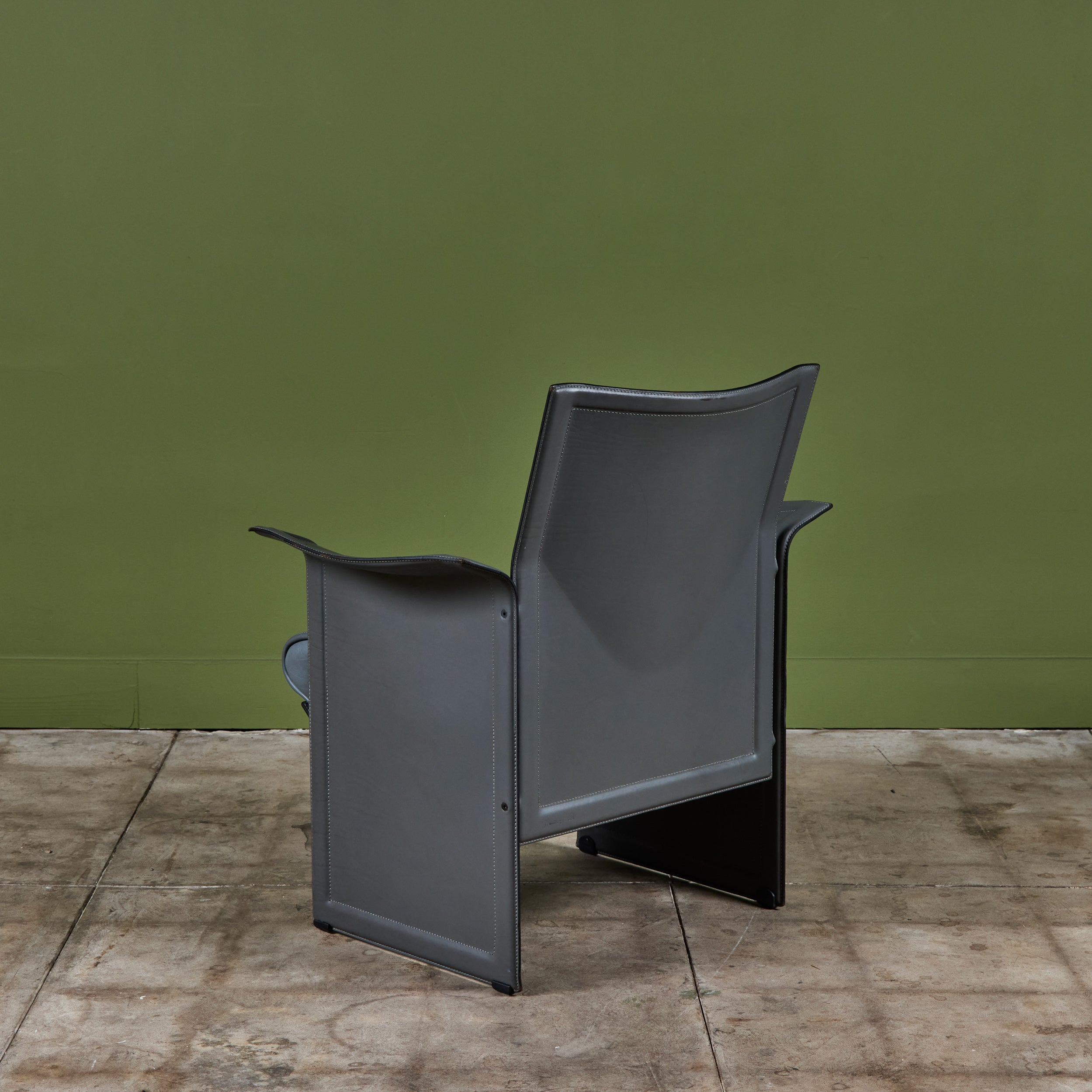 Matteo Grassi leather lounge chair c.1980s, Italy, features a gray saddle leather wrapped atop a steel frame with stitched detailing and a cushioned seat.