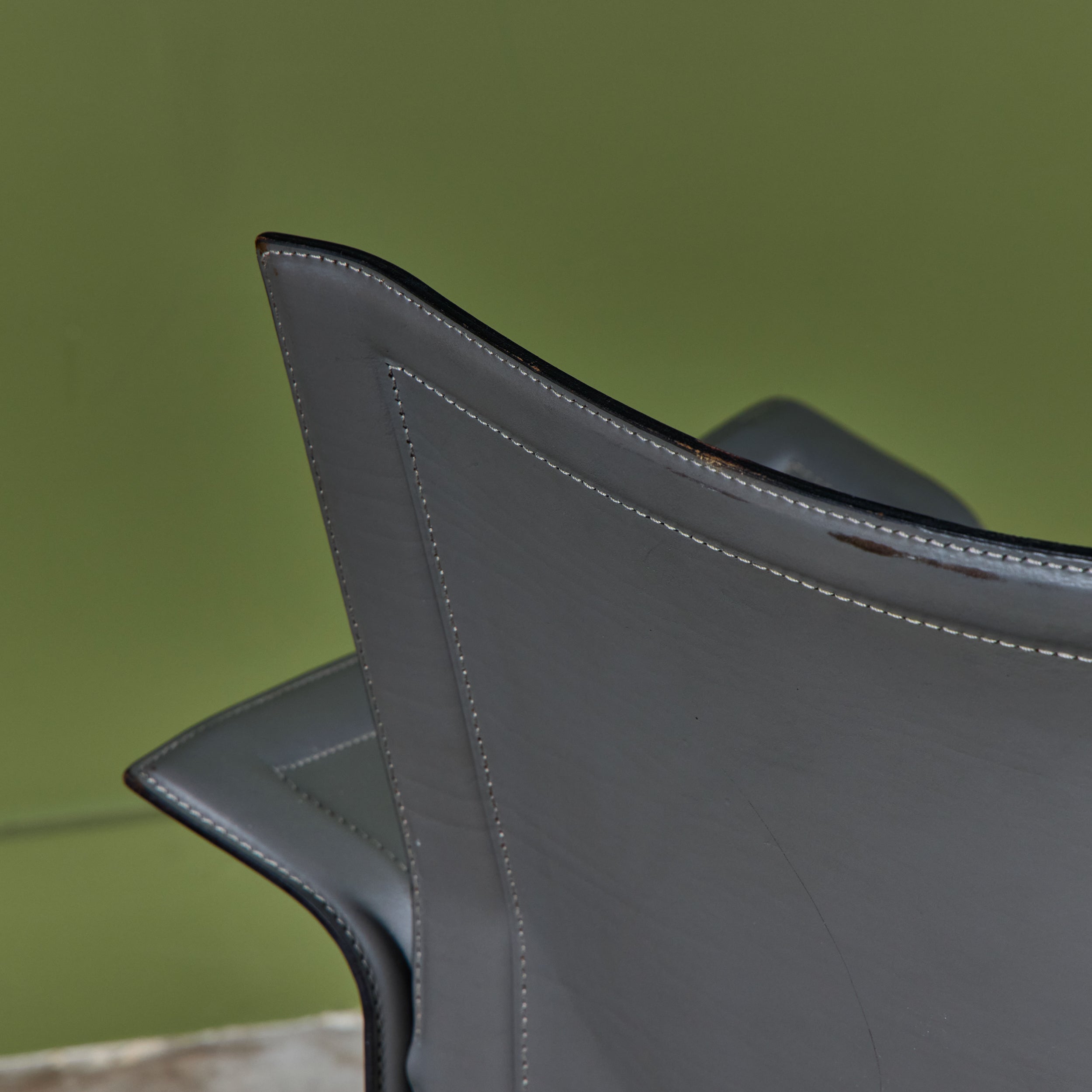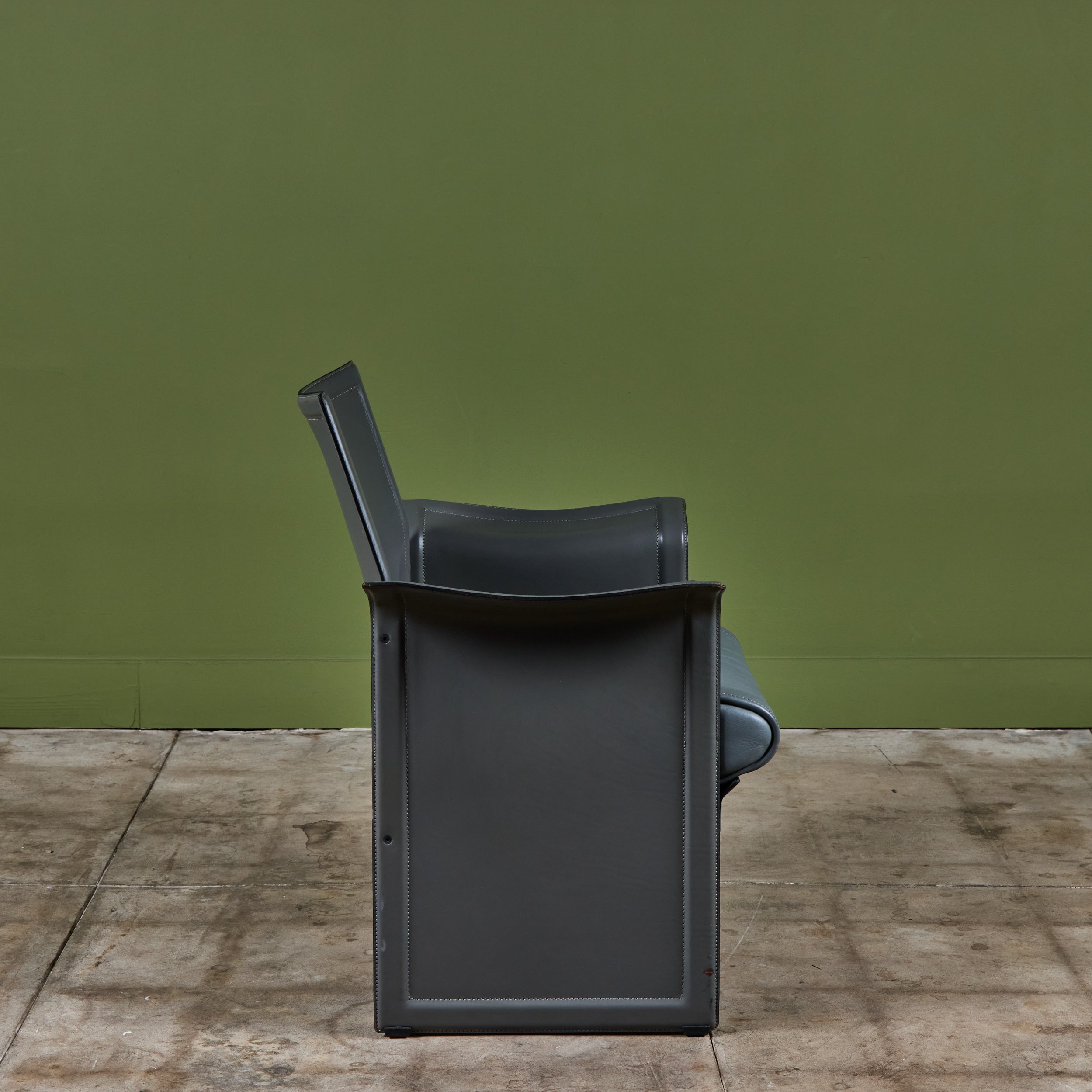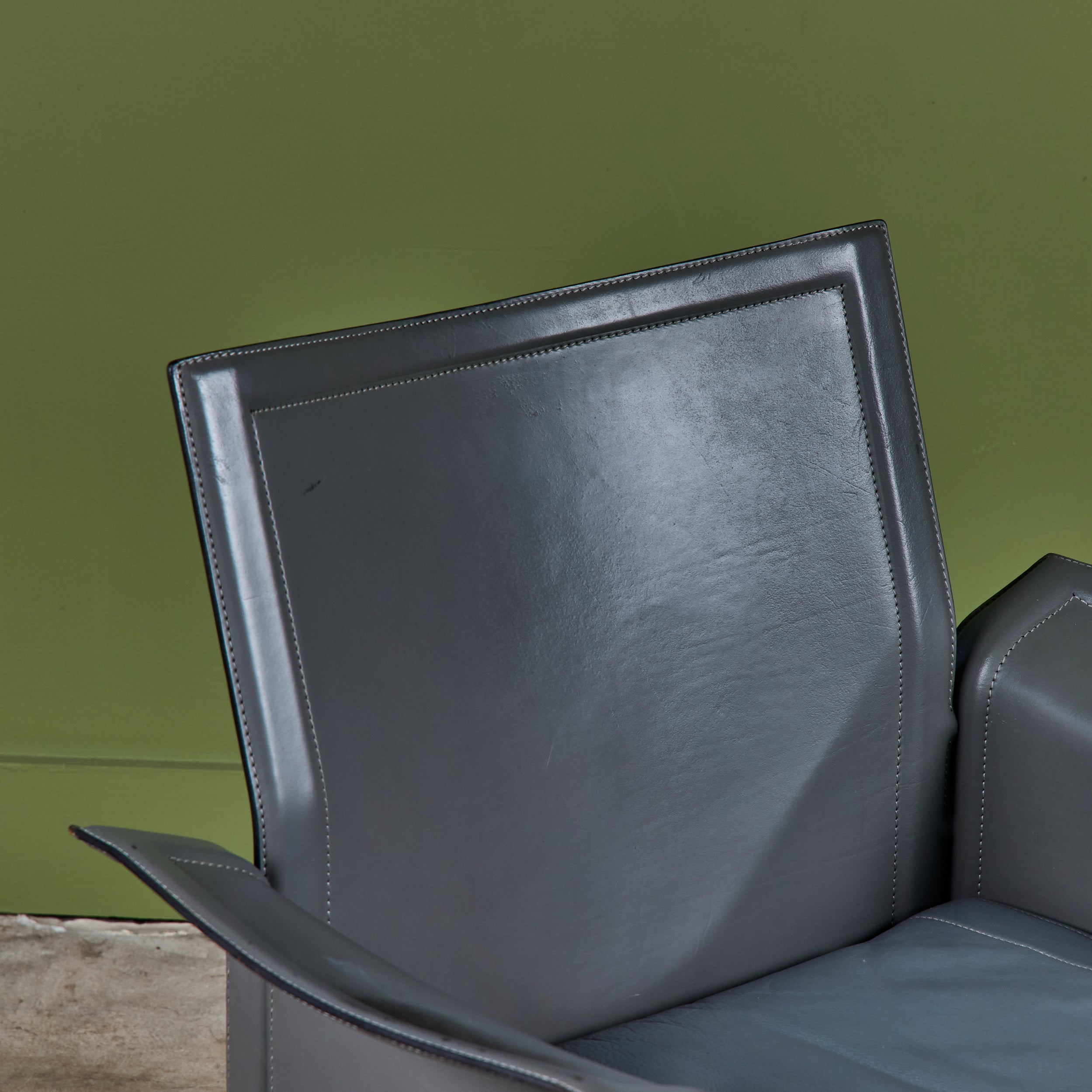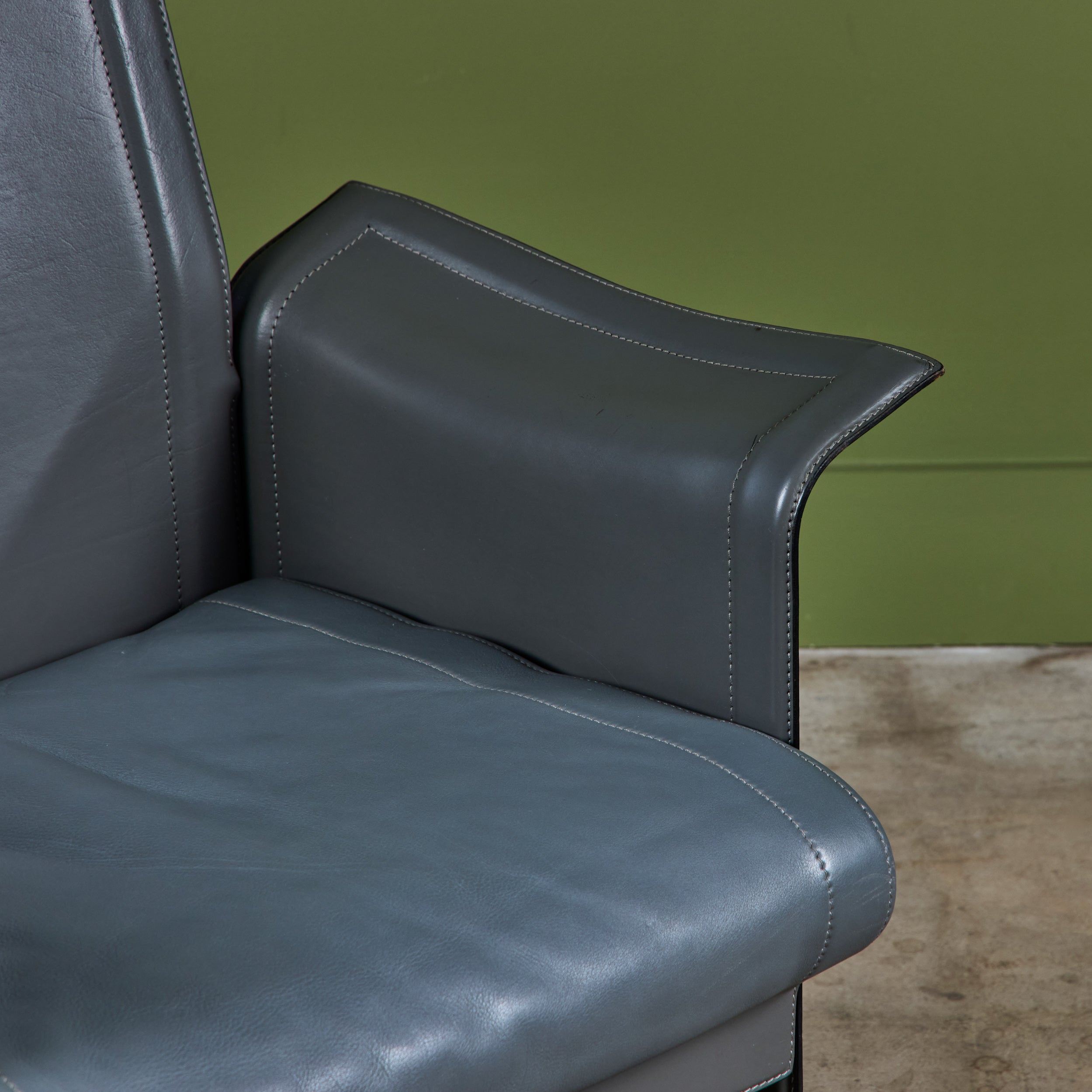 Matteo Grassi leather lounge chair c.1980s, Italy, features a gray saddle leather wrapped atop a steel frame with stitched detailing and a cushioned seat.