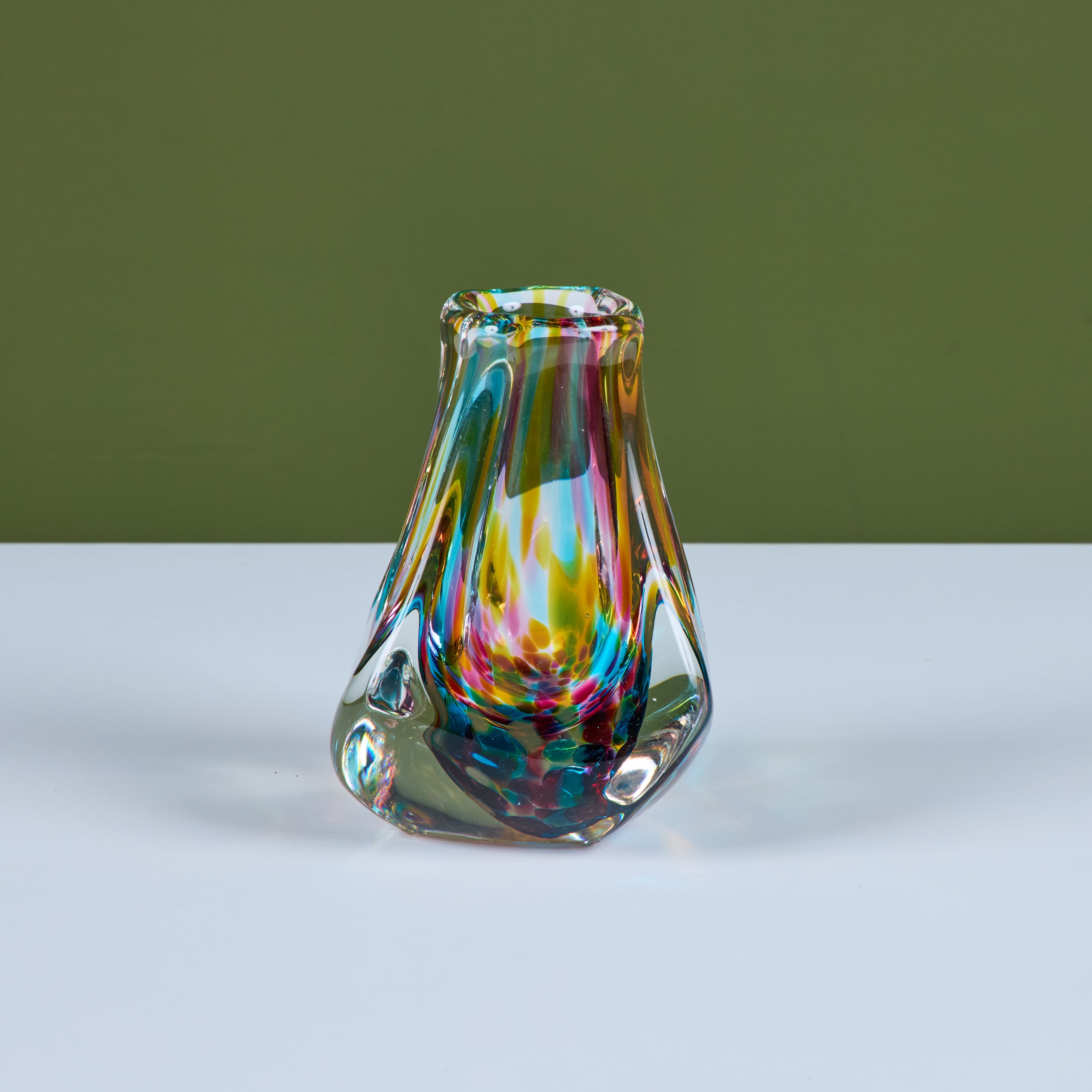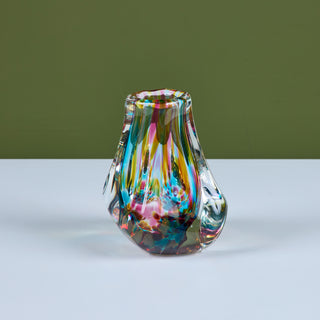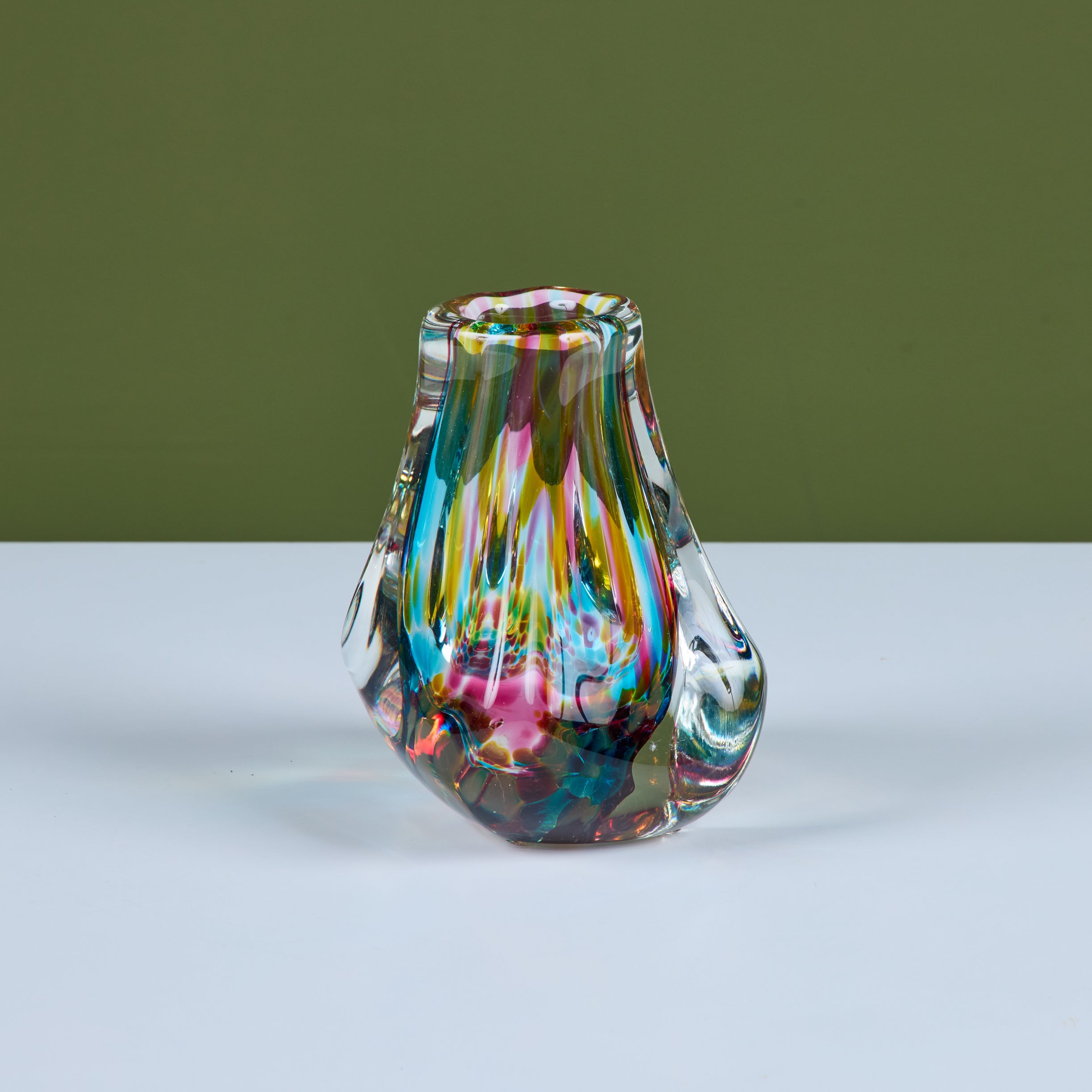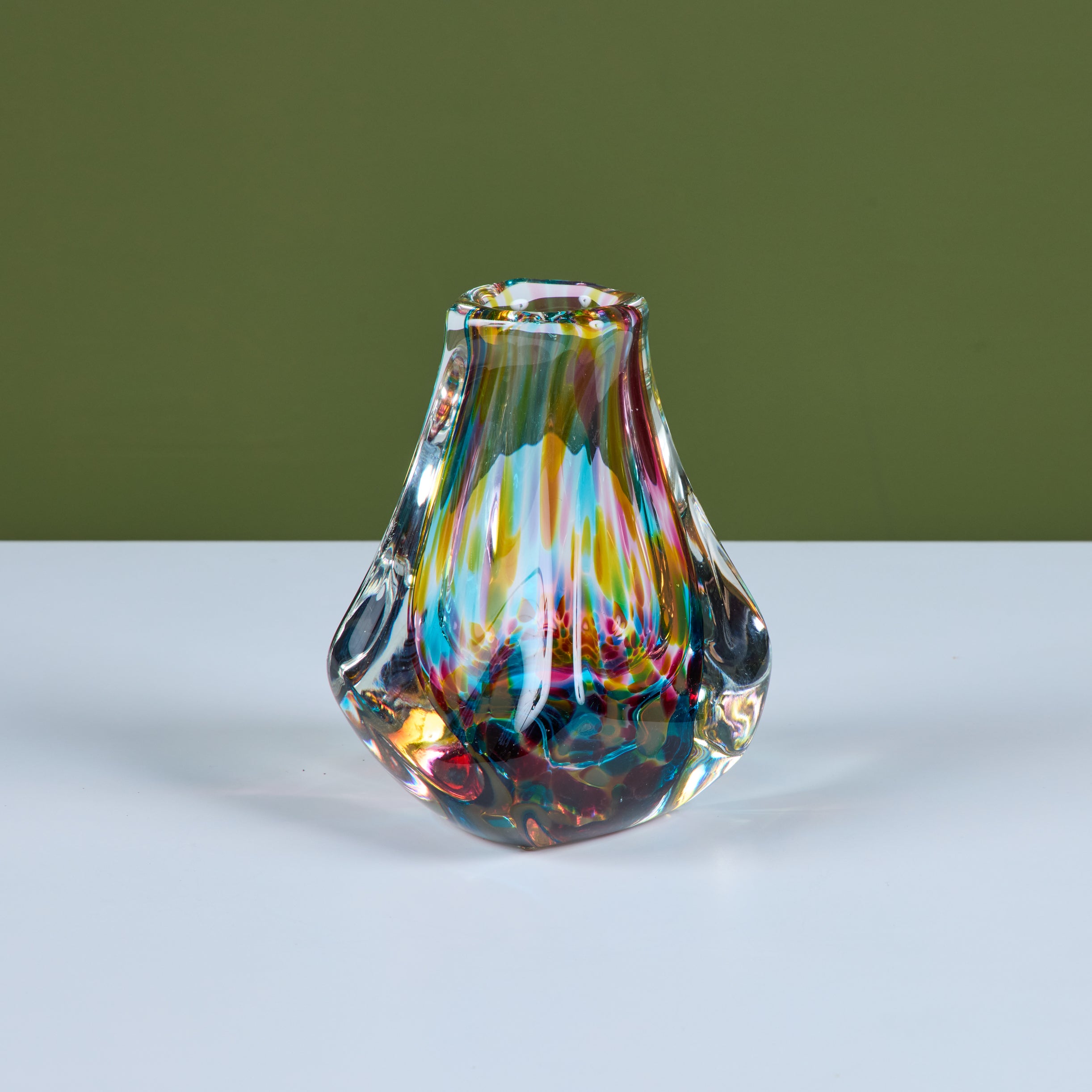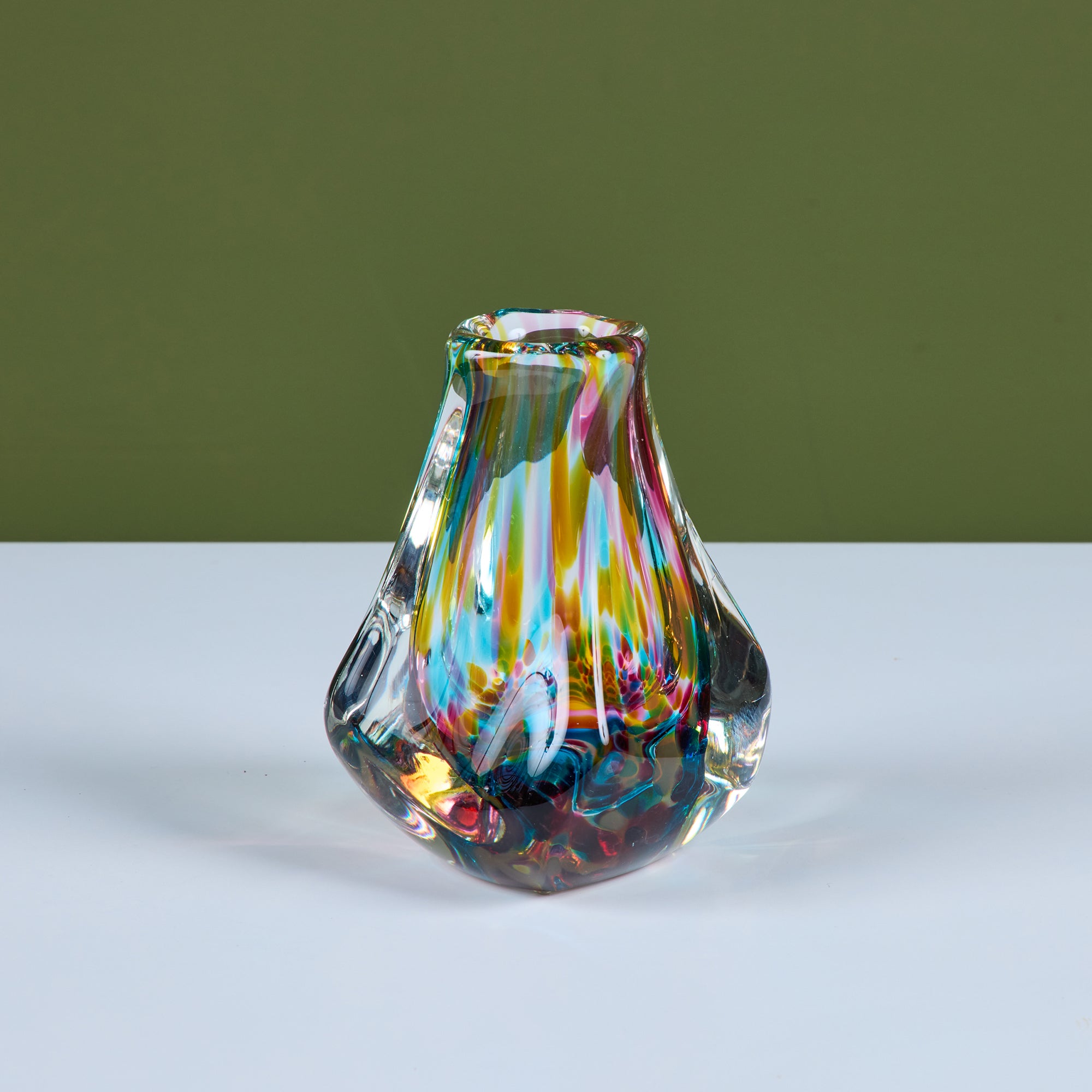 Free form glass vase by Paul Harrie, c.1980s, USA. This thick glass vase is part of Harrie's River Series showcasing varying colors at different angles. Signed by the artist.