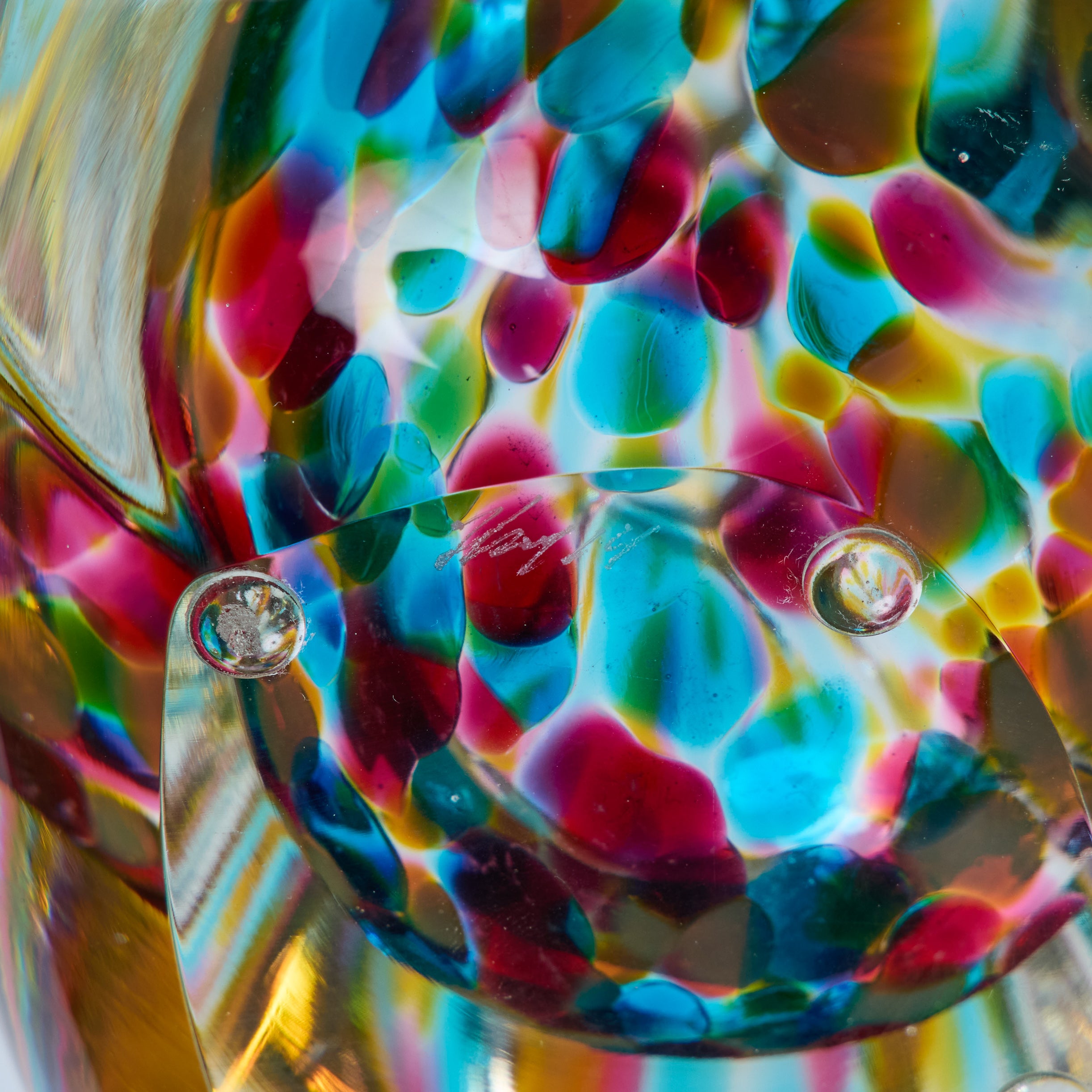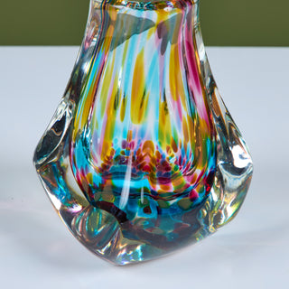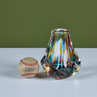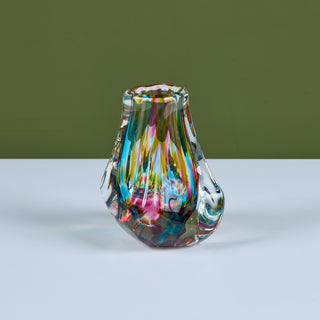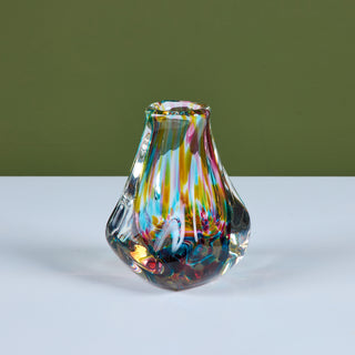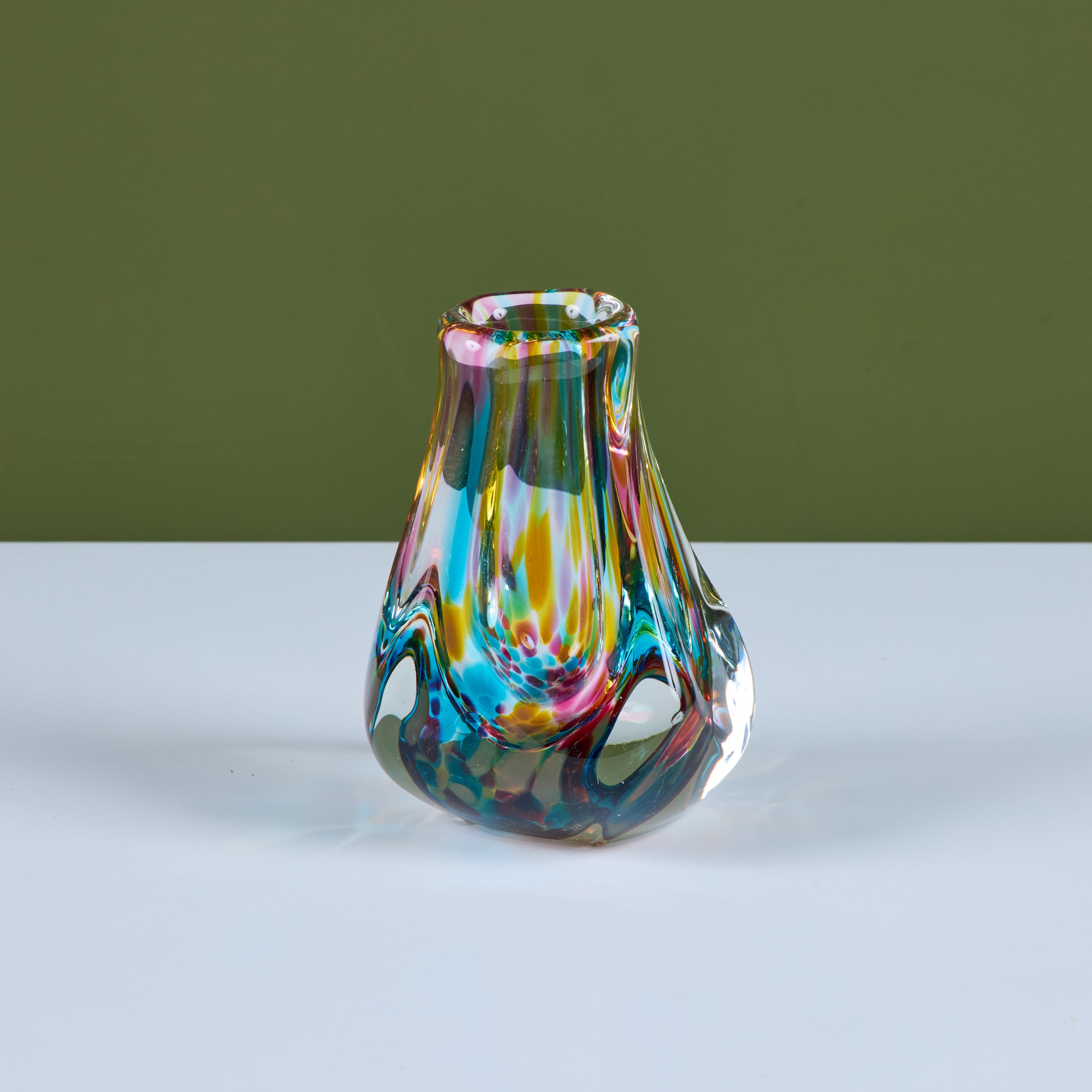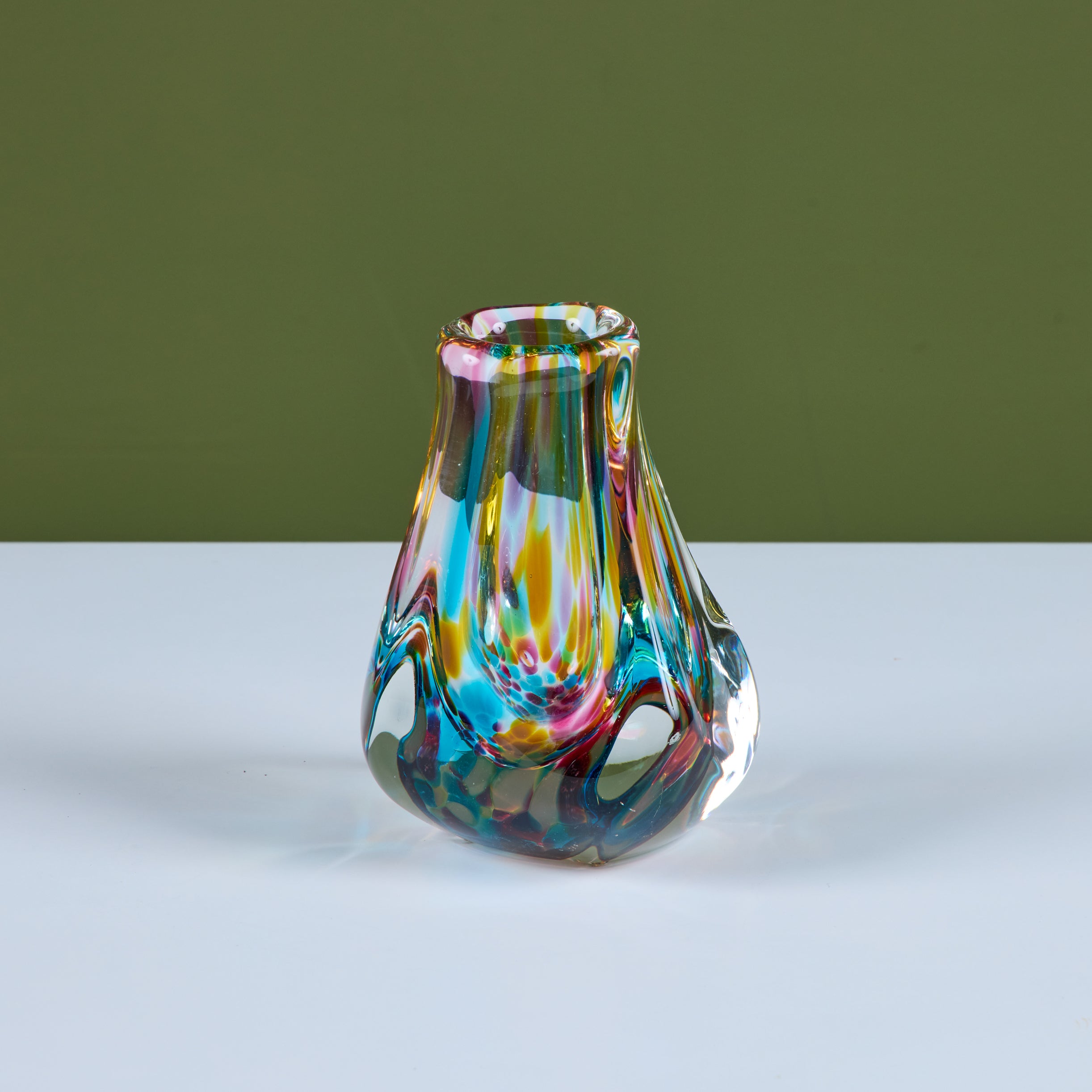 Free form glass vase by Paul Harrie, c.1980s, USA. This thick glass vase is part of Harrie's River Series showcasing varying colors at different angles. Signed by the artist.