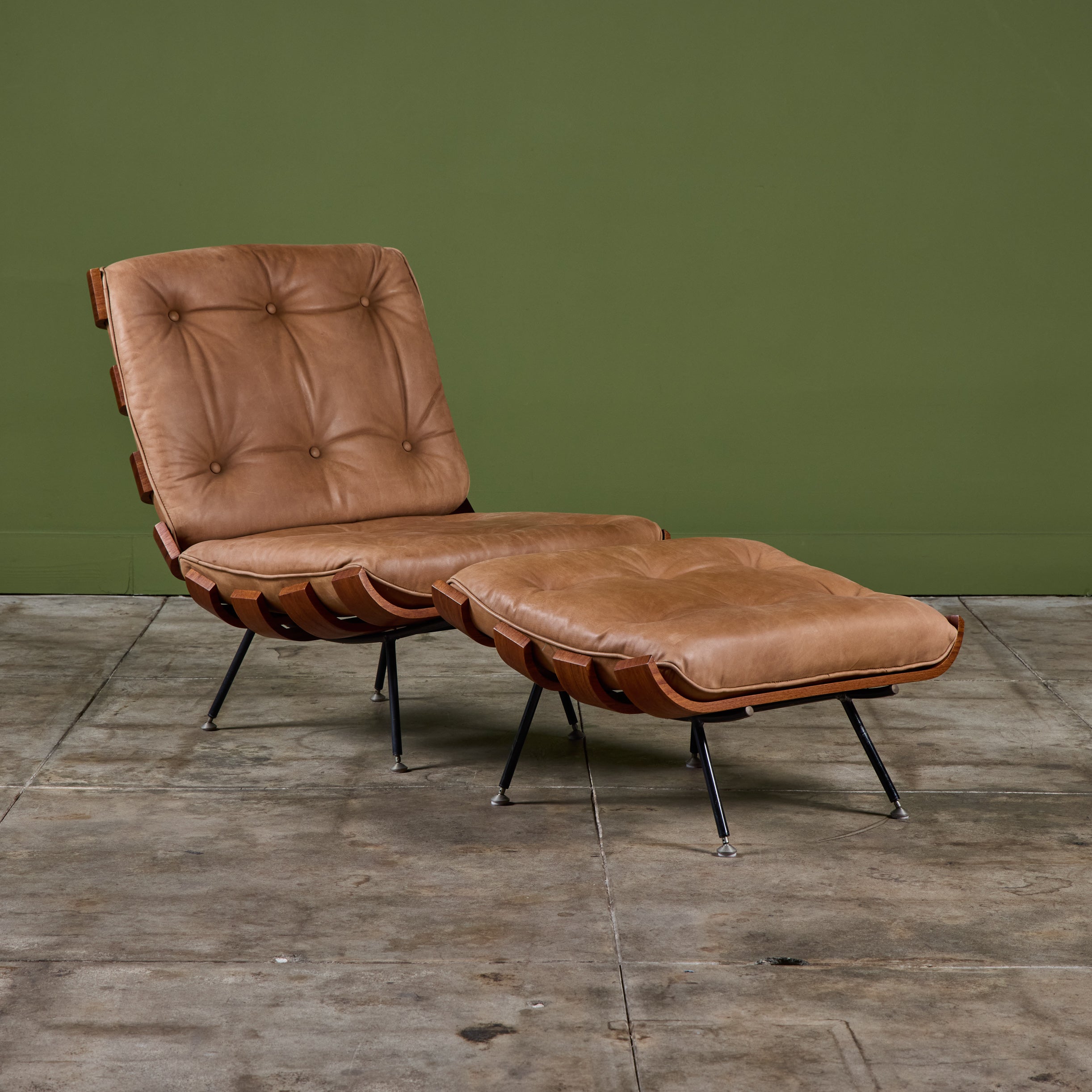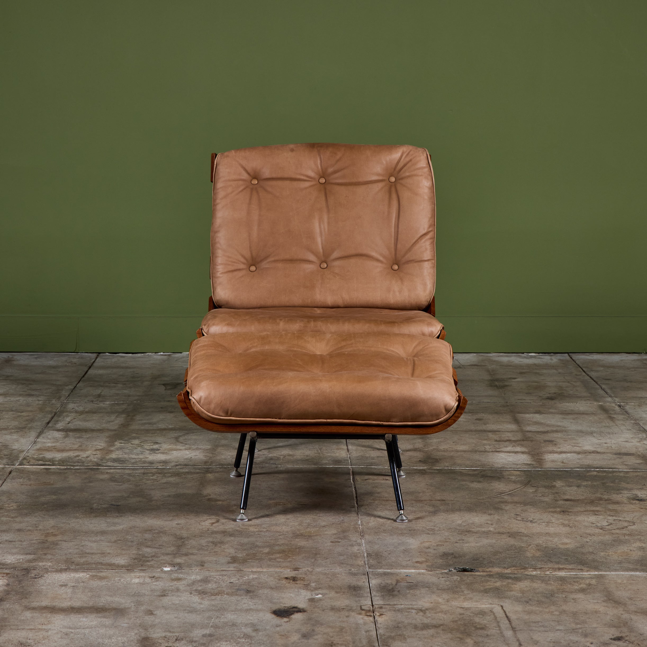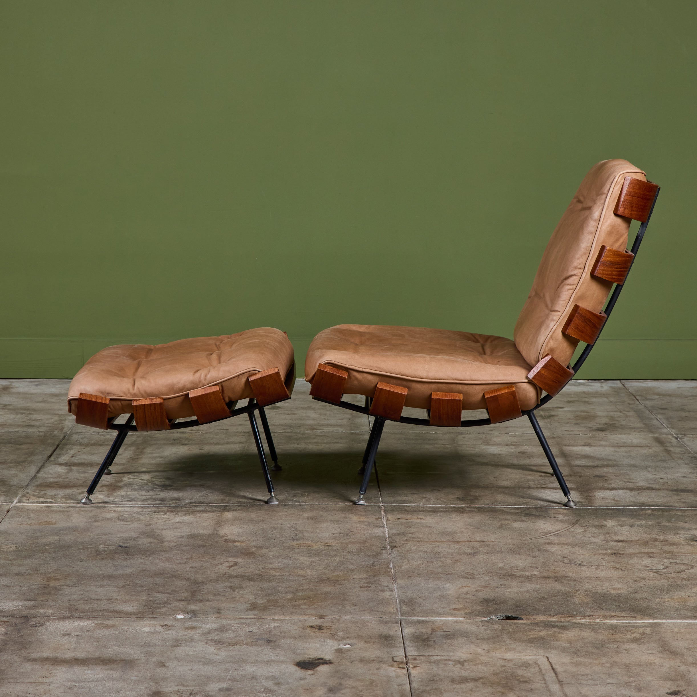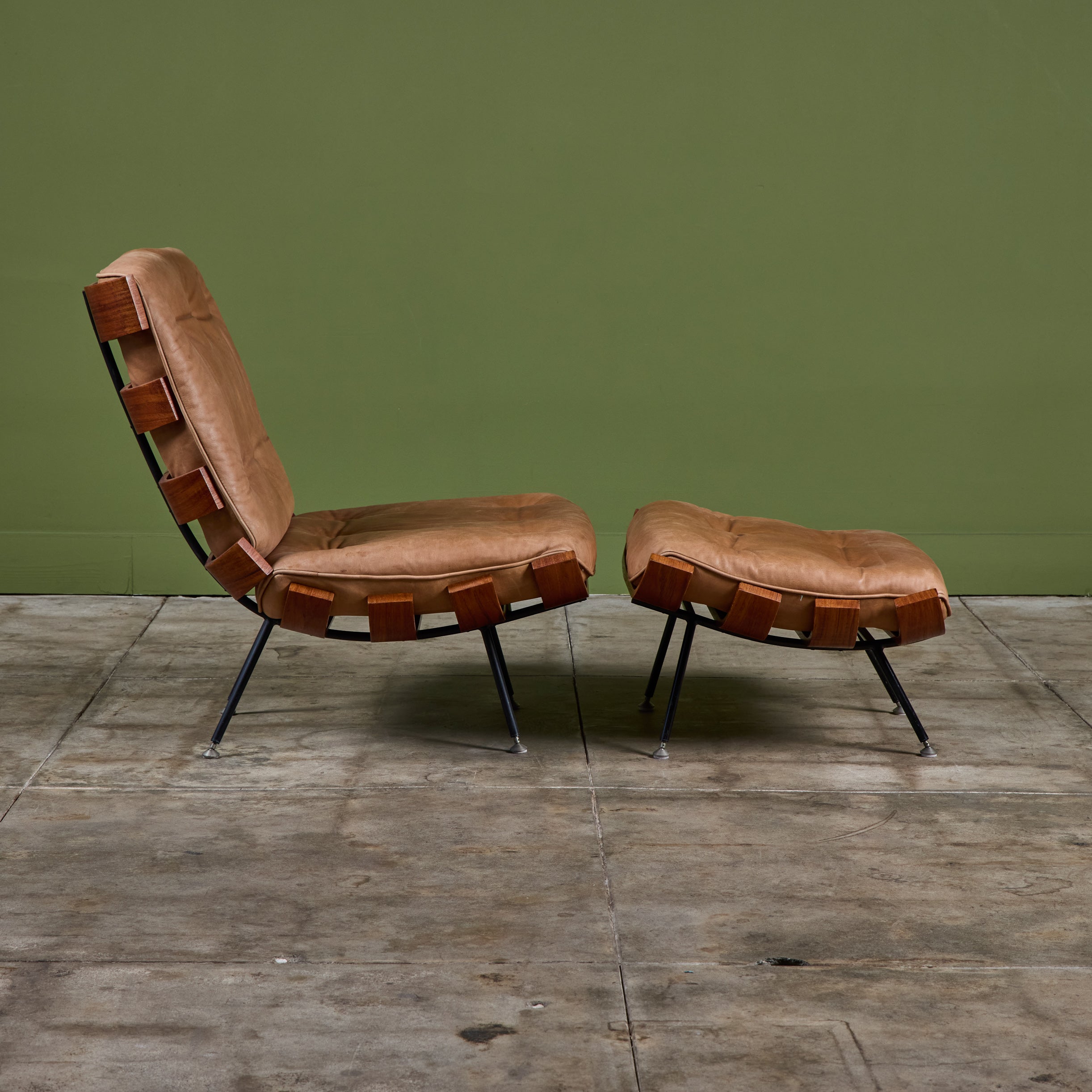 Leather lounge chair and ottoman by Martin Eisler & Carlo Hauner c.1960's, Brazil. The chair features a slat back design with natural colored leather tufted cushion and matching ottoman. Both pieces are supported by iron legs.