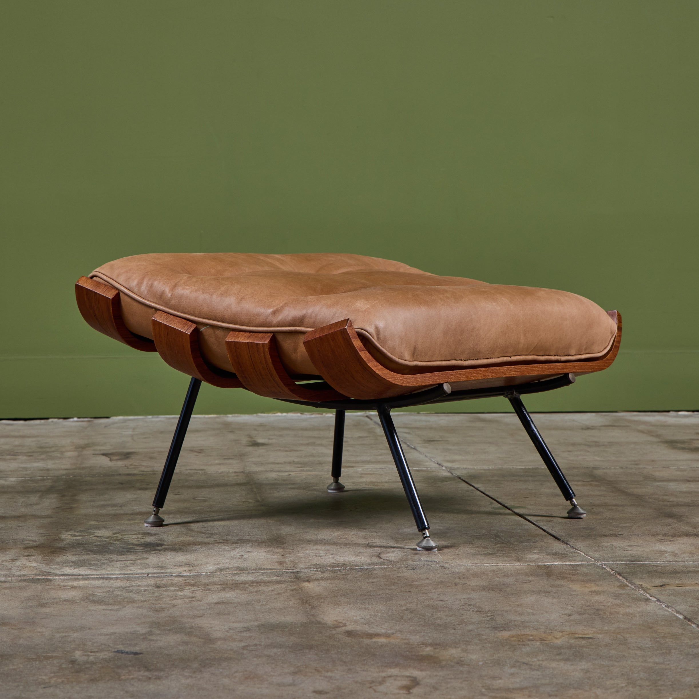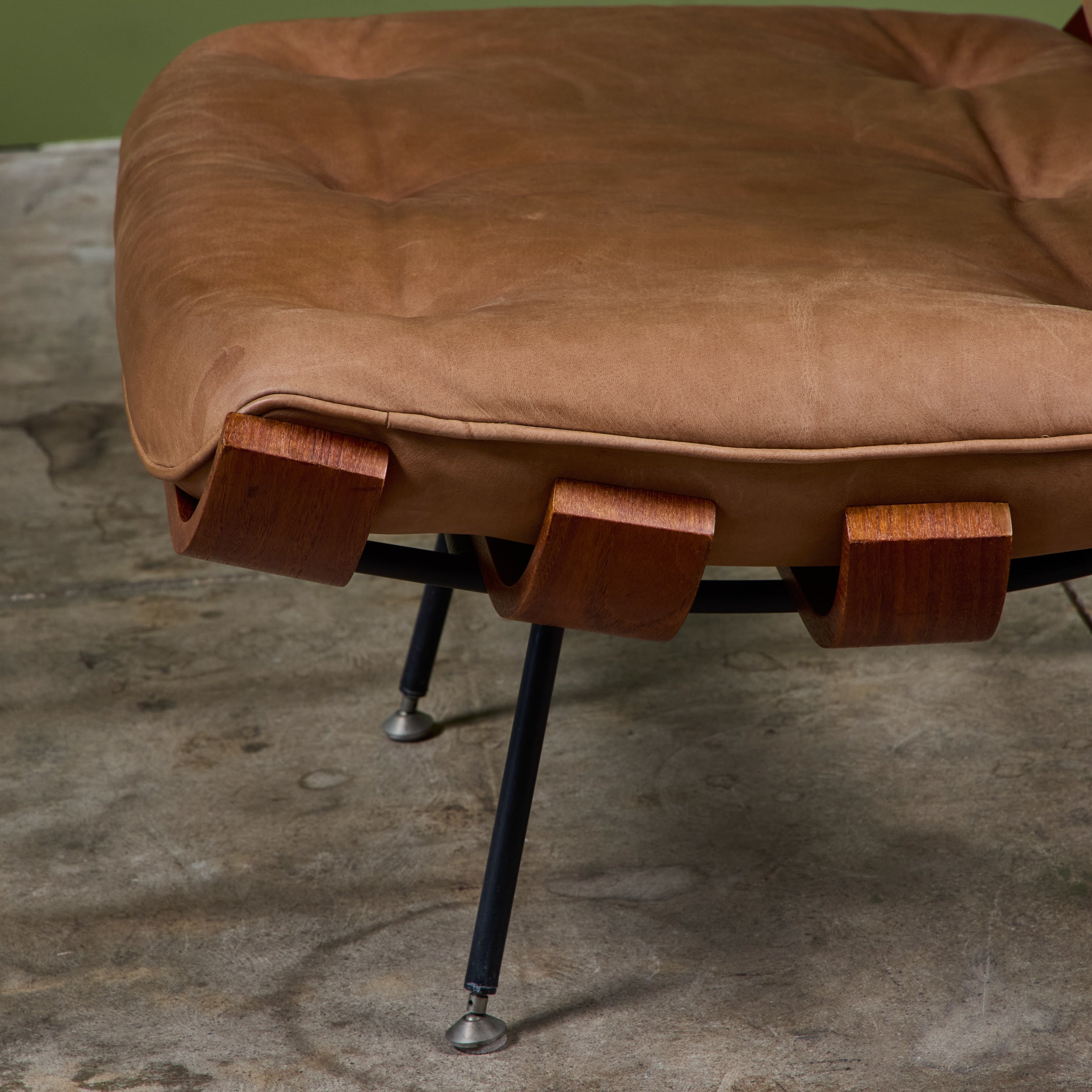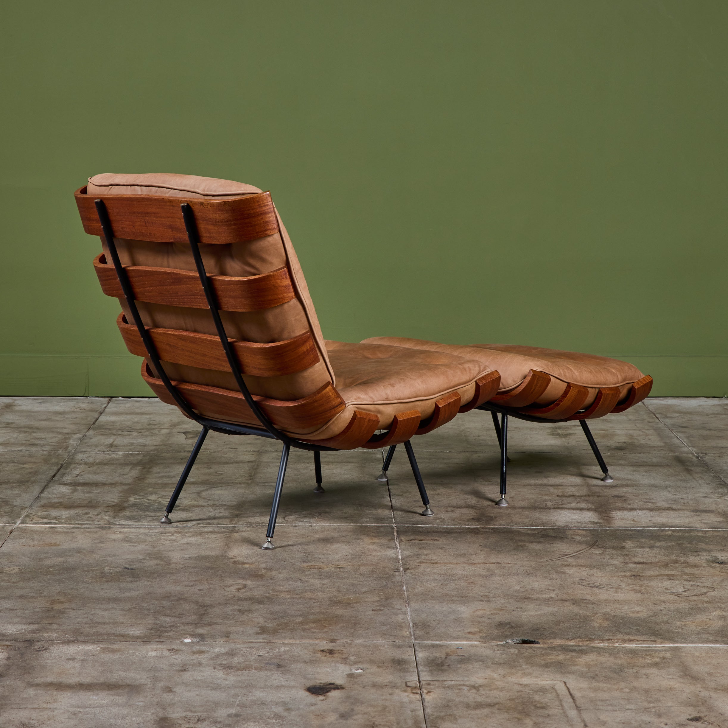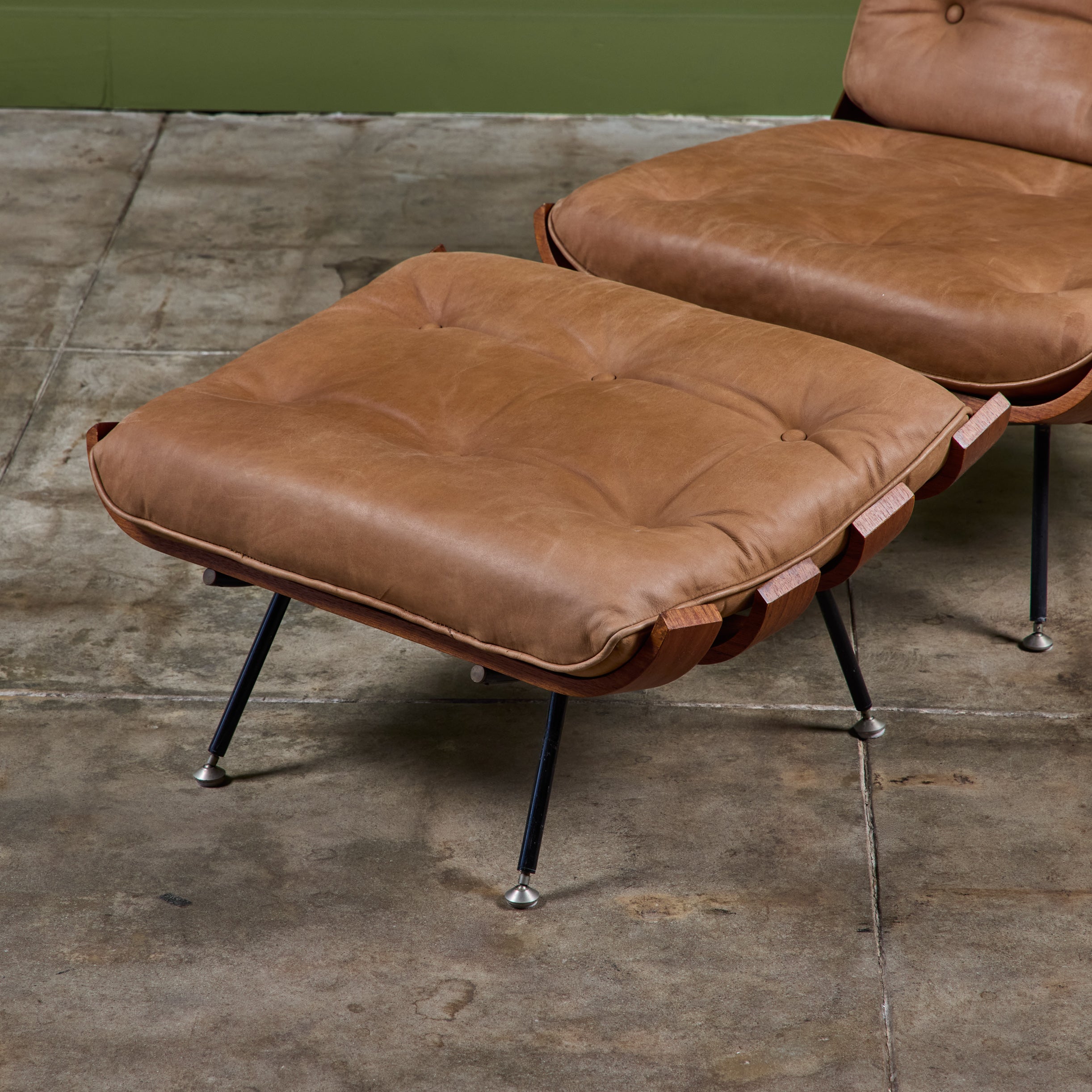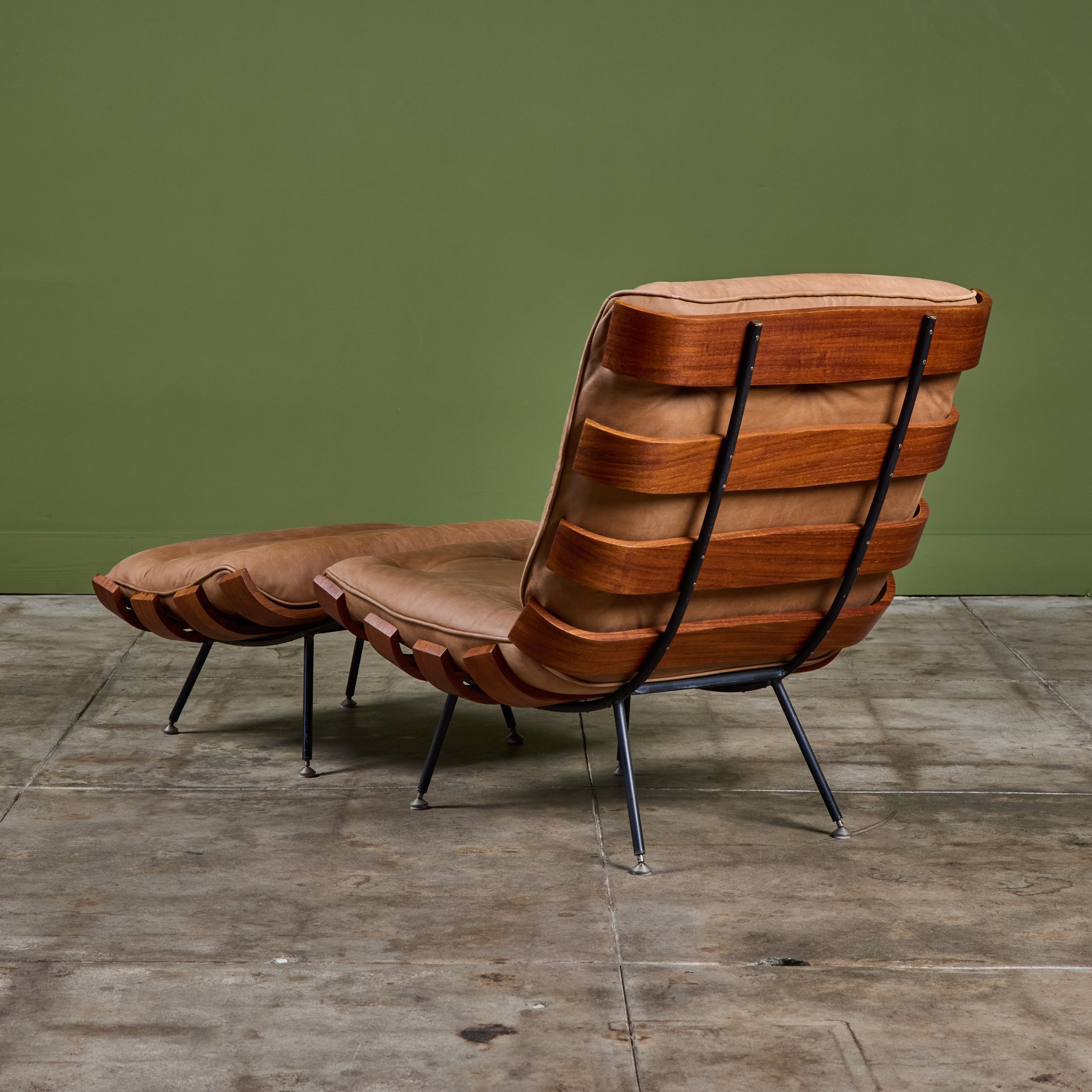 Leather lounge chair and ottoman by Martin Eisler & Carlo Hauner c.1960's, Brazil. The chair features a slat back design with natural colored leather tufted cushion and matching ottoman. Both pieces are supported by iron legs.