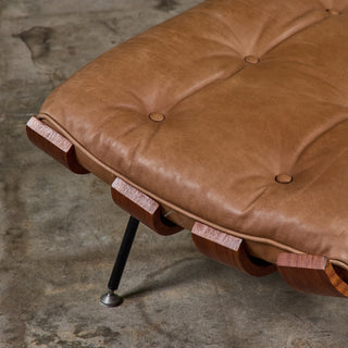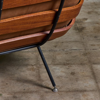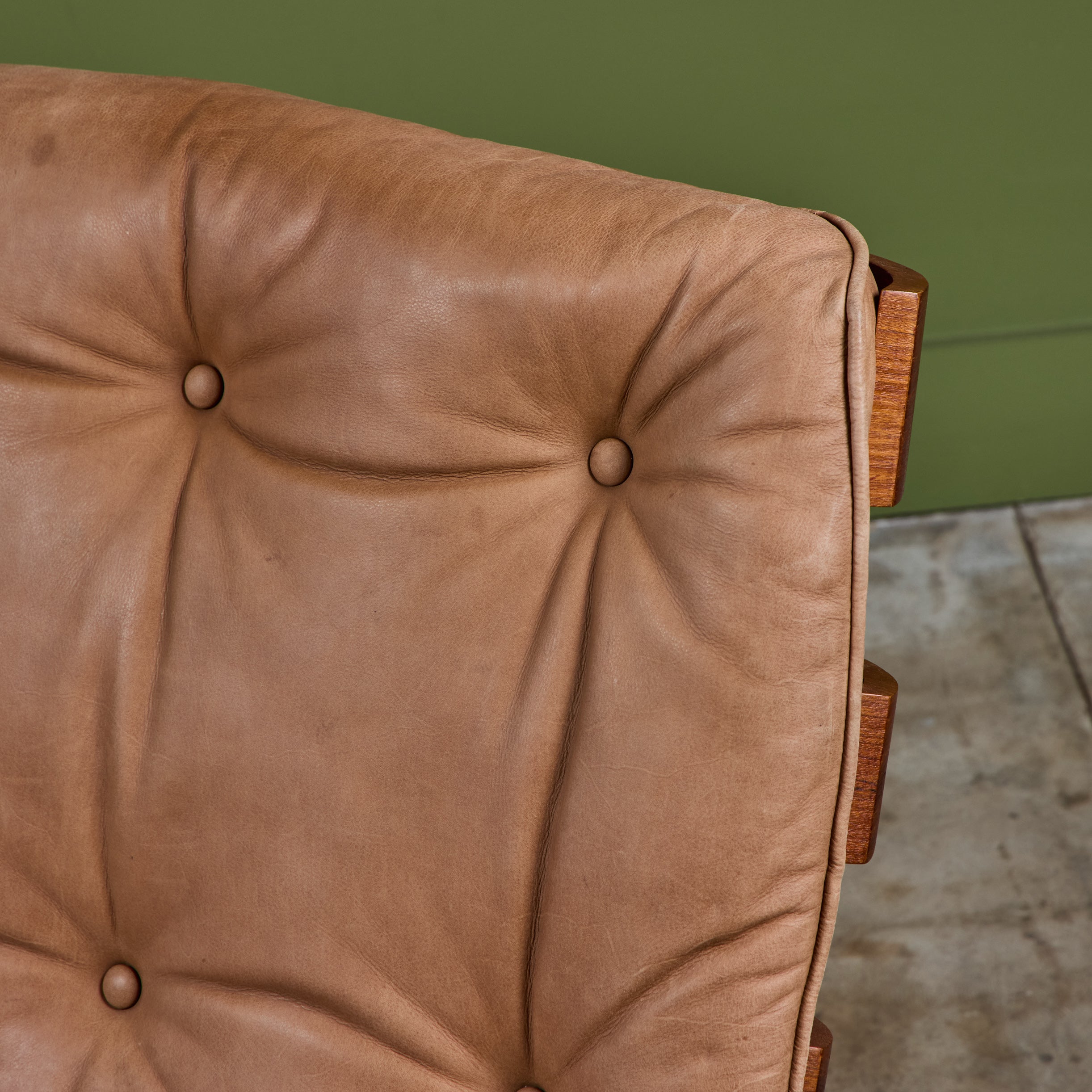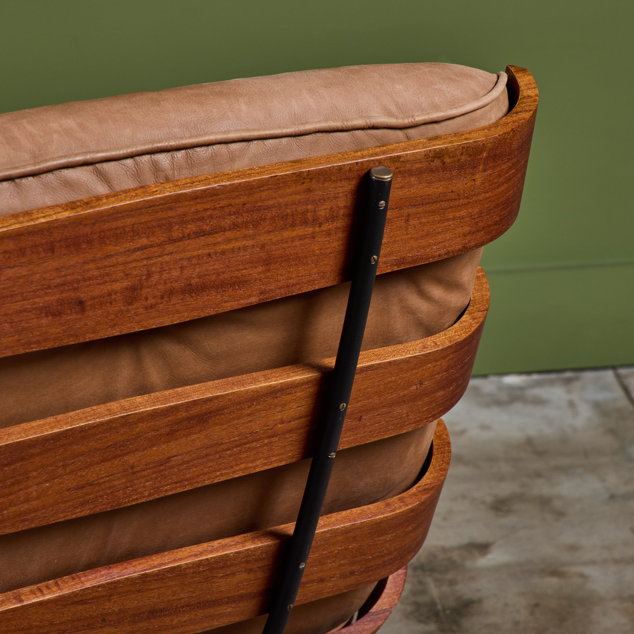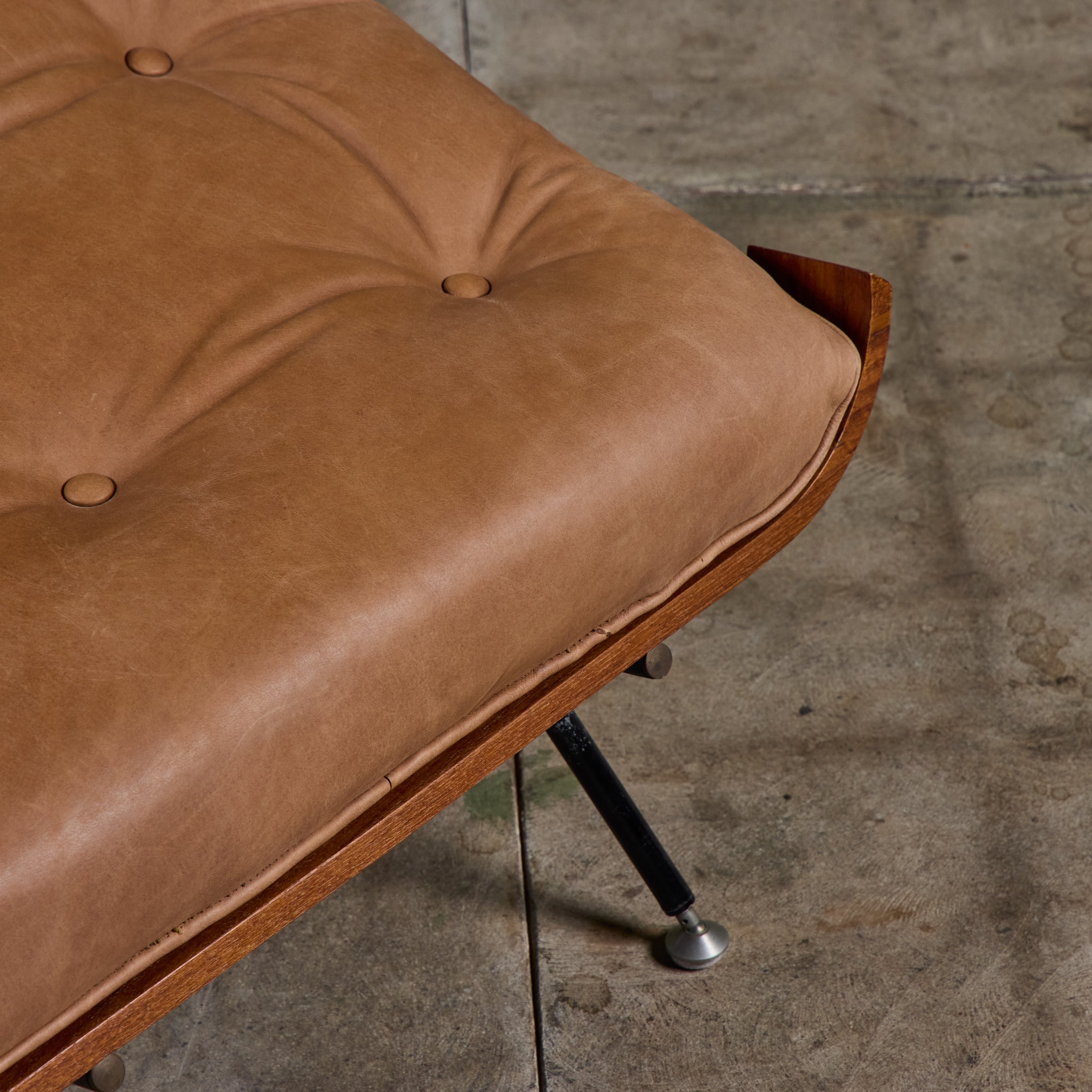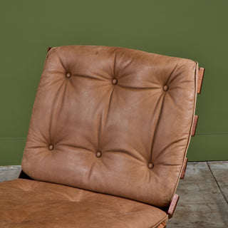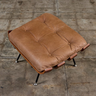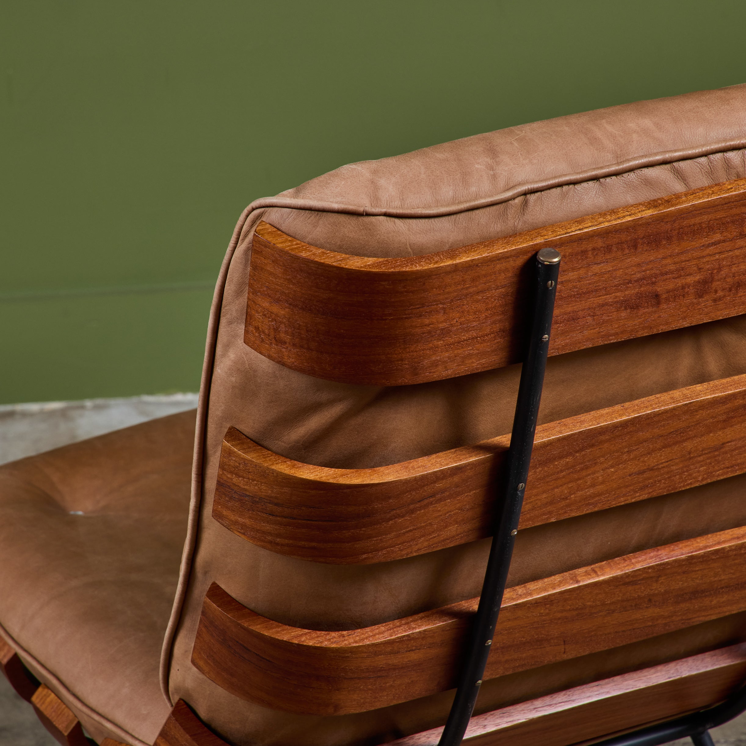 Leather lounge chair and ottoman by Martin Eisler & Carlo Hauner c.1960's, Brazil. The chair features a slat back design with natural colored leather tufted cushion and matching ottoman. Both pieces are supported by iron legs.