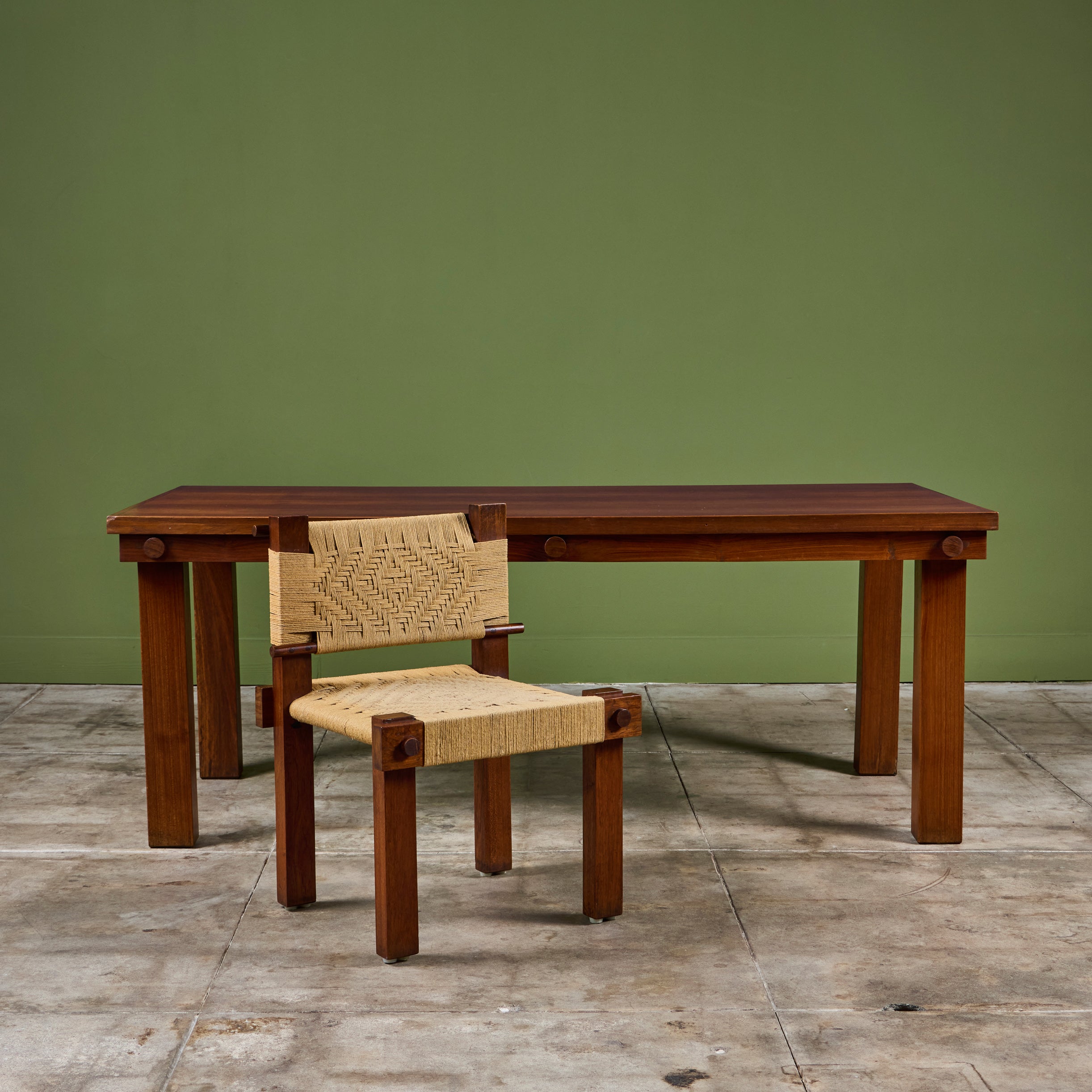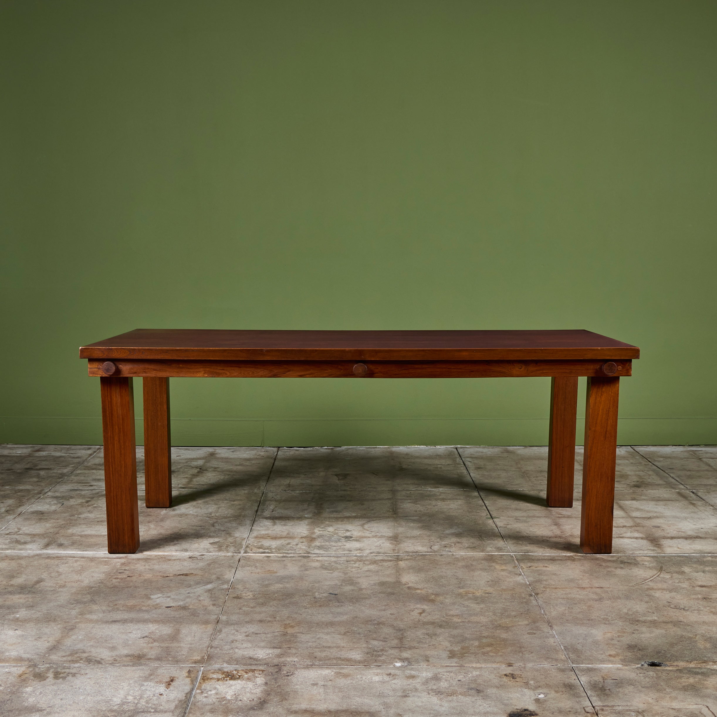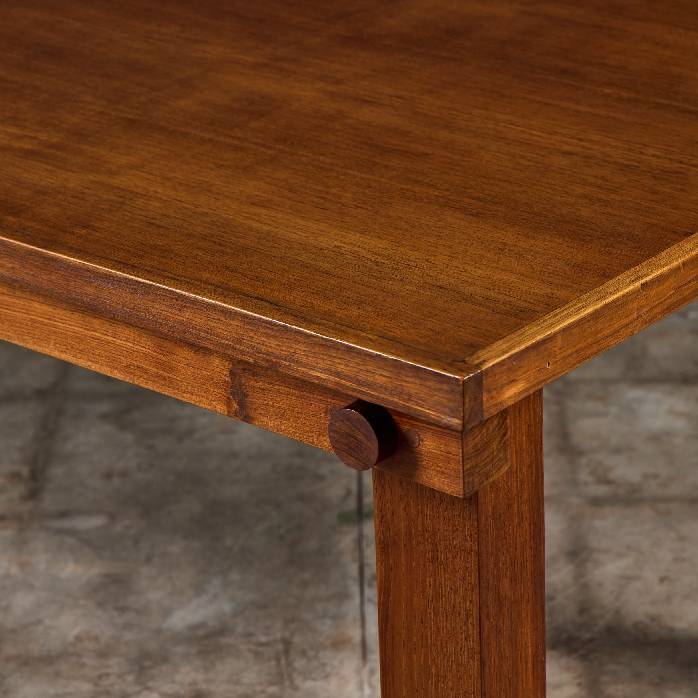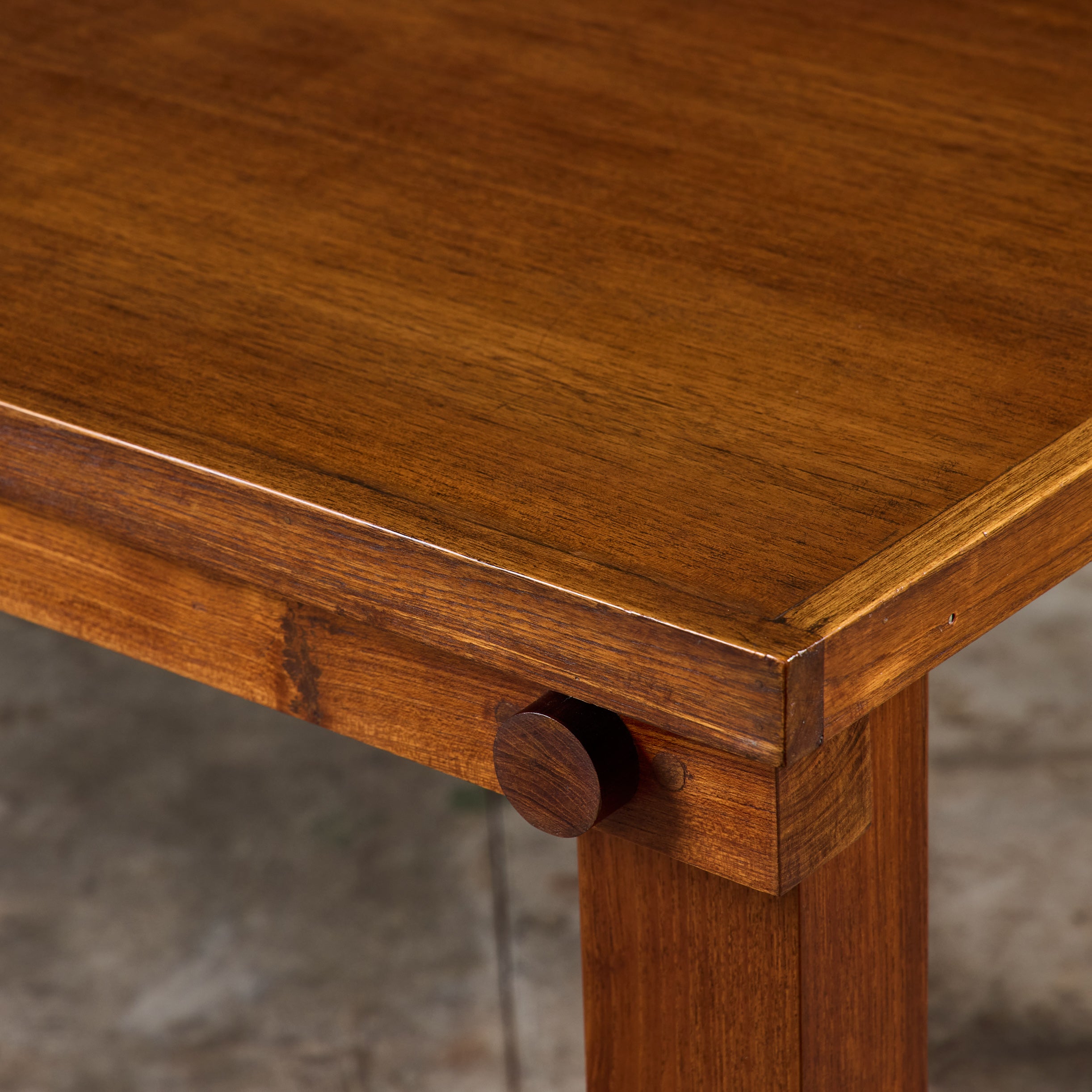 Rectangular teak dining table designed by Mini Boga for Taaru, c.1960s, India. This table features four block legs with dowel joinery, a simplistic design. Pairs beautifully with the Mini Boga woven chairs.