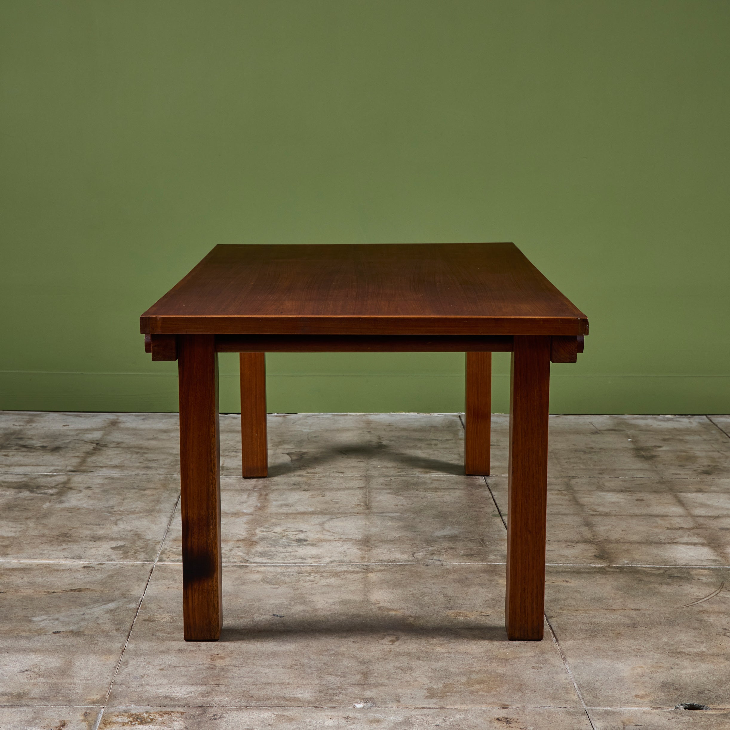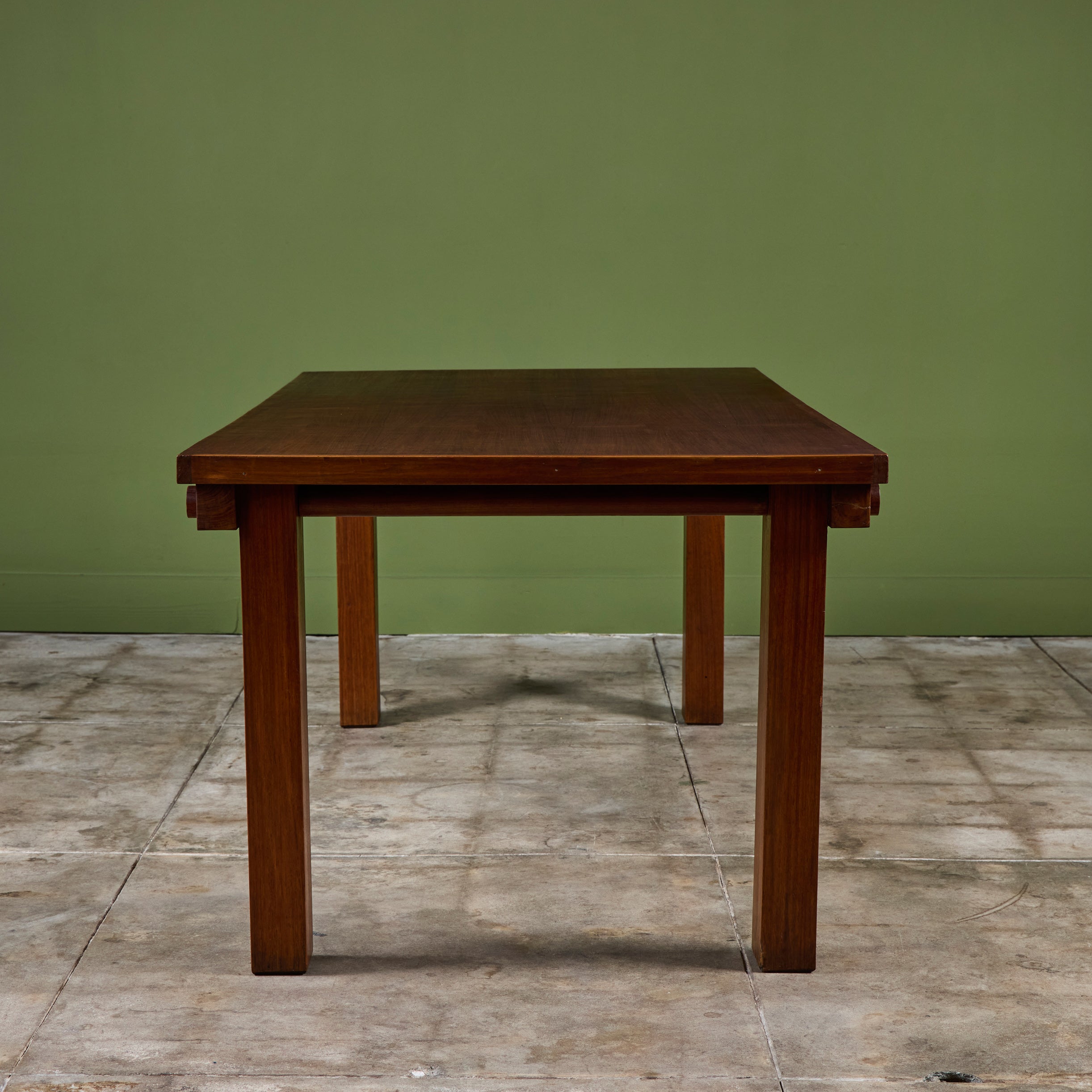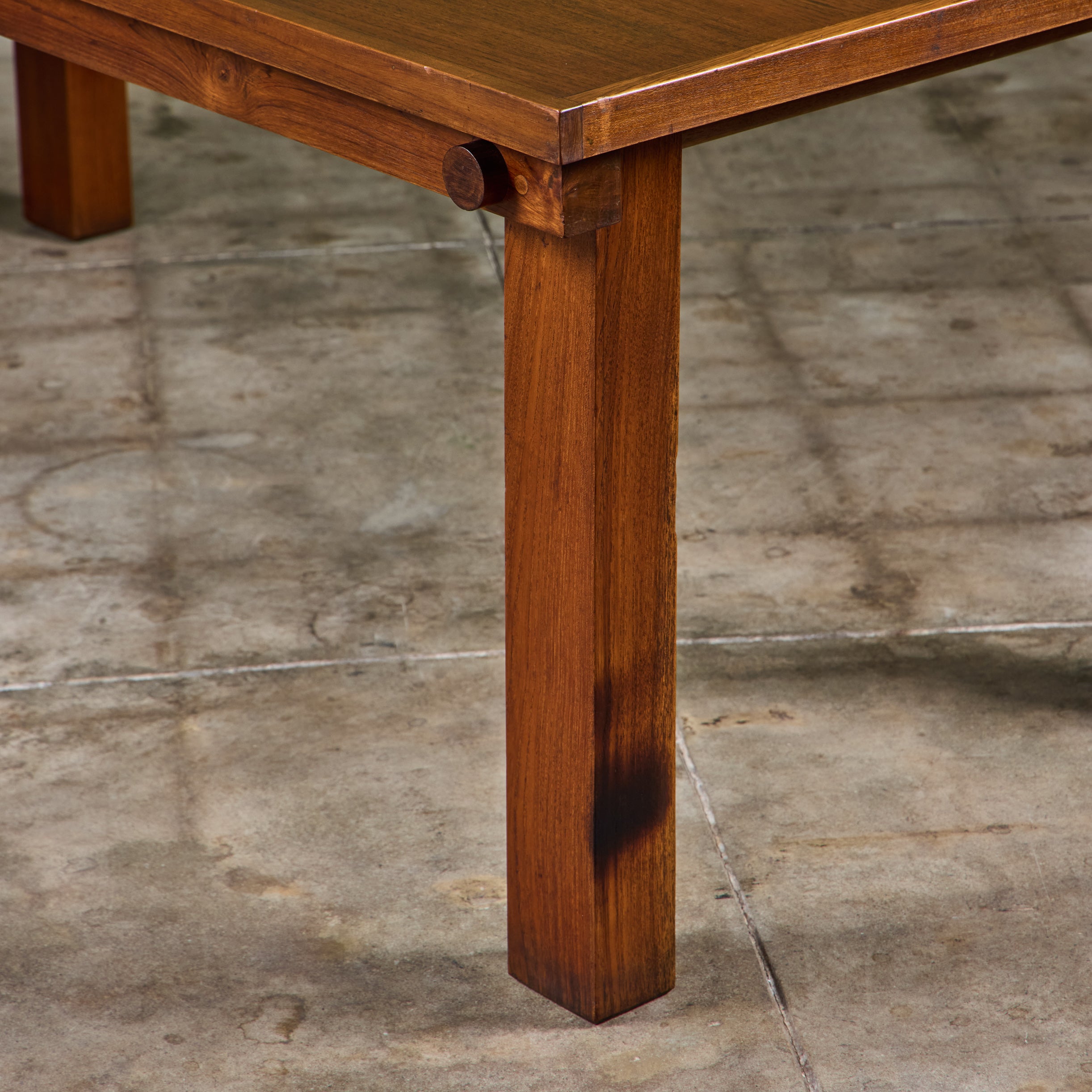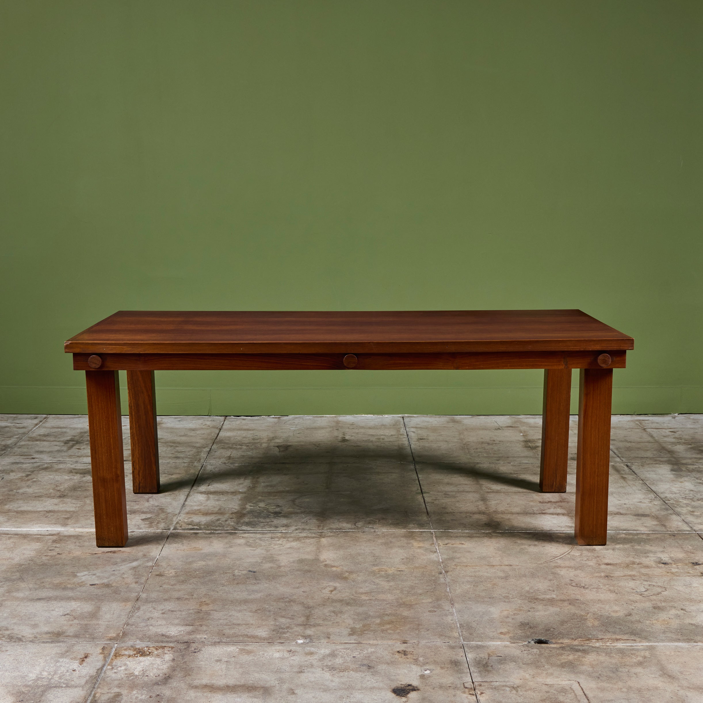 Rectangular teak dining table designed by Mini Boga for Taaru, c.1960s, India. This table features four block legs with dowel joinery, a simplistic design. Pairs beautifully with the Mini Boga woven chairs.