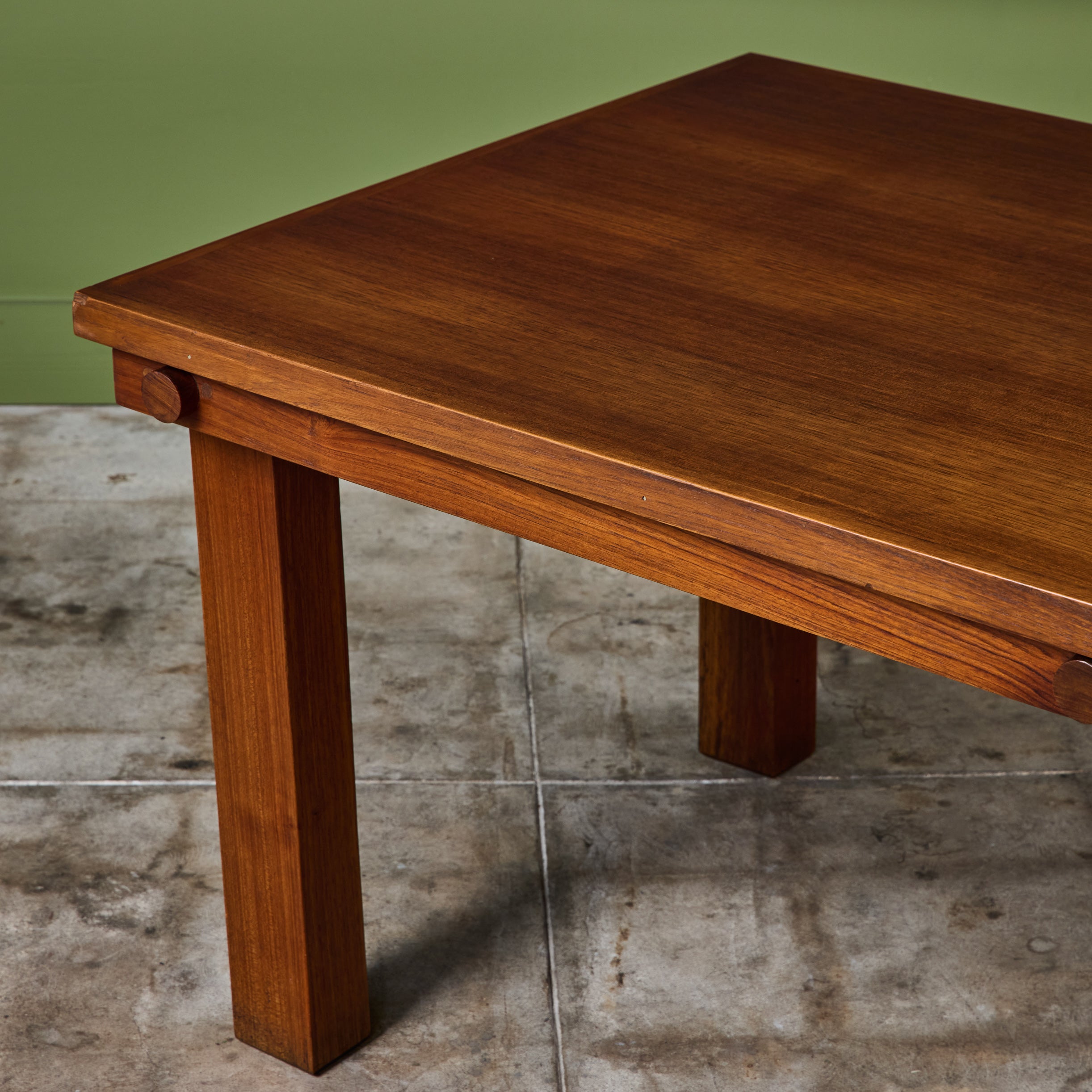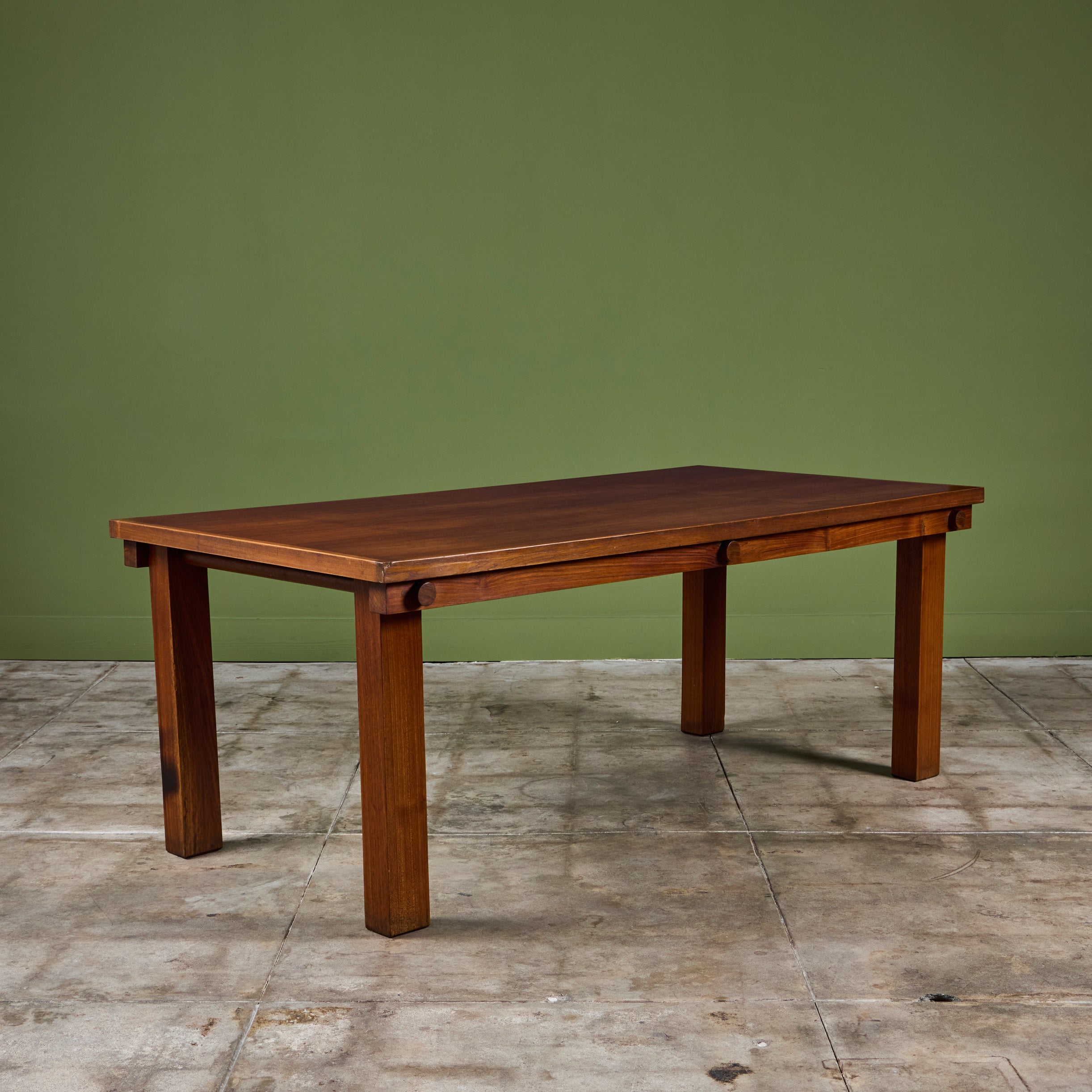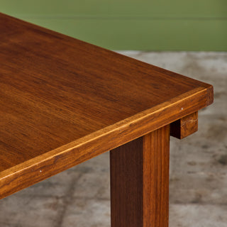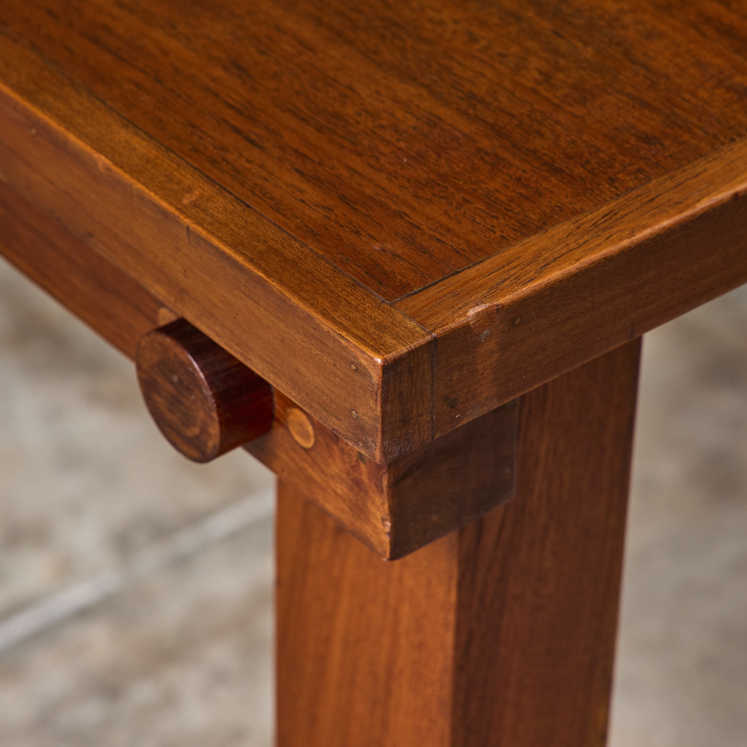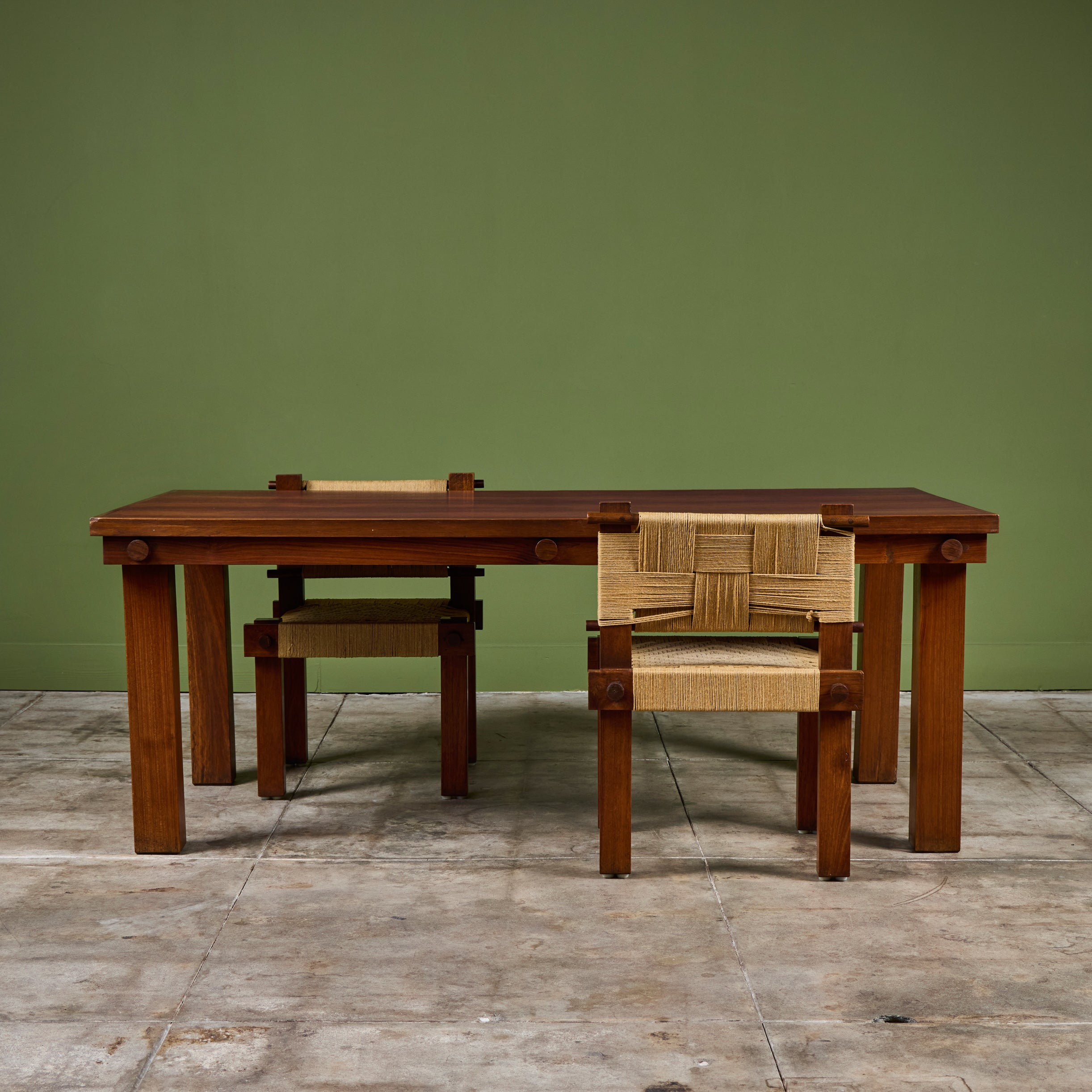 Rectangular teak dining table designed by Mini Boga for Taaru, c.1960s, India. This table features four block legs with dowel joinery, a simplistic design. Pairs beautifully with the Mini Boga woven chairs.