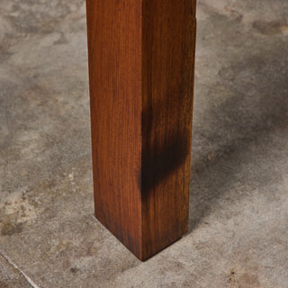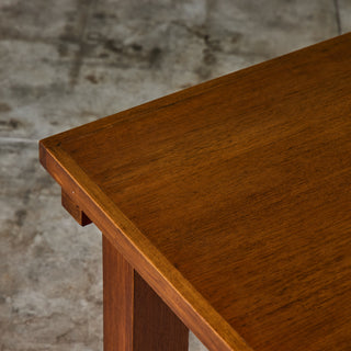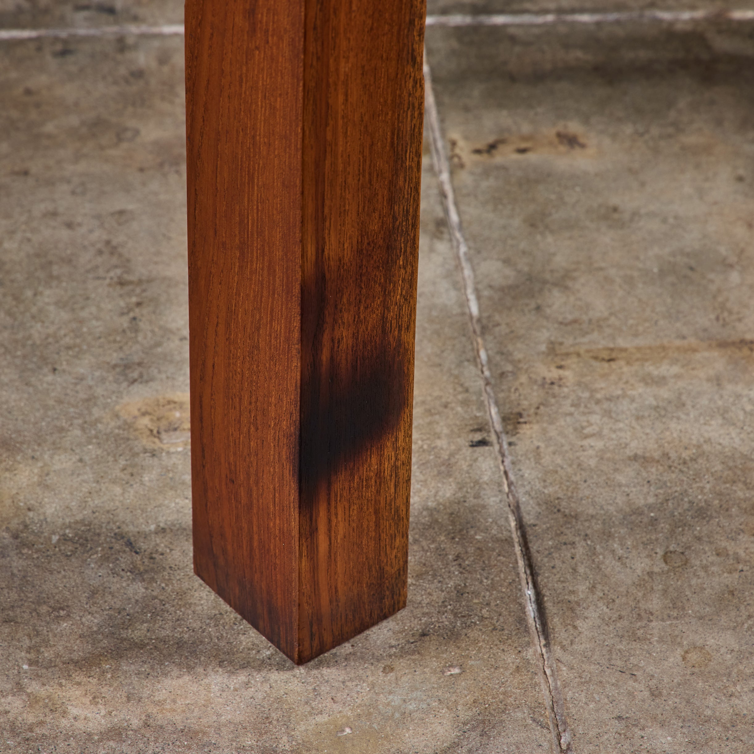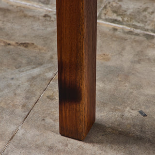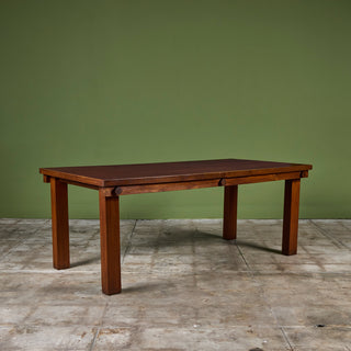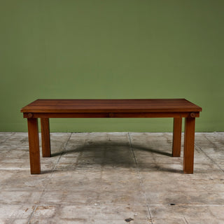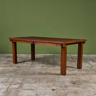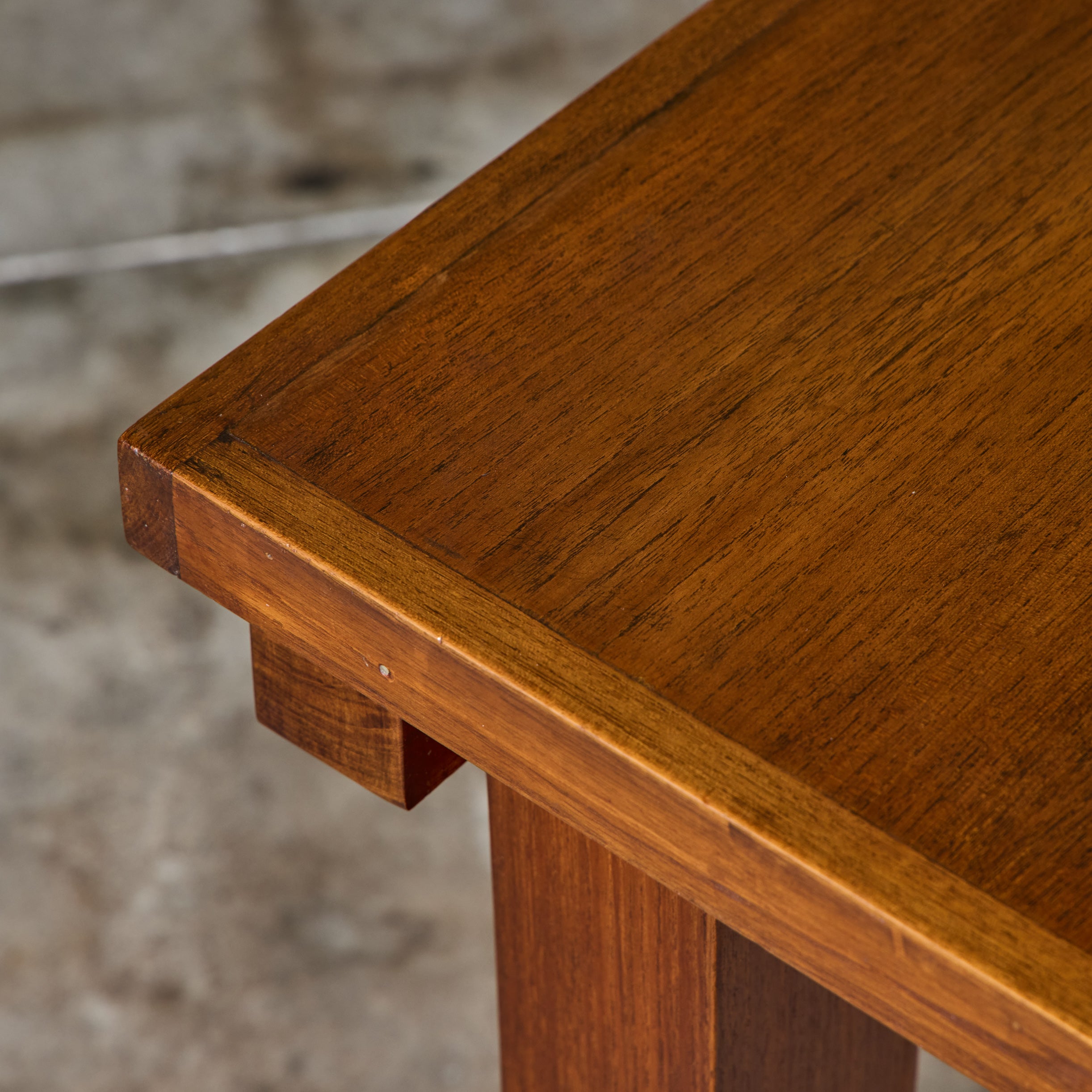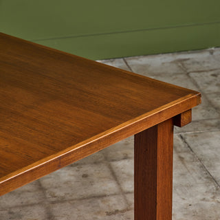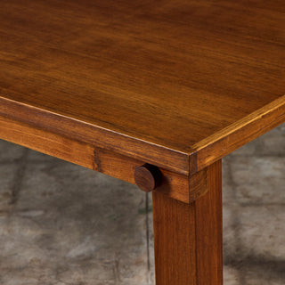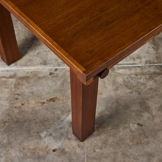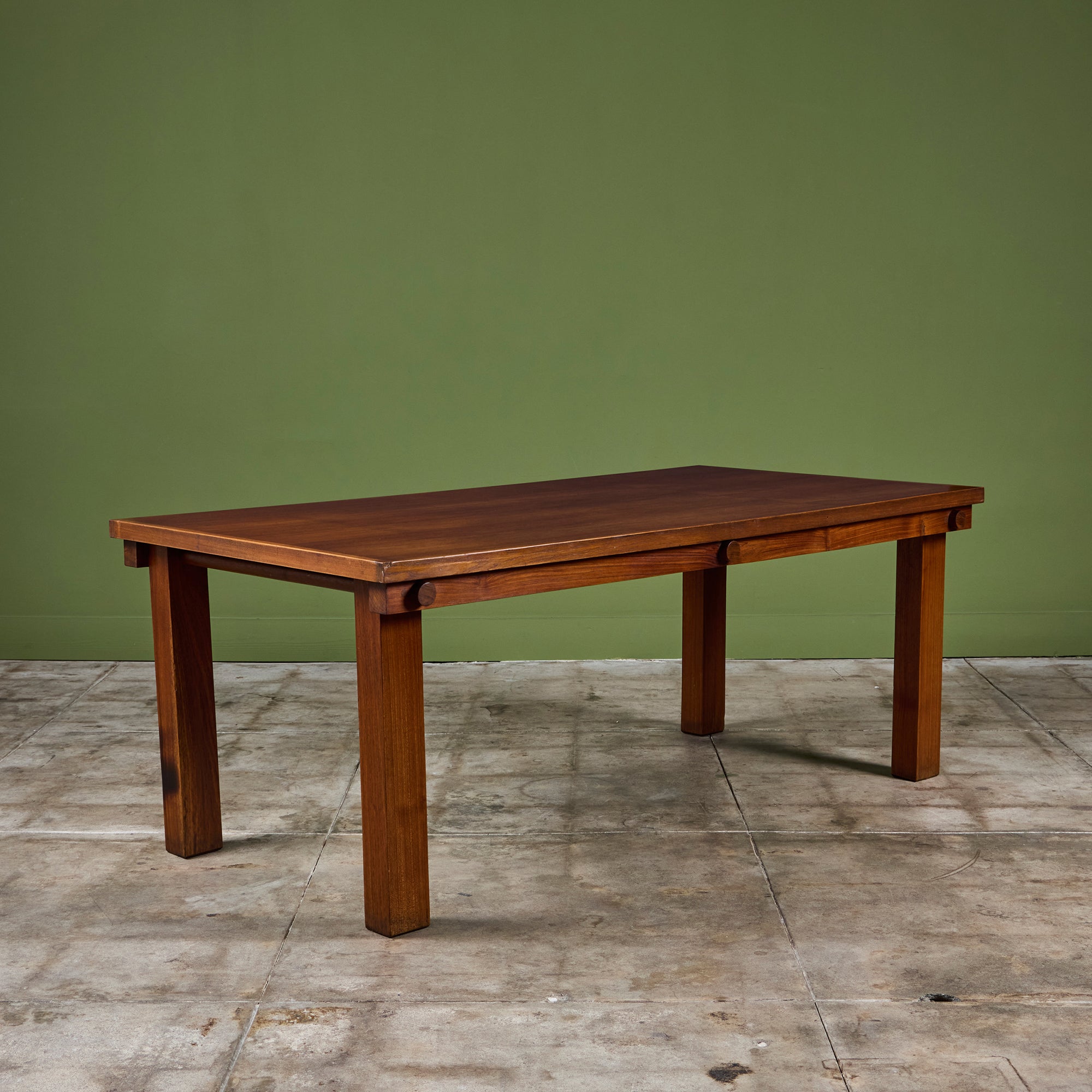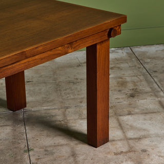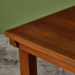 Rectangular teak dining table designed by Mini Boga for Taaru, c.1960s, India. This table features four block legs with dowel joinery, a simplistic design. Pairs beautifully with the Mini Boga woven chairs.