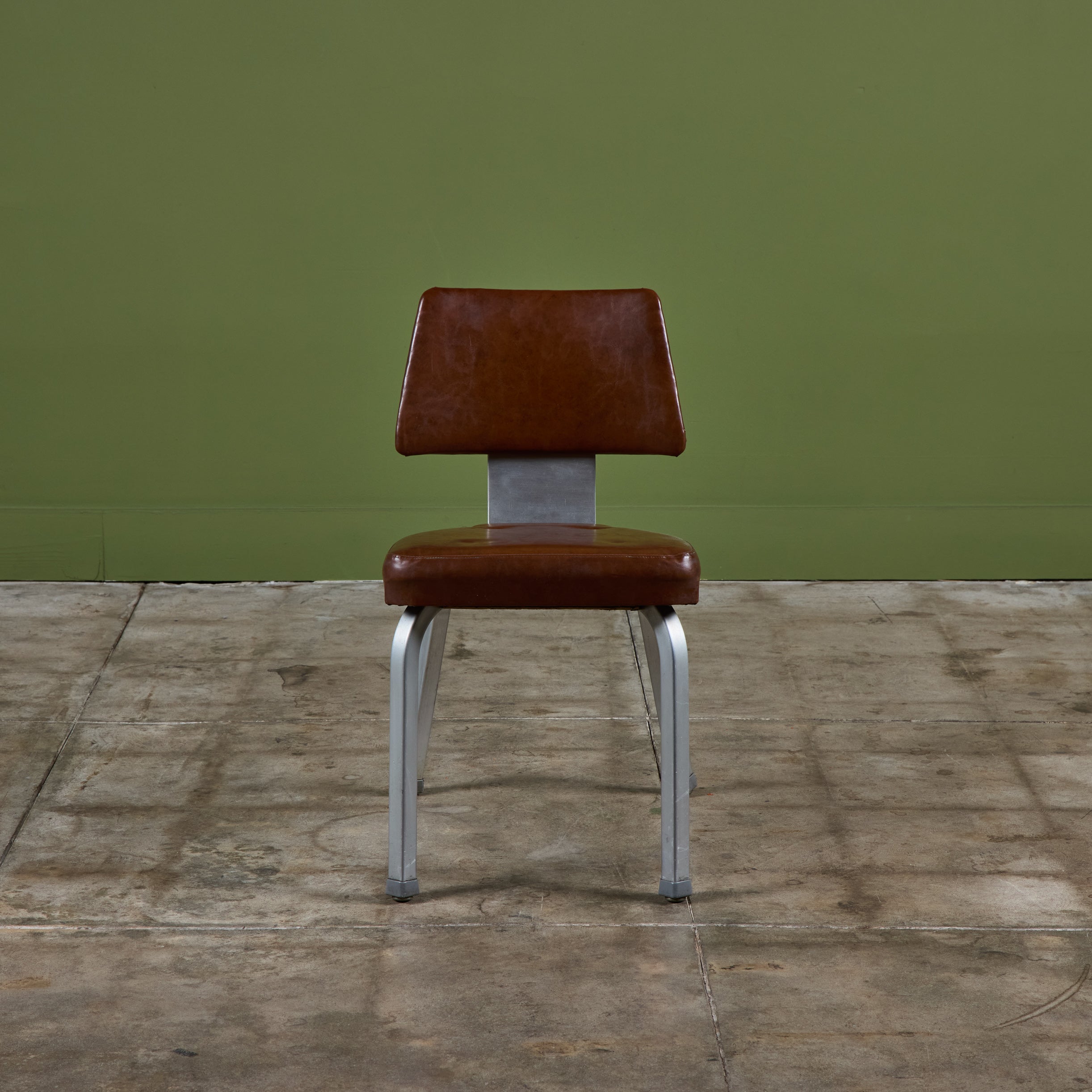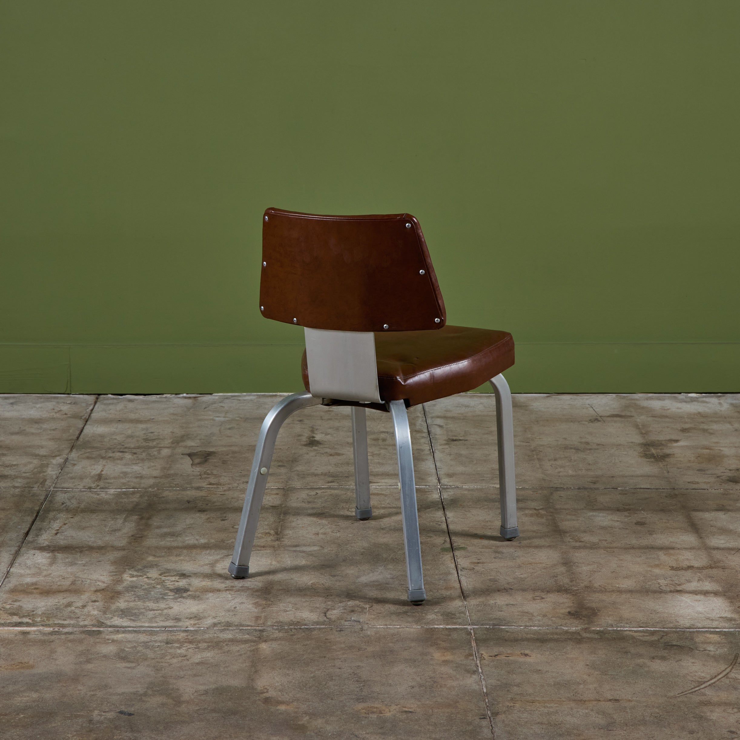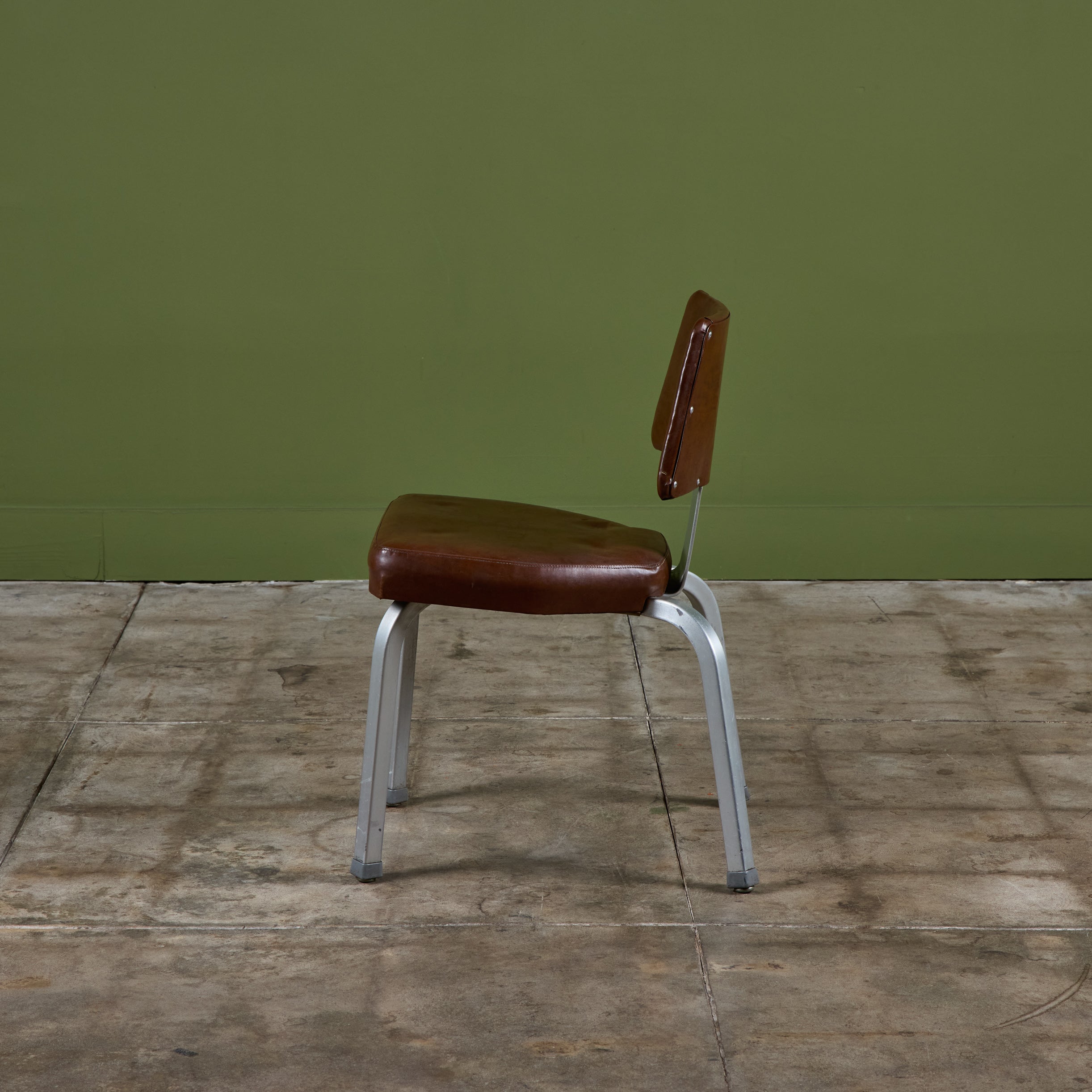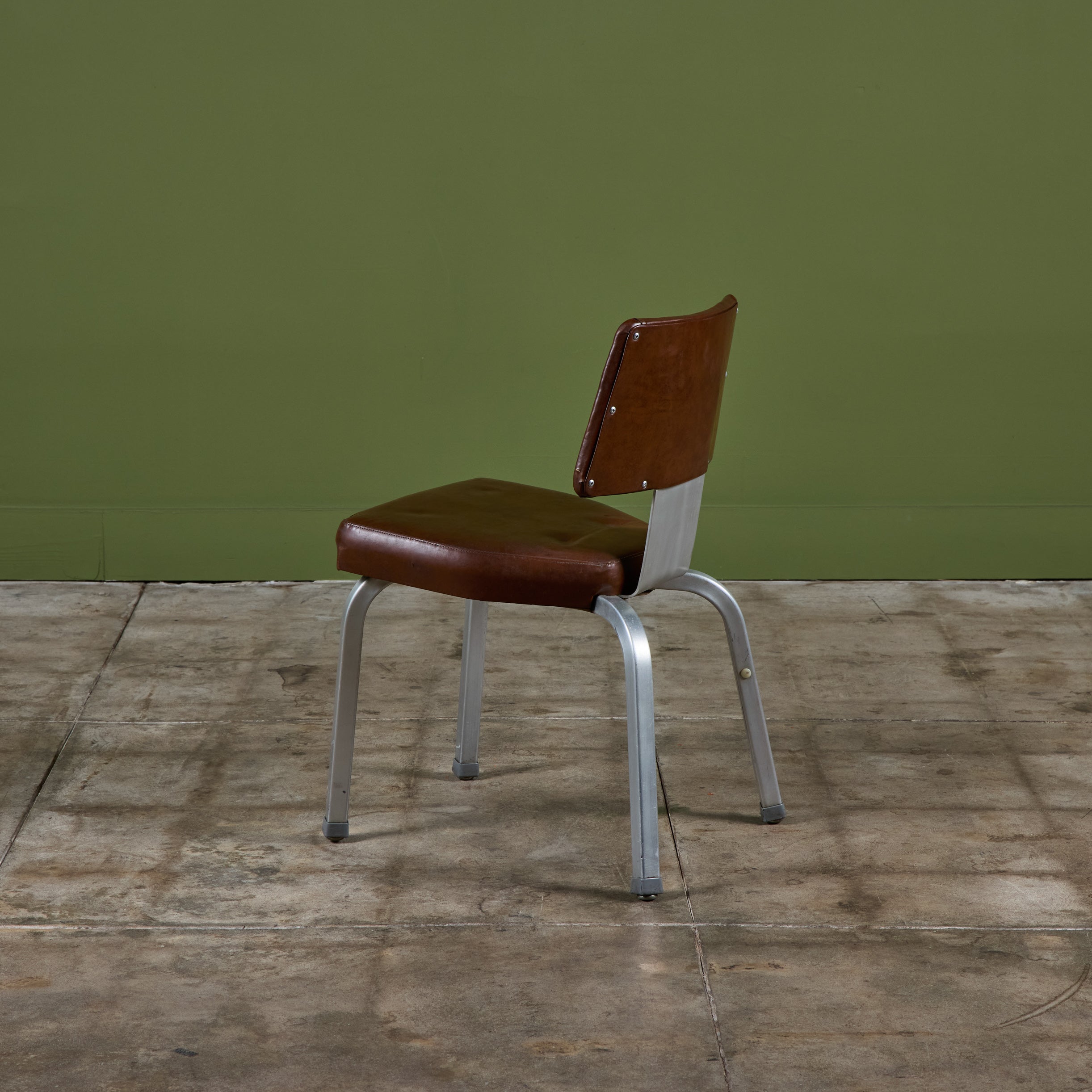 1930's art deco folding chair by Warren McArthur. The chair features a tubular aluminum frame with green fabric upholstered seat and seat back. The armrests are wrapped in a green naugahyde. Each seat back features a fun ashtray, a reminder of the time in which they first lived.