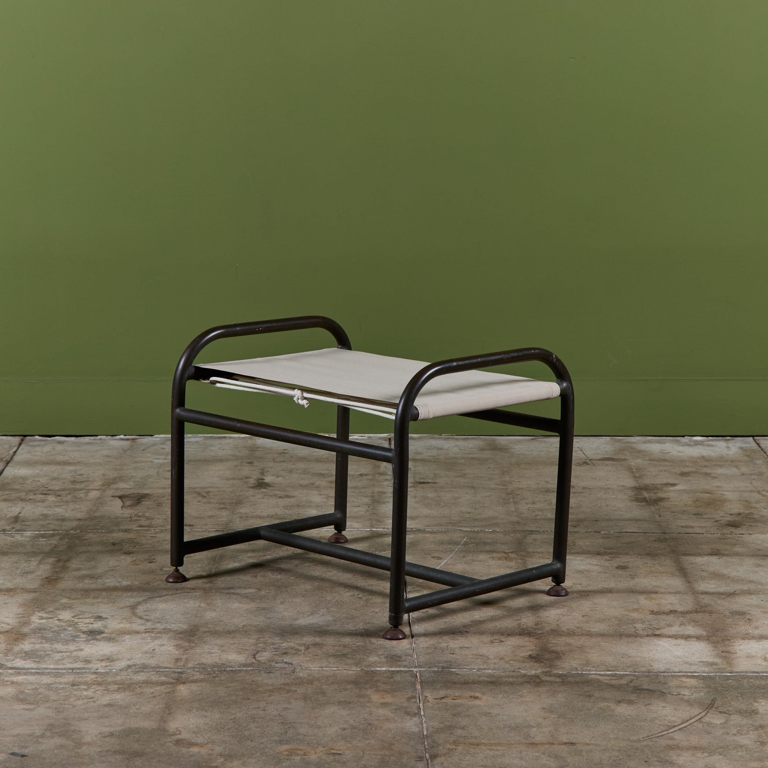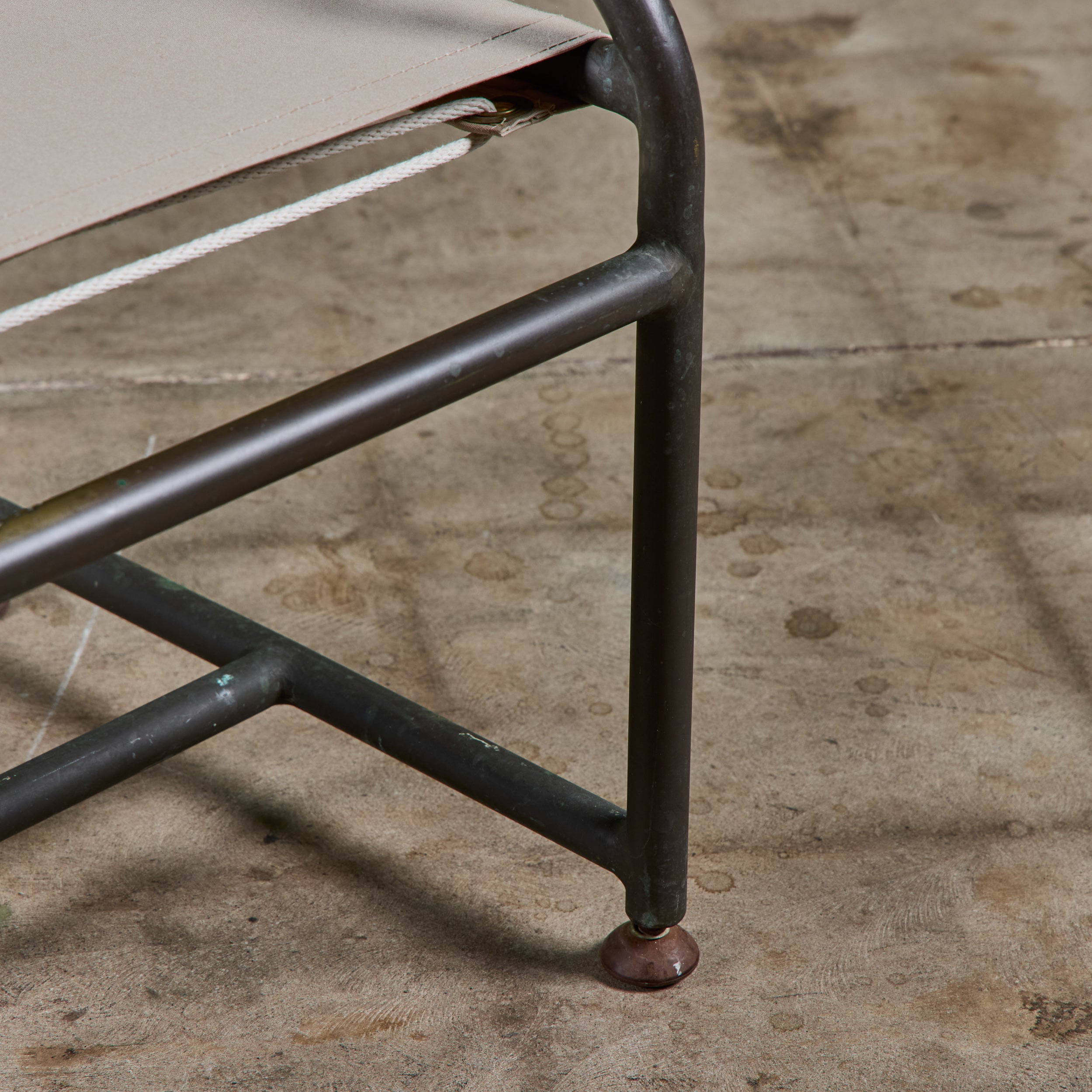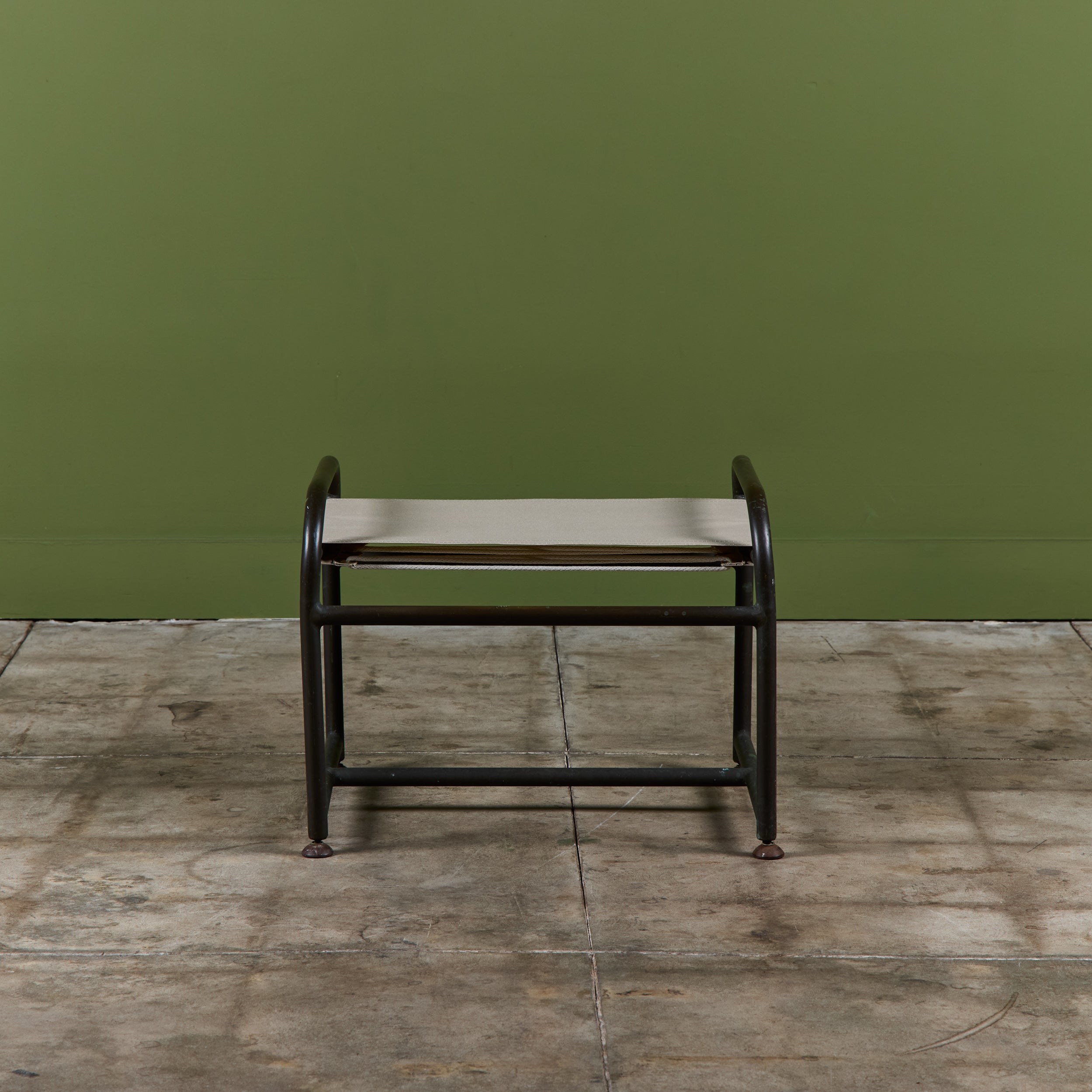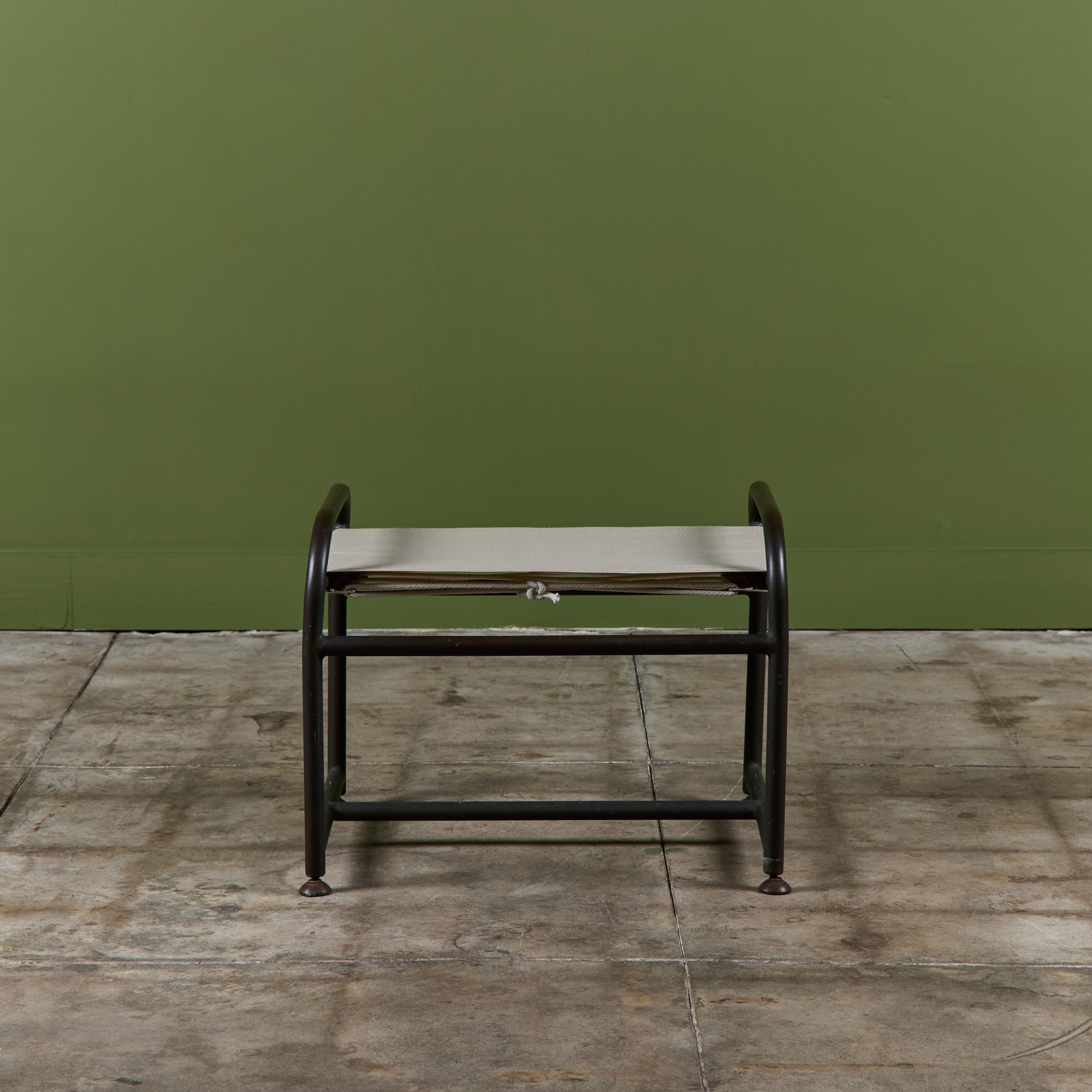 The late 1940s or early 1950s Walter Lamb ottoman predating his partnership with Brown Jordan. The ottoman has a frame in thick tubular bronze and canvas seat laced tightly to the frame with sailcord.