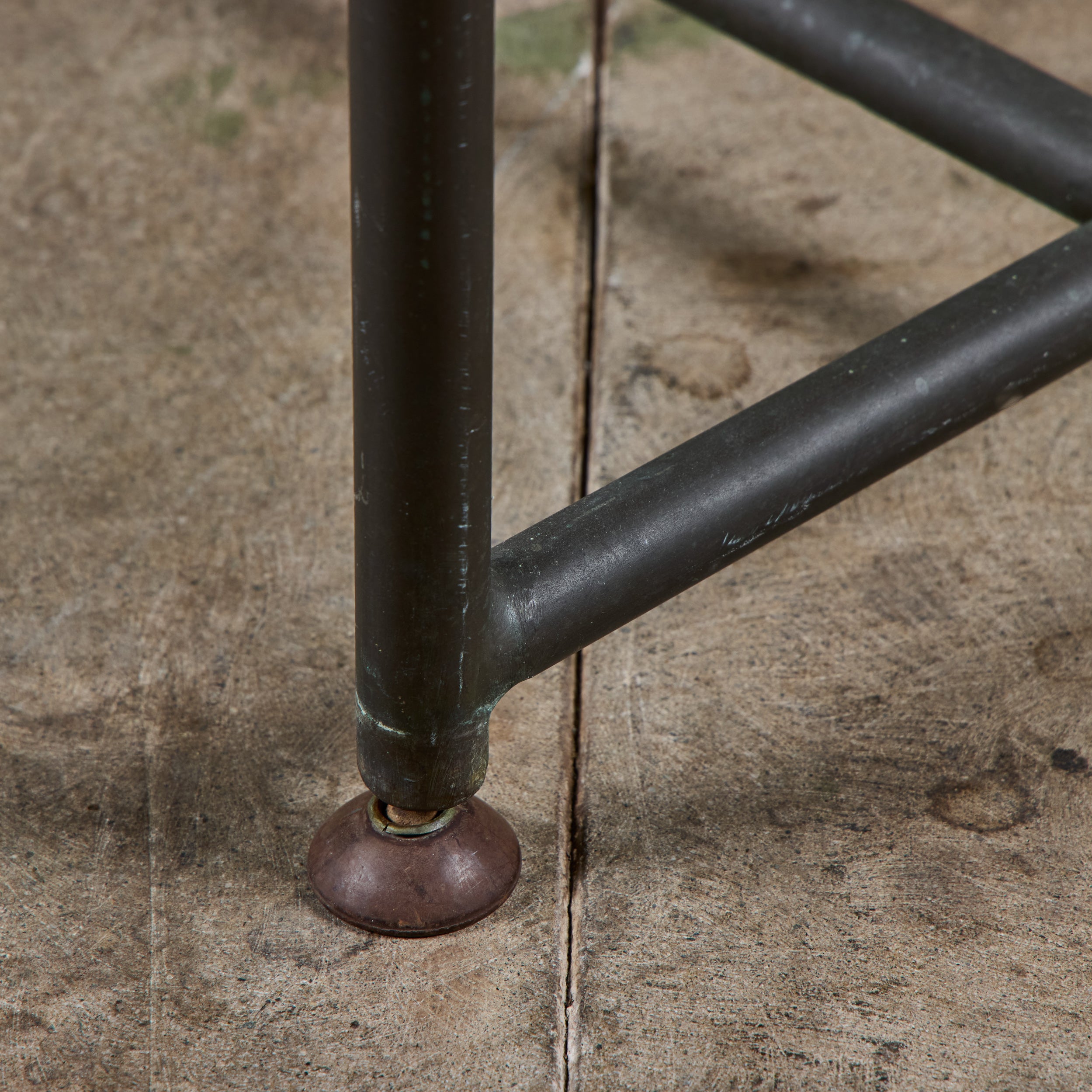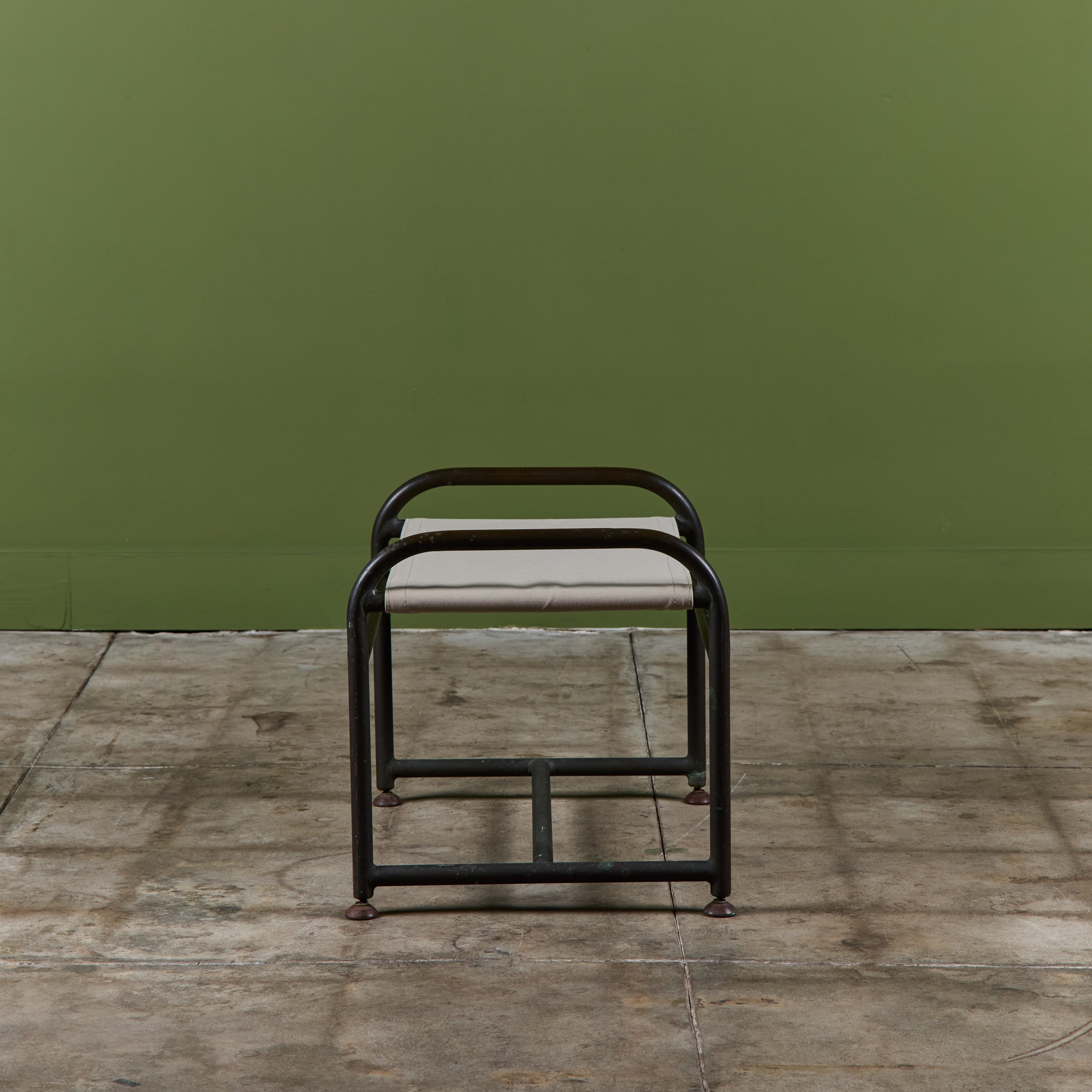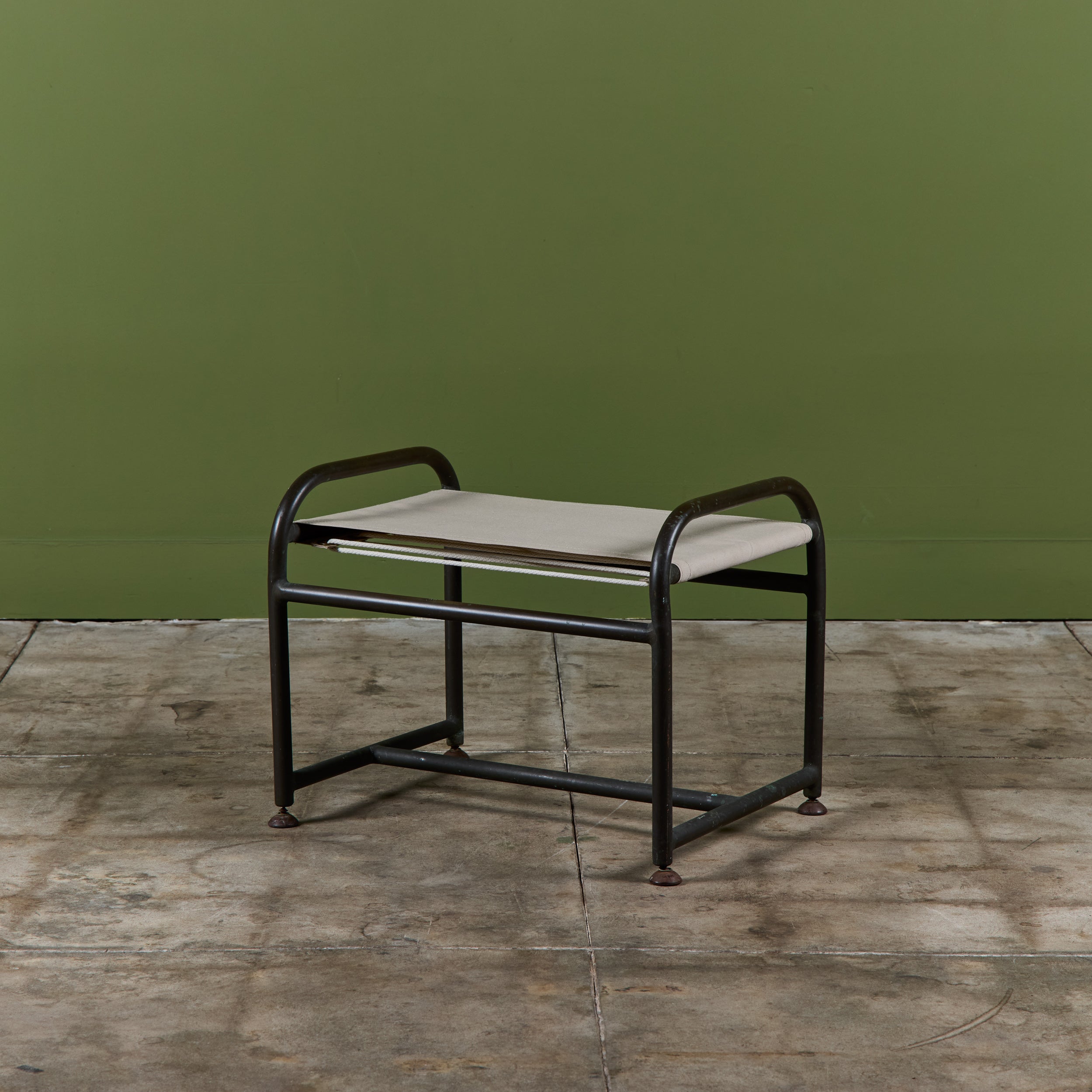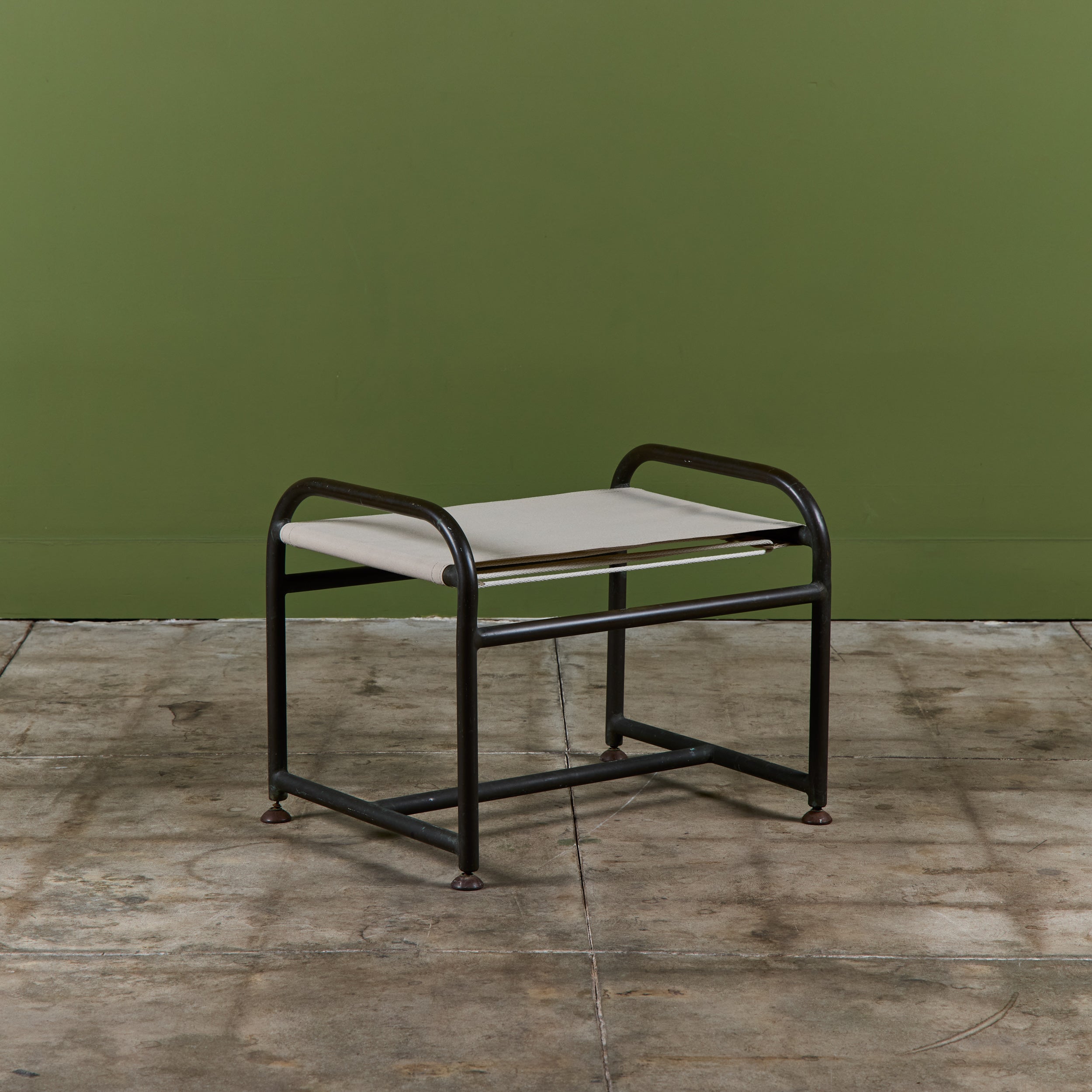 The late 1940s or early 1950s Walter Lamb ottoman predating his partnership with Brown Jordan. The ottoman has a frame in thick tubular bronze and canvas seat laced tightly to the frame with sailcord.