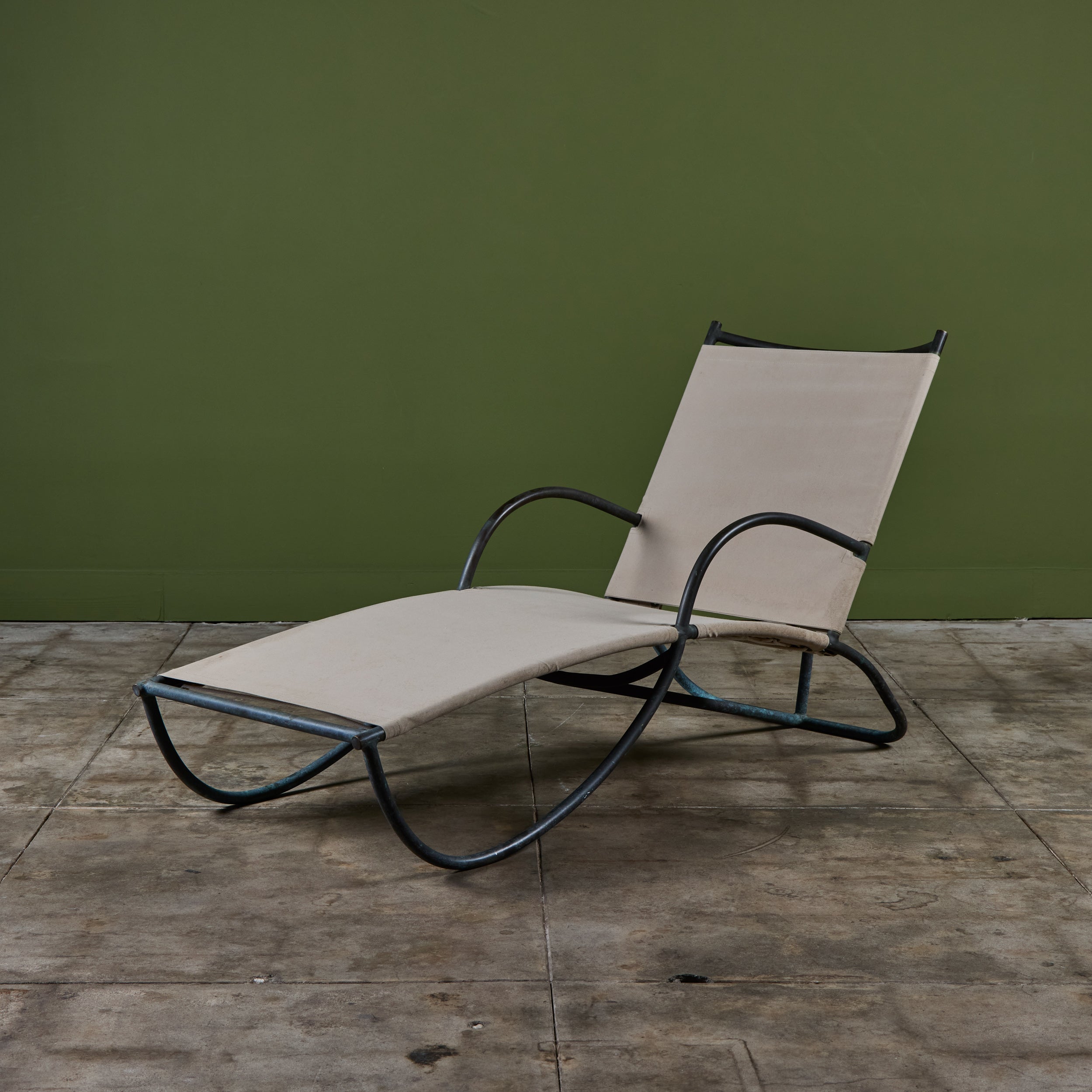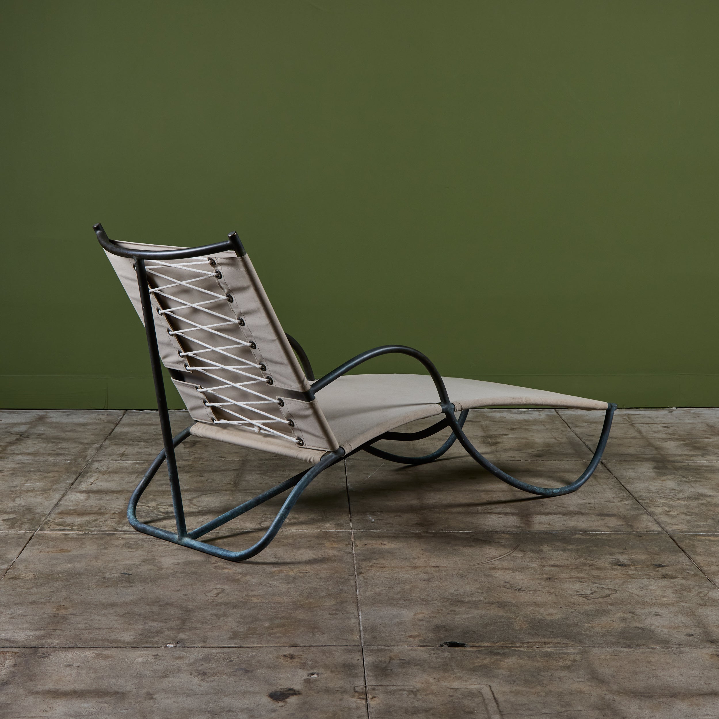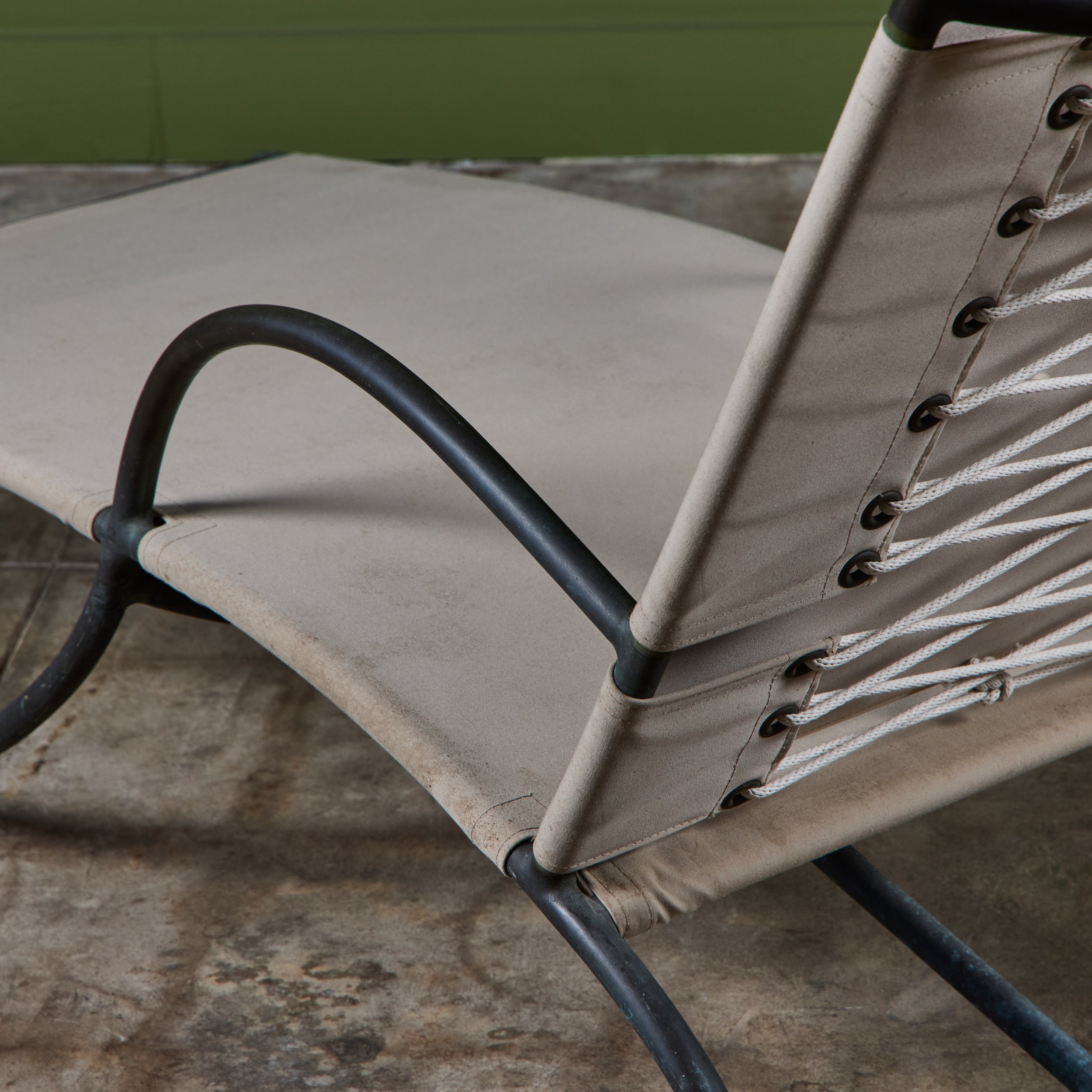 The late 1940s or early 1950s early S-Lounge patio chair by Walter Lamb predating his partnership with Brown Jordan. The chaise lounge is rendered in thick bronze tubing with a canvas sling seat laced tightly to the frame with sailcord. Its namesake armrest draws a serpentine curve from the backrest to the front edge of the piece. A bent runner mirrors the arched lines of the seat to form the rear support.