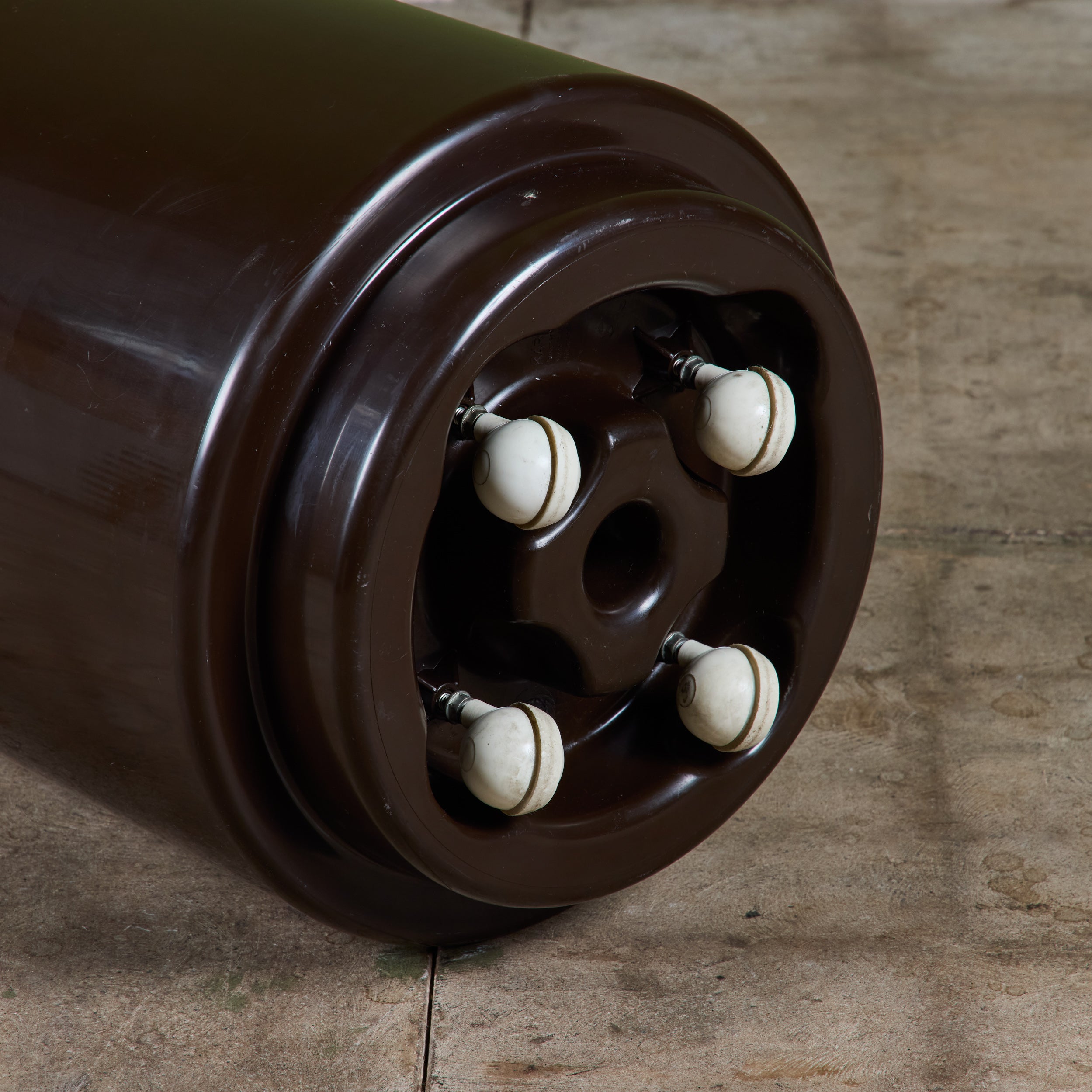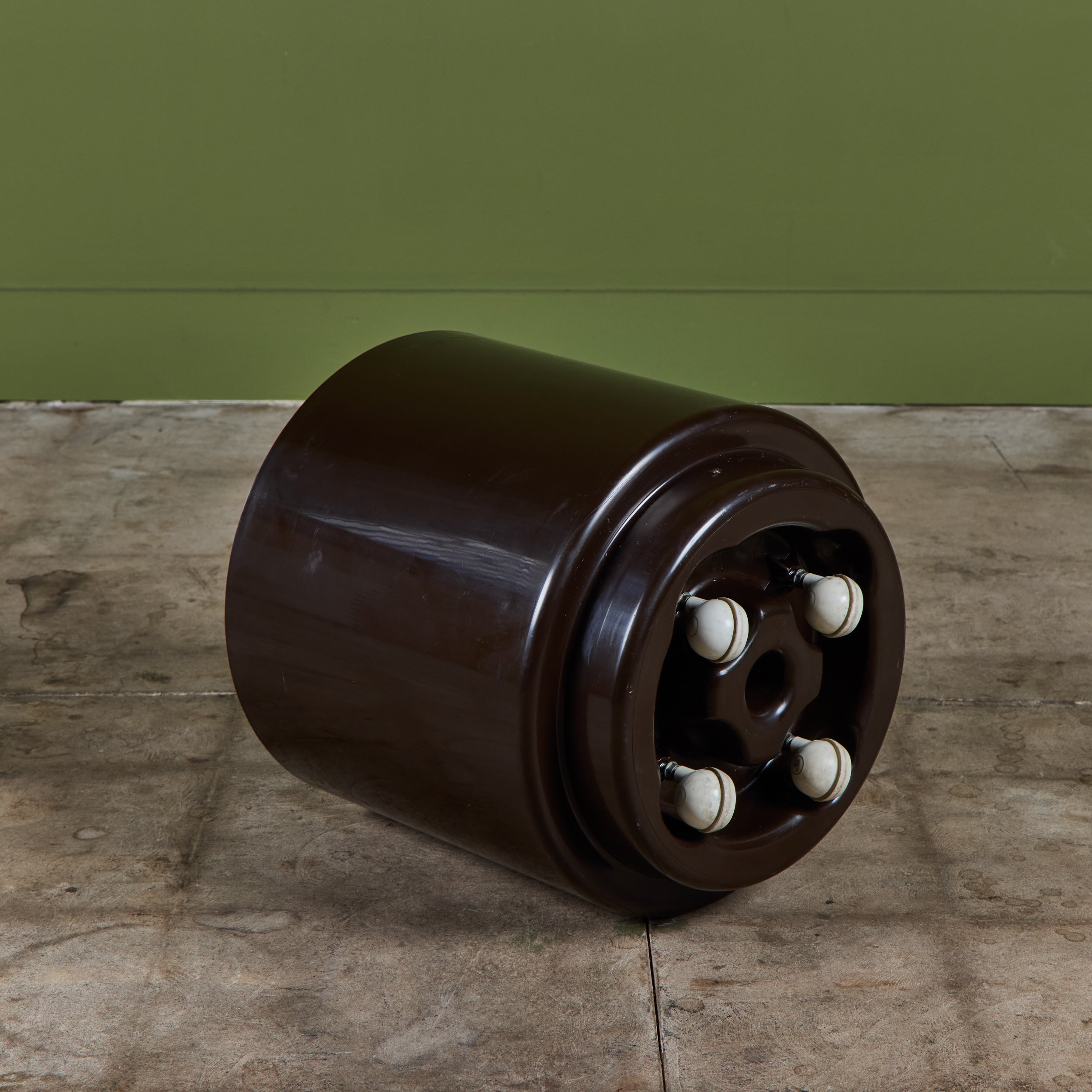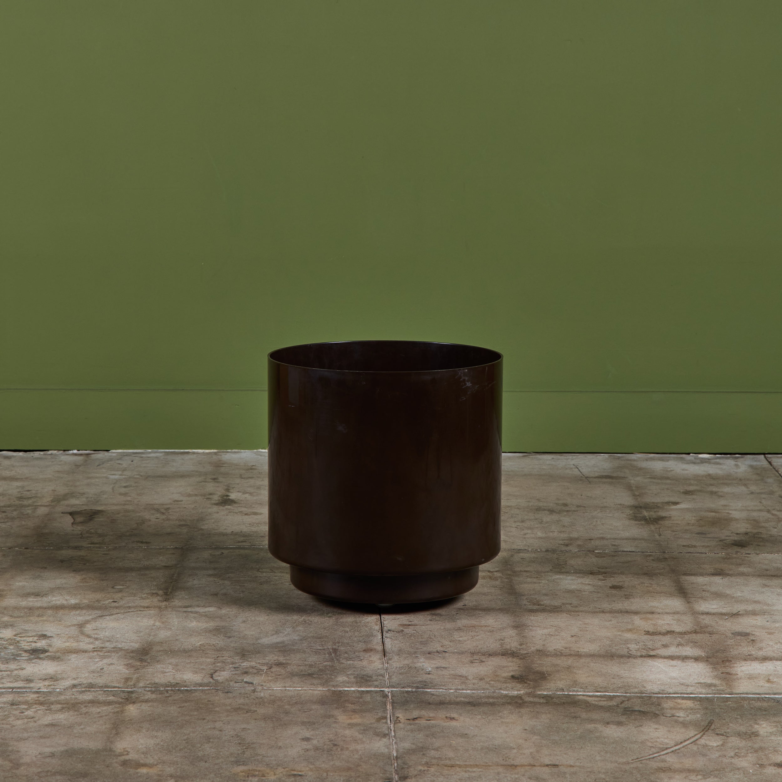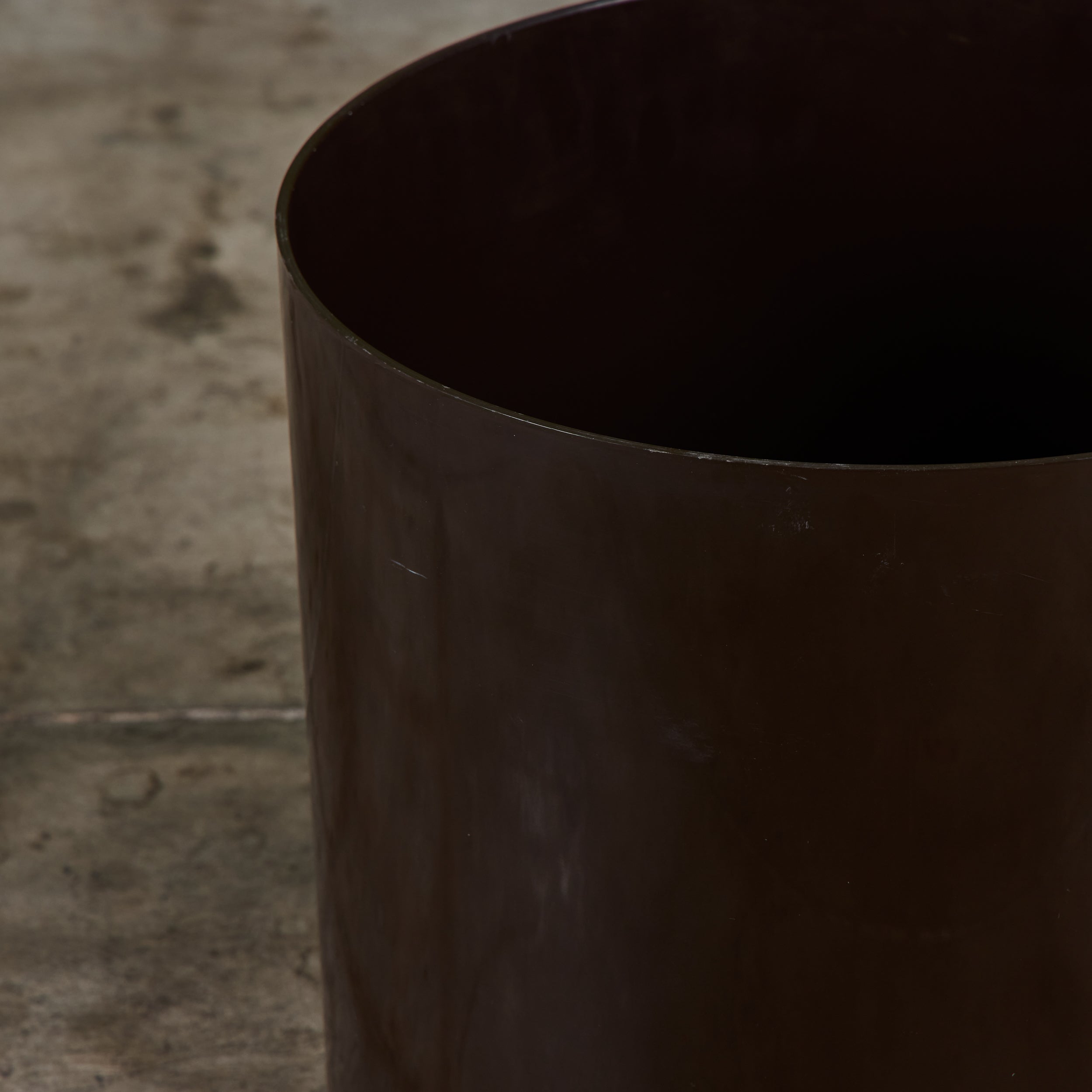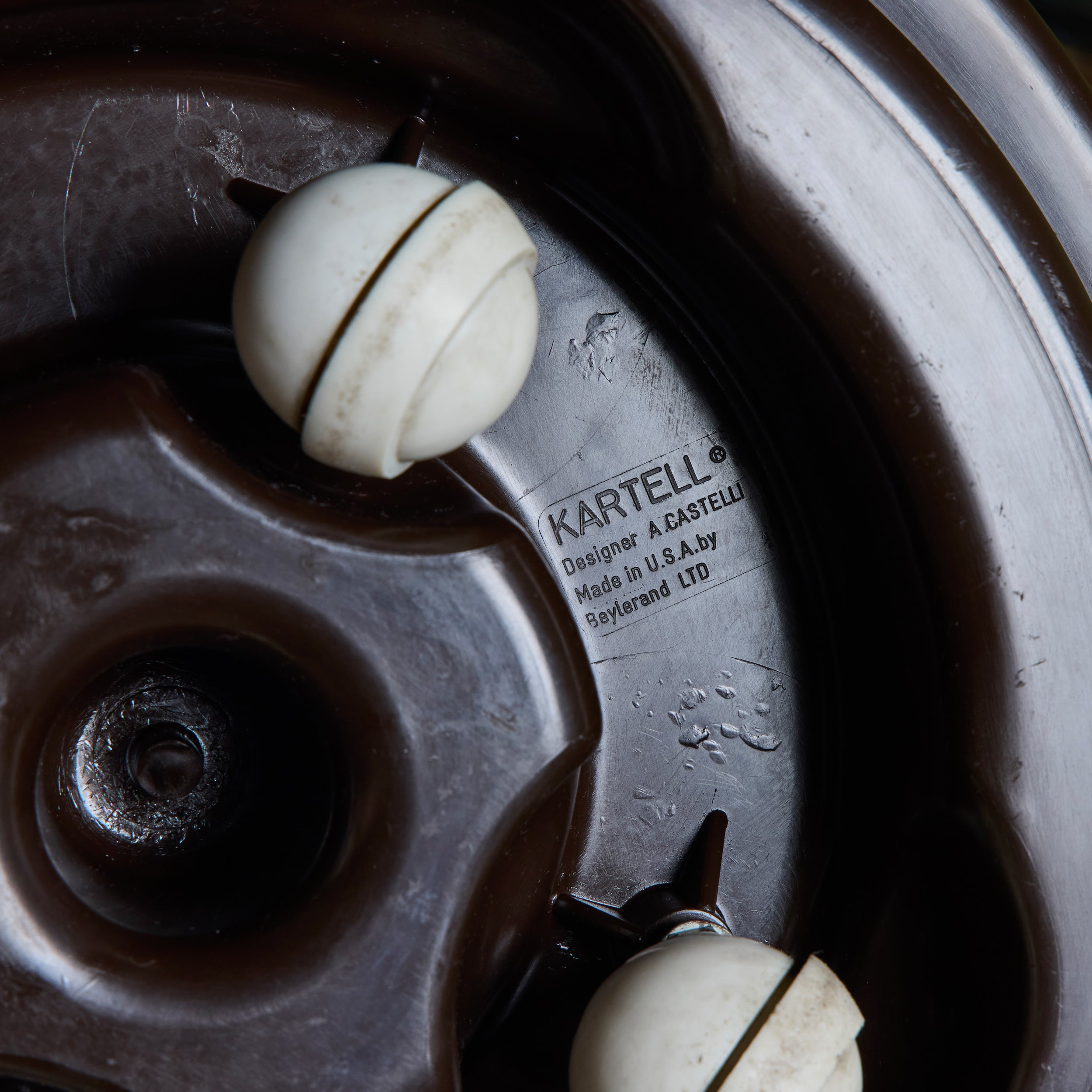 Planter from Italian design house Kartell, designed by Anna Castelli Ferrieri, c.1970s, USA. The brown planter features a cylindrical plastic form with four casters at the bottom.