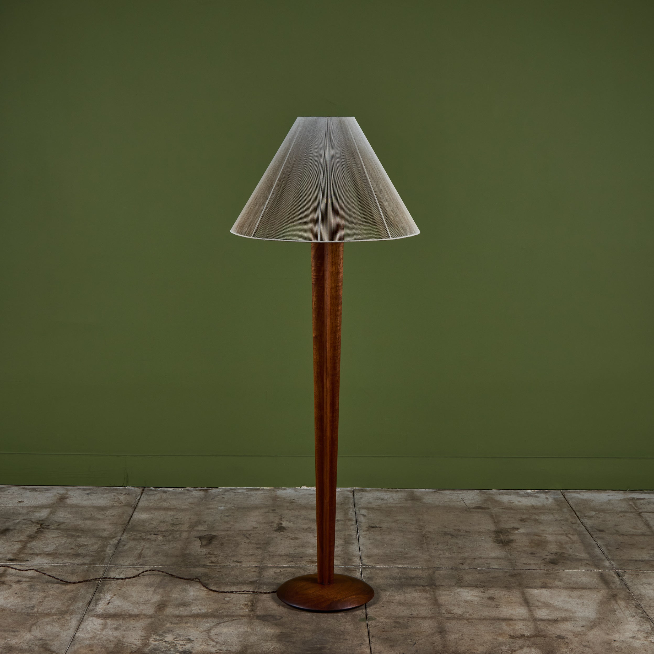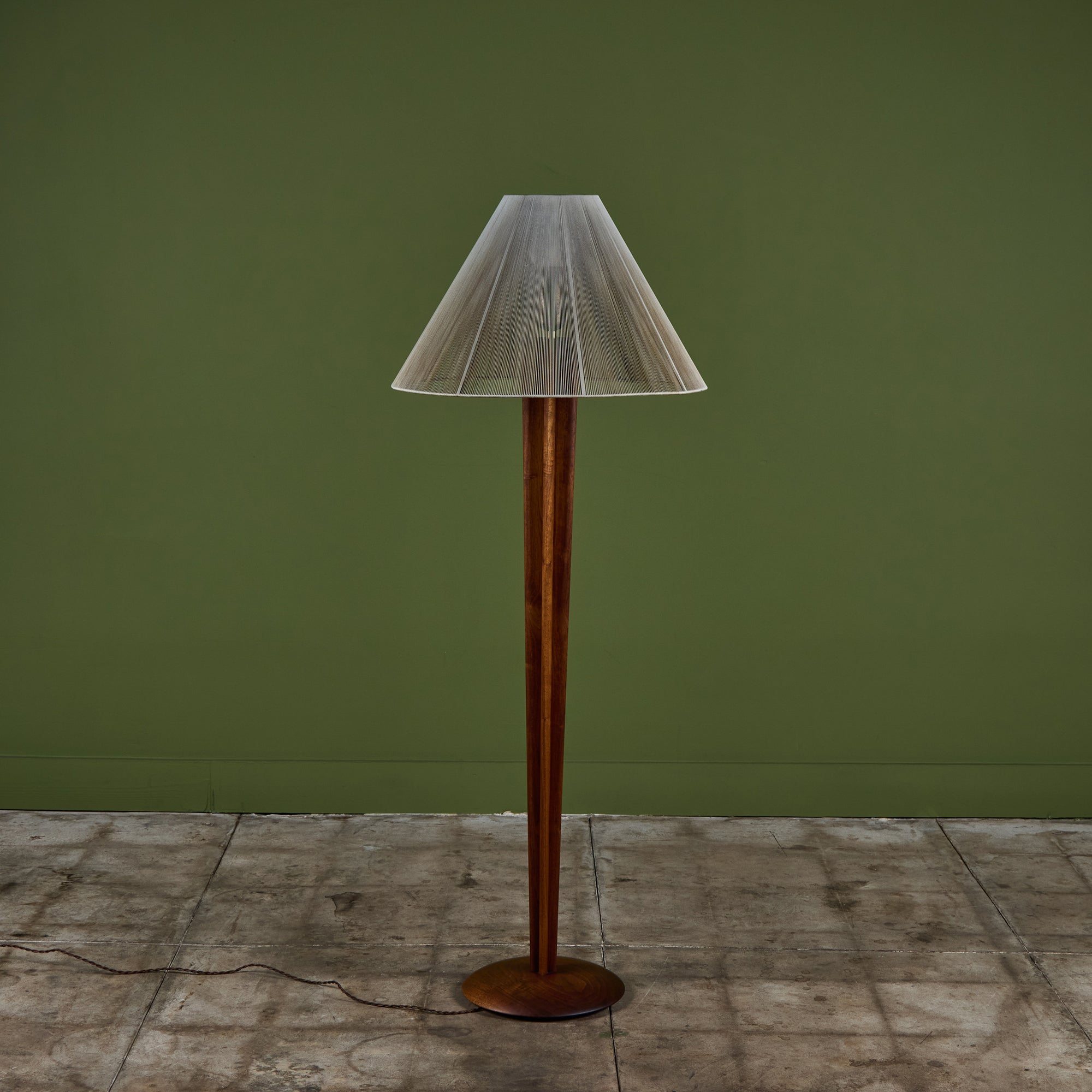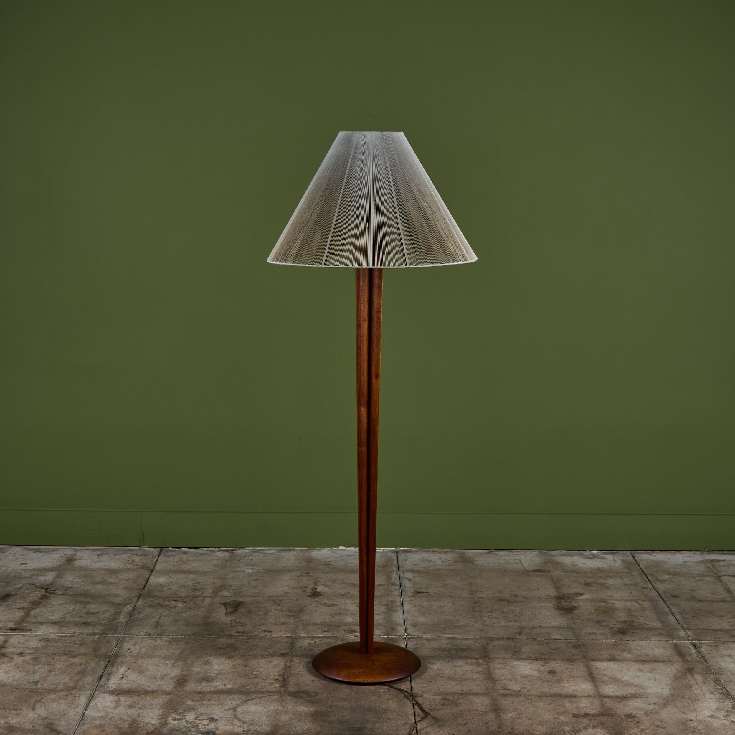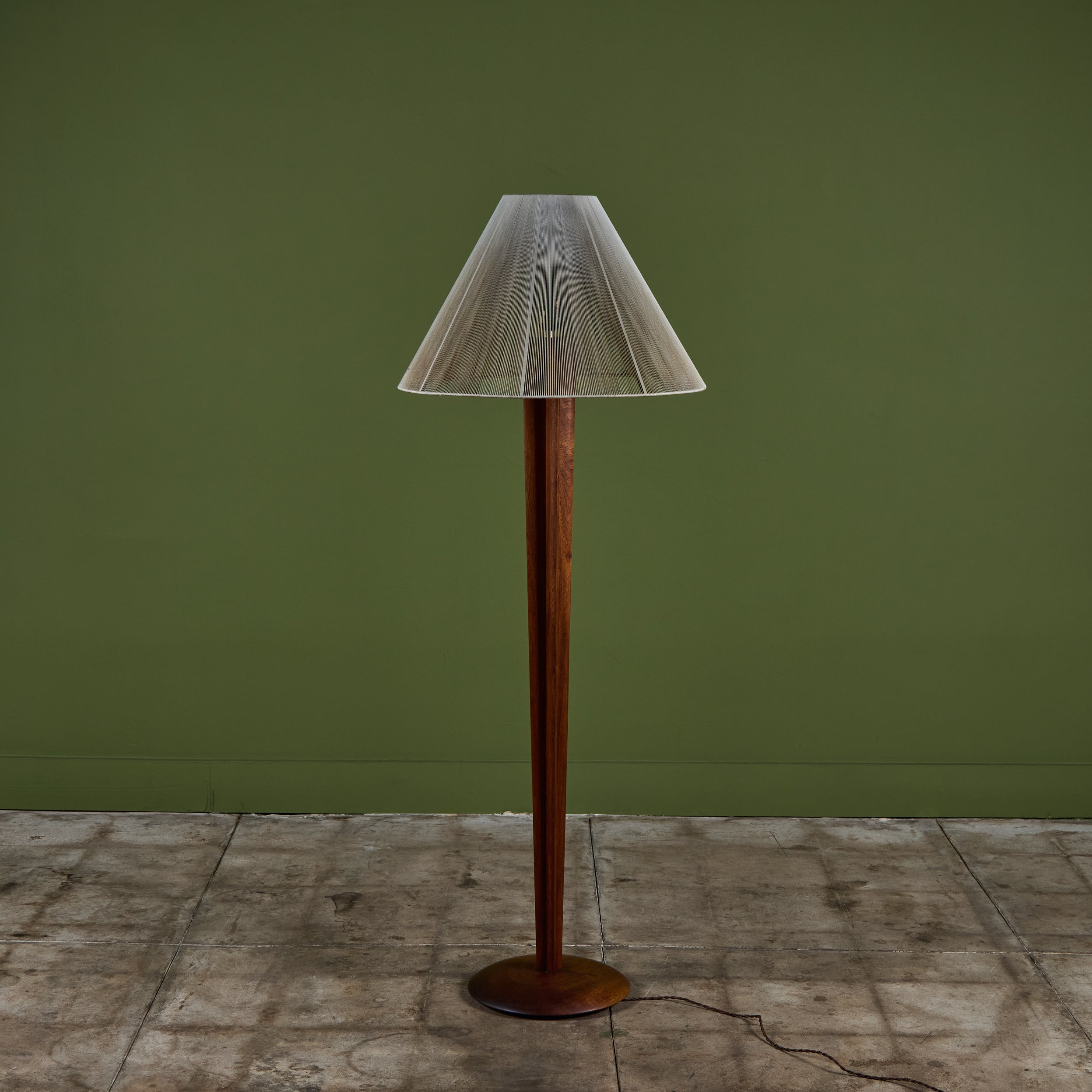 Walnut floor lamp designed by Vladimir Kagan for Kagan-Dreyfus c.1960s, USA. The lamp features a carved tapered walnut stem and a nylon string shade that rests on a small interior glass shade, giving the appearance of movement that beautifully reflects the light.