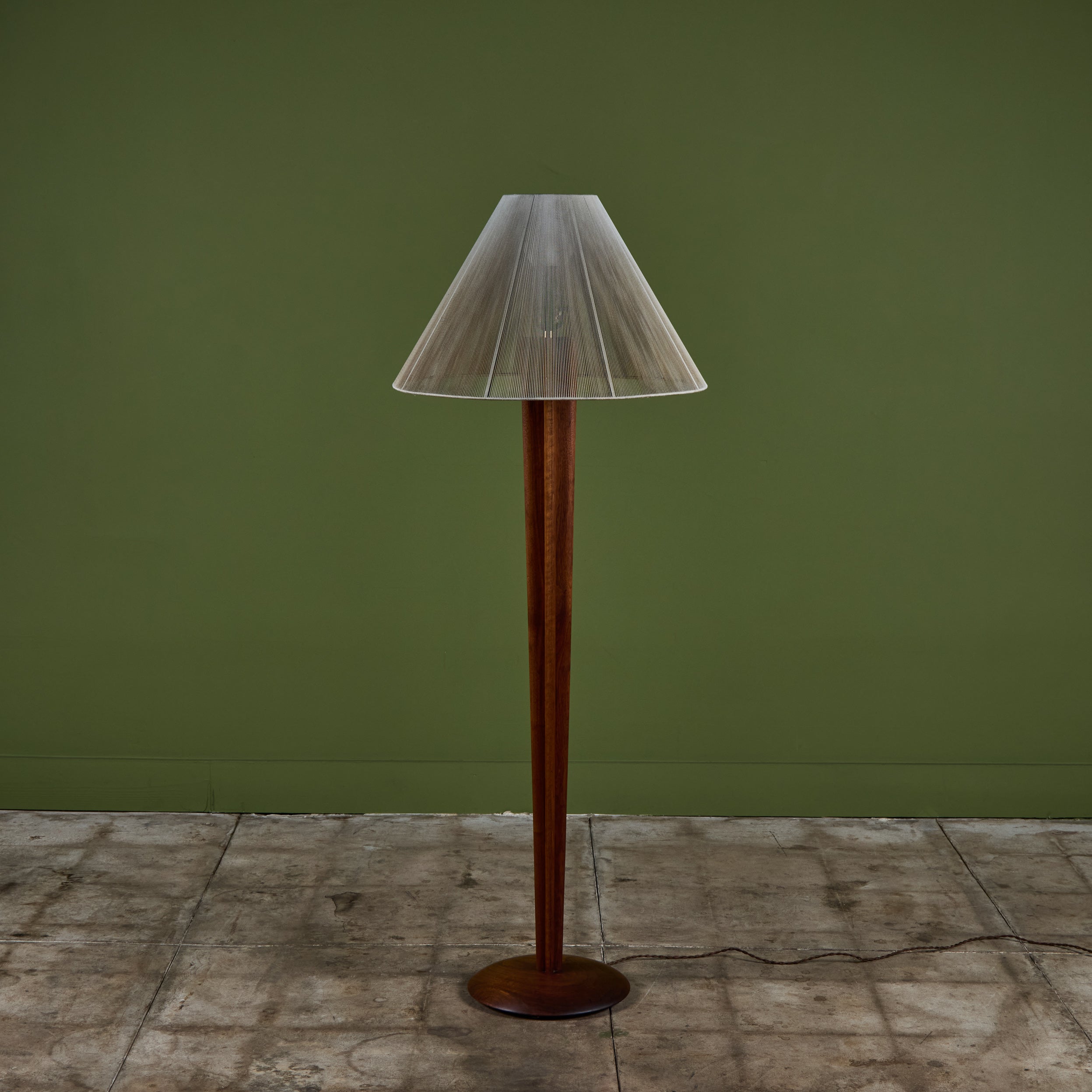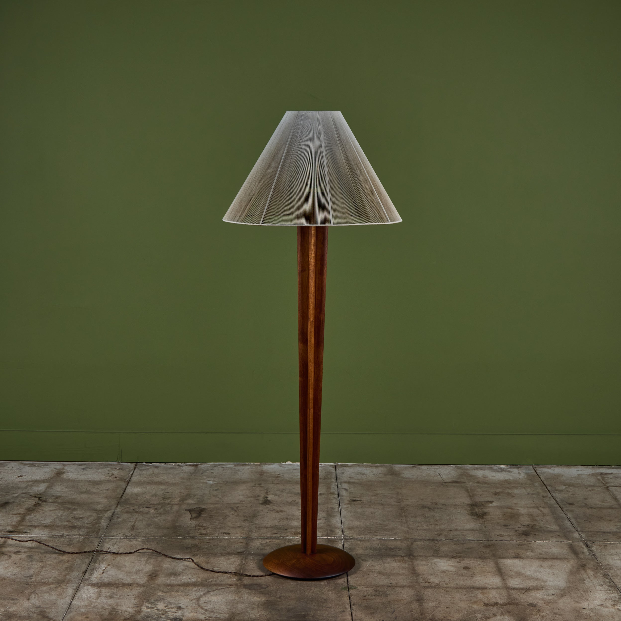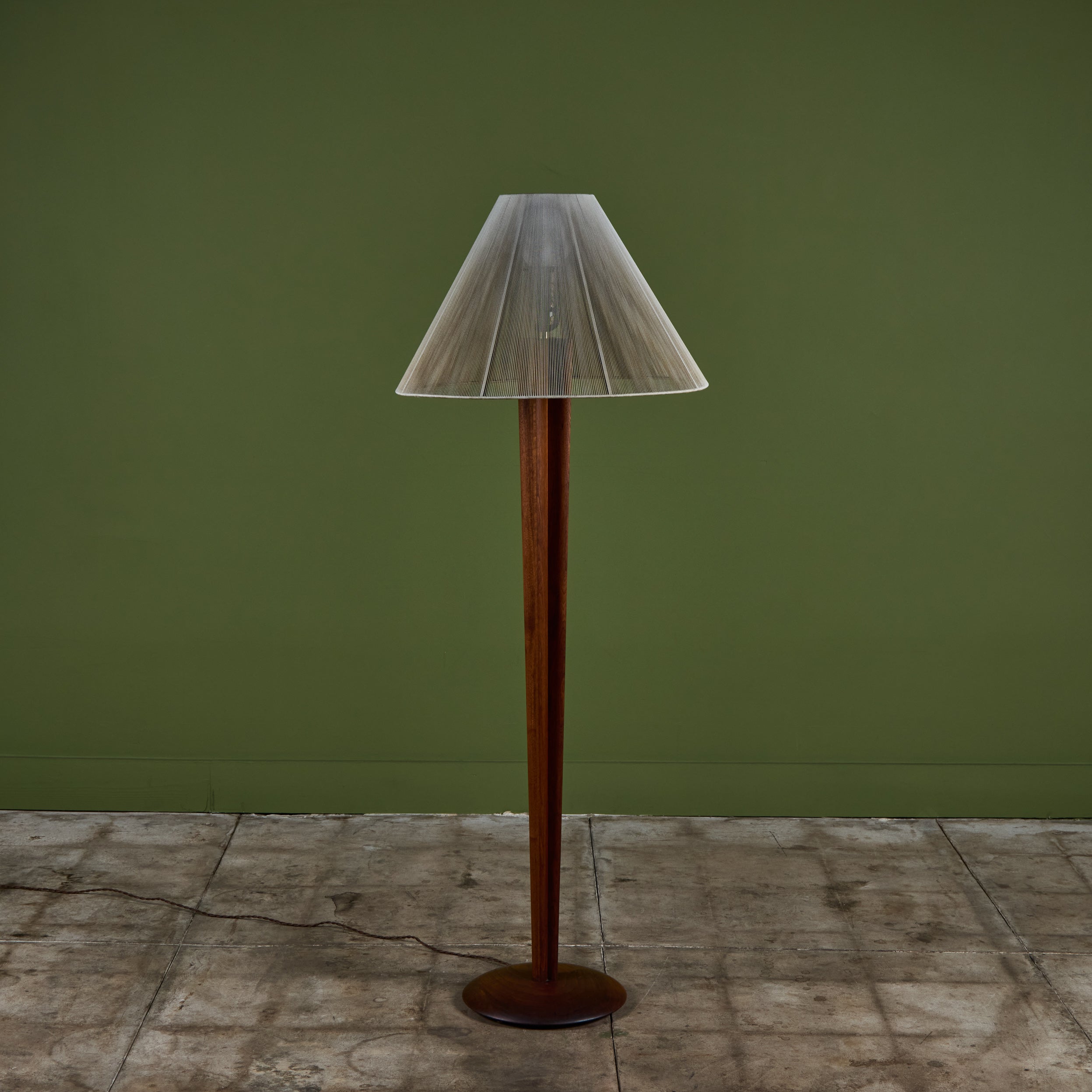 Walnut floor lamp designed by Vladimir Kagan for Kagan-Dreyfus c.1960s, USA. The lamp features a carved tapered walnut stem and a nylon string shade that rests on a small interior glass shade, giving the appearance of movement that beautifully reflects the light.