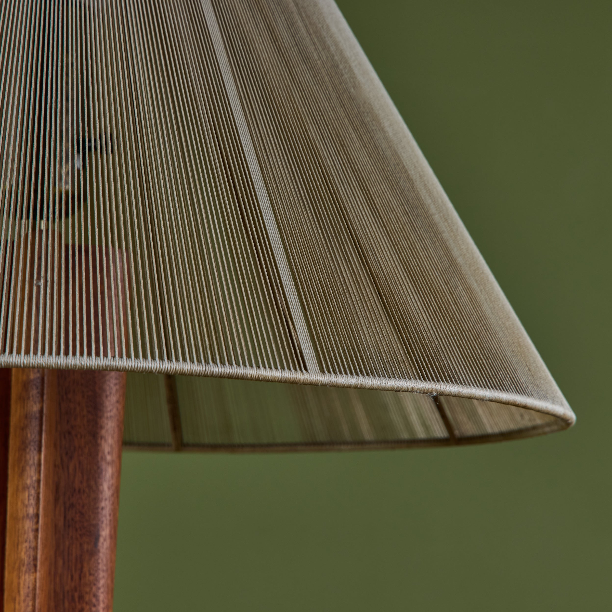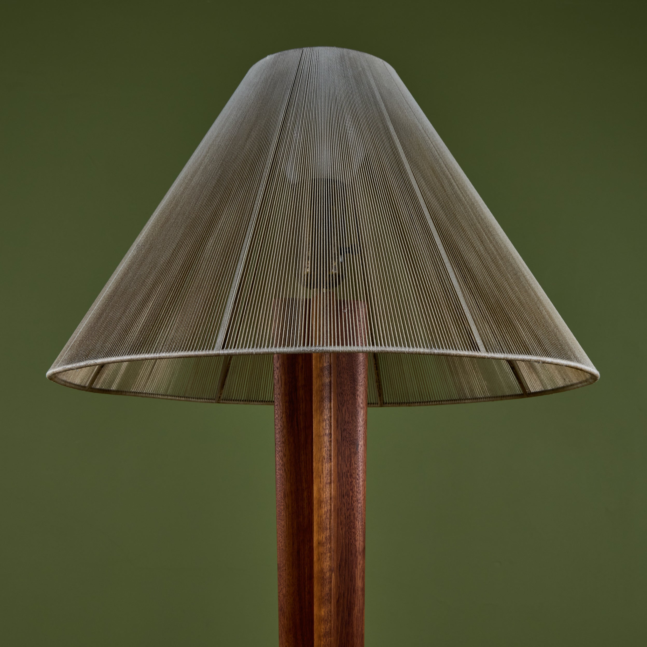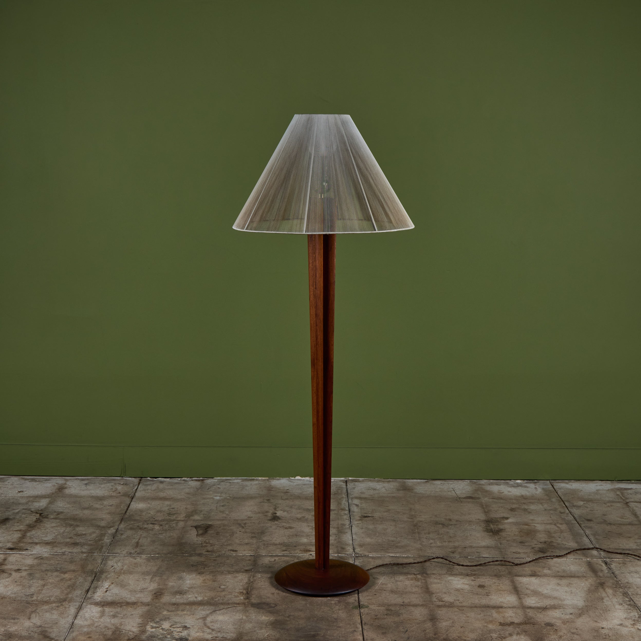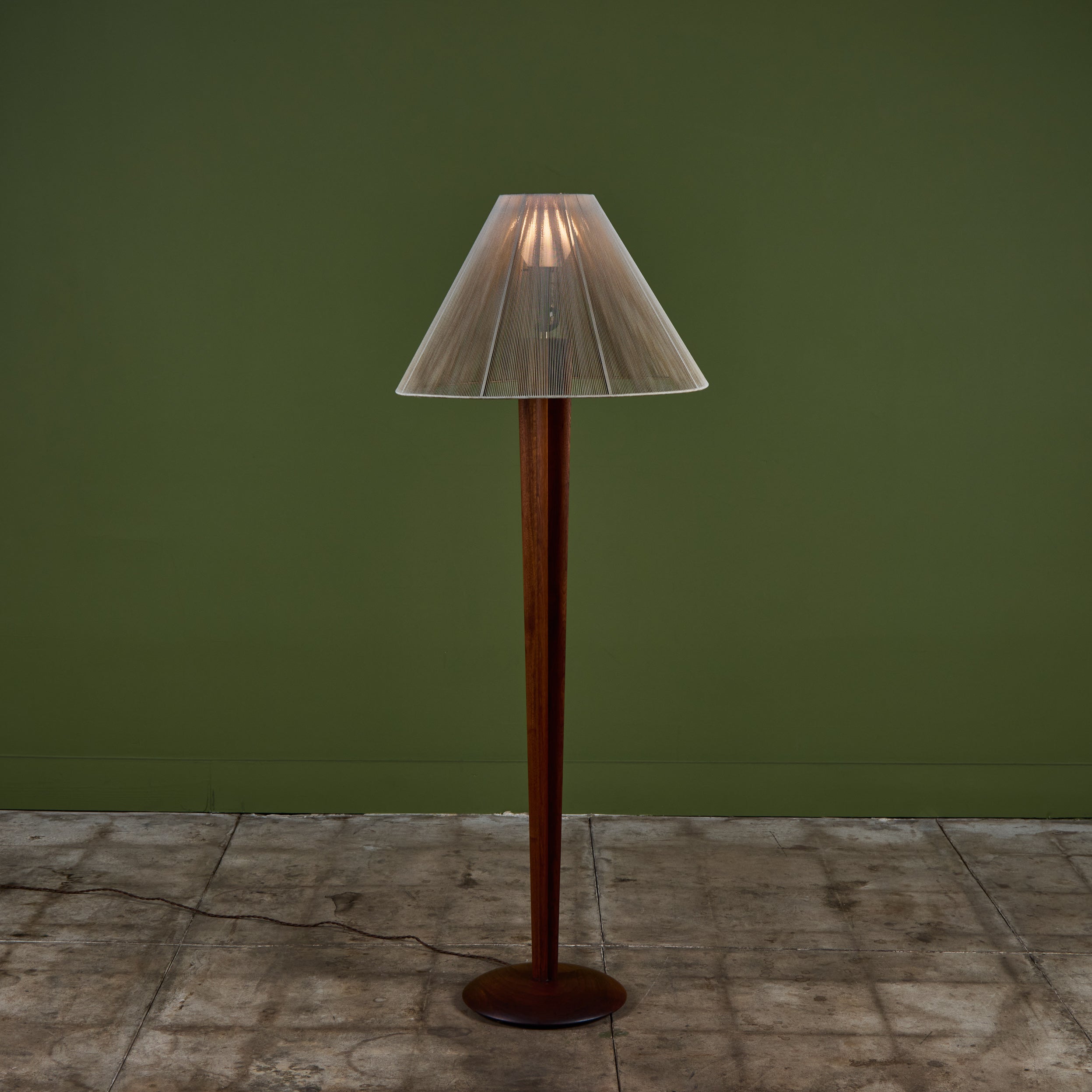 Walnut floor lamp designed by Vladimir Kagan for Kagan-Dreyfus c.1960s, USA. The lamp features a carved tapered walnut stem and a nylon string shade that rests on a small interior glass shade, giving the appearance of movement that beautifully reflects the light.