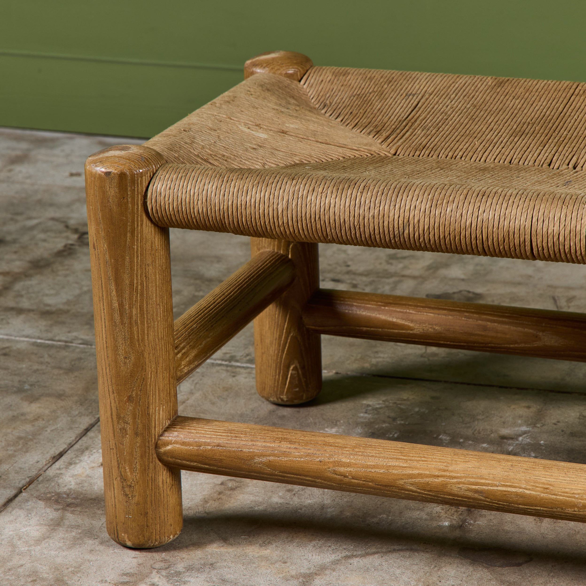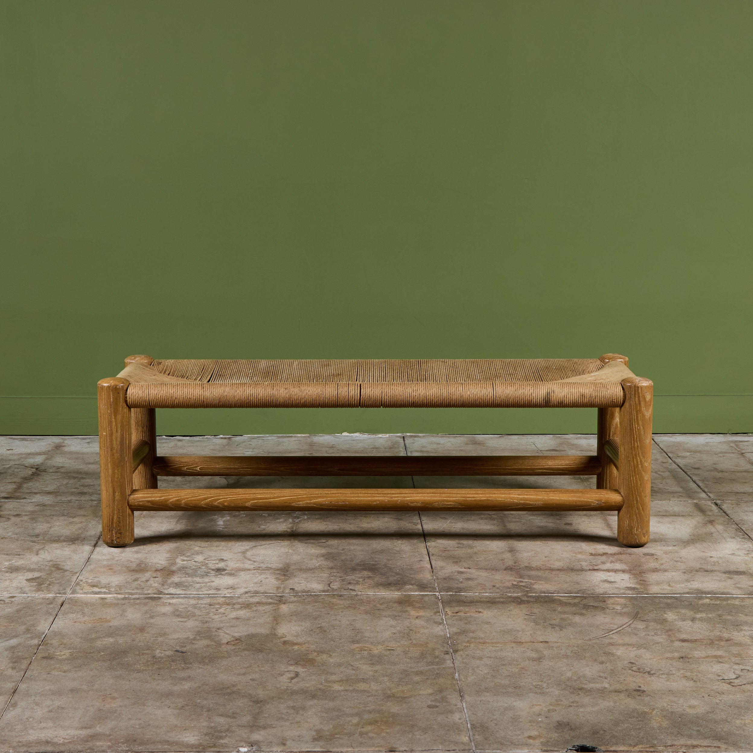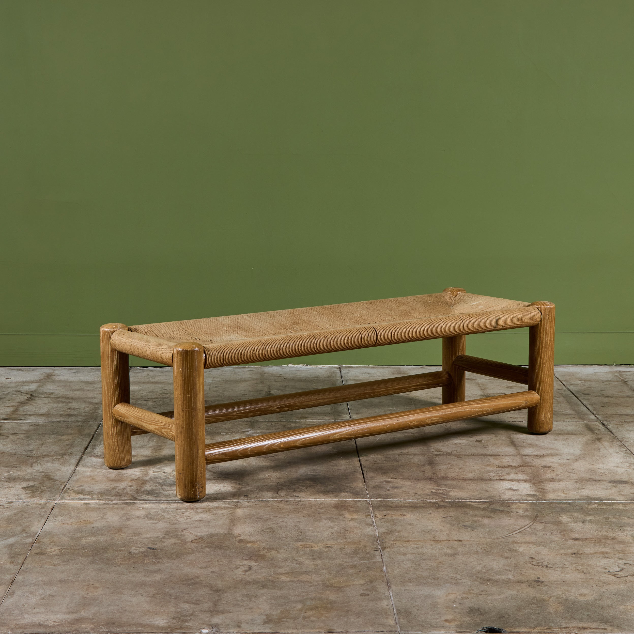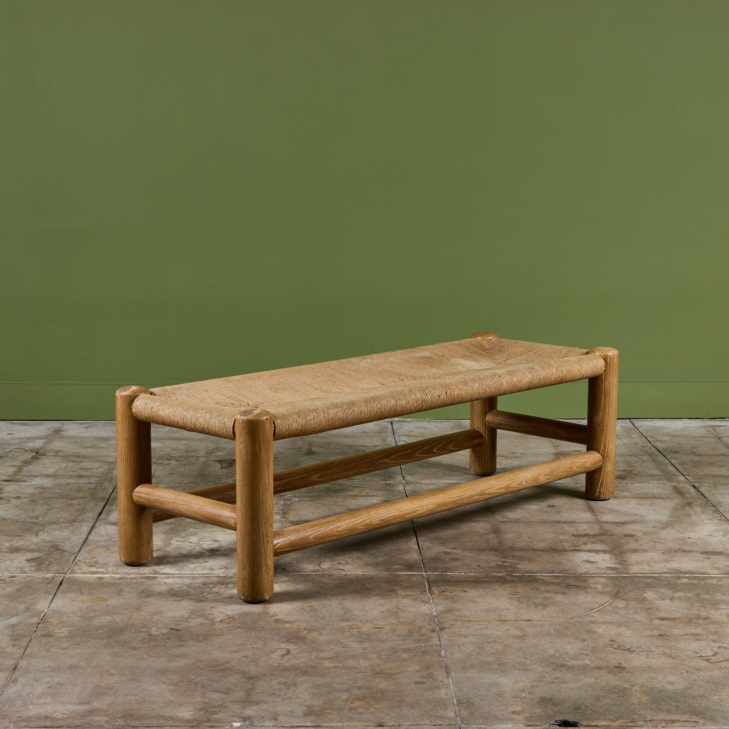 Woven rush bench by Dutch designer, Wim Den Boon c.1950's, Netherlands. The long bench features a solid beech wood frame with a woven rush seat.