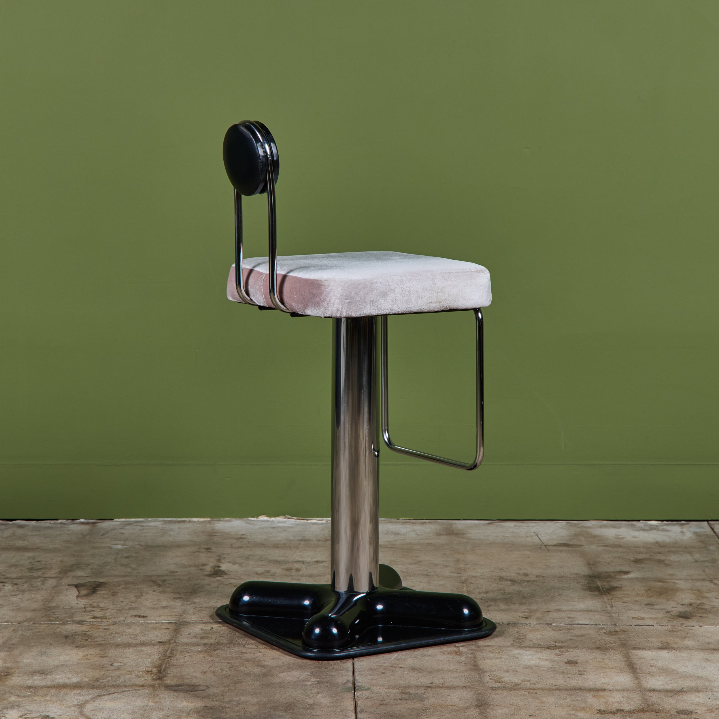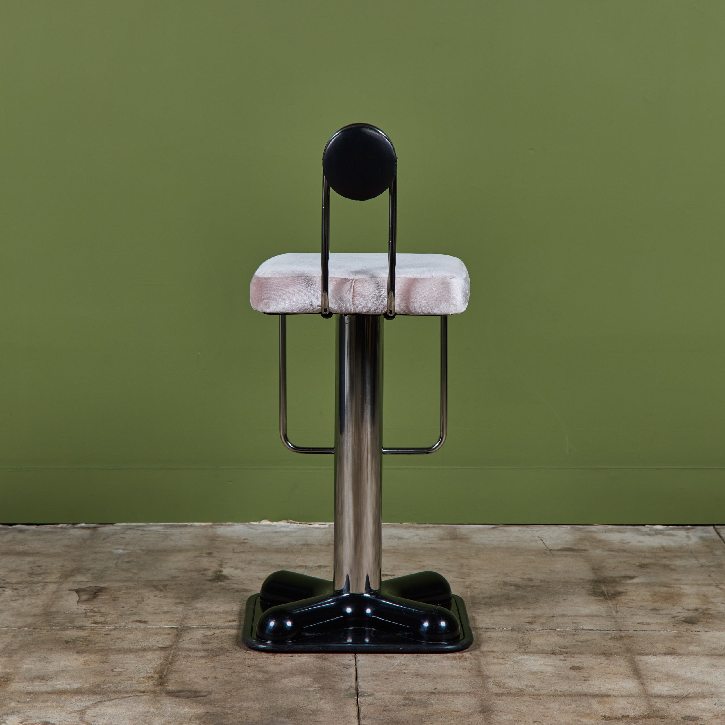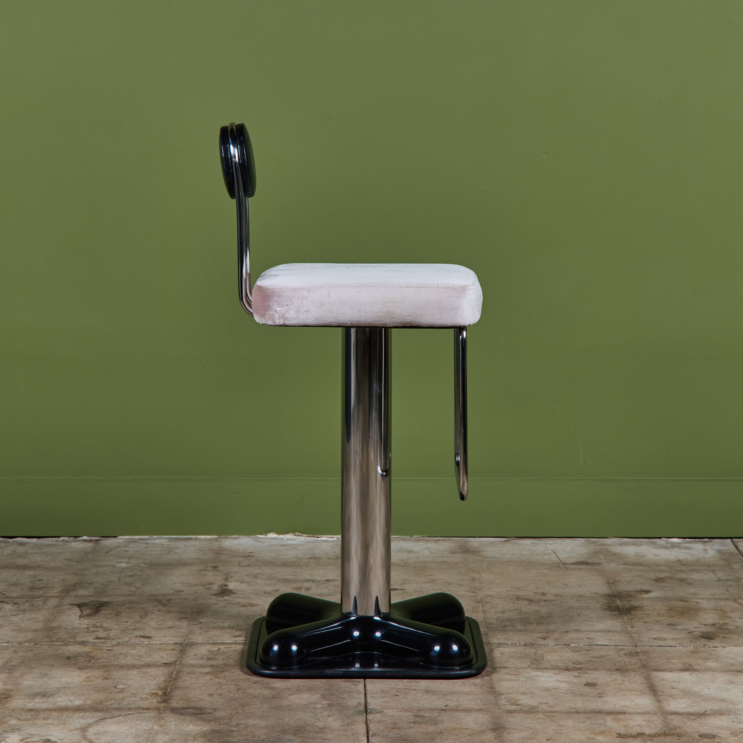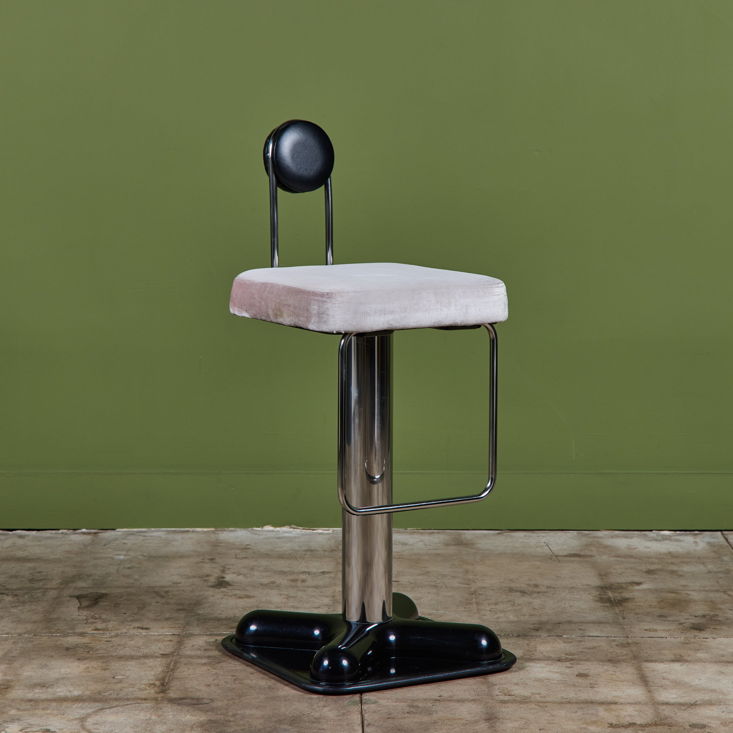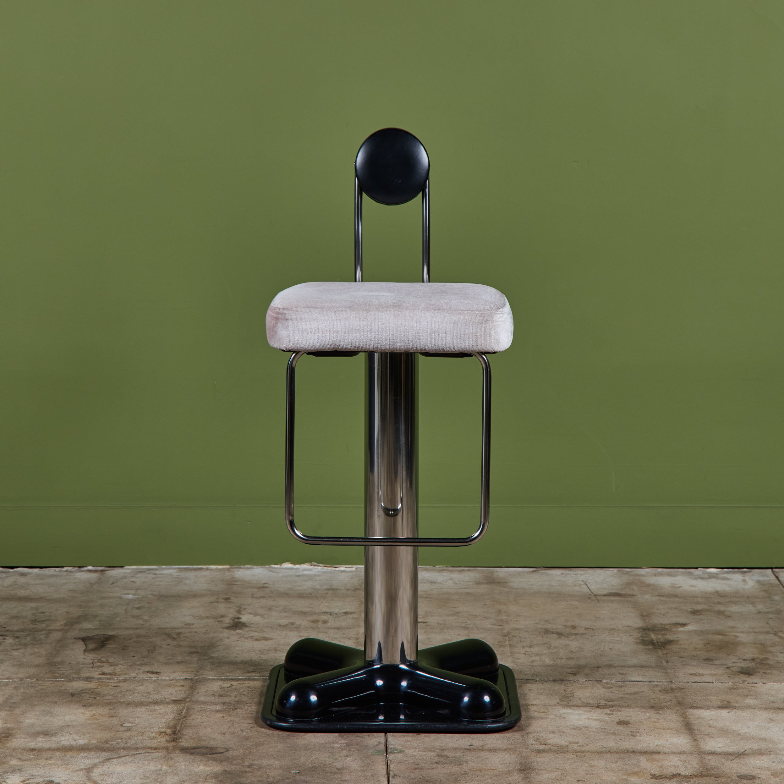 Bar stool by Joe Colombo for Zanotta, c.1970s, Italy. The swivel 'Birillo' stool features a small round black leather backrest and cream upholstered seat. The stool has a chrome frame and footrest with a square black fiberglass base.