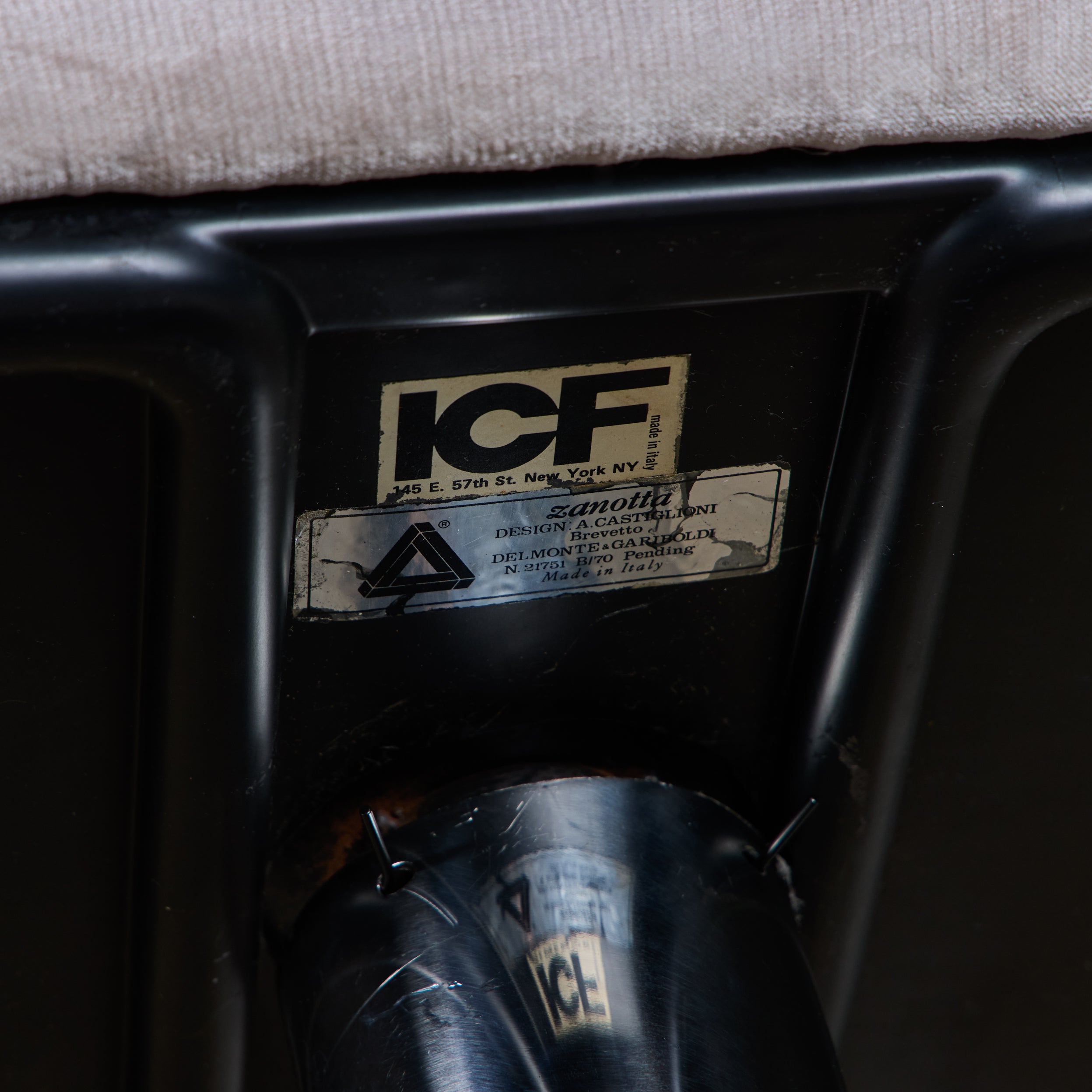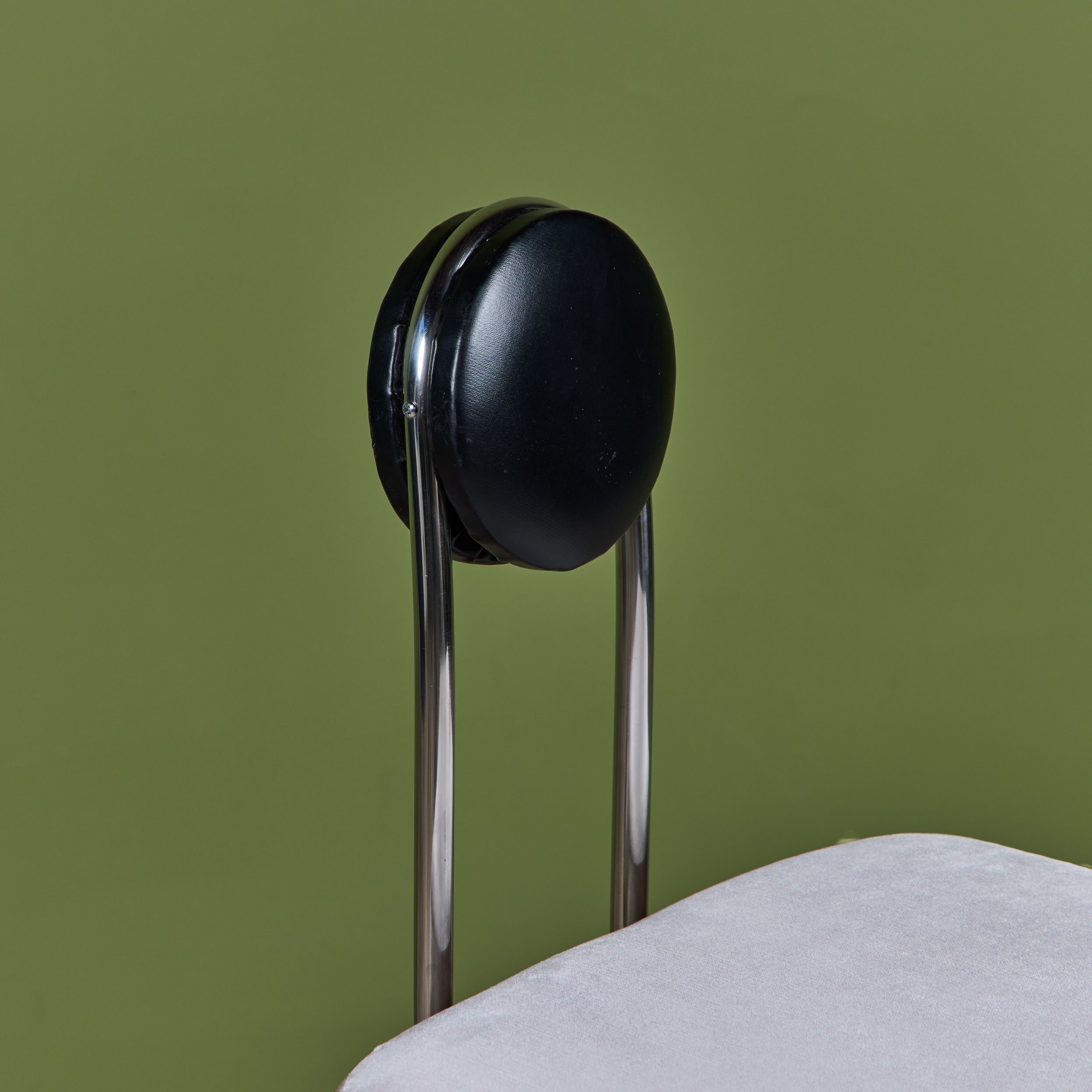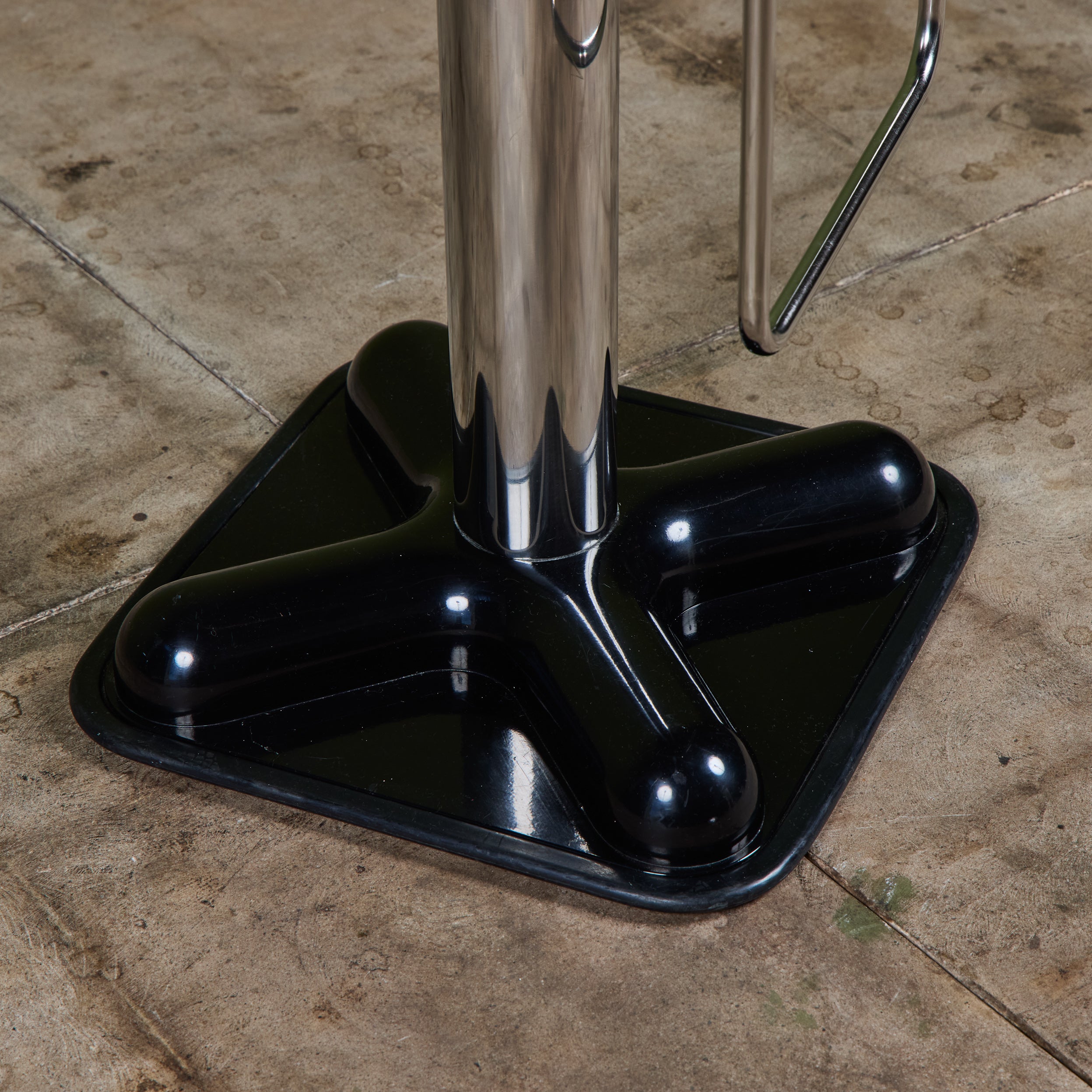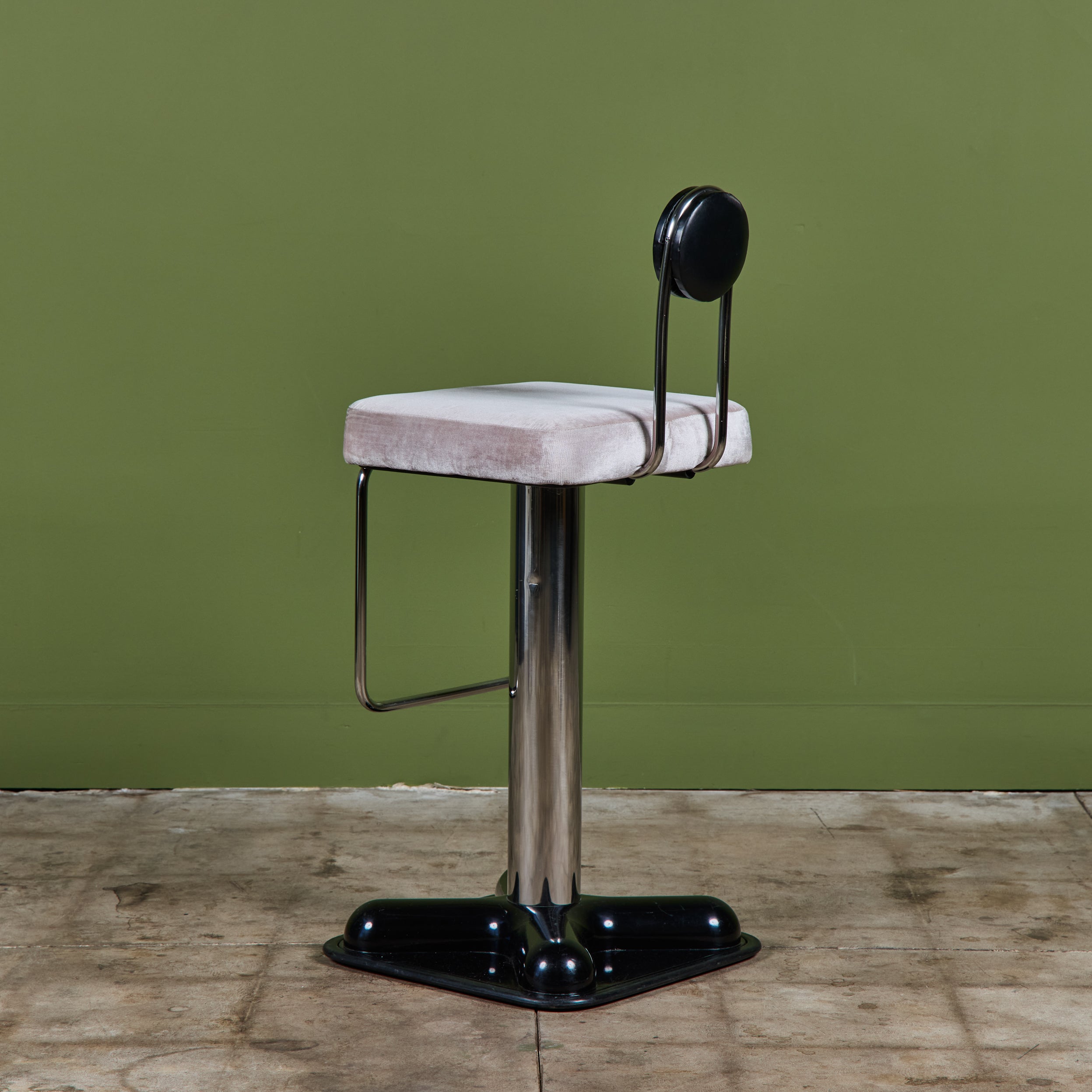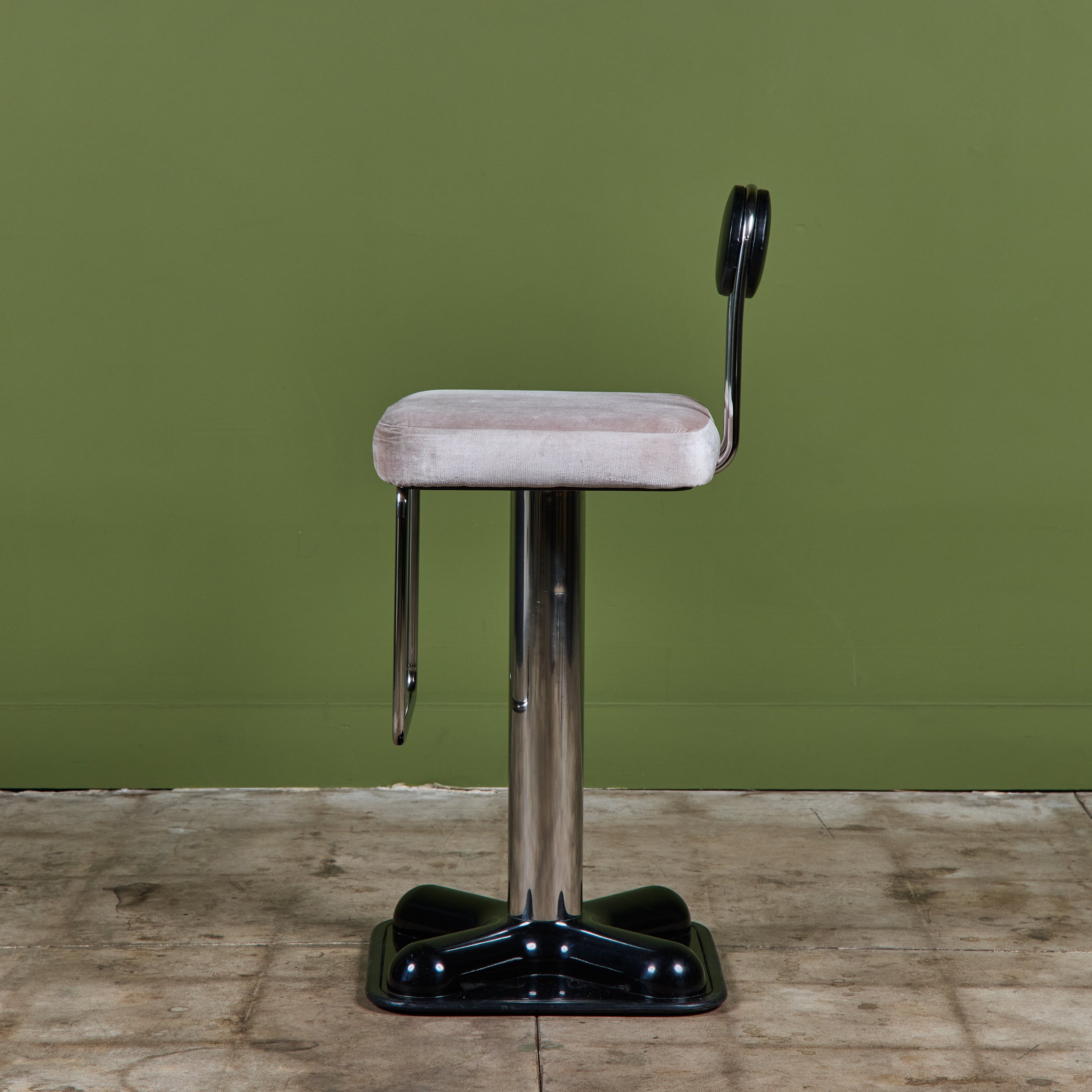 Bar stool by Joe Colombo for Zanotta, c.1970s, Italy. The swivel 'Birillo' stool features a small round black leather backrest and cream upholstered seat. The stool has a chrome frame and footrest with a square black fiberglass base.