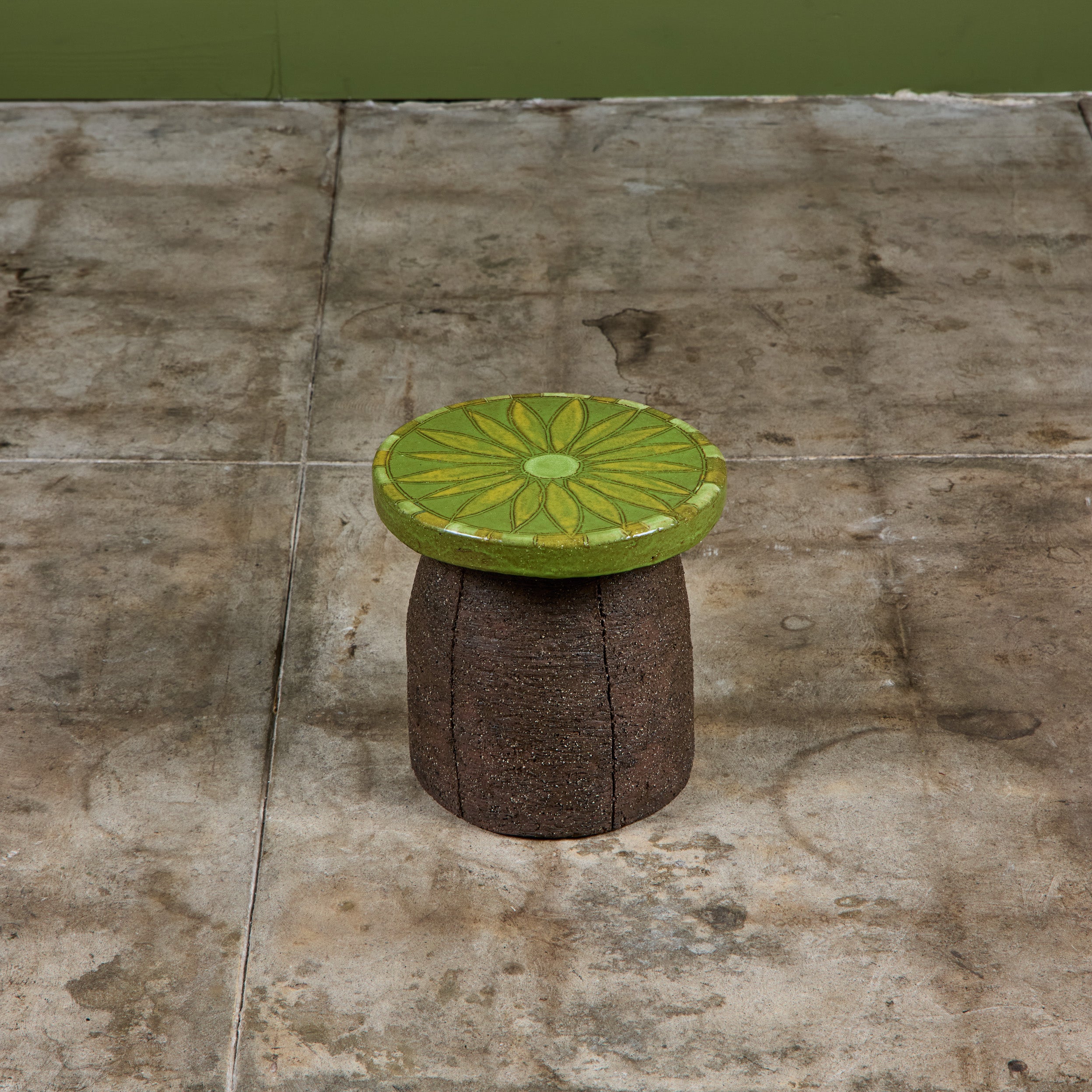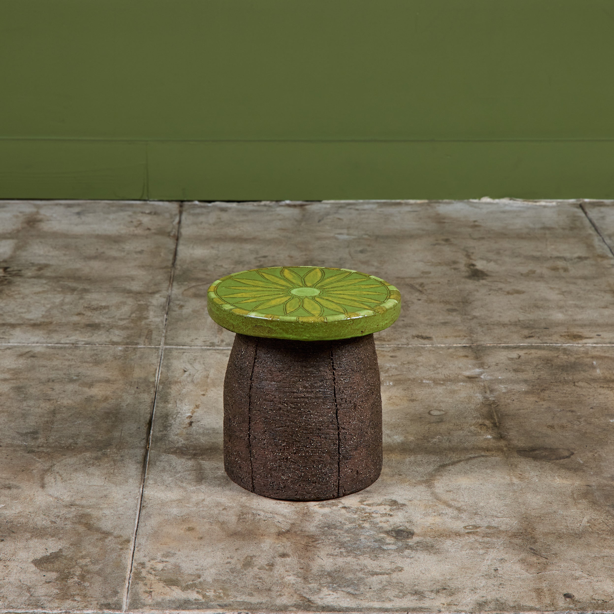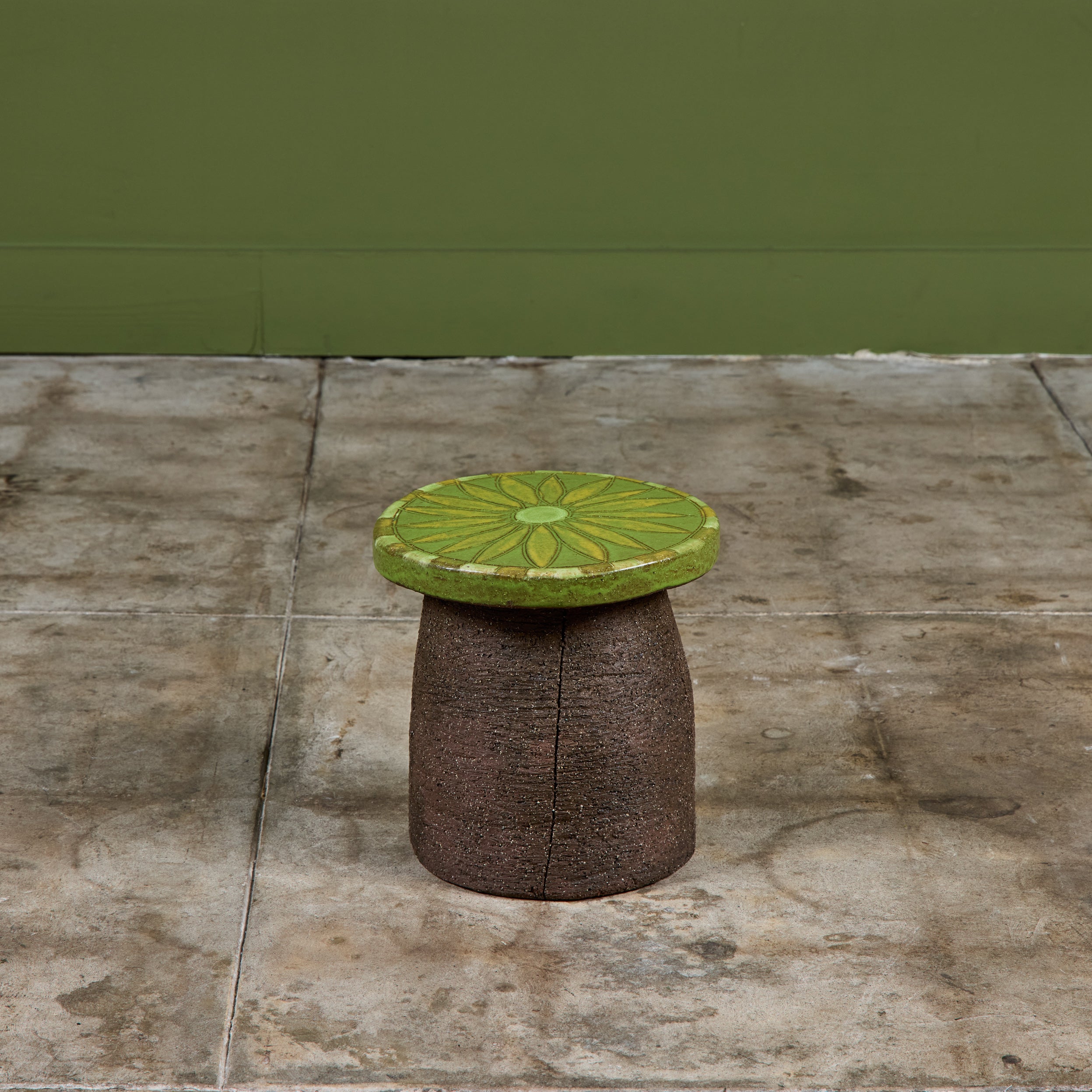 Mushroom stool or side table by Stan Bitters, USA. This piece features a round glazed ceramic top with floral motif and an unglazed stoneware base. Perfect as a petite side table, footstool or garden element.