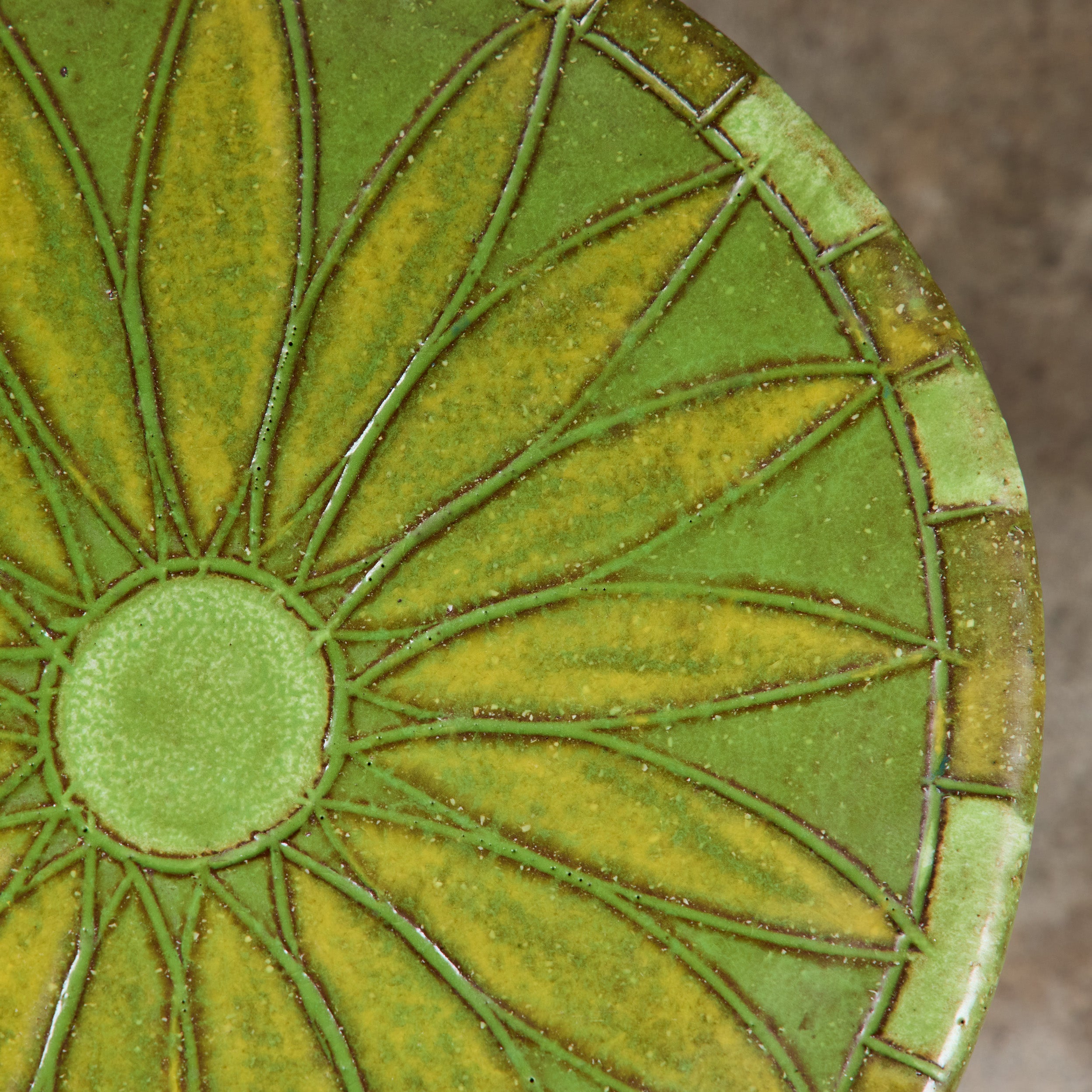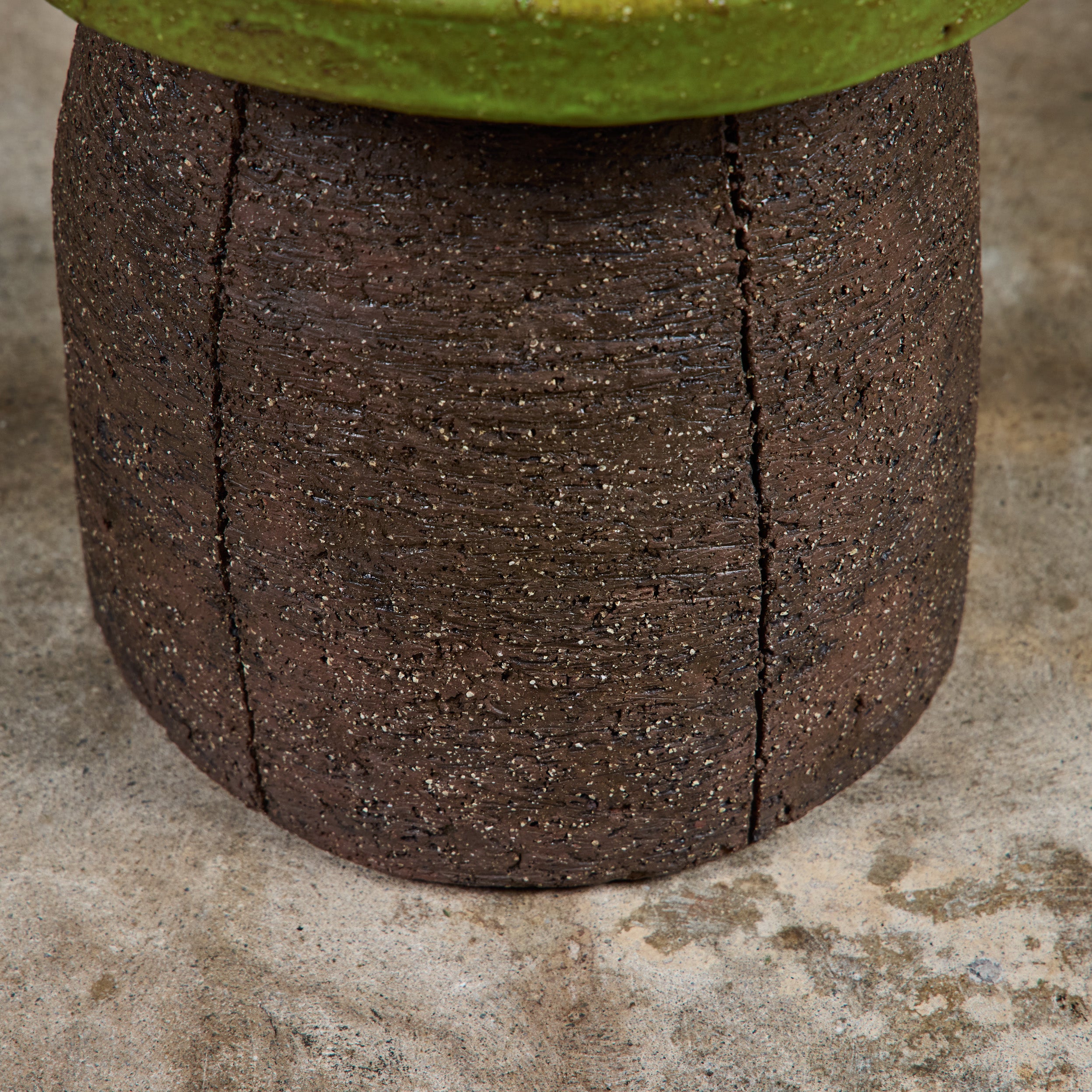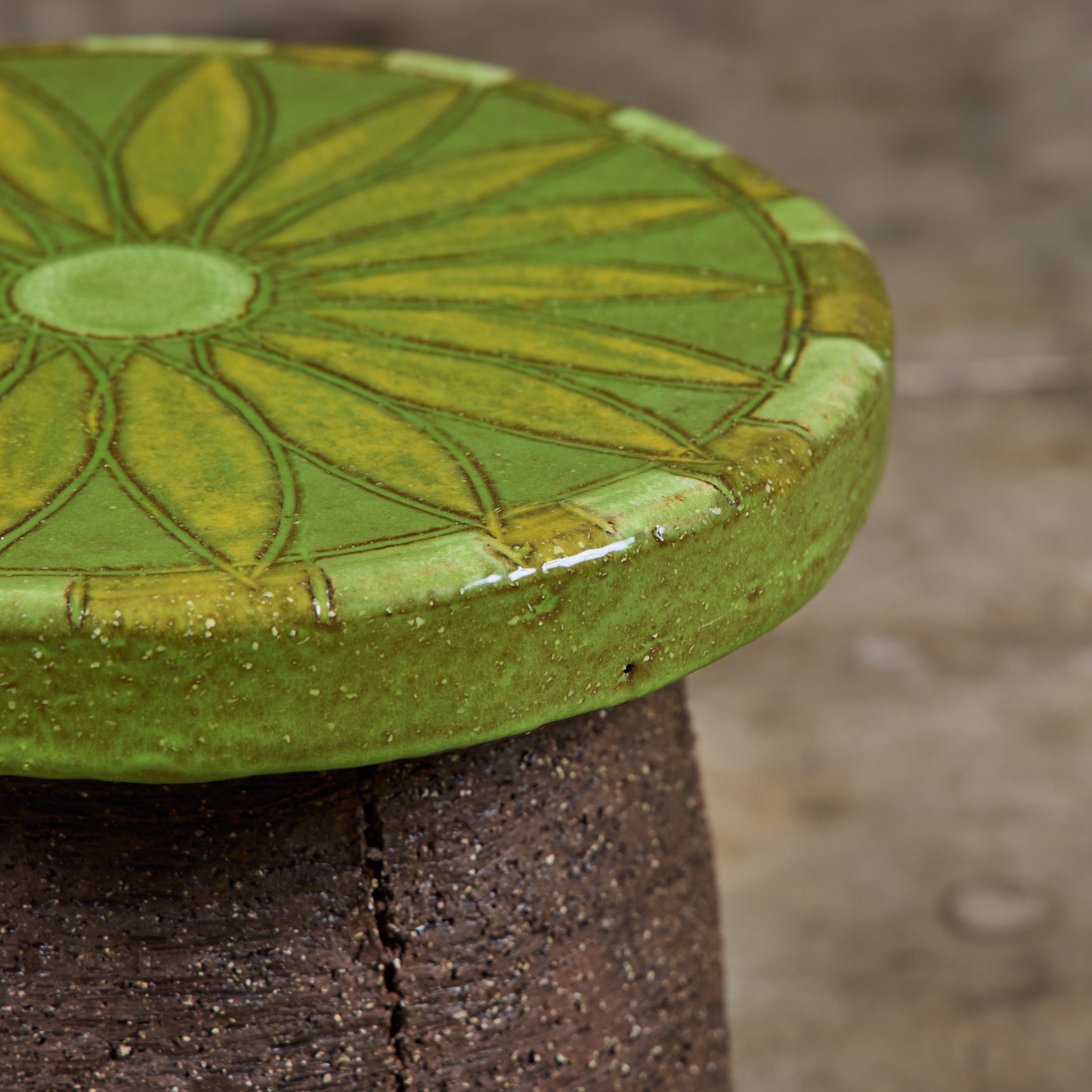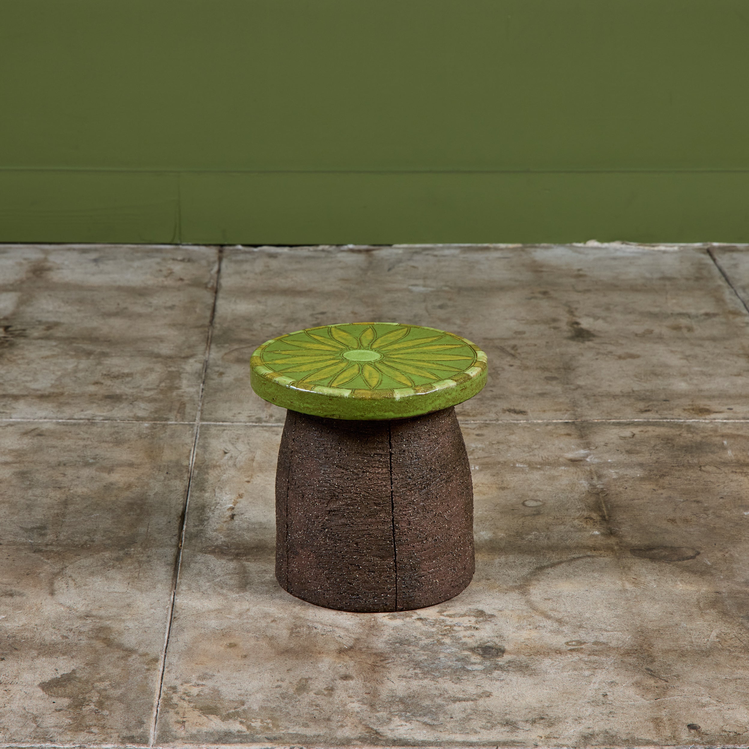 Mushroom stool or side table by Stan Bitters, USA. This piece features a round glazed ceramic top with floral motif and an unglazed stoneware base. Perfect as a petite side table, footstool or garden element.