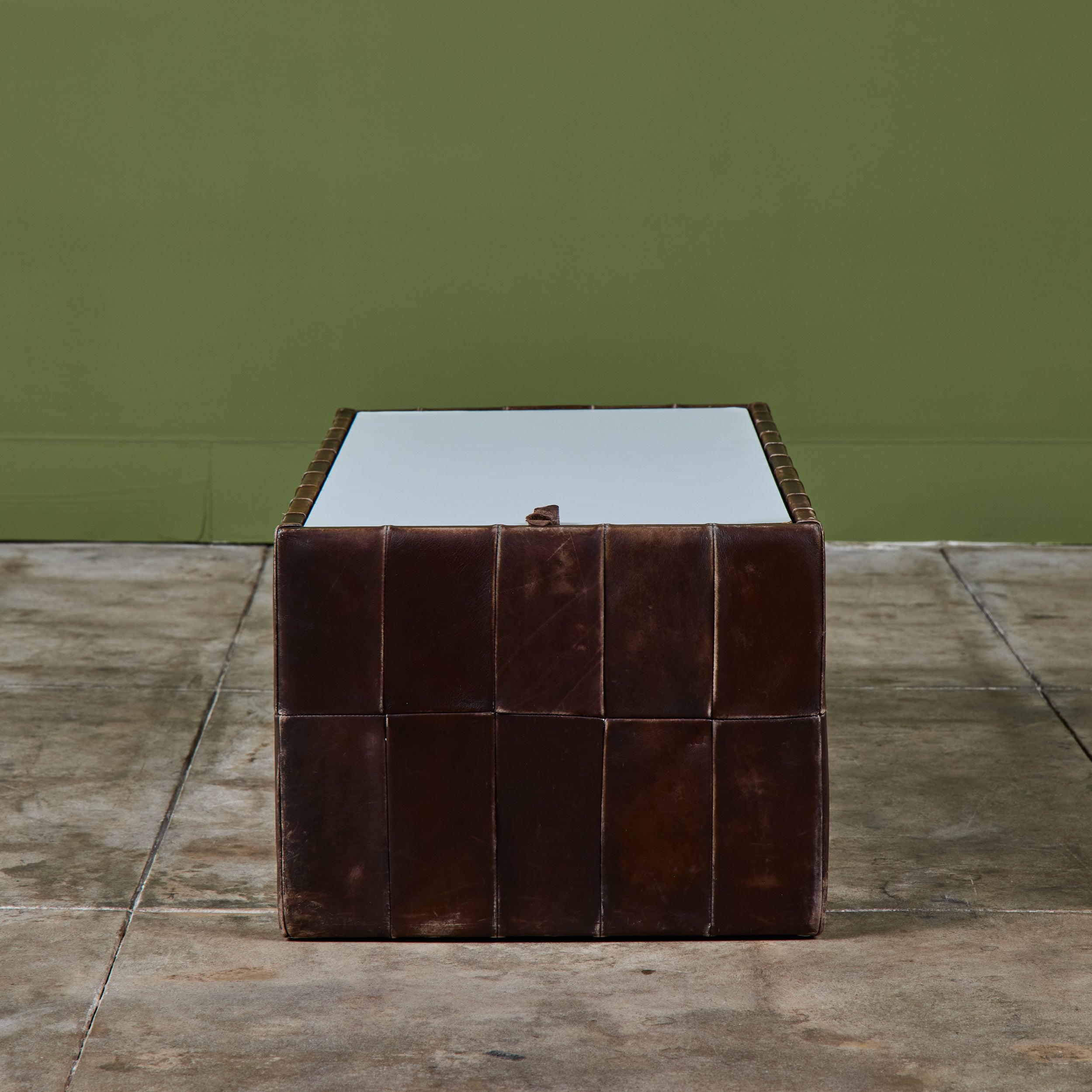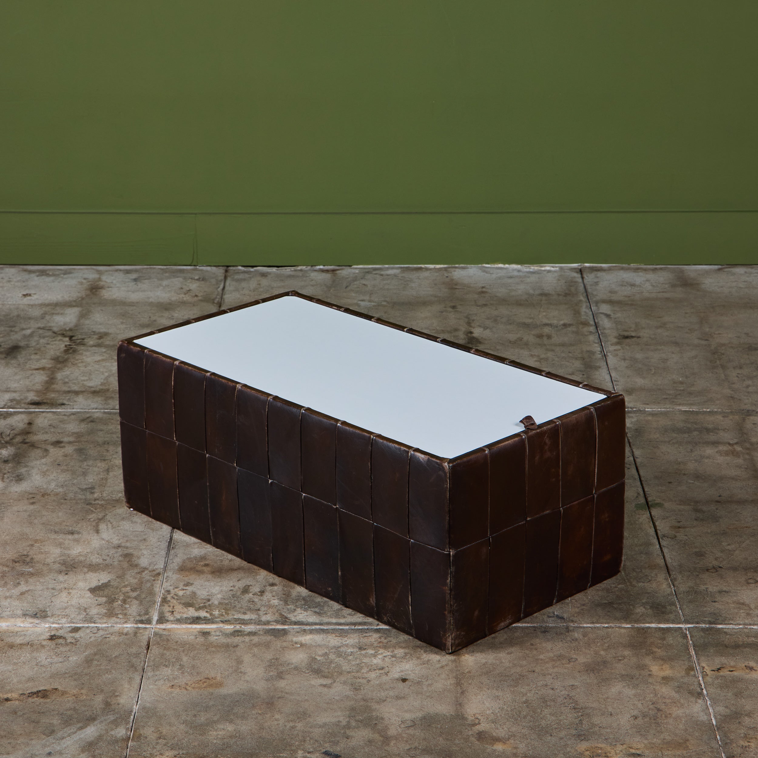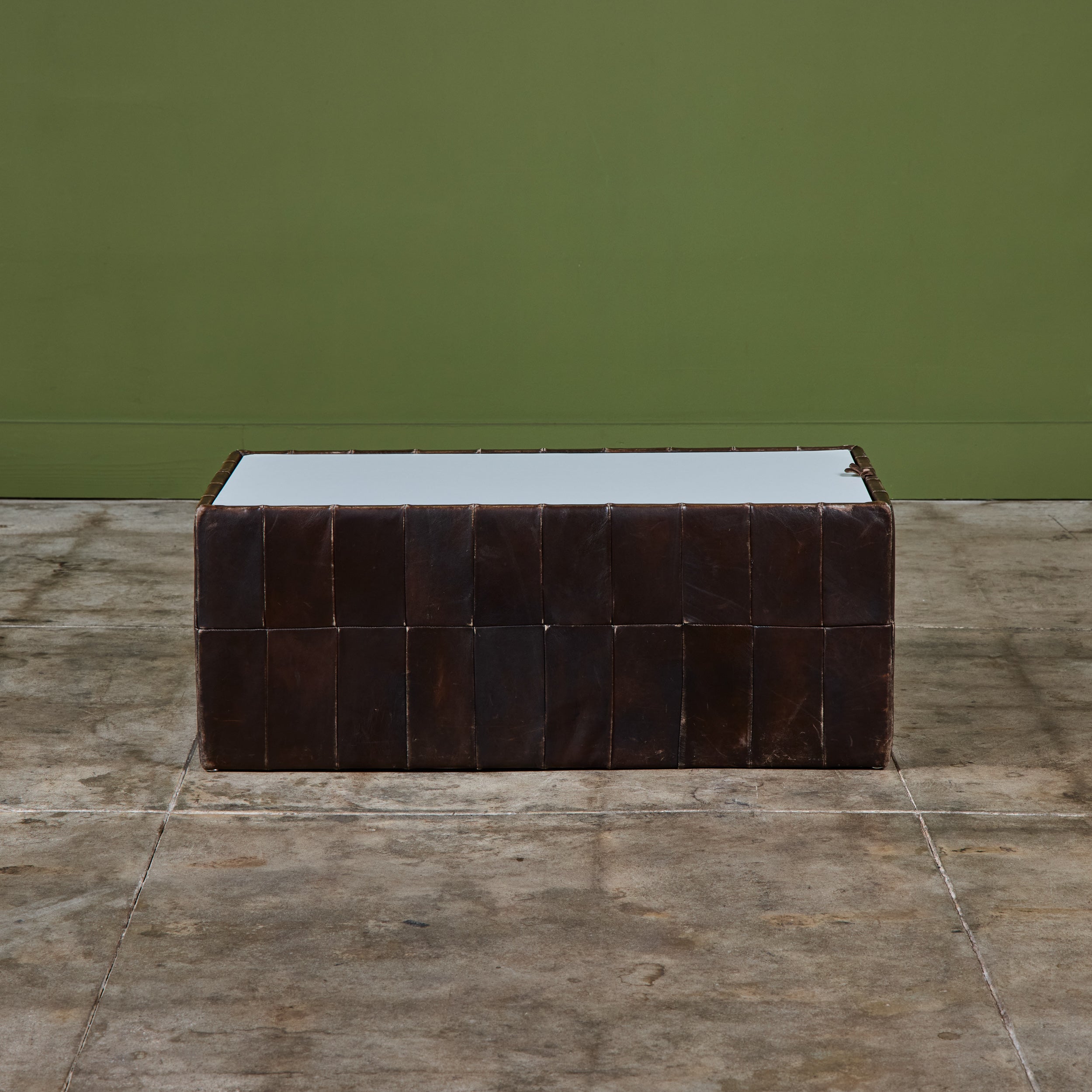 Leather patchwork storage cube by De Sede, Switzerland, c.1960s. The cube features a patinated patchwork leather exterior around the entire cube with a removable white laminate top. The top of the table can open for storage or simply be used as a table.