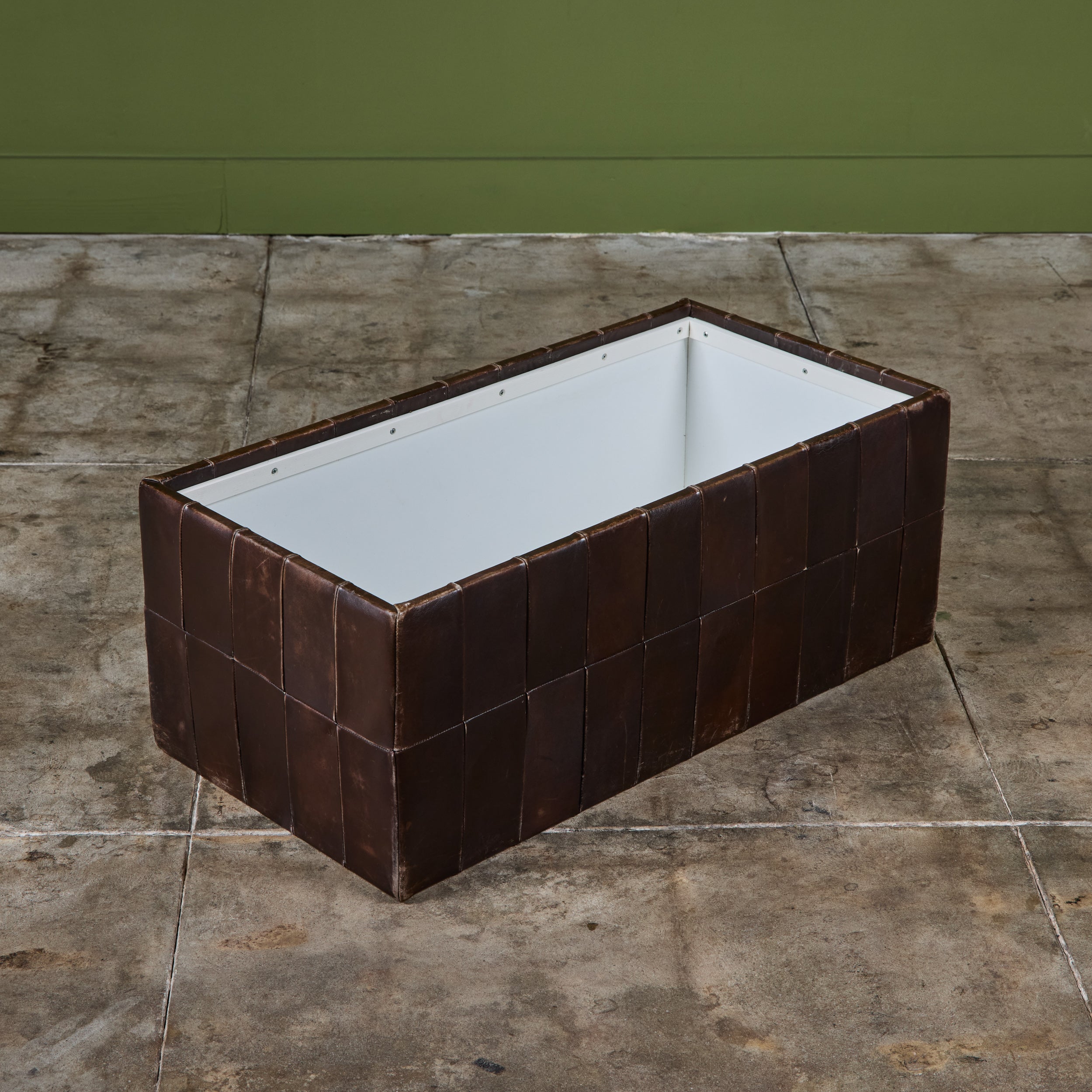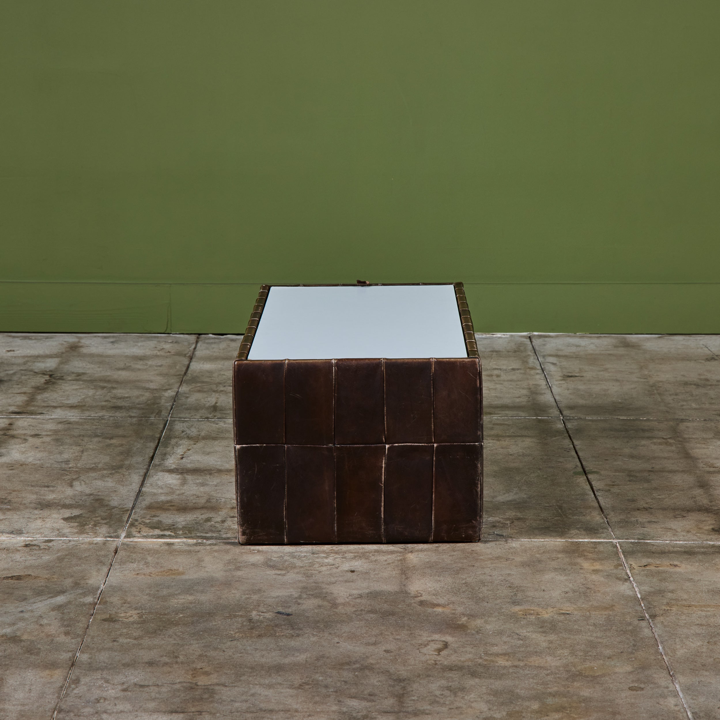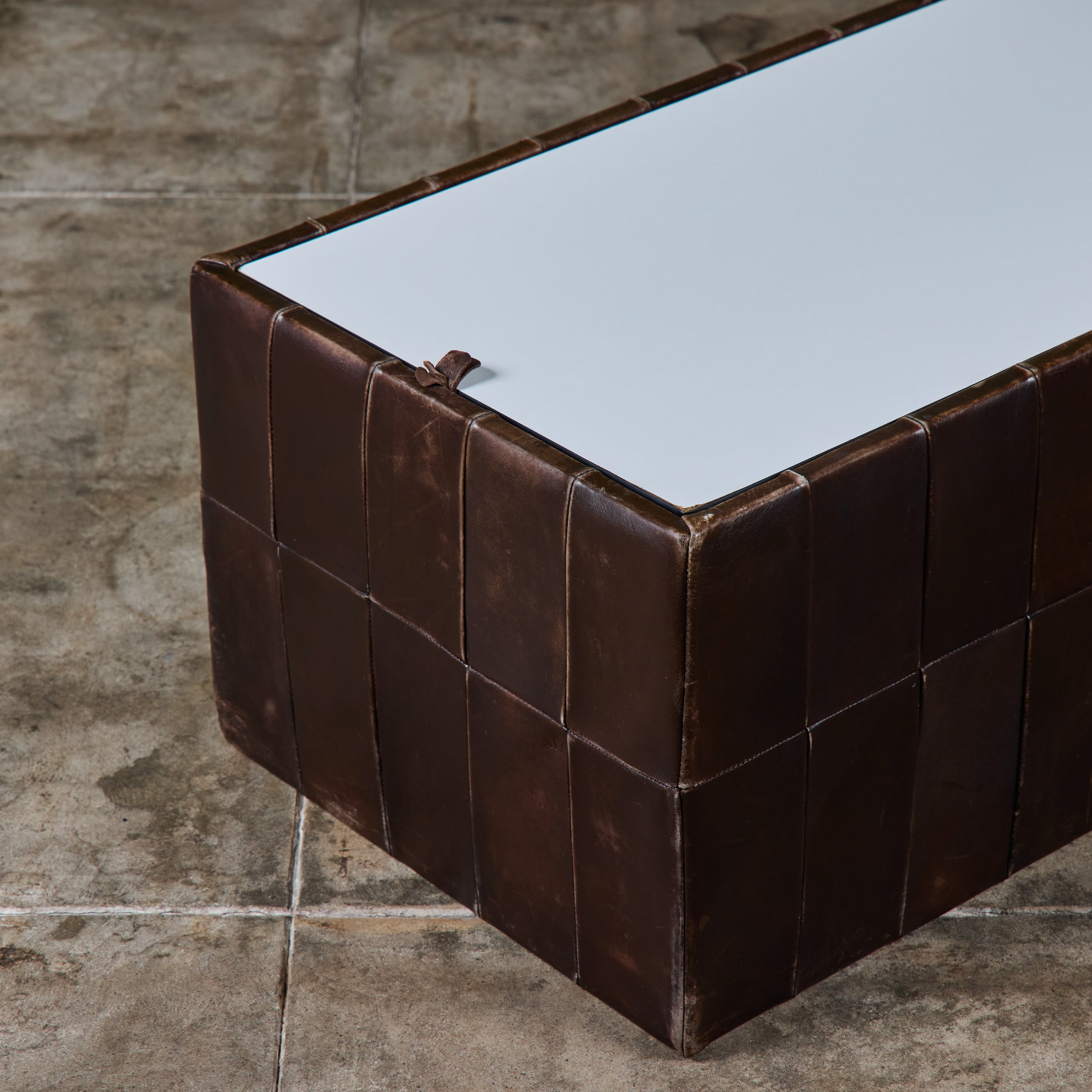 Leather patchwork storage cube by De Sede, Switzerland, c.1960s. The cube features a patinated patchwork leather exterior around the entire cube with a removable white laminate top. The top of the table can open for storage or simply be used as a table.